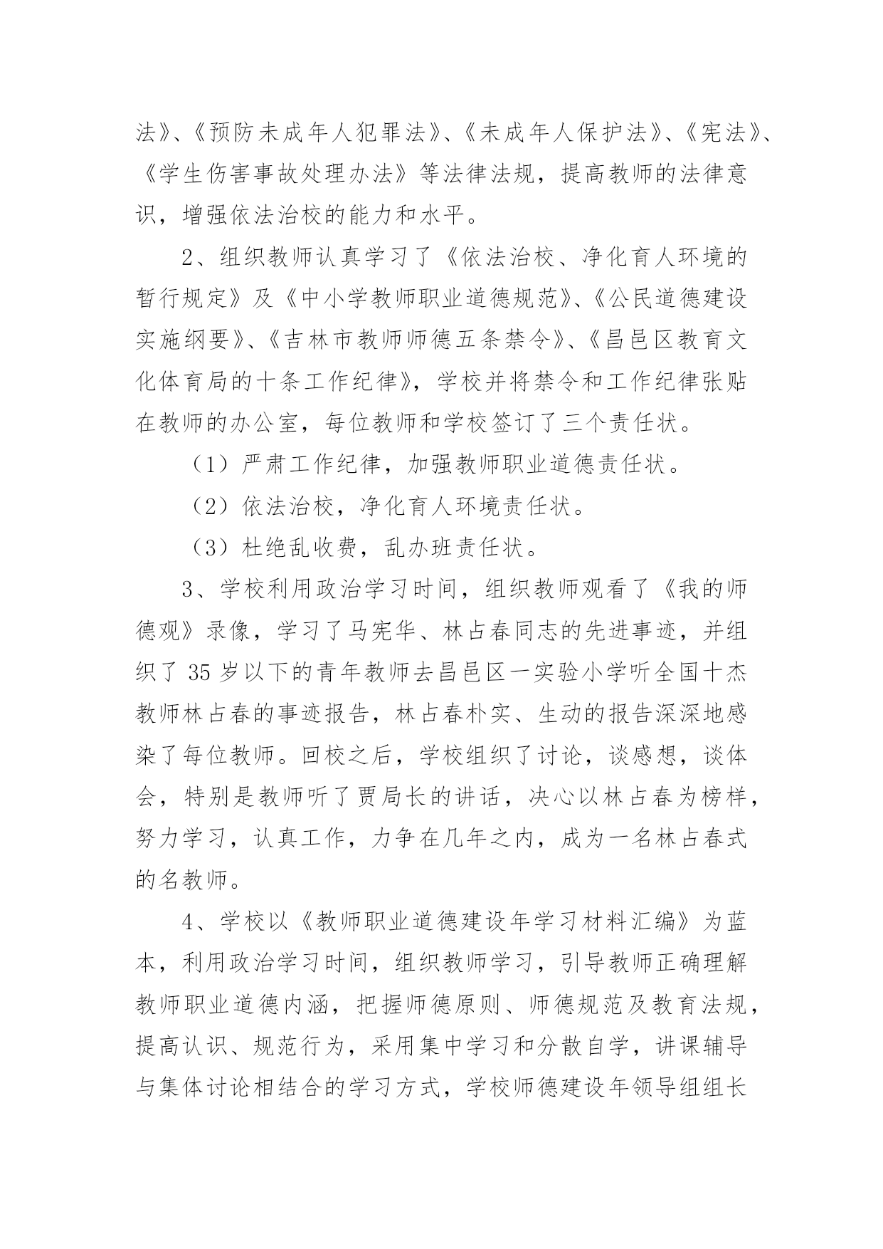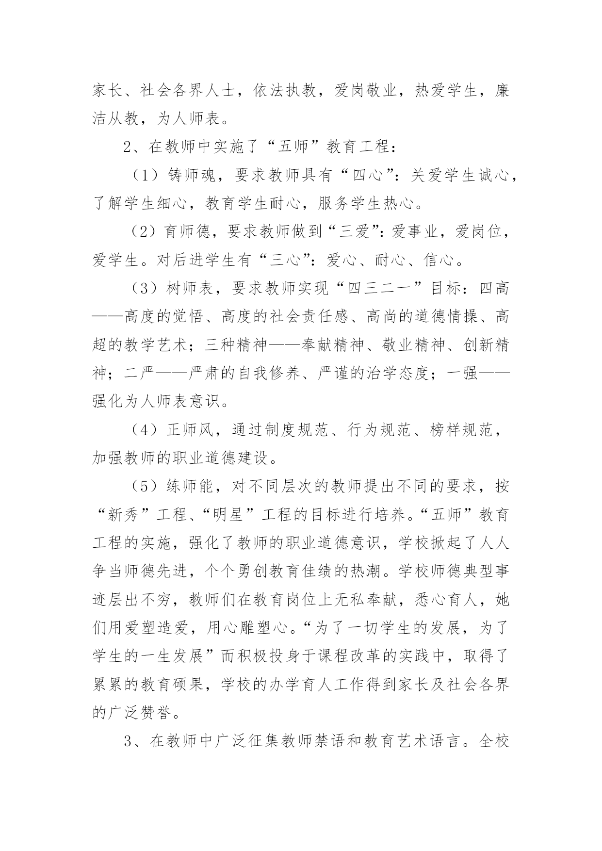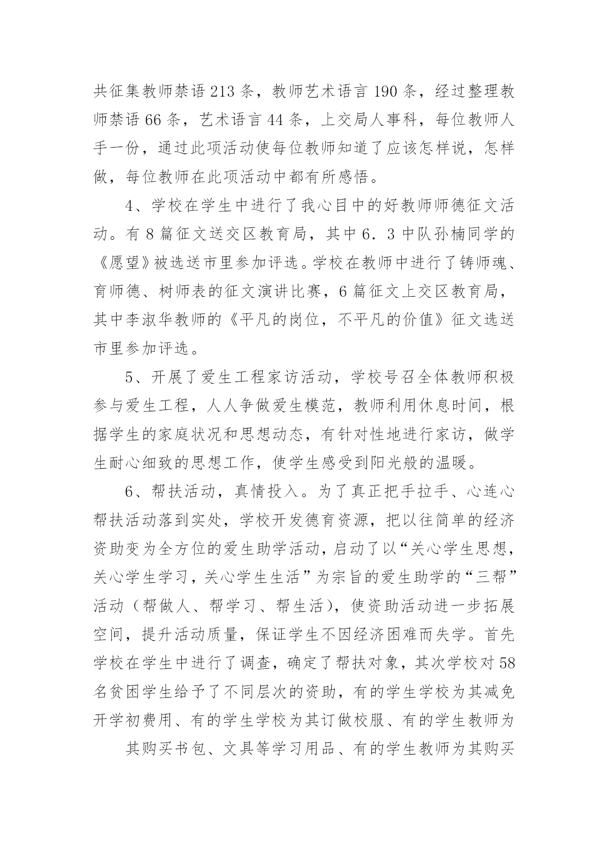 师德工作总结总结是对取得的成绩、存在的问题及得到的经验和教训等方面情况进行评价与描述的一种书面材料,它可以帮助我们有寻找学习和工作中的规律,因此好好准备一份总结吧。总结怎么写才不会流于形式呢?下面是小编为大家收集的师德工作总结,仅供参考,大家一起来看看吧。在吉林市教育局的倡导下,我们昌邑区教育文化体育局扎实深入并富有创新地开展了“师德建设年”的系列教育,活动轰轰烈烈,效果显著,全区的教育行风建设工作成绩令人瞩目。我们昌邑区第二实验小学校依据昌邑教育文化体育局的工作部署,结合学校工作的实际情况,开展了师德建设年系列活动,总结如下:一、领导高度重视健全组织机构我校领导高度重视师德建设工作,党政主要领导能把师德建设年工作摆上议事日程,定期召开会议,统一思想认识,增强抓好师德建设年的责任感和紧迫感。同时,研究制定师德建设年活动方案,成立师德建设年领导小组,部署师德建设年活动,每项活动领导做到心中有数,指导到位。二、加强理论学习,提高思想素质1、学校有计划有步骤地抓好了学习教育活动,组织教师学习《中华人民共和国教师法》、《中华人民共和国教育法》、《预防未成年人犯罪法》、《未成年人保护法》、《宪法》、《学生伤害事故处理办法》等法律法规,提高教师的法律意识,增强依法治校的能力和水平。2、组织教师认真学习了《依法治校、净化育人环境的暂行规定》及《中小学教师职业道德规范》、《公民道德建设实施纲要》、《吉林市教师师德五条禁令》、《昌邑区教育文化体育局的十条工作纪律》,学校并将禁令和工作纪律张贴在教师的办公室,每位教师和学校签订了三个责任状。(1)严肃工作纪律,加强教师职业道德责任状。(2)依法治校,净化育人环境责任状。(3)杜绝乱收费,乱办班责任状。3、学校利用政治学习时间,组织教师观看了《我的师德观》录像,学习了马宪华、林占春同志的先进事迹,并组织了35岁以下的青年教师去昌邑区一实验小学听全国十杰教师林占春的事迹报告,林占春朴实、生动的报告深深地感染了每位教师。回校之后,学校组织了讨论,谈感想,谈体会,特别是教师听了贾局长的讲话,决心以林占春为榜样,努力学习,认真工作,力争在几年之内,成为一名林占春式的名教师。4、学校以《教师职业道德建设年学习材料汇编》为蓝本,利用政治学习时间,组织教师学习,引导教师正确理解教师职业道德内涵,把握师德原则、师德规范及教育法规,提高认识、规范行为,采用集中学习和分散自学,讲课辅导与集体讨论相结合的学习方式,学校师德建设年领导组组长高校长从北京学习回来,进行了《顺应时代改变思维模式,更新观念达到教育创新的》师德讲座,学校还聘请了吉林市小学校长主编李博生同志进行了《学习型组织》的辅导讲座,会后教师进行了师德论坛,通过论坛,教师的.教育思想观念与创新能力均得到大幅度提高。此外学校要求教师结合自己在师德方面存在的问题有针对性进行自学,并写出千字文师德体会。同时,学校认真向教师传达吉林市教育局20xx年16号文件,组织教师逐条学习,并将《违反教师职业道德规范暂行处理办法》复印,每位教师人手一份抄录在政治学习笔记本上,做到入脑入心入耳,并落实在行动上。学校严格贯彻落实市教师师德禁令及其他师德规范均公示上墙,教师人人熟知,真正做到令行禁止,真正做到有举必查,查实必处。通过学习,对教师进行了职业道德教育,提高了教师教书育人水平,使教师端正了教育思想,真心实意地关心、爱护、培养教育每一名学生。三、丰富活动载体,开展系列活动。1.召开了全体教师大会,学校领导作了师德建设年工作的动员部署,每位教师引起了高度重视,增强了参加这次活动的自觉性,结合自身实际,制定了师德修养计划。20xx年10月15日,学生代表、家长代表、社会各界人士参加了教师公开承诺大会,在会上学校领导传达了区教育文化体育局开展教师职业道德建设年活动方案及学校的活动方案,举行了教师公开承诺签字仪式,教师代表、区师德标兵王洪迎宣读了教师公开承诺书,全体教师把庄严的承诺留给了学生、家长、社会各界人士,依法执教,爱岗敬业,热爱学生,廉洁从教,为人师表。2、在教师中实施了“五师”教育工程:(1)铸师魂,要求教师具有“四心”:关爱学生诚心,了解学生细心,教育学生耐心,服务学生热心。(2)育师德,要求教师做到“三爱”:爱事业,爱岗位,爱学生。对后进学生有“三心”:爱心、耐心、信心。(3)树师表,要求教师实现“四三二一”目标:四高——高度的觉悟、高度的社会责任感、高尚的道德情操、高超的教学艺术;三种精神——奉献精神、敬业精神、创新精神;二严——严肃的自我修养、严谨的治学态度;一强——强化为人师表意识。(4)正师风,通过制度规范、行为规范、榜样规范,加强教师的职业道德建设。(5)练师能,对不同层次的教师提出不同的要求,按“新秀”工程、“明星”工程的目标进行培养。“五师”教育工程的实施