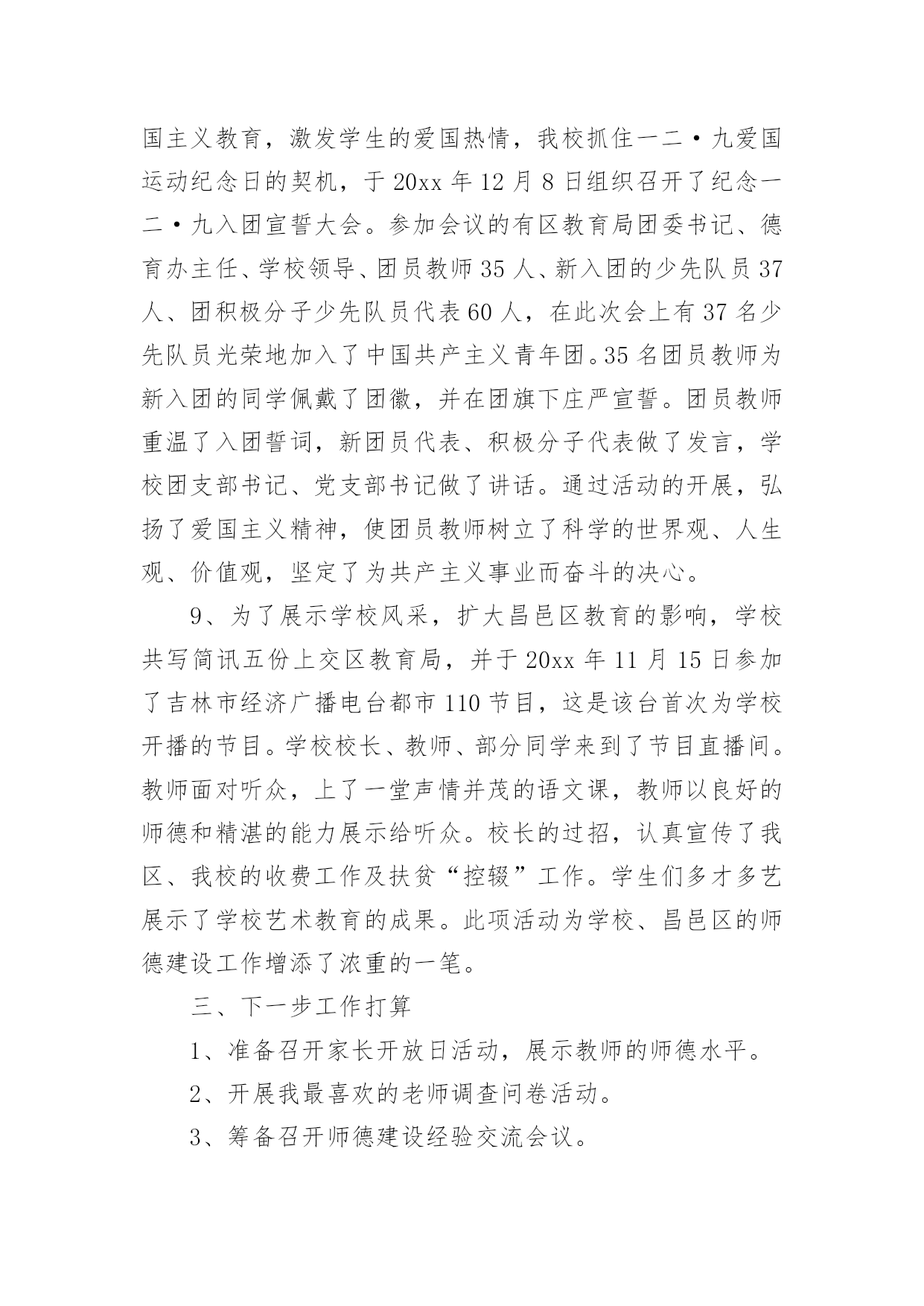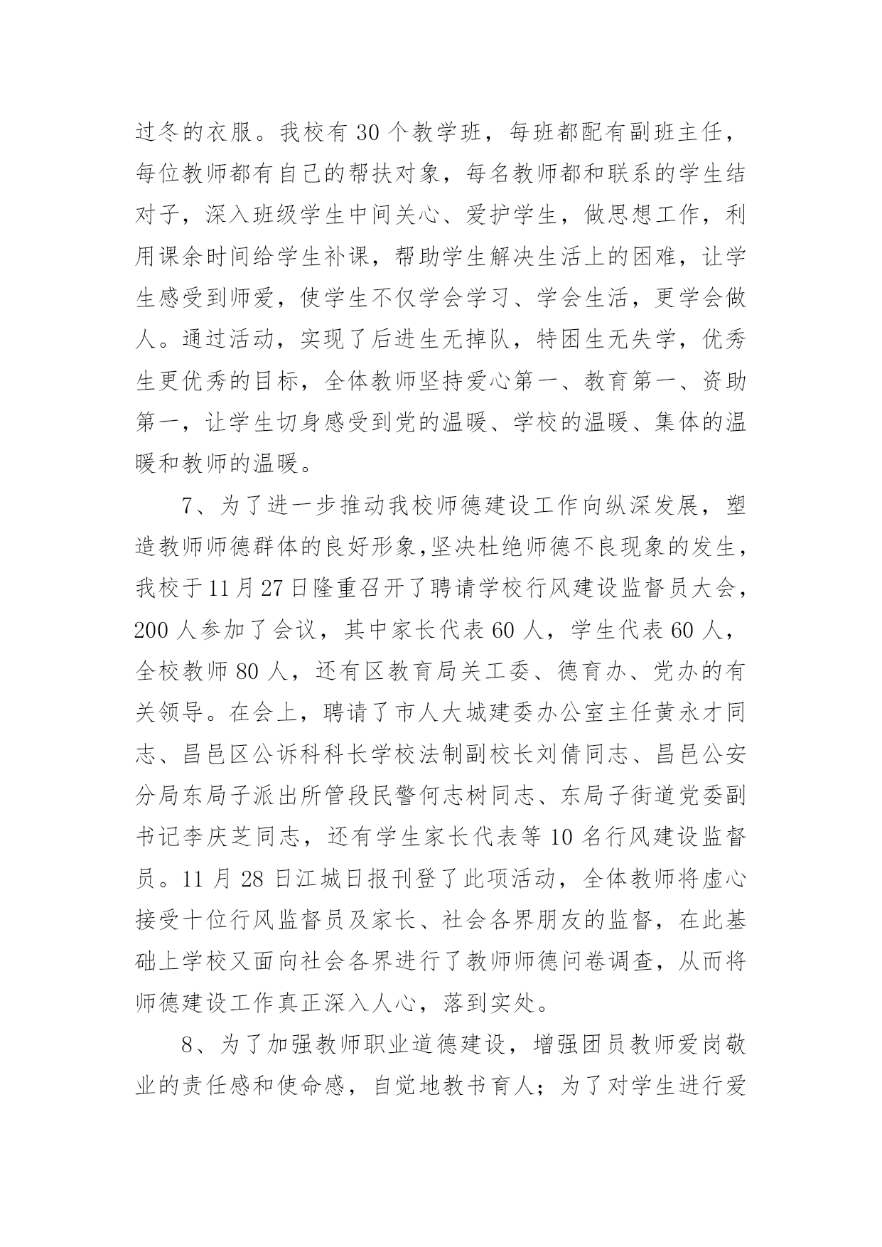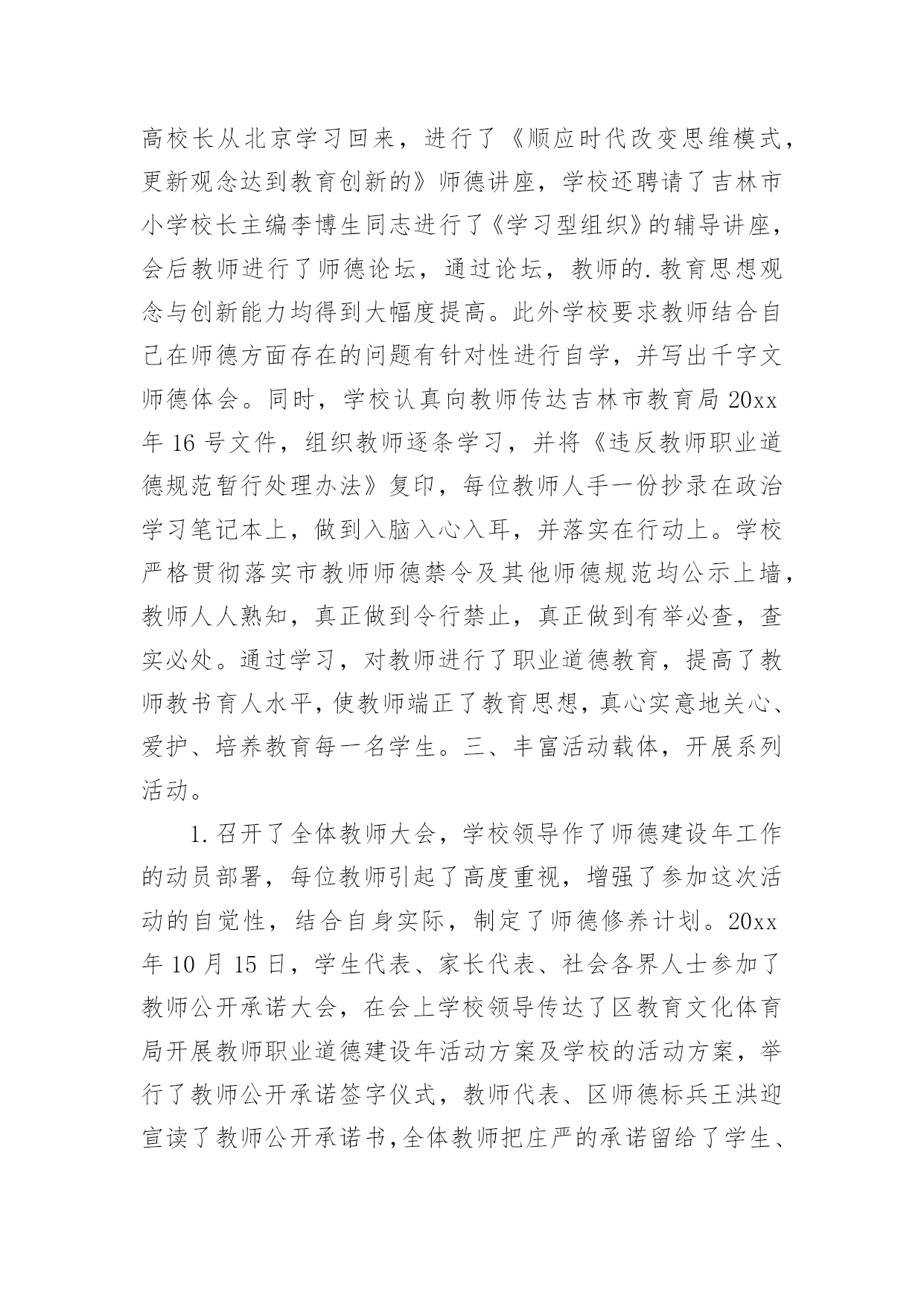 师德工作总结总结是对取得的成绩、存在的问题及得到的经验和教训等方面情况进行评价与描述的一种书面材料,它可以帮助我们有寻找学习和工作中的规律,因此好好准备一份总结吧。总结怎么写才不会流于形式呢?下面是小编为大家收集的师德工作总结,仅供参考,大家一起来看看吧。在吉林市教育局的倡导下,我们昌邑区教育文化体育局扎实深入并富有创新地开展了“师德建设年”的系列教育,活动轰轰烈烈,效果显著,全区的教育行风建设工作成绩令人瞩目。我们昌邑区第二实验小学校依据昌邑教育文化体育局的工作部署,结合学校工作的实际情况,开展了师德建设年系列活动,总结如下:一、领导高度重视健全组织机构我校领导高度重视师德建设工作,党政主要领导能把师德建设年工作摆上议事日程,定期召开会议,统一思想认识,增强抓好师德建设年的责任感和紧迫感。同时,研究制定师德建设年活动方案,成立师德建设年领导小组,部署师德建设年活动,每项活动领导做到心中有数,指导到位。二、加强理论学习,提高思想素质1、学校有计划有步骤地抓好了学习教育活动,组织教师学习《中华人民共和国教师法》、《中华人民共和国教育法》、《预防未成年人犯罪法》、《未成年人保护法》、《宪法》、《学生伤害事故处理办法》等法律法规,提高教师的法律意识,增强依法治校的能力和水平。2、组织教师认真学习了《依法治校、净化育人环境的暂行规定》及《中小学教师职业道德规范》、《公民道德建设实施纲要》、《吉林市教师师德五条禁令》、《昌邑区教育文化体育局的十条工作纪律》,学校并将禁令和工作纪律张贴在教师的办公室,每位教师和学校签订了三个责任状。(1)严肃工作纪律,加强教师职业道德责任状。(2)依法治校,净化育人环境责任状。(3)杜绝乱收费,乱办班责任状。3、学校利用政治学习时间,组织教师观看了《我的师德观》录像,学习了马宪华、林占春同志的先进事迹,并组织了35岁以下的青年教师去昌邑区一实验小学听全国十杰教师林占春的事迹报告,林占春朴实、生动的报告深深地感染了每位教师。回校之后,学校组织了讨论,谈感想,谈体会,特别是教师听了贾局长的讲话,决心以林占春为榜样,努力学习,认真工作,力争在几年之内,成为一名林占春式的名教师。4、学校以《教师职业道德建设年学习材料汇编》为蓝本,利用政治学习时间,组织教师学习,引导教师正确理解教师职业道德内涵,把握师德原则、师德规范及教育法规,提高认识、规范行为,采用集中学习和分散自学,讲课辅导与集体讨论相结合的学习方式,学校师德建设年领导组组长高校长从北京学习回来,进行了《顺应时代改变思维模式,更新观念达到教育创新的》师德讲座,学校还聘请了吉林市小学校长主编李博生同志进行了《学习型组织》的辅导讲座,会后教师进行了师德论坛,通过论坛,教师的.教育思想观念与创新能力均得到大幅度提高。此外学校要求教师结合自己在师德方面存在的问题有针对性进行自学,并写出千字文师德体会。同时,学校认真向教师传达吉林市教育局20xx年16号文件,组织教师逐条学习,并将《违反教师职业道德规范暂行处理办法》复印,每位教师人手一份抄录在政治学习笔记本上,做到入脑入心入耳,并落实在行动上。学校严格贯彻落实市教师师德禁令及其他师德规范均公示上墙,教师人人熟知,真正做到令行禁止,真正做到有举必查,查实必处。通过学习,对教师进行了职业道德教育,提高了教师教书育人水平,使教师端正了教育思想,真心实意地关心、爱护、培养教育每一名学生。三、丰富活动载体,开展系列活动。1.召开了全体教师大会,学校领导作了师德建设年工作的动员部署,每位教师引起了高度重视,增强了参加这次活动的自觉性,结合自身实际,制定了师德修养计划。20xx年10月15日,学生代表、家长代表、社会各界人士参加了教师公开承诺大会,在会上学校领导传达了区教育文化体育局开展教师职业道德建设年活动方案及学校的活动方案,举行了教师公开承诺签字仪式,教师代表、区师德标兵王洪迎宣读了教师公开承诺书,全体教师把庄严的承诺留给了学生、家长、社会各界人士,依法执教,爱岗敬业,热爱学生,廉洁从教,为人师表。2、在教师中实施了“五师”教育工程:(1)铸师魂,要求教师具有“四心”:关爱学生诚心,了解学生细心,教育学生耐心,服务学生热心。(2)育师德,要求教师做到“三爱”:爱事业,爱岗位,爱学生。对后进学生有“三心”:爱心、耐心、信心。(3)树师表,要求教师实现“四三二一”目标:四高——高度的觉悟、高度的社会责任感、高尚的道德情操、高超的教学艺术;三种精神——奉献精神、敬业精神、创新精神;二严——严肃的自我修养、严谨的治学态度;一强——强化为人师表意识。(4)正师风,通过制度规范、行为规范、榜样规范,加强教师的职业道德建设。(5)练师能,对不同层次的教师提出不同的要求,按“新秀”工程、“明星”工程的目标进行培养。“五师”教育工程的实施