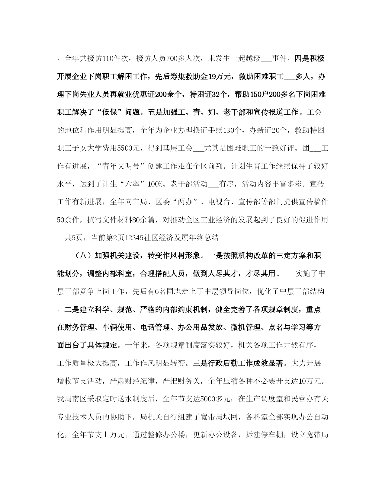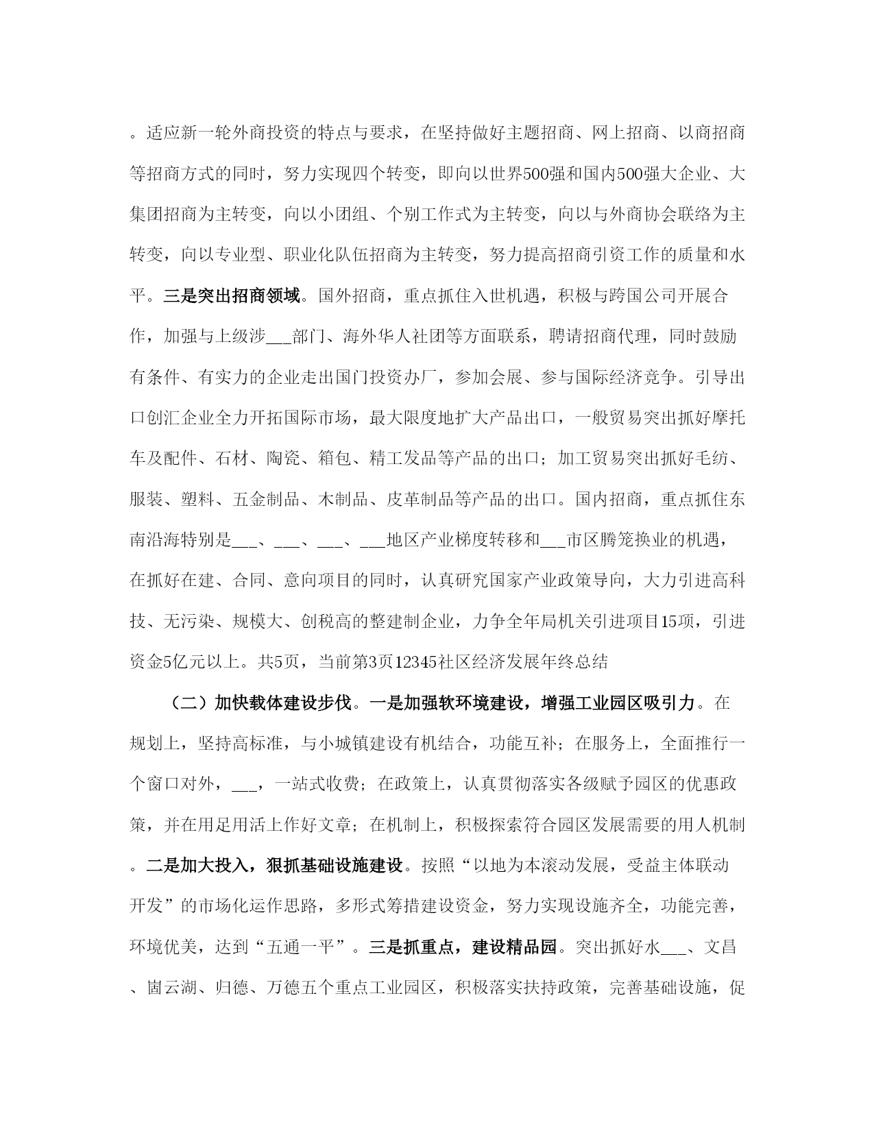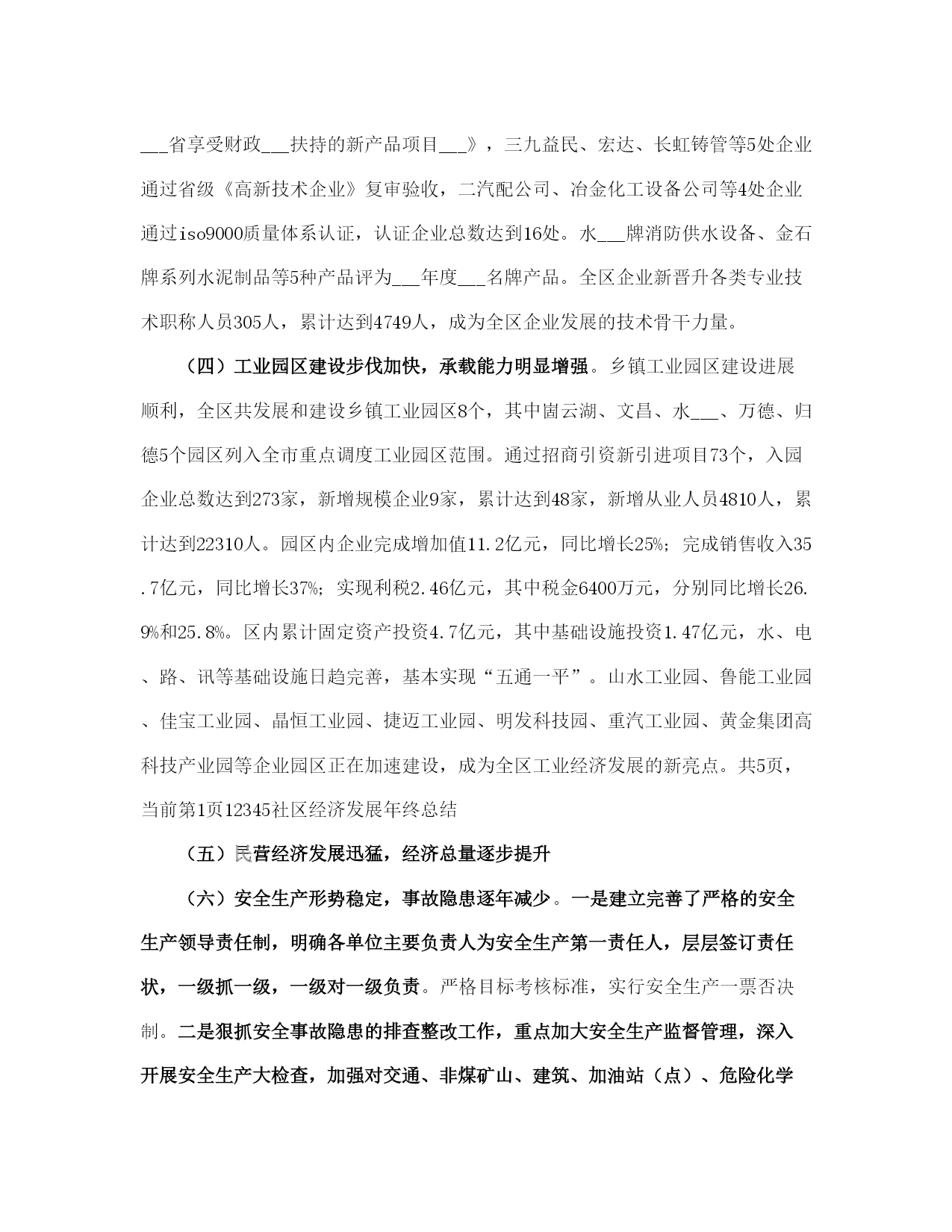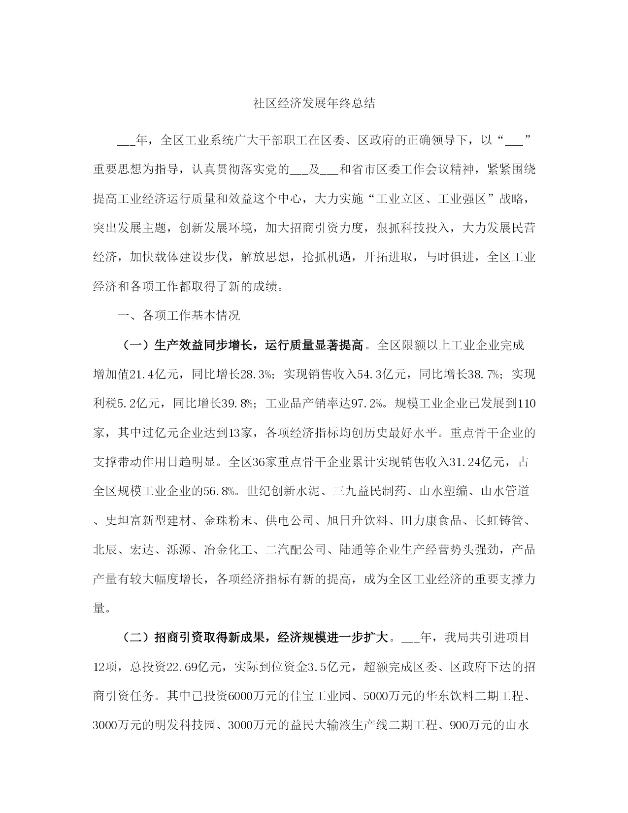 社区经济发展年终总结(完整版)文档资料可直接使用,可编辑,欢迎下载社区经济发展年终总结___年,全区工业系统广大干部职工在区委、区政府的正确领导下,以“___”重要思想为指导,认真贯彻落实党的___及___和省市区委工作会议精神,紧紧围绕提高工业经济运行质量和效益这个中心,大力实施“工业立区、工业强区”战略,突出发展主题,创新发展环境,加大招商引资力度,狠抓科技投入,大力发展民营经济,加快载体建设步伐,解放思想,抢抓机遇,开拓进取,与时俱进,全区工业经济和各项工作都取得了新的成绩。一、各项工作基本情况(一)生产效益同步增长,运行质量显著提高。全区限额以上工业企业完成增加值21.4亿元,同比增长28.3%;实现销售收入54.3亿元,同比增长38.7%;实现利税5.2亿元,同比增长39.8%;工业品产销率达97.2%。规模工业企业已发展到110家,其中过亿元企业达到13家,各项经济指标均创历史最好水平。重点骨干企业的支撑带动作用日趋明显。全区36家重点骨干企业累计实现销售收入31.24亿元,占全区规模工业企业的56.8%。世纪创新水泥、三九益民制药、山水塑编、山水管道、史坦富新型建材、金珠粉末、供电公司、旭日升饮料、田力康食品、长虹铸管、北辰、宏达、泺源、冶金化工、二汽配公司、陆通等企业生产经营势头强劲,产品产量有较大幅度增长,各项经济指标有新的提高,成为全区工业经济的重要支撑力量。(二)招商引资取得新成果,经济规模进一步扩大。___年,我局共引进项目12项,总投资22.69亿元,实际到位资金3.5亿元,超额完成区委、区政府下达的招商引资任务。其中已投资6000万元的佳宝工业园、5000万元的华东饮料二期工程、3000万元的明发科技园、3000万元的益民大输液生产线二期工程、900万元的山水管道、___万元的世纪创新水泥扩建、___万元的巨能二期工程、1500万元的史坦富新型建材、2500万元的金珠粉末等9个项目已投产。计划总投资16亿元现到位资金7000万元的重汽工业园项目正在建设,其中传动轴和底盘零件项目已进入调试阶段;计划总投资1.2亿元的纳米金钢石粉项目、2600万元的环保设备项目已签合同。投产和在建项目见效后可新增利税5亿元。此外,明湖热电厂项目、西部黄河煤田综合开发项目、___机床二厂铸造分厂搬迁项目、陆幸达电子项目等正在积极的洽谈之中。各乡镇招商引资工作实现新突破,平安、崮云湖、归德、万德、张夏等乡镇走在全区前列。据统计,全区共引进各类项目201项,总投资70.8亿元,实际到位资金26.71亿元,其中有38项建成投产,118项正在建设,45项签订合同。引进投资亿元以上项目17项,大项目引进在全市名列前茅,成为全区经济发展的新的增长点。(三)技术进步成效明显,发展后劲进一步增强。全区共实施技改项目33项,计划总投资10.8亿元,实际完成投资12.88亿元,完成年计划的120%,技改进度和完成质量明显好于往年。佳宝工业园新上鲜奶生产线、明发科技园新上兽药生产线等31项技改项目已竣工投产,可新增产值28.1亿元,利税4.4亿元。技改项目呈现三大特点:一是投资规模大,投资5000万元以上的项目占项目总数的32.2%,占投资总数的89.2%;二是招商引资项目多,技改项目中有25项招商引资项目,占项目总数的80%,占实际完成投资的82.2%;三是技术含量高,有80%的项目技术水平国内一流。旭日升“高兴”系列饮料罐装线、三九益民软包装输液生产线列入省级技术改造规划项目。新产品开发取得新成绩,研制开发新产品36种,总投资1800万元,完成新产品销售收入5400万元,利税600万元。宏达公司智能化高效节能换热器、水___集团全自动真空热水机组、陆通公司钢结构厂房技术开发3个项目列入《___省享受财政___扶持的新产品项目___》,三九益民、宏达、长虹铸管等5处企业通过省级《高新技术企业》复审验收,二汽配公司、冶金化工设备公司等4处企业通过iso9000质量体系认证,认证企业总数达到16处。水___牌消防供水设备、金石牌系列水泥制品等5种产品评为___年度___名牌产品。全区企业新晋升各类专业技术职称人员305人,累计达到4749人,成为全区企业发展的技术骨干力量。(四)工业园区建设步伐加快,承载能力明显增强。乡镇工业园区建设进展顺利,全区共发展和建设乡镇工业园区8个,其中崮云湖、文昌、水___、万德、归德5个园区列入全市重点调度工业园区范围。通过招商引资新引进项目73个,入园企业总数达到273家,新增规模企业9家,累计达到48家,新增从业人员4810人,累计达到22310人。园区内企业完成增加值11.2亿元,同比增长25%;完成销售收入35.7亿元,同比增长37%;实现利税2.46亿元,其中税金6400万元,分别同比增