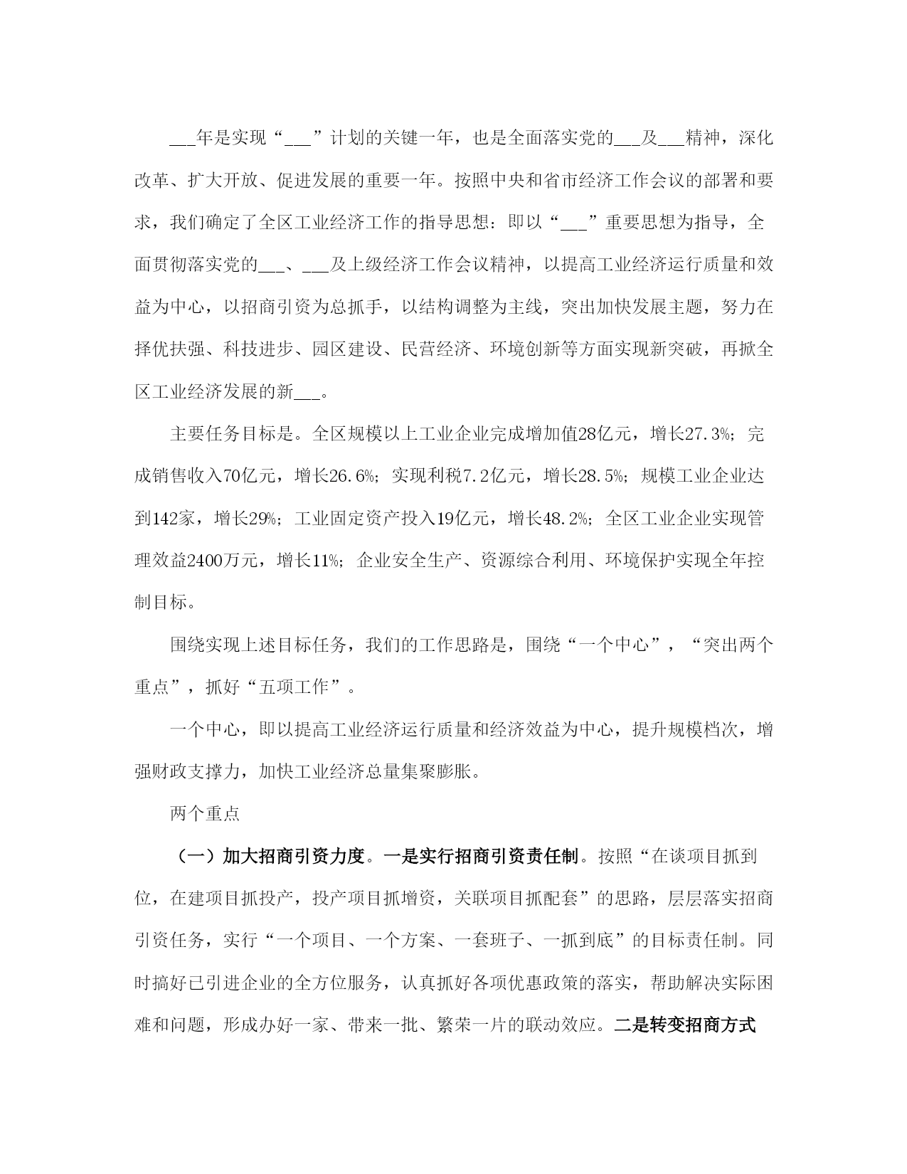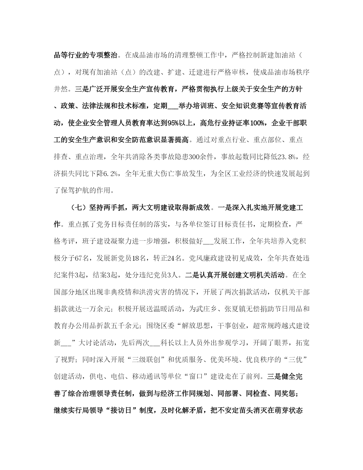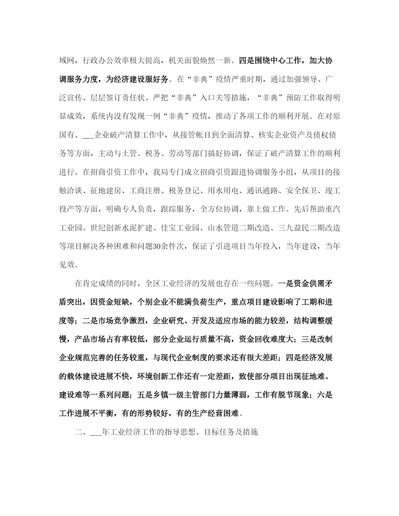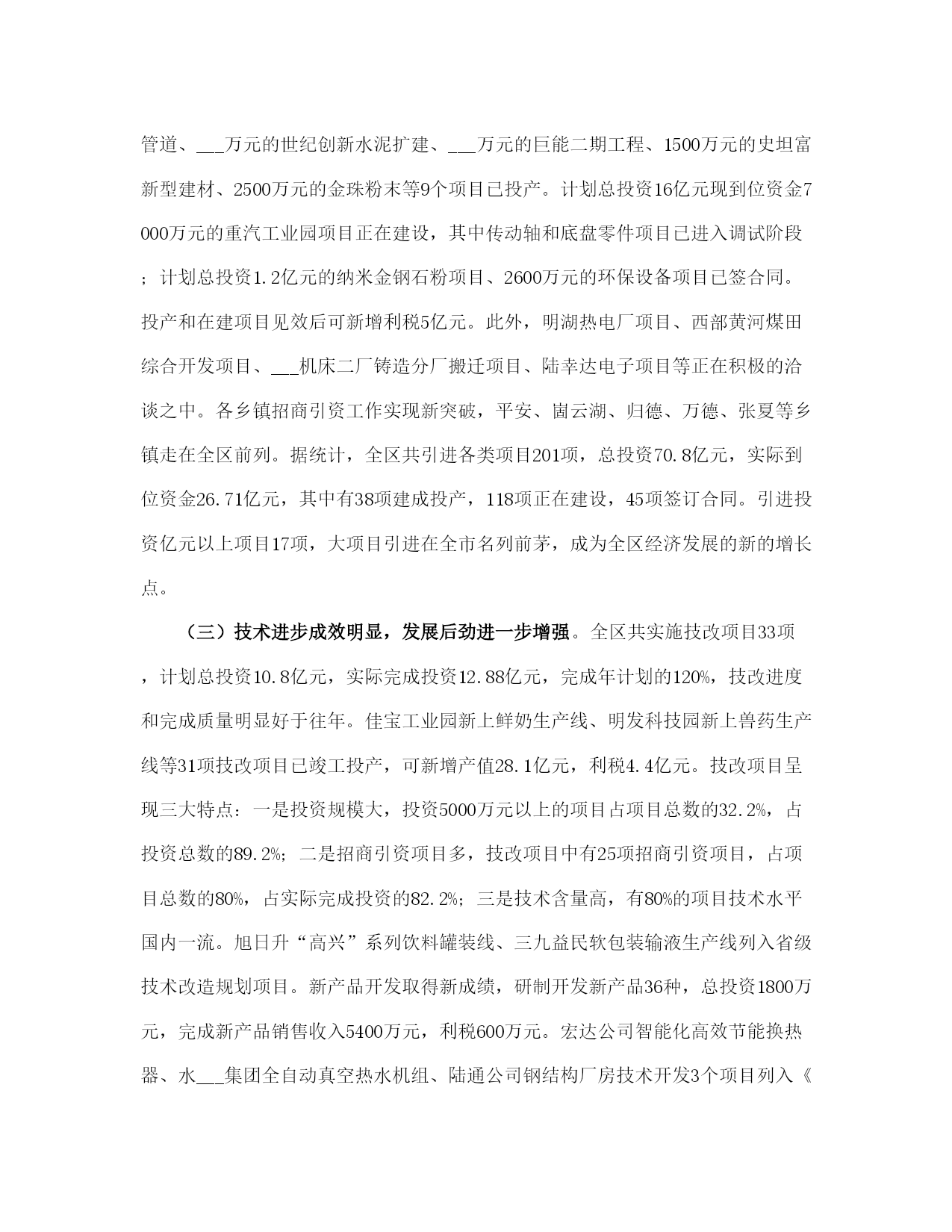 社区经济发展年终总结(完整版)文档资料可直接使用,可编辑,欢迎下载社区经济发展年终总结___年,全区工业系统广大干部职工在区委、区政府的正确领导下,以“___”重要思想为指导,认真贯彻落实党的___及___和省市区委工作会议精神,紧紧围绕提高工业经济运行质量和效益这个中心,大力实施“工业立区、工业强区”战略,突出发展主题,创新发展环境,加大招商引资力度,狠抓科技投入,大力发展民营经济,加快载体建设步伐,解放思想,抢抓机遇,开拓进取,与时俱进,全区工业经济和各项工作都取得了新的成绩。一、各项工作基本情况(一)生产效益同步增长,运行质量显著提高。全区限额以上工业企业完成增加值21.4亿元,同比增长28.3%;实现销售收入54.3亿元,同比增长38.7%;实现利税5.2亿元,同比增长39.8%;工业品产销率达97.2%。规模工业企业已发展到110家,其中过亿元企业达到13家,各项经济指标均创历史最好水平。重点骨干企业的支撑带动作用日趋明显。全区36家重点骨干企业累计实现销售收入31.24亿元,占全区规模工业企业的56.8%。世纪创新水泥、三九益民制药、山水塑编、山水管道、史坦富新型建材、金珠粉末、供电公司、旭日升饮料、田力康食品、长虹铸管、北辰、宏达、泺源、冶金化工、二汽配公司、陆通等企业生产经营势头强劲,产品产量有较大幅度增长,各项经济指标有新的提高,成为全区工业经济的重要支撑力量。(二)招商引资取得新成果,经济规模进一步扩大。___年,我局共引进项目12项,总投资22.69亿元,实际到位资金3.5亿元,超额完成区委、区政府下达的招商引资任务。其中已投资6000万元的佳宝工业园、5000万元的华东饮料二期工程、3000万元的明发科技园、3000万元的益民大输液生产线二期工程、900万元的山水管道、___万元的世纪创新水泥扩建、___万元的巨能二期工程、1500万元的史坦富新型建材、2500万元的金珠粉末等9个项目已投产。计划总投资16亿元现到位资金7000万元的重汽工业园项目正在建设,其中传动轴和底盘零件项目已进入调试阶段;计划总投资1.2亿元的纳米金钢石粉项目、2600万元的环保设备项目已签合同。投产和在建项目见效后可新增利税5亿元。此外,明湖热电厂项目、西部黄河煤田综合开发项目、___机床二厂铸造分厂搬迁项目、陆幸达电子项目等正在积极的洽谈之中。各乡镇招商引资工作实现新突破,平安、崮云湖、归德、万德、张夏等乡镇走在全区前列。据统计,全区共引进各类项目201项,总投资70.8亿元,实际到位资金26.71亿元,其中有38项建成投产,118项正在建设,45项签订合同。引进投资亿元以上项目17项,大项目引进在全市名列前茅,成为全区经济发展的新的增长点。(三)技术进步成效明显,发展后劲进一步增强。全区共实施技改项目33项,计划总投资10.8亿元,实际完成投资12.88亿元,完成年计划的120%,技改进度和完成质量明显好于往年。佳宝工业园新上鲜奶生产线、明发科技园新上兽药生产线等31项技改项目已竣工投产,可新增产值28.1亿元,利税4.4亿元。技改项目呈现三大特点:一是投资规模大,投资5000万元以上的项目占项目总数的32.2%,占投资总数的89.2%;二是招商引资项目多,技改项目中有25项招商引资项目,占项目总数的80%,占实际完成投资的82.2%;三是技术含量高,有80%的项目技术水平国内一流。旭日升“高兴”系列饮料罐装线、三九益民软包装输液生产线列入省级技术改造规划项目。新产品开发取得新成绩,研制开发新产品36种,总投资1800万元,完成新产品销售收入5400万元,利税600万元。宏达公司智能化高效节能换热器、水___集团全自动真空热水机组、陆通公司钢结构厂房技术开发3个项目列入《___省享受财政___扶持的新产品项目___》,三九益民、宏达、长虹铸管等5处企业通过省级《高新技术企业》复审验收,二汽配公司、冶金化工设备公司等4处企业通过iso9000质量体系认证,认证企业总数达到16处。水___牌消防供水设备、金石牌系列水泥制品等5种产品评为___年度___名牌产品。全区企业新晋升各类专业技术职称人员305人,累计达到4749人,成为全区企业发展的技术骨干力量。(四)工业园区建设步伐加快,承载能力明显增强。乡镇工业园区建设进展顺利,全区共发展和建设乡镇工业园区8个,其中崮云湖、文昌、水___、万德、归德5个园区列入全市重点调度工业园区范围。通过招商引资新引进项目73个,入园企业总数达到273家,新增规模企业9家,累计达到48家,新增从业人员4810人,累计达到22310人。园区内企业完成增加值11.2亿元,同比增长25%;完成销售收入35.7亿元,同比增长37%;实现利税2.46亿元,其中税金6400万元,分别同比增