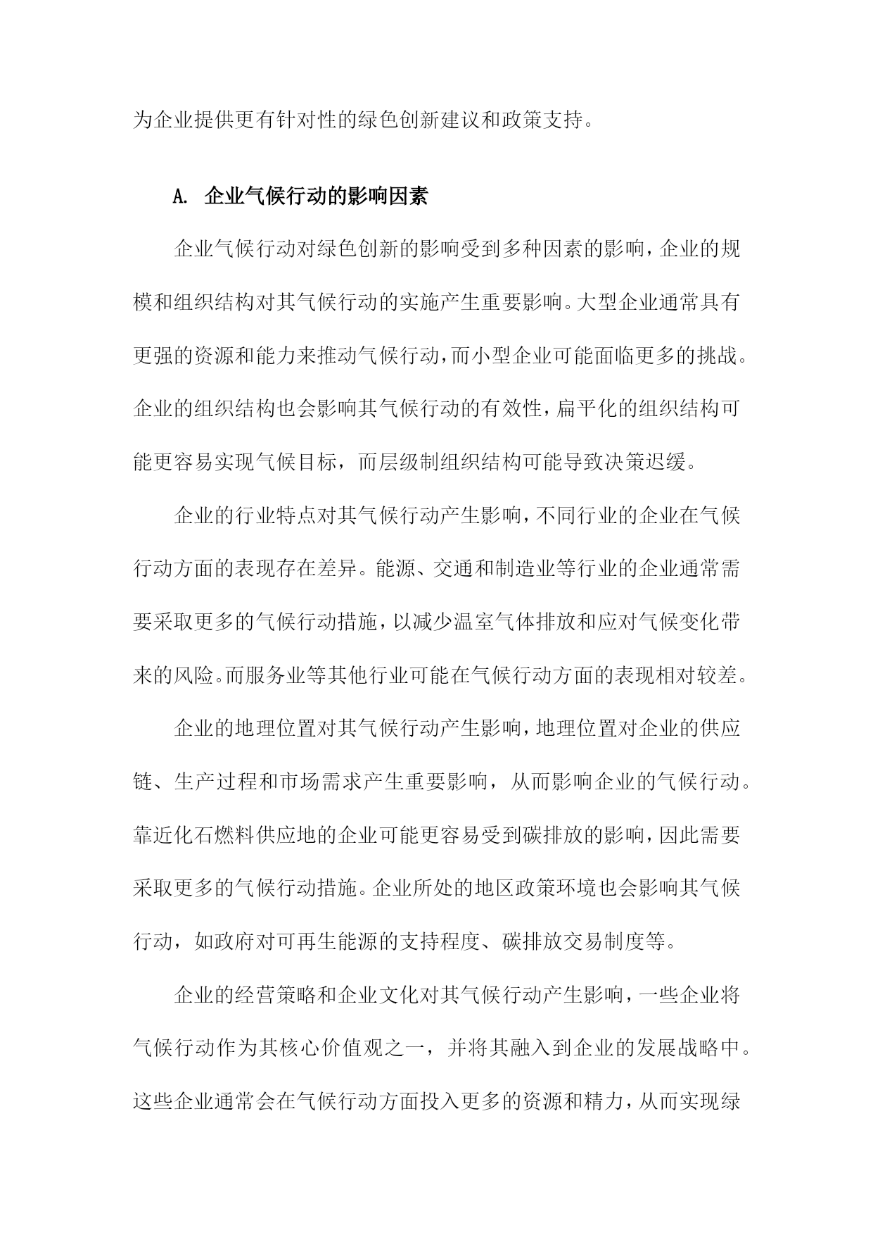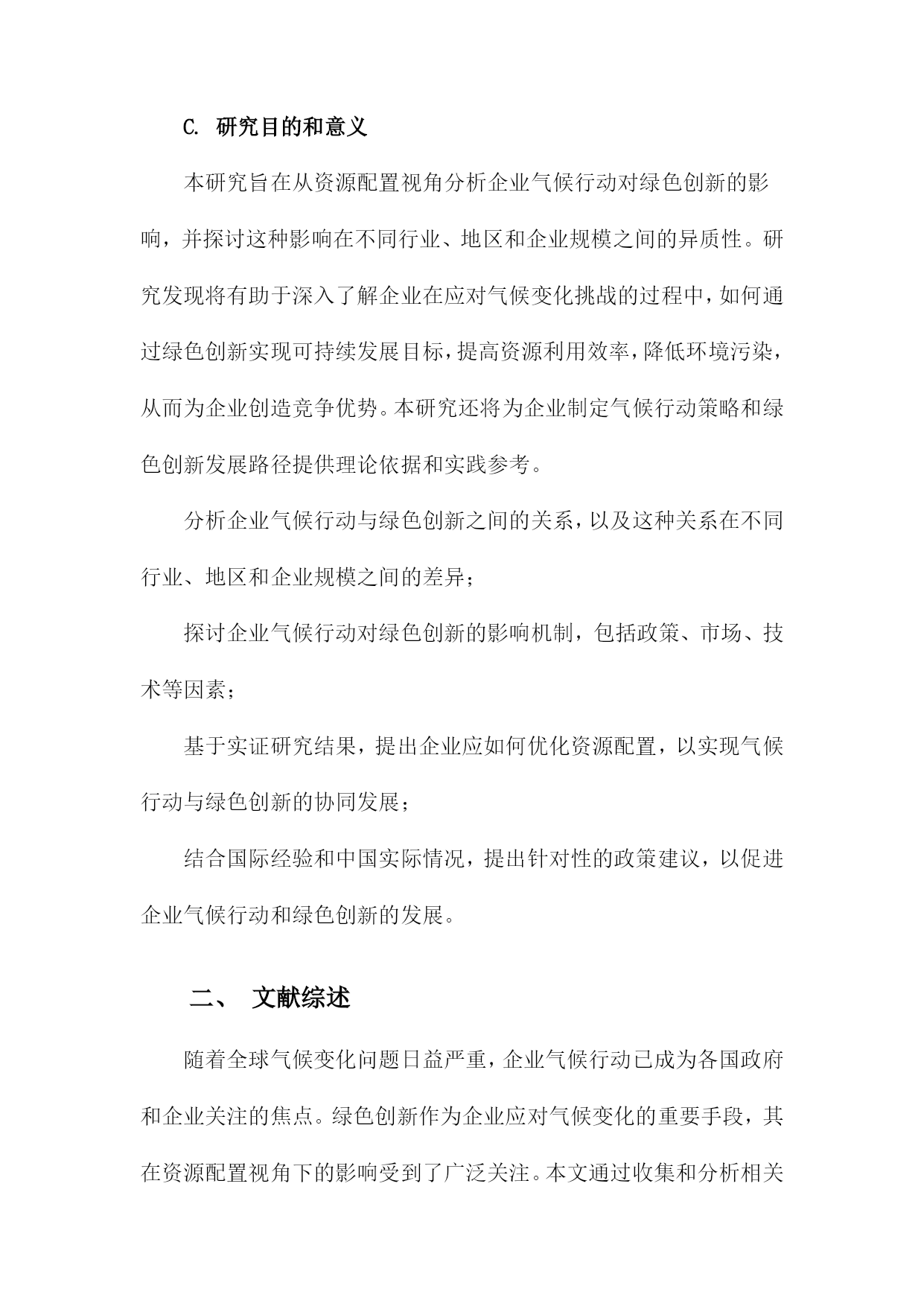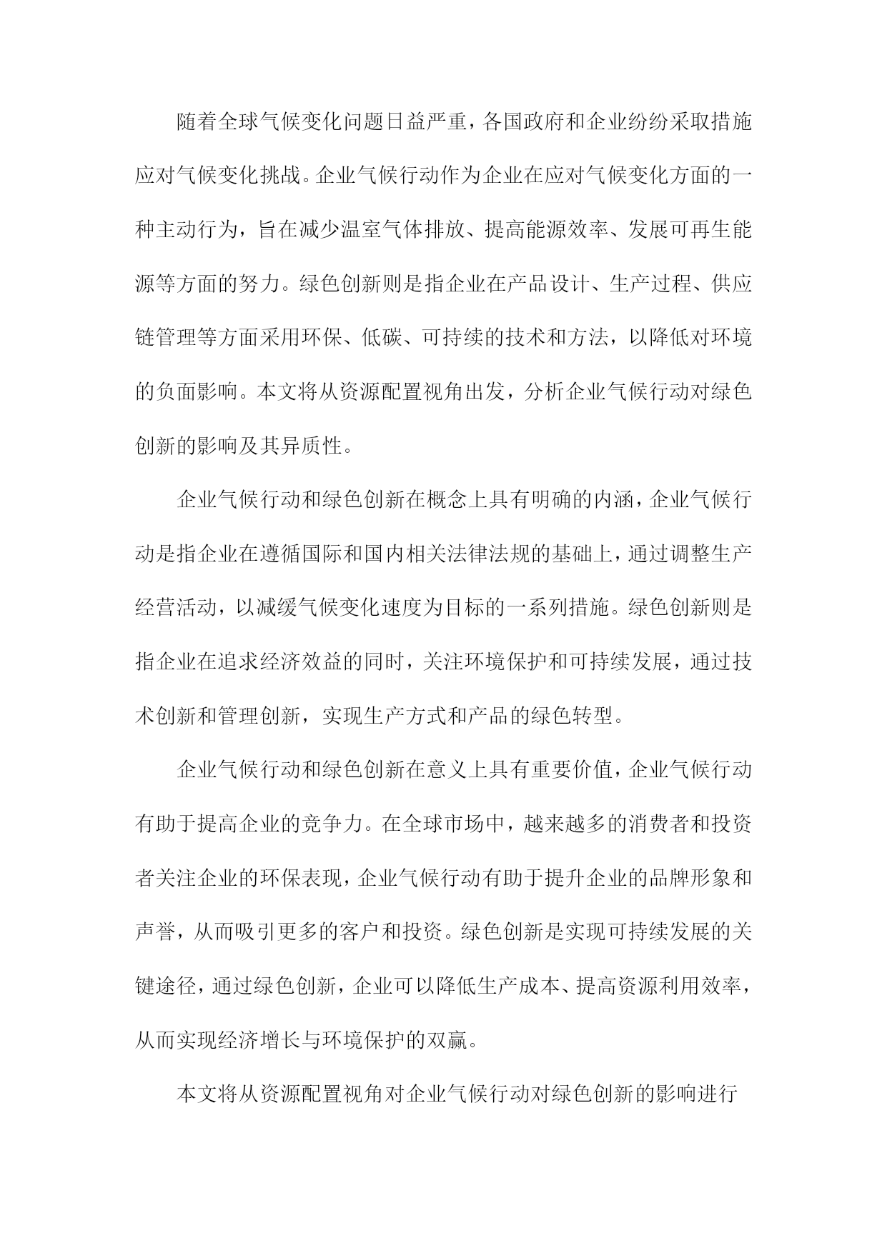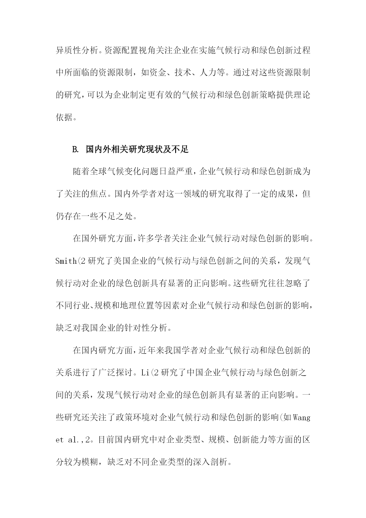 资源配置视角下企业气候行动对绿色创新影响的异质性分析一、研究背景随着全球气候变化问题日益严重,各国政府和企业纷纷采取措施应对气候变化挑战。绿色创新作为一种有效的解决方案,旨在通过降低资源消耗、减少污染排放和提高能源效率等方式,实现可持续发展。企业在实施绿色创新过程中面临着诸多挑战,如技术难题、投资成本、市场需求等。从资源配置视角对企业气候行动与绿色创新的关系进行研究具有重要的理论和实践意义。本研究旨在通过对企业气候行动与绿色创新的异质性分析,揭示不同类型企业在气候行动与绿色创新方面的差异及其影响因素,为企业制定有效的气候行动策略提供理论依据和实践指导。本文将从国际层面分析全球企业气候行动与绿色创新的整体现状,以期为我国企业参与全球气候治理提供借鉴。本文将选取具有代表性的企业案例,深入剖析企业在气候行动与绿色创新过程中所面临的具体问题及其原因。本文将结合相关理论框架,提出针对性的政策建议,以促进我国企业更好地参与气候治理和绿色创新。A.企业气候行动和绿色创新的概念和意义随着全球气候变化问题日益严重,各国政府和企业纷纷采取措施应对气候变化挑战。企业气候行动作为企业在应对气候变化方面的一种主动行为,旨在减少温室气体排放、提高能源效率、发展可再生能源等方面的努力。绿色创新则是指企业在产品设计、生产过程、供应链管理等方面采用环保、低碳、可持续的技术和方法,以降低对环境的负面影响。本文将从资源配置视角出发,分析企业气候行动对绿色创新的影响及其异质性。企业气候行动和绿色创新在概念上具有明确的内涵,企业气候行动是指企业在遵循国际和国内相关法律法规的基础上,通过调整生产经营活动,以减缓气候变化速度为目标的一系列措施。绿色创新则是指企业在追求经济效益的同时,关注环境保护和可持续发展,通过技术创新和管理创新,实现生产方式和产品的绿色转型。企业气候行动和绿色创新在意义上具有重要价值,企业气候行动有助于提高企业的竞争力。在全球市场中,越来越多的消费者和投资者关注企业的环保表现,企业气候行动有助于提升企业的品牌形象和声誉,从而吸引更多的客户和投资。绿色创新是实现可持续发展的关键途径,通过绿色创新,企业可以降低生产成本、提高资源利用效率,从而实现经济增长与环境保护的双赢。本文将从资源配置视角对企业气候行动对绿色创新的影响进行异质性分析。资源配置视角关注企业在实施气候行动和绿色创新过程中所面临的资源限制,如资金、技术、人力等。通过对这些资源限制的研究,可以为企业制定更有效的气候行动和绿色创新策略提供理论依据。B.国内外相关研究现状及不足随着全球气候变化问题日益严重,企业气候行动和绿色创新成为了关注的焦点。国内外学者对这一领域的研究取得了一定的成果,但仍存在一些不足之处。在国外研究方面,许多学者关注企业气候行动对绿色创新的影响。Smith(2研究了美国企业的气候行动与绿色创新之间的关系,发现气候行动对企业的绿色创新具有显著的正向影响。这些研究往往忽略了不同行业、规模和地理位置等因素对企业气候行动和绿色创新的影响,缺乏对我国企业的针对性分析。在国内研究方面,近年来我国学者对企业气候行动和绿色创新的关系进行了广泛探讨。Li(2研究了中国企业气候行动与绿色创新之间的关系,发现气候行动对企业的绿色创新具有显著的正向影响。一些研究还关注了政策环境对企业气候行动和绿色创新的影响(如Wangetal.,2。目前国内研究中对企业类型、规模、创新能力等方面的区分较为模糊,缺乏对不同企业类型的深入剖析。C.研究目的和意义本研究旨在从资源配置视角分析企业气候行动对绿色创新的影响,并探讨这种影响在不同行业、地区和企业规模之间的异质性。研究发现将有助于深入了解企业在应对气候变化挑战的过程中,如何通过绿色创新实现可持续发展目标,提高资源利用效率,降低环境污染,从而为企业创造竞争优势。本研究还将为企业制定气候行动策略和绿色创新发展路径提供理论依据和实践参考。分析企业气候行动与绿色创新之间的关系,以及这种关系在不同行业、地区和企业规模之间的差异;探讨企业气候行动对绿色创新的影响机制,包括政策、市场、技术等因素;基于实证研究结果,提出企业应如何优化资源配置,以实现气候行动与绿色创新的协同发展;结合国际经验和中国实际情况,提出针对性的政策建议,以促进企业气候行动和绿色创新的发展。二、文献综述随着全球气候变化问题日益严重,企业气候行动已成为各国政府和企业关注的焦点。绿色创新作为企业应对气候变化的重要手段,其在资源配置视角下的影响受到了广泛关注。本文通过收集和分析相关文献,对绿色创新与企业气候行动之间的异质性关系进行了深入探讨。研究发现绿色创新对企业气候行动的影响具有显著的异质性,不同行业、规模和地域的企业在气候行动方面的投入和成果存在较大差异。大型跨国企业