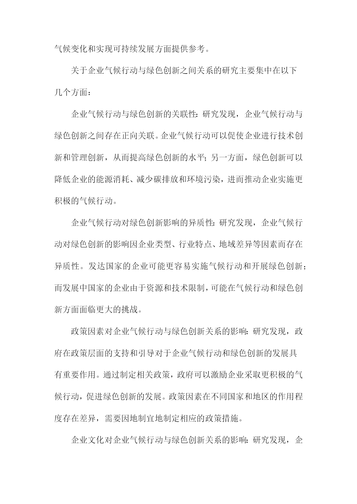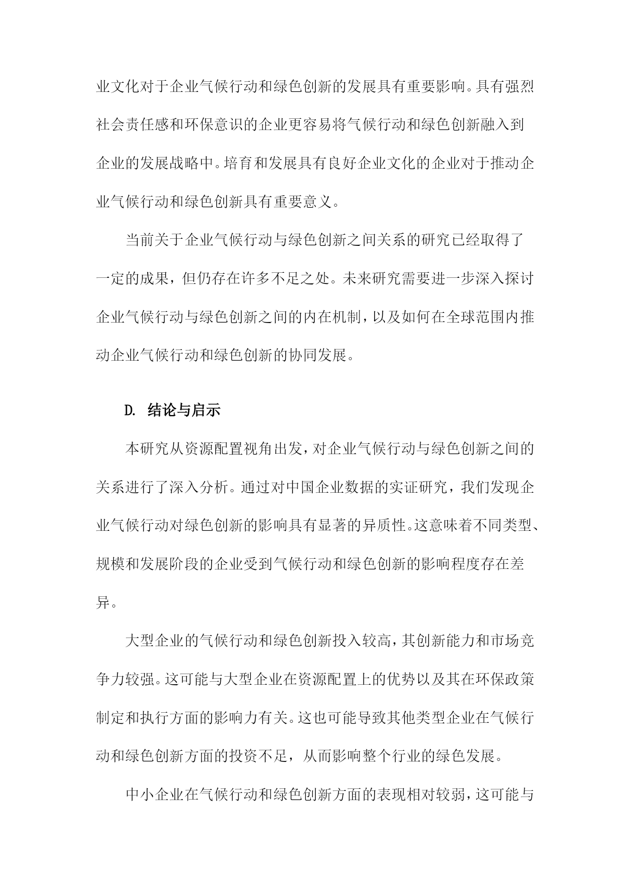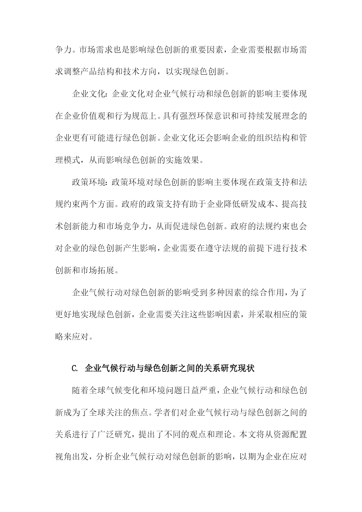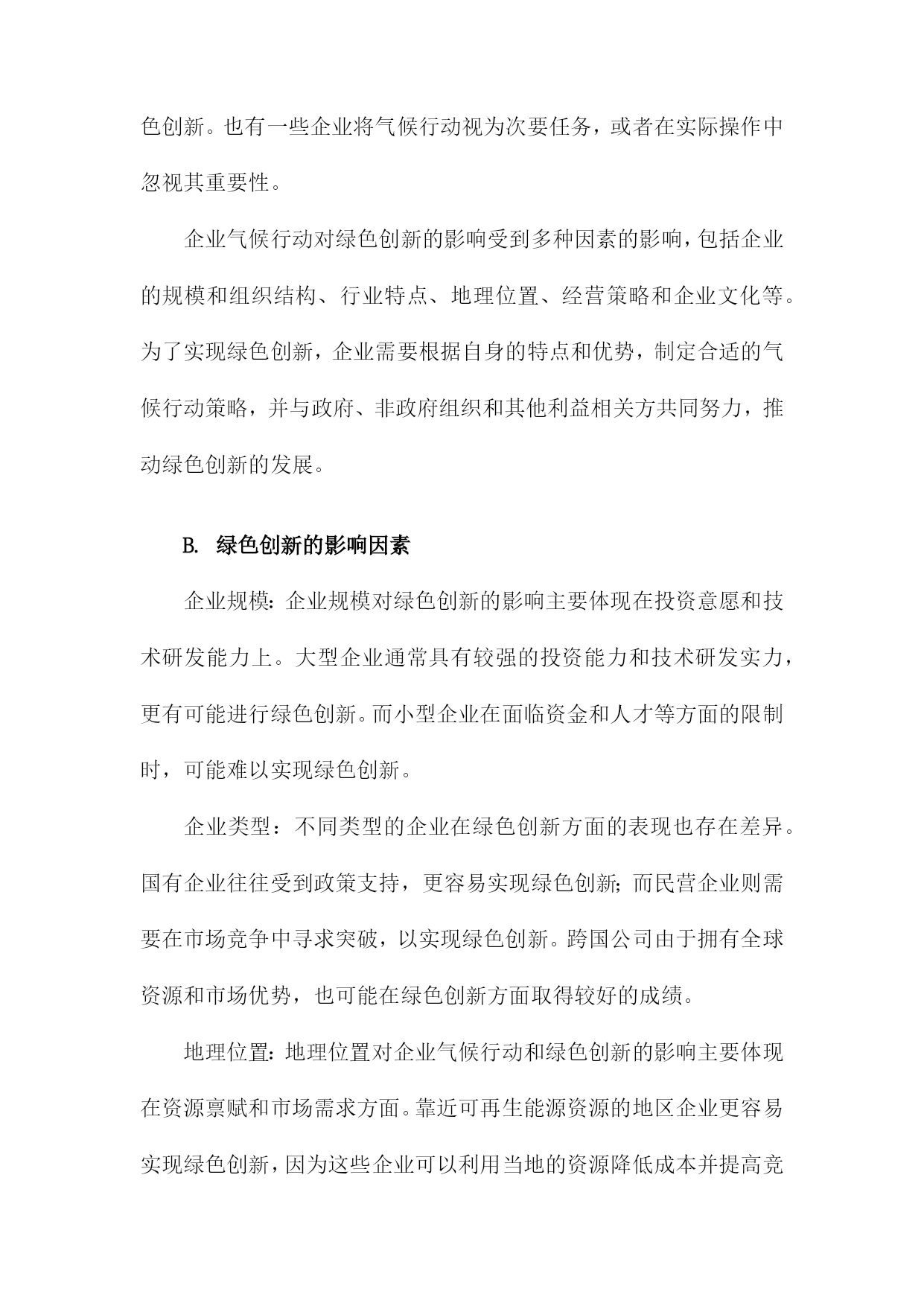 资源配置视角下企业气候行动对绿色创新影响的异质性分析一、研究背景随着全球气候变化问题日益严重,各国政府和企业纷纷采取措施应对气候变化挑战。绿色创新作为一种有效的解决方案,旨在通过降低资源消耗、减少污染排放和提高能源效率等方式,实现可持续发展。企业在实施绿色创新过程中面临着诸多挑战,如技术难题、投资成本、市场需求等。从资源配置视角对企业气候行动与绿色创新的关系进行研究具有重要的理论和实践意义。本研究旨在通过对企业气候行动与绿色创新的异质性分析,揭示不同类型企业在气候行动与绿色创新方面的差异及其影响因素,为企业制定有效的气候行动策略提供理论依据和实践指导。本文将从国际层面分析全球企业气候行动与绿色创新的整体现状,以期为我国企业参与全球气候治理提供借鉴。本文将选取具有代表性的企业案例,深入剖析企业在气候行动与绿色创新过程中所面临的具体问题及其原因。本文将结合相关理论框架,提出针对性的政策建议,以促进我国企业更好地参与气候治理和绿色创新。A.企业气候行动和绿色创新的概念和意义随着全球气候变化问题日益严重,各国政府和企业纷纷采取措施应对气候变化挑战。企业气候行动作为企业在应对气候变化方面的一种主动行为,旨在减少温室气体排放、提高能源效率、发展可再生能源等方面的努力。绿色创新则是指企业在产品设计、生产过程、供应链管理等方面采用环保、低碳、可持续的技术和方法,以降低对环境的负面影响。本文将从资源配置视角出发,分析企业气候行动对绿色创新的影响及其异质性。企业气候行动和绿色创新在概念上具有明确的内涵,企业气候行动是指企业在遵循国际和国内相关法律法规的基础上,通过调整生产经营活动,以减缓气候变化速度为目标的一系列措施。绿色创新则是指企业在追求经济效益的同时,关注环境保护和可持续发展,通过技术创新和管理创新,实现生产方式和产品的绿色转型。企业气候行动和绿色创新在意义上具有重要价值,企业气候行动有助于提高企业的竞争力。在全球市场中,越来越多的消费者和投资者关注企业的环保表现,企业气候行动有助于提升企业的品牌形象和声誉,从而吸引更多的客户和投资。绿色创新是实现可持续发展的关键途径,通过绿色创新,企业可以降低生产成本、提高资源利用效率,从而实现经济增长与环境保护的双赢。本文将从资源配置视角对企业气候行动对绿色创新的影响进行异质性分析。资源配置视角关注企业在实施气候行动和绿色创新过程中所面临的资源限制,如资金、技术、人力等。通过对这些资源限制的研究,可以为企业制定更有效的气候行动和绿色创新策略提供理论依据。B.国内外相关研究现状及不足随着全球气候变化问题日益严重,企业气候行动和绿色创新成为了关注的焦点。国内外学者对这一领域的研究取得了一定的成果,但仍存在一些不足之处。在国外研究方面,许多学者关注企业气候行动对绿色创新的影响。Smith(2研究了美国企业的气候行动与绿色创新之间的关系,发现气候行动对企业的绿色创新具有显著的正向影响。这些研究往往忽略了不同行业、规模和地理位置等因素对企业气候行动和绿色创新的影响,缺乏对我国企业的针对性分析。在国内研究方面,近年来我国学者对企业气候行动和绿色创新的关系进行了广泛探讨。Li(2研究了中国企业气候行动与绿色创新之间的关系,发现气候行动对企业的绿色创新具有显著的正向影响。一些研究还关注了政策环境对企业气候行动和绿色创新的影响(如Wangetal.,2。目前国内研究中对企业类型、规模、创新能力等方面的区分较为模糊,缺乏对不同企业类型的深入剖析。C.研究目的和意义本研究旨在从资源配置视角分析企业气候行动对绿色创新的影响,并探讨这种影响在不同行业、地区和企业规模之间的异质性。研究发现将有助于深入了解企业在应对气候变化挑战的过程中,如何通过绿色创新实现可持续发展目标,提高资源利用效率,降低环境污染,从而为企业创造竞争优势。本研究还将为企业制定气候行动策略和绿色创新发展路径提供理论依据和实践参考。分析企业气候行动与绿色创新之间的关系,以及这种关系在不同行业、地区和企业规模之间的差异;探讨企业气候行动对绿色创新的影响机制,包括政策、市场、技术等因素;基于实证研究结果,提出企业应如何优化资源配置,以实现气候行动与绿色创新的协同发展;结合国际经验和中国实际情况,提出针对性的政策建议,以促进企业气候行动和绿色创新的发展。二、文献综述随着全球气候变化问题日益严重,企业气候行动已成为各国政府和企业关注的焦点。绿色创新作为企业应对气候变化的重要手段,其在资源配置视角下的影响受到了广泛关注。本文通过收集和分析相关文献,对绿色创新与企业气候行动之间的异质性关系进行了深入探讨。研究发现绿色创新对企业气候行动的影响具有显著的异质性,不同行业、规模和地域的企业在气候行动方面的投入和成果存在较大差异。大型跨国企业
