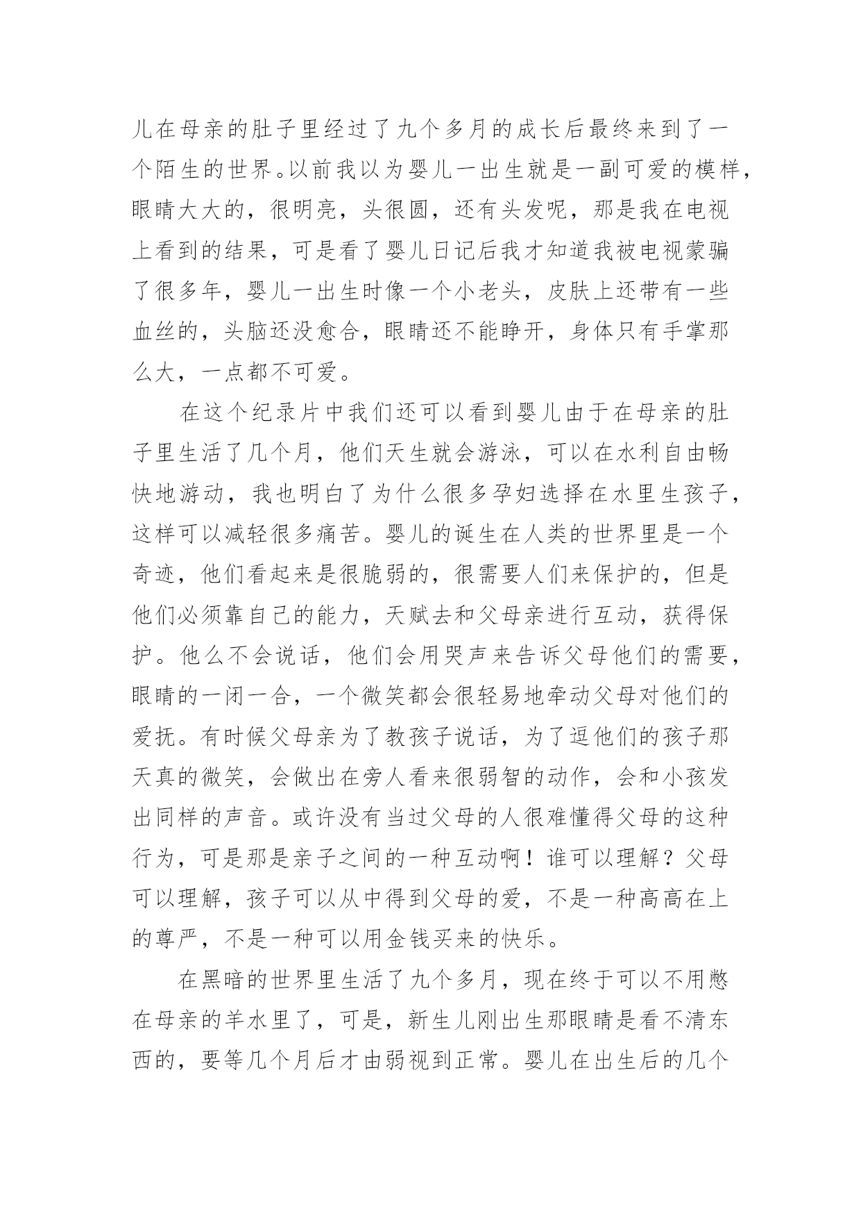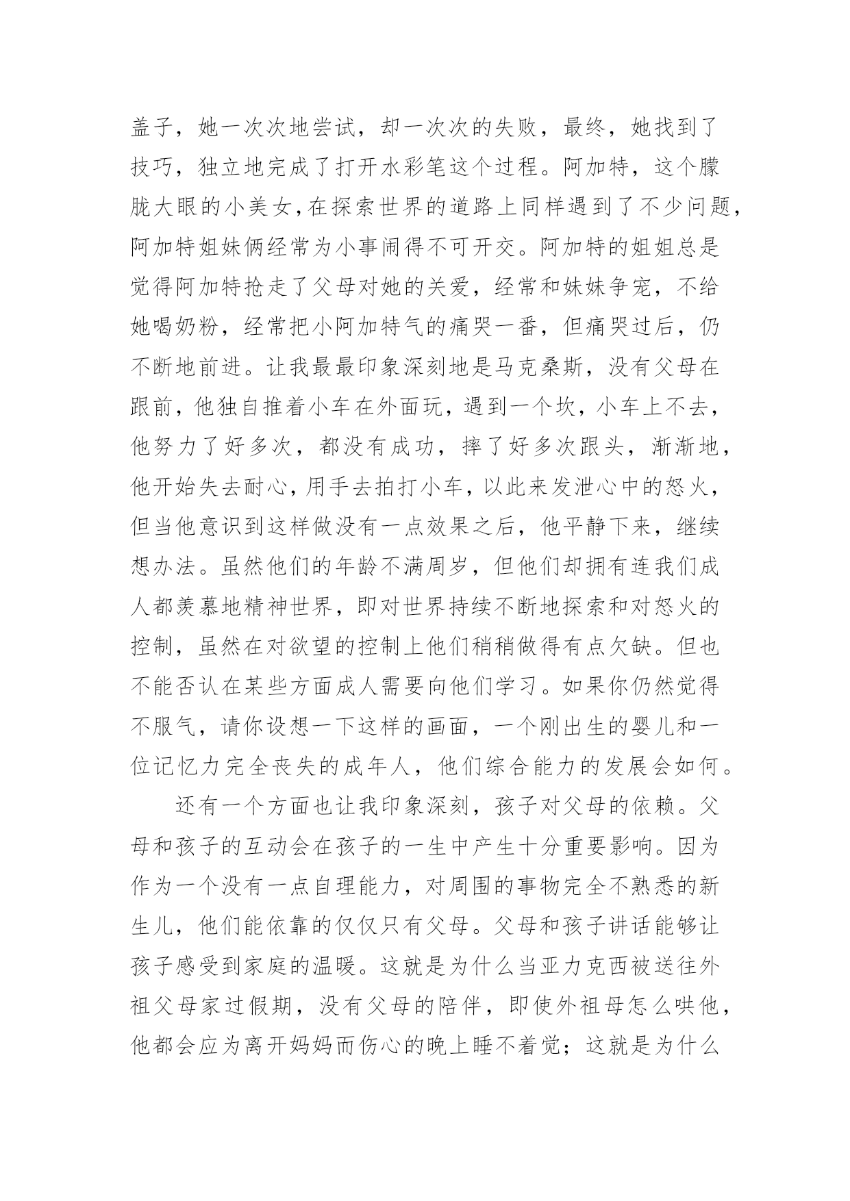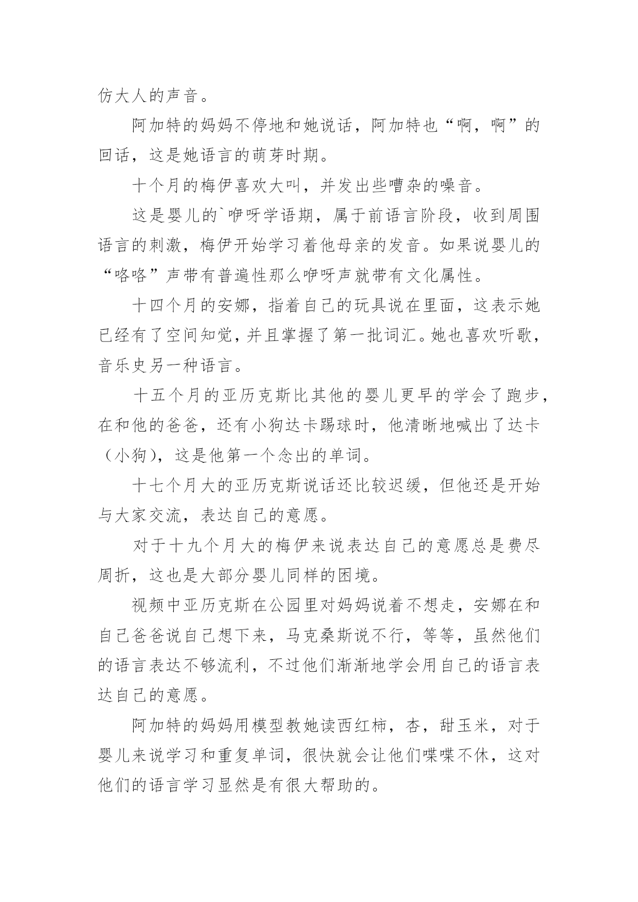 婴儿日记观后感婴儿日记观后感一天的生活不知不觉间结束了,相信你会领悟到不少东西,这时候,最关键的日记怎么能落下。那么什么样的日记才合适呢?下面是小编为大家整理的婴儿日记观后感,仅供参考,欢迎大家阅读。婴儿日记观后感1法国纪录片《婴儿日记》通过记录五个婴儿亚历克西斯、阿加特、马克桑斯、安娜和梅伊从出生到过完两岁生日的故事,让观众了解人类早期的生命成长过程——对周围声音事物的感知、学习爬行、走路、沟通,以及学会表达自己开始说话。本片是一部富有知识性而又充满趣味性和美好情感的科普纪录片。在婴儿刚出生时他们的语言的表达只有啼哭这一方式,而随后在他们睁开眼睛开始观察世界后(虽然只能见到30cm的范围)目光则成了她们的第一种语言。亚丽克西斯的父母在他旁边反复念他的名字,这对他将来对语言的学习无疑是有帮助的。安娜用啼哭来表达自己的情绪,例如:痛苦,饥饿。啼哭时一种报警信号,也用来表达情绪。两个月时啼哭时婴儿的独立语言,但很快会被取代。两个半月的马克桑斯不停地发出咯咯声,并且他试图模仿大人的声音。阿加特的妈妈不停地和她说话,阿加特也“啊,啊”的回话,这是她语言的萌芽时期。十个月的梅伊喜欢大叫,并发出些嘈杂的噪音。这是婴儿的`咿呀学语期,属于前语言阶段,收到周围语言的刺激,梅伊开始学习着他母亲的发音。如果说婴儿的“咯咯”声带有普遍性那么咿呀声就带有文化属性。十四个月的安娜,指着自己的玩具说在里面,这表示她已经有了空间知觉,并且掌握了第一批词汇。她也喜欢听歌,音乐史另一种语言。十五个月的亚历克斯比其他的婴儿更早的学会了跑步,在和他的爸爸,还有小狗达卡踢球时,他清晰地喊出了达卡(小狗),这是他第一个念出的单词。十七个月大的亚历克斯说话还比较迟缓,但他还是开始与大家交流,表达自己的意愿。对于十九个月大的梅伊来说表达自己的意愿总是费尽周折,这也是大部分婴儿同样的困境。视频中亚历克斯在公园里对妈妈说着不想走,安娜在和自己爸爸说自己想下来,马克桑斯说不行,等等,虽然他们的语言表达不够流利,不过他们渐渐地学会用自己的语言表达自己的意愿。阿加特的妈妈用模型教她读西红柿,杏,甜玉米,对于婴儿来说学习和重复单词,很快就会让他们喋喋不休,这对他们的语言学习显然是有很大帮助的。在这些孩子中,安娜的语言学习是最快的,她不仅能把单词组成句子,还能表达自己的意愿,于是对话开始产生;她的爸爸爸爸问她动物园里的小鸟跑哪儿去了,她准确的指着小鸟,告诉爸爸在那里,还告诉爸爸小鸟在干什么。另一方面二十一月大的梅伊,词汇量还很有限,但他也已经知道自己想要什么了。最后两岁大的他们已经学会独立言行了,本纪录片也到此结束。婴儿日记观后感2大约1岁半到两岁的阶段,是婴儿不断自我塑造、自我意识觉醒的时期。从出生开始,婴儿就在飞速学习着生存所需的各种技能,他们逐渐掌握的语言、运动的能力,并开始形成自己的性格、表达自己的意愿。但这些技能还只是一个完整、成熟的人身上的“零散部件”。从一岁半到两岁,这些“零散部件”将被组装整合,即开始婴儿的自我塑造,形成独立自主的自我意识。婴儿开始把自己作为客体来认知。两岁左右的婴儿已经能够意识到自己的独特特征,能从客体(如照片、录像)中认出自己,这表明婴儿已经具有明确的客体我的自我认知。此外,婴儿也知道自己的名字,能够用名字和代词“我”来称呼自己,用人称代词“你、她、他”称呼他人。已经具备一定语言能力的婴儿开始更多的表达自己的意愿,坚持自己的想法,面对父母的要求时他们也常常会说“不”。就如纪录片中所显示的那样,当父亲要给亚历克西斯换尿布时,亚历克西斯却拿着自己的尿布,摇着头说“不”;当安娜的母亲建议她在空白的纸面上画画时,安娜会坚持己见选择在有字的一面上涂涂画画,并一次次乐此不疲地翻到有字的纸面。这体现了婴儿自我意志开始增强。他们对自我身份、地位的定义和认知也有了一定的进步。亚历克西斯会模仿父母的行为去驱使、命令宠物狗,他开始明确自己在家庭和社会中的地位,明白自己作为人和其他生物存在区别。但这一时期,婴儿的自我意识体现出极大的“自我中心”思想,他们还没有接触足够多的'人和事物,并不具有较高的社会性。因此他们的种种行为和思想都从“我”出发,一定要满足“我”的意愿。当他们受到伤害,如坐着手推车滑到了或是撞到桌椅了,婴儿会很自然的去击打推车和桌椅。当他们的想象和行为没有得到父母的配合时,他们会哭闹着表达自己的不满。他们也还没有完全形成要和他人分享自己的资源的思想,这可以从婴儿和自己的兄弟姐妹争夺玩具或是想要霸占父母的行为中体现出来。不过,这种“自我中心”的不足将会随着父母家庭教育和孩子对社会和这个世界更多的探索而逐渐改变。我们应明白,自我意识对孩子的心理发展意义十分重大。孩子怎样认识自己,怎样安排和处理自己同周围世界以及同别人的关系,怎样评价自己的能力,具有什么样的自我