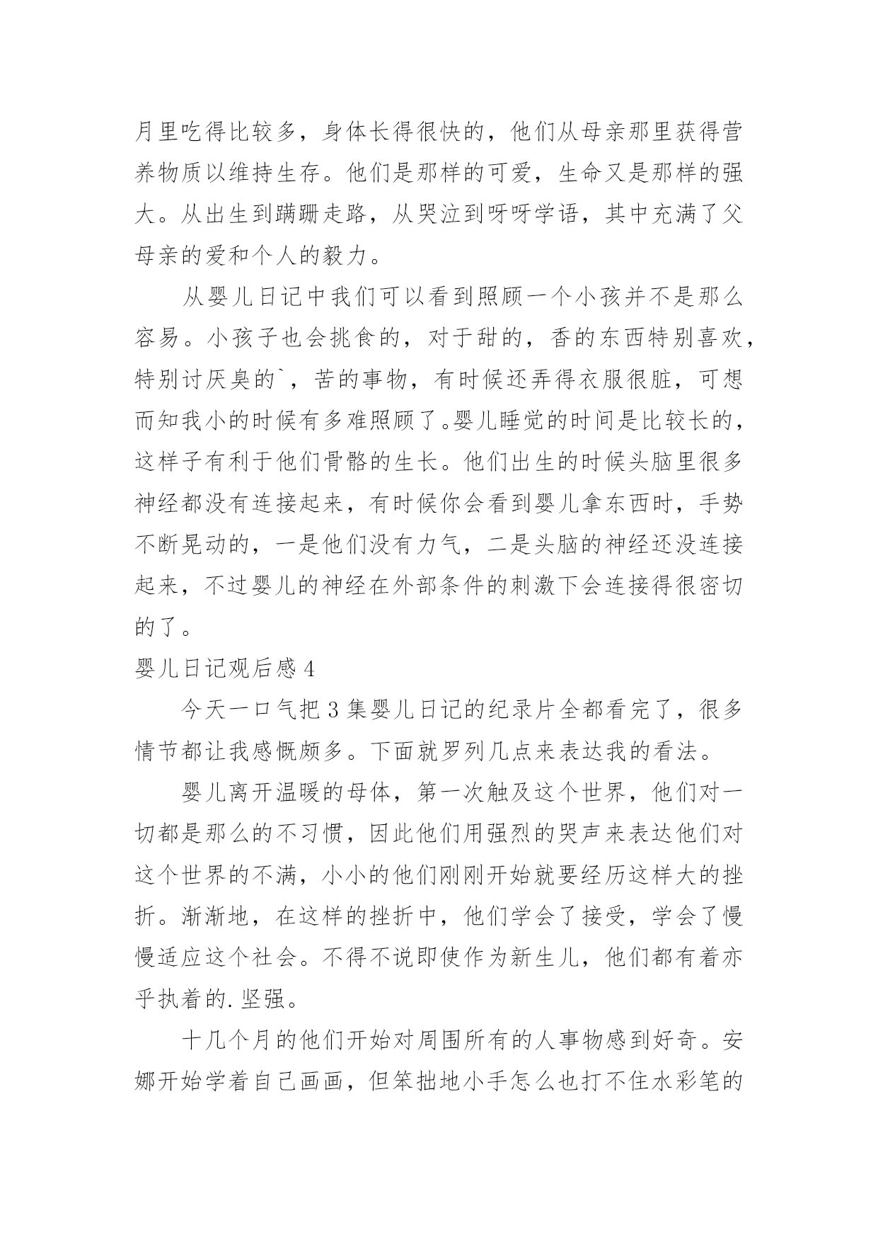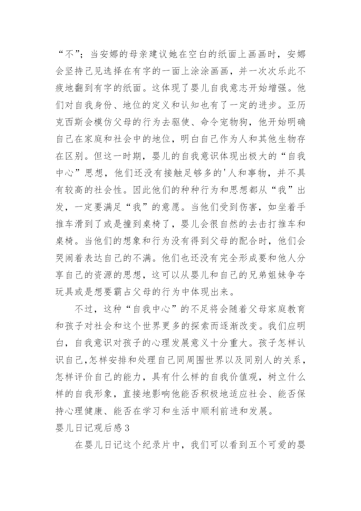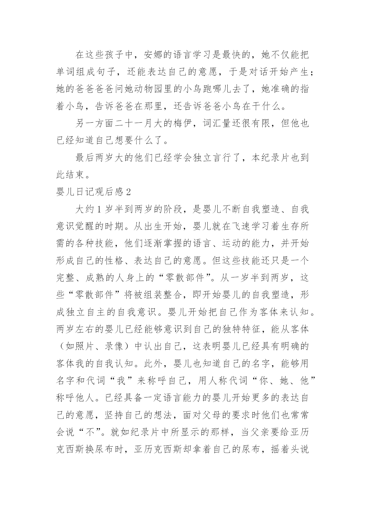 婴儿日记观后感婴儿日记观后感一天的生活不知不觉间结束了,相信你会领悟到不少东西,这时候,最关键的日记怎么能落下。那么什么样的日记才合适呢?下面是小编为大家整理的婴儿日记观后感,仅供参考,欢迎大家阅读。婴儿日记观后感1法国纪录片《婴儿日记》通过记录五个婴儿亚历克西斯、阿加特、马克桑斯、安娜和梅伊从出生到过完两岁生日的故事,让观众了解人类早期的生命成长过程——对周围声音事物的感知、学习爬行、走路、沟通,以及学会表达自己开始说话。本片是一部富有知识性而又充满趣味性和美好情感的科普纪录片。在婴儿刚出生时他们的语言的表达只有啼哭这一方式,而随后在他们睁开眼睛开始观察世界后(虽然只能见到30cm的范围)目光则成了她们的第一种语言。亚丽克西斯的父母在他旁边反复念他的名字,这对他将来对语言的学习无疑是有帮助的。安娜用啼哭来表达自己的情绪,例如:痛苦,饥饿。啼哭时一种报警信号,也用来表达情绪。两个月时啼哭时婴儿的独立语言,但很快会被取代。两个半月的马克桑斯不停地发出咯咯声,并且他试图模仿大人的声音。阿加特的妈妈不停地和她说话,阿加特也“啊,啊”的回话,这是她语言的萌芽时期。十个月的梅伊喜欢大叫,并发出些嘈杂的噪音。这是婴儿的`咿呀学语期,属于前语言阶段,收到周围语言的刺激,梅伊开始学习着他母亲的发音。如果说婴儿的“咯咯”声带有普遍性那么咿呀声就带有文化属性。十四个月的安娜,指着自己的玩具说在里面,这表示她已经有了空间知觉,并且掌握了第一批词汇。她也喜欢听歌,音乐史另一种语言。十五个月的亚历克斯比其他的婴儿更早的学会了跑步,在和他的爸爸,还有小狗达卡踢球时,他清晰地喊出了达卡(小狗),这是他第一个念出的单词。十七个月大的亚历克斯说话还比较迟缓,但他还是开始与大家交流,表达自己的意愿。对于十九个月大的梅伊来说表达自己的意愿总是费尽周折,这也是大部分婴儿同样的困境。视频中亚历克斯在公园里对妈妈说着不想走,安娜在和自己爸爸说自己想下来,马克桑斯说不行,等等,虽然他们的语言表达不够流利,不过他们渐渐地学会用自己的语言表达自己的意愿。阿加特的妈妈用模型教她读西红柿,杏,甜玉米,对于婴儿来说学习和重复单词,很快就会让他们喋喋不休,这对他们的语言学习显然是有很大帮助的。在这些孩子中,安娜的语言学习是最快的,她不仅能把单词组成句子,还能表达自己的意愿,于是对话开始产生;她的爸爸爸爸问她动物园里的小鸟跑哪儿去了,她准确的指着小鸟,告诉爸爸在那里,还告诉爸爸小鸟在干什么。另一方面二十一月大的梅伊,词汇量还很有限,但他也已经知道自己想要什么了。最后两岁大的他们已经学会独立言行了,本纪录片也到此结束。婴儿日记观后感2大约1岁半到两岁的阶段,是婴儿不断自我塑造、自我意识觉醒的时期。从出生开始,婴儿就在飞速学习着生存所需的各种技能,他们逐渐掌握的语言、运动的能力,并开始形成自己的性格、表达自己的意愿。但这些技能还只是一个完整、成熟的人身上的“零散部件”。从一岁半到两岁,这些“零散部件”将被组装整合,即开始婴儿的自我塑造,形成独立自主的自我意识。婴儿开始把自己作为客体来认知。两岁左右的婴儿已经能够意识到自己的独特特征,能从客体(如照片、录像)中认出自己,这表明婴儿已经具有明确的客体我的自我认知。此外,婴儿也知道自己的名字,能够用名字和代词“我”来称呼自己,用人称代词“你、她、他”称呼他人。已经具备一定语言能力的婴儿开始更多的表达自己的意愿,坚持自己的想法,面对父母的要求时他们也常常会说“不”。就如纪录片中所显示的那样,当父亲要给亚历克西斯换尿布时,亚历克西斯却拿着自己的尿布,摇着头说“不”;当安娜的母亲建议她在空白的纸面上画画时,安娜会坚持己见选择在有字的一面上涂涂画画,并一次次乐此不疲地翻到有字的纸面。这体现了婴儿自我意志开始增强。他们对自我身份、地位的定义和认知也有了一定的进步。亚历克西斯会模仿父母的行为去驱使、命令宠物狗,他开始明确自己在家庭和社会中的地位,明白自己作为人和其他生物存在区别。但这一时期,婴儿的自我意识体现出极大的“自我中心”思想,他们还没有接触足够多的'人和事物,并不具有较高的社会性。因此他们的种种行为和思想都从“我”出发,一定要满足“我”的意愿。当他们受到伤害,如坐着手推车滑到了或是撞到桌椅了,婴儿会很自然的去击打推车和桌椅。当他们的想象和行为没有得到父母的配合时,他们会哭闹着表达自己的不满。他们也还没有完全形成要和他人分享自己的资源的思想,这可以从婴儿和自己的兄弟姐妹争夺玩具或是想要霸占父母的行为中体现出来。不过,这种“自我中心”的不足将会随着父母家庭教育和孩子对社会和这个世界更多的探索而逐渐改变。我们应明白,自我意识对孩子的心理发展意义十分重大。孩子怎样认识自己,怎样安排和处理自己同周围世界以及同别人的关系,怎样评价自己的能力,具有什么样的自我
