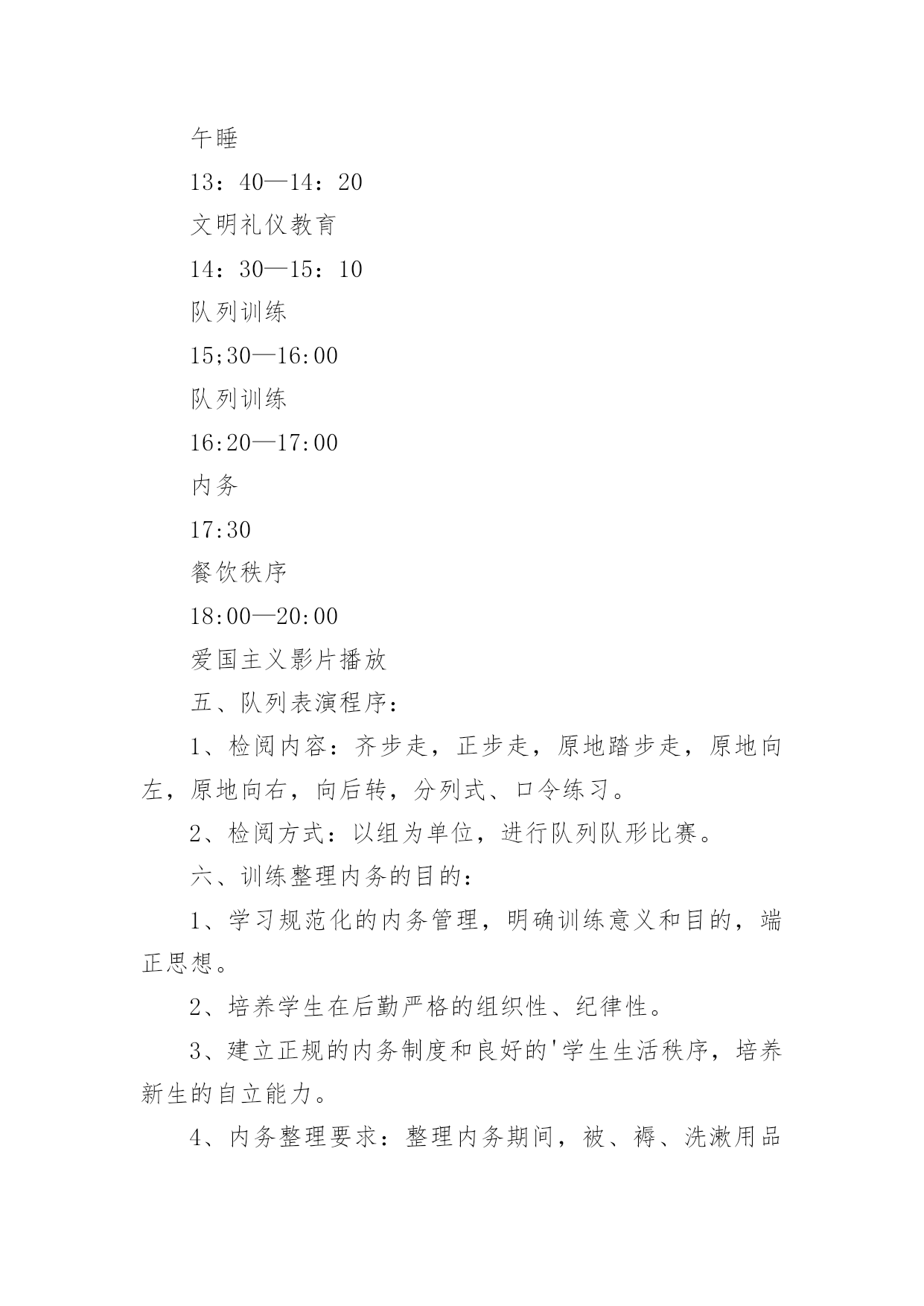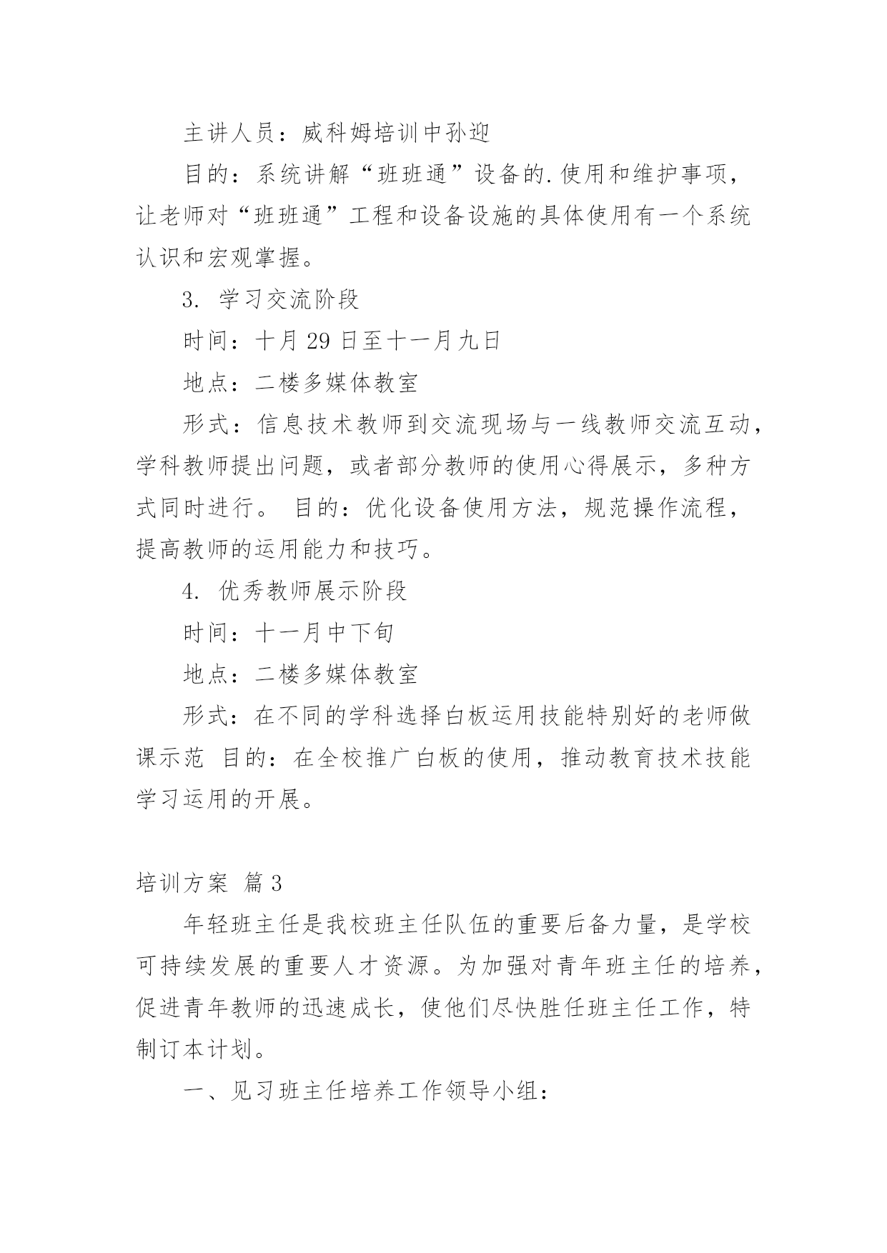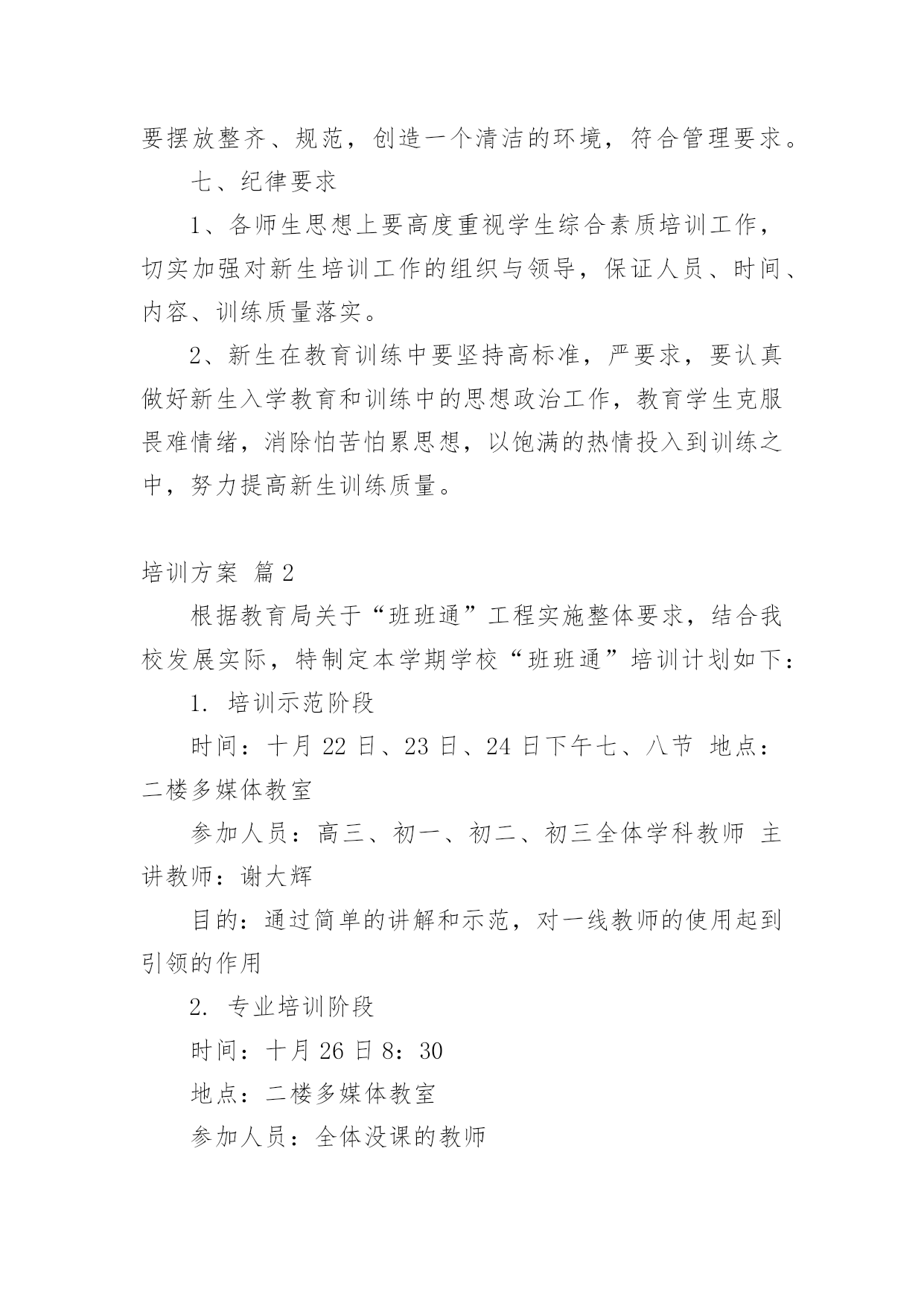 培训方案实用的培训方案7篇【精选】为了确保工作或事情能高效地开展,时常需要预先开展方案准备工作,方案是书面计划,具有内容条理清楚、步骤清晰的特点。那要怎么制定科学的方案呢?下面是小编为大家整理的培训方案8篇,欢迎大家借鉴与参考,希望对大家有所帮助。培训方案篇1一、指导思想:以新时期国防教育法规为指导,以军事训练和规章制度教育为手段,着眼未来学生"四纪"培养目标,提高学生的综合素质,树立遵章守纪意识,在养成上下功夫,进一步推进我校学生管理工作进程,培养初一新生的团队精神及能吃苦、守纪律的良好品格,更努力培养和造就新世纪合格人才。二、培训内容:1、队列训练,齐步走,正步走,原地踏步走,原地向左、向右、向后转,集合,解散,口令练习;2、内务整理;3、学唱红歌;三、培训领导小组组长:副组长:组员:四、训练要求及作息时间安排:1、责任人根据作息时间按时到岗。2、班主任老师要耐心细致地做好学生的养成教育工作(文明礼仪、行为习惯、待人接物、着装及安全等)。3、一天训练结束后,体育老师要对训练课情况做较全面讲评,提出相关要求。4、负责内务的教师一定要指导、监督、管理到位,保证学生在后勤时间段的一切安全。作息时间安排(28日—30日)训练时间训练内容责任人7;30—8:10文明礼仪教育8;20—9;00队列训练9:20—10:00队列训练10:20—11:00学唱红歌11:30餐饮秩序12:10—12:10午睡13:40—14:20文明礼仪教育14:30—15:10队列训练15;30—16:00队列训练16:20—17:00内务17:30餐饮秩序18:00—20:00爱国主义影片播放五、队列表演程序:1、检阅内容:齐步走,正步走,原地踏步走,原地向左,原地向右,向后转,分列式、口令练习。2、检阅方式:以组为单位,进行队列队形比赛。六、训练整理内务的目的:1、学习规范化的内务管理,明确训练意义和目的,端正思想。2、培养学生在后勤严格的组织性、纪律性。3、建立正规的内务制度和良好的'学生生活秩序,培养新生的自立能力。4、内务整理要求:整理内务期间,被、褥、洗漱用品要摆放整齐、规范,创造一个清洁的环境,符合管理要求。七、纪律要求1、各师生思想上要高度重视学生综合素质培训工作,切实加强对新生培训工作的组织与领导,保证人员、时间、内容、训练质量落实。2、新生在教育训练中要坚持高标准,严要求,要认真做好新生入学教育和训练中的思想政治工作,教育学生克服畏难情绪,消除怕苦怕累思想,以饱满的热情投入到训练之中,努力提高新生训练质量。培训方案篇2根据教育局关于“班班通”工程实施整体要求,结合我校发展实际,特制定本学期学校“班班通”培训计划如下:1.培训示范阶段时间:十月22日、23日、24日下午七、八节地点:二楼多媒体教室参加人员:高三、初一、初二、初三全体学科教师主讲教师:谢大辉目的:通过简单的讲解和示范,对一线教师的使用起到引领的作用2.专业培训阶段时间:十月26日8:30地点:二楼多媒体教室参加人员:全体没课的教师主讲人员:威科姆培训中孙迎目的:系统讲解“班班通”设备的.使用和维护事项,让老师对“班班通”工程和设备设施的具体使用有一个系统认识和宏观掌握。3.学习交流阶段时间:十月29日至十一月九日地点:二楼多媒体教室形式:信息技术教师到交流现场与一线教师交流互动,学科教师提出问题,或者部分教师的使用心得展示,多种方式同时进行。目的:优化设备使用方法,规范操作流程,提高教师的运用能力和技巧。4.优秀教师展示阶段时间:十一月中下旬地点:二楼多媒体教室形式:在不同的学科选择白板运用技能特别好的老师做课示范目的:在全校推广白板的使用,推动教育技术技能学习运用的开展。培训方案篇3年轻班主任是我校班主任队伍的重要后备力量,是学校可持续发展的重要人才资源。为加强对青年班主任的培养,促进青年教师的迅速成长,使他们尽快胜任班主任工作,特制订本计划。一、见习班主任培养工作领导小组:组长:杜心华副组长:李明萱、胡毅组员:罗俊龙、鲍殊佳、方文、李朝晖、游小文、刘军乔、谭建平二、见习班主任要求:1、端正态度,认真学习:(1)学习教育理论。认真学习有关班主任工作的理论、方法、艺术等书籍,做好,及时记下自己的读书心得。(2)向指导班主任学习。虚心请教、诚恳接受指导班主任的指导,定期与指导班主任进行交流,与班主任一起研究参与班级的各项工作。(3)在实践中学习。积极协助指导班主任,做好所见习的班级各方面的工作,自觉履行班主任工作职责,并对实践工作进行总结与思考。2、身体力行,积极实践(1)深入了解学生的学习、行为、思想、身心等各方面的情况,帮助所见习班级的班主任有针对性地做好学生思想教育工作,特别是配合做好学习有困难、行为习惯较差等后进同学的疏导转化工作。(2)见习期间,要积极参与班级的