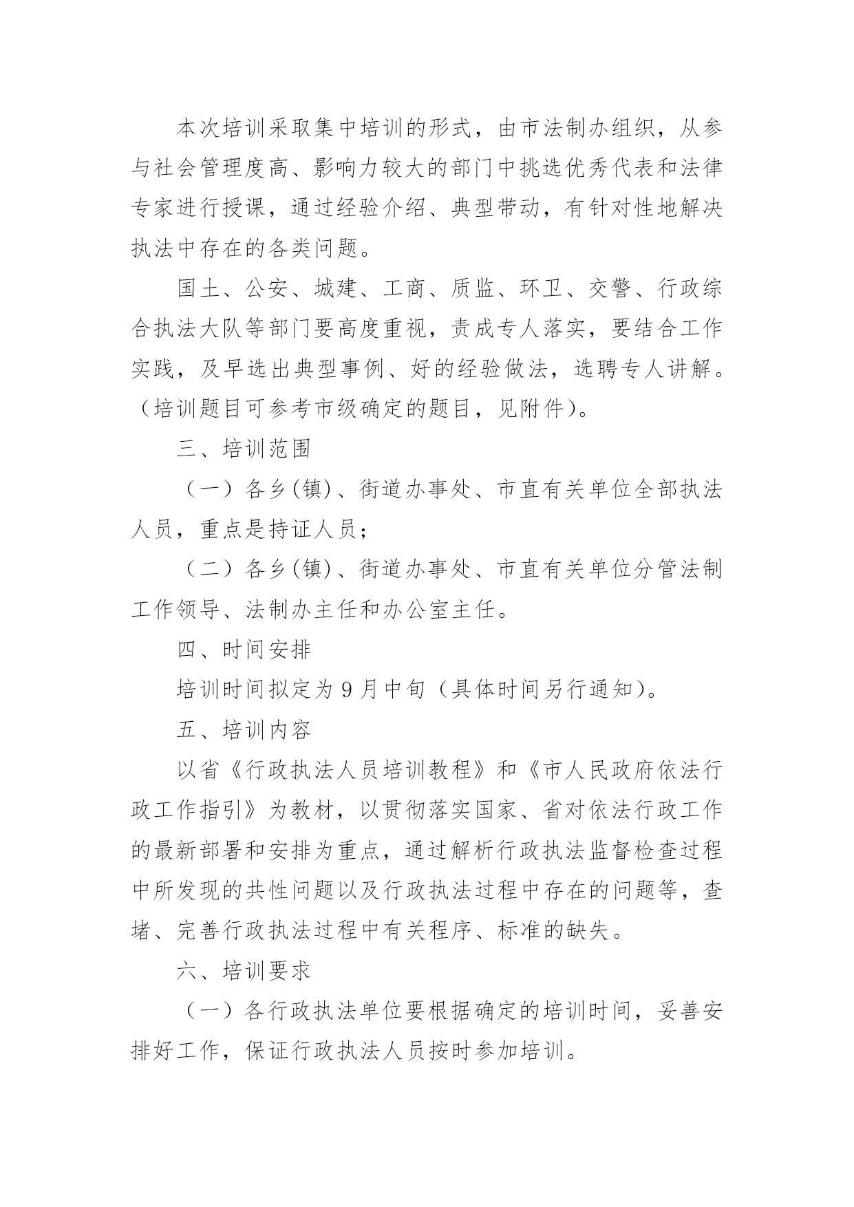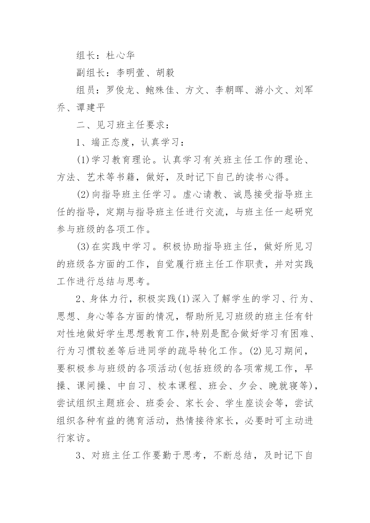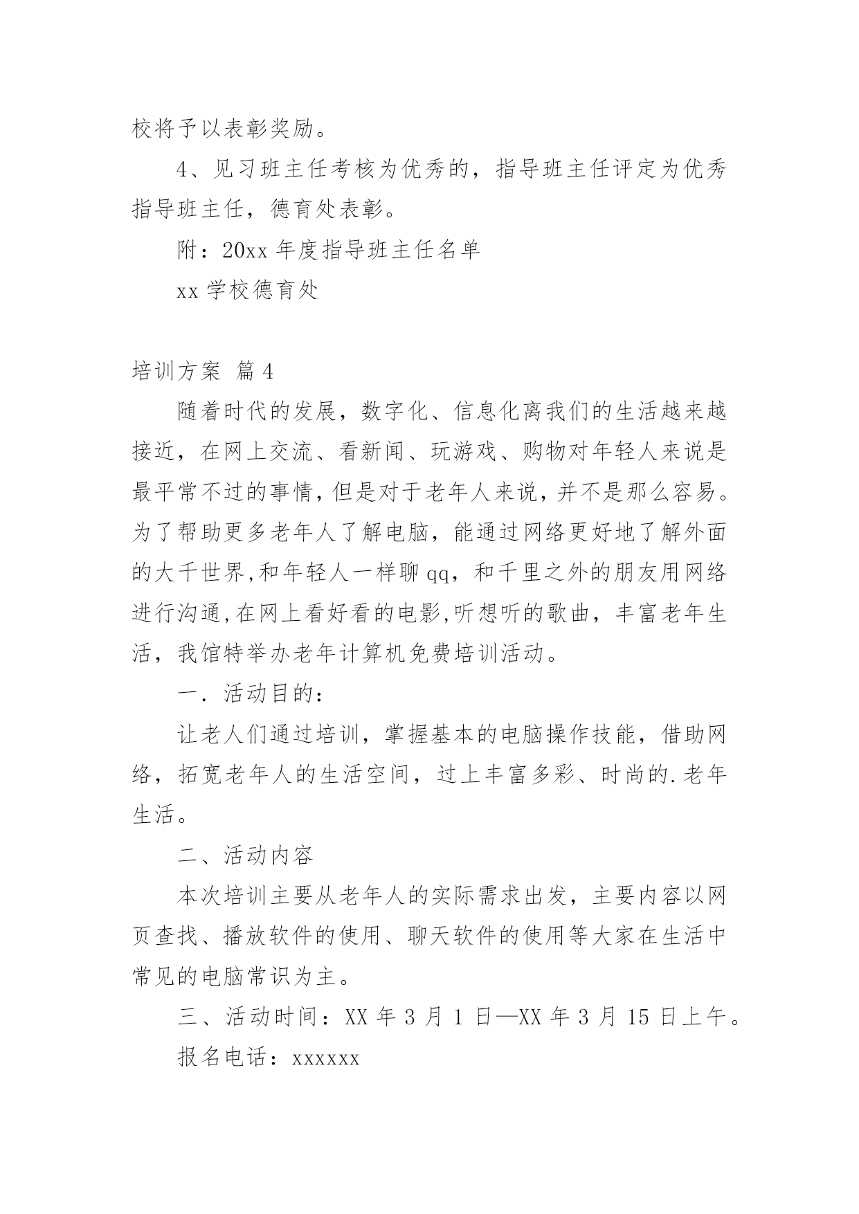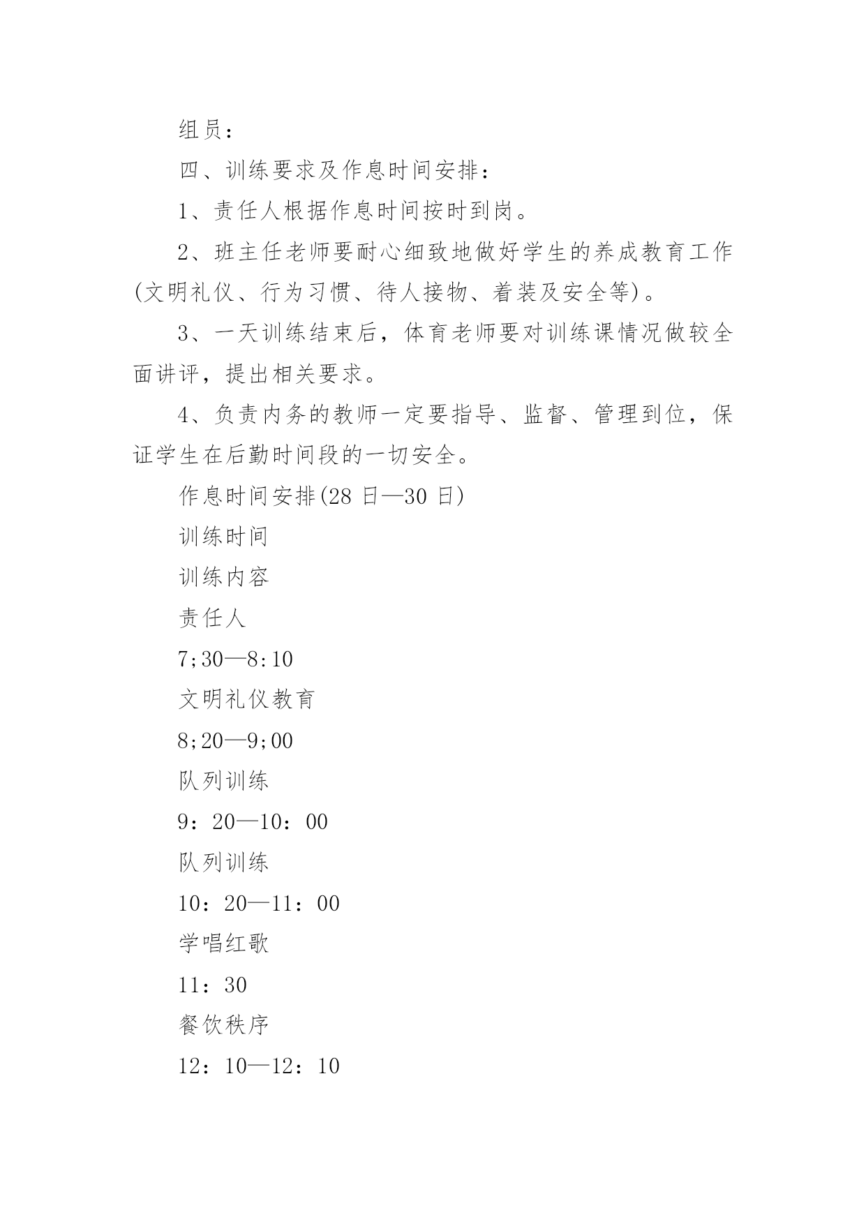 培训方案实用的培训方案7篇【精选】为了确保工作或事情能高效地开展,时常需要预先开展方案准备工作,方案是书面计划,具有内容条理清楚、步骤清晰的特点。那要怎么制定科学的方案呢?下面是小编为大家整理的培训方案8篇,欢迎大家借鉴与参考,希望对大家有所帮助。培训方案篇1一、指导思想:以新时期国防教育法规为指导,以军事训练和规章制度教育为手段,着眼未来学生"四纪"培养目标,提高学生的综合素质,树立遵章守纪意识,在养成上下功夫,进一步推进我校学生管理工作进程,培养初一新生的团队精神及能吃苦、守纪律的良好品格,更努力培养和造就新世纪合格人才。二、培训内容:1、队列训练,齐步走,正步走,原地踏步走,原地向左、向右、向后转,集合,解散,口令练习;2、内务整理;3、学唱红歌;三、培训领导小组组长:副组长:组员:四、训练要求及作息时间安排:1、责任人根据作息时间按时到岗。2、班主任老师要耐心细致地做好学生的养成教育工作(文明礼仪、行为习惯、待人接物、着装及安全等)。3、一天训练结束后,体育老师要对训练课情况做较全面讲评,提出相关要求。4、负责内务的教师一定要指导、监督、管理到位,保证学生在后勤时间段的一切安全。作息时间安排(28日—30日)训练时间训练内容责任人7;30—8:10文明礼仪教育8;20—9;00队列训练9:20—10:00队列训练10:20—11:00学唱红歌11:30餐饮秩序12:10—12:10午睡13:40—14:20文明礼仪教育14:30—15:10队列训练15;30—16:00队列训练16:20—17:00内务17:30餐饮秩序18:00—20:00爱国主义影片播放五、队列表演程序:1、检阅内容:齐步走,正步走,原地踏步走,原地向左,原地向右,向后转,分列式、口令练习。2、检阅方式:以组为单位,进行队列队形比赛。六、训练整理内务的目的:1、学习规范化的内务管理,明确训练意义和目的,端正思想。2、培养学生在后勤严格的组织性、纪律性。3、建立正规的内务制度和良好的'学生生活秩序,培养新生的自立能力。4、内务整理要求:整理内务期间,被、褥、洗漱用品要摆放整齐、规范,创造一个清洁的环境,符合管理要求。七、纪律要求1、各师生思想上要高度重视学生综合素质培训工作,切实加强对新生培训工作的组织与领导,保证人员、时间、内容、训练质量落实。2、新生在教育训练中要坚持高标准,严要求,要认真做好新生入学教育和训练中的思想政治工作,教育学生克服畏难情绪,消除怕苦怕累思想,以饱满的热情投入到训练之中,努力提高新生训练质量。培训方案篇2根据教育局关于“班班通”工程实施整体要求,结合我校发展实际,特制定本学期学校“班班通”培训计划如下:1.培训示范阶段时间:十月22日、23日、24日下午七、八节地点:二楼多媒体教室参加人员:高三、初一、初二、初三全体学科教师主讲教师:谢大辉目的:通过简单的讲解和示范,对一线教师的使用起到引领的作用2.专业培训阶段时间:十月26日8:30地点:二楼多媒体教室参加人员:全体没课的教师主讲人员:威科姆培训中孙迎目的:系统讲解“班班通”设备的.使用和维护事项,让老师对“班班通”工程和设备设施的具体使用有一个系统认识和宏观掌握。3.学习交流阶段时间:十月29日至十一月九日地点:二楼多媒体教室形式:信息技术教师到交流现场与一线教师交流互动,学科教师提出问题,或者部分教师的使用心得展示,多种方式同时进行。目的:优化设备使用方法,规范操作流程,提高教师的运用能力和技巧。4.优秀教师展示阶段时间:十一月中下旬地点:二楼多媒体教室形式:在不同的学科选择白板运用技能特别好的老师做课示范目的:在全校推广白板的使用,推动教育技术技能学习运用的开展。培训方案篇3年轻班主任是我校班主任队伍的重要后备力量,是学校可持续发展的重要人才资源。为加强对青年班主任的培养,促进青年教师的迅速成长,使他们尽快胜任班主任工作,特制订本计划。一、见习班主任培养工作领导小组:组长:杜心华副组长:李明萱、胡毅组员:罗俊龙、鲍殊佳、方文、李朝晖、游小文、刘军乔、谭建平二、见习班主任要求:1、端正态度,认真学习:(1)学习教育理论。认真学习有关班主任工作的理论、方法、艺术等书籍,做好,及时记下自己的读书心得。(2)向指导班主任学习。虚心请教、诚恳接受指导班主任的指导,定期与指导班主任进行交流,与班主任一起研究参与班级的各项工作。(3)在实践中学习。积极协助指导班主任,做好所见习的班级各方面的工作,自觉履行班主任工作职责,并对实践工作进行总结与思考。2、身体力行,积极实践(1)深入了解学生的学习、行为、思想、身心等各方面的情况,帮助所见习班级的班主任有针对性地做好学生思想教育工作,特别是配合做好学习有困难、行为习惯较差等后进同学的疏导转化工作。(2)见习期间,要积极参与班级的