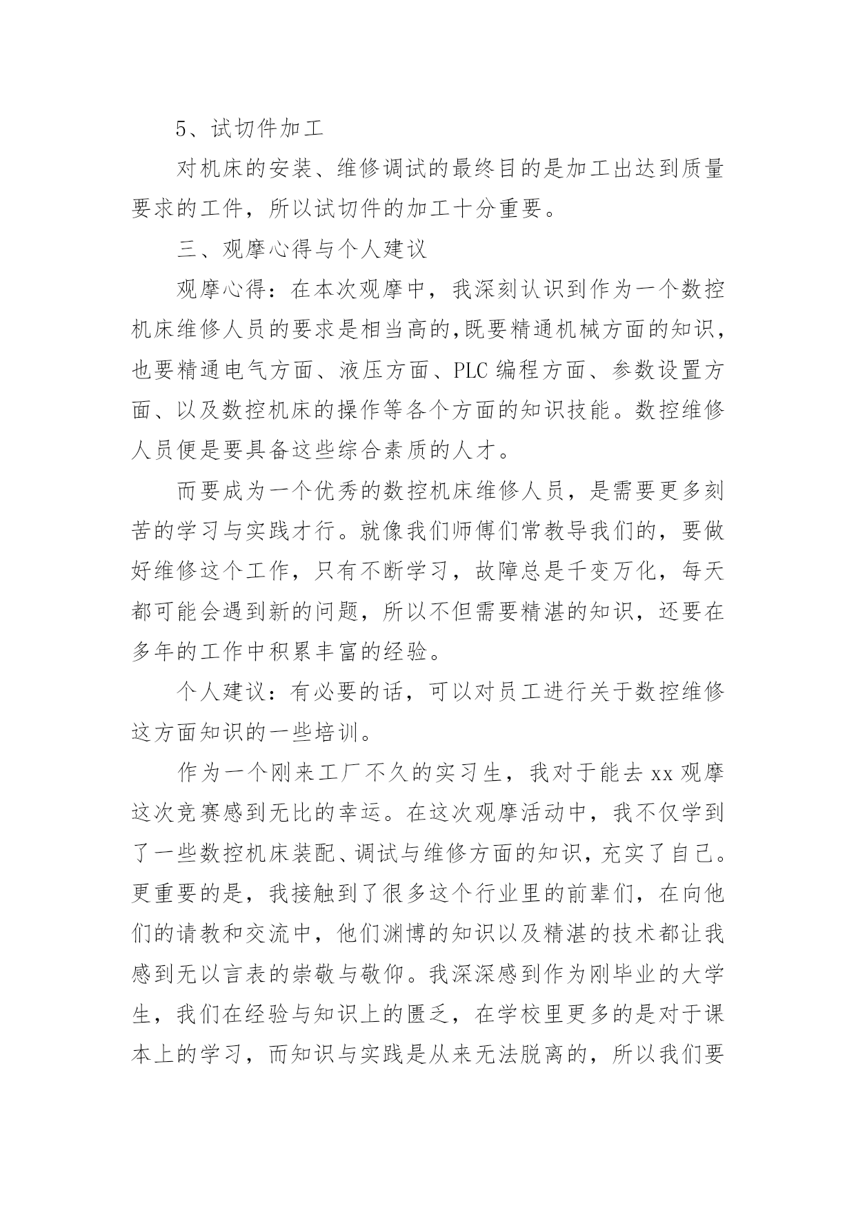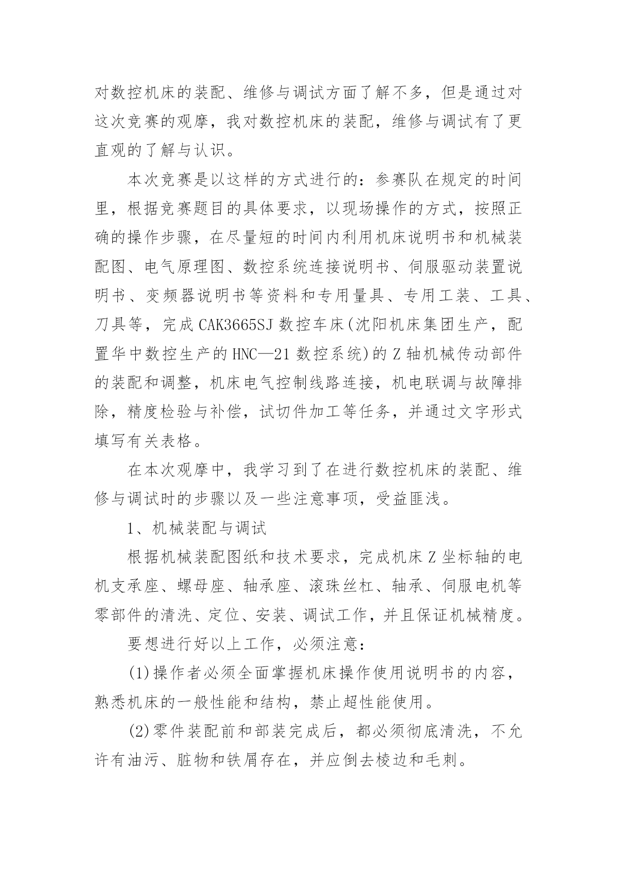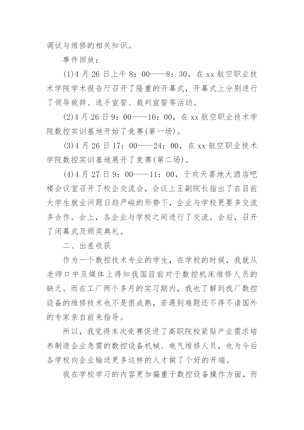 出差工作总结出差工作总结总结是事后对某一阶段的学习、工作或其完成情况加以回顾和分析的一种书面材料,它有助于我们寻找工作和事物发展的规律,从而掌握并运用这些规律,快快来写一份总结吧。总结你想好怎么写了吗?下面是小编为大家整理的出差工作总结,欢迎阅读,希望大家能够喜欢。出差工作总结1现将本人去xx航空职业技术学院观摩“20xx年xx省职业院校春季技能竞赛(高职机电设备)”其中的“数控机床装配、调试与维修”项目的情况汇报如下:一、出差基本情况关于竞赛:本次所观摩的竞赛是20xx年xx省职业院校春季技能竞赛其中的“数控机床装配、调试与维修”项目。竞赛主办单位是xx省教育厅,承办单位为xx省教育科学研究院职成教研究所,而xx航空职业技术学院则作为高职机电组的赛点。出差原由:作为长期合作的友好单位,本次竞赛的协办单位——xx航空职业技术学院向xx厂发出了邀请函,本人有幸得到领导派遣观摩了此次竞赛。出差目的:通过对竞赛的观摩,了解学习数控机床装配、调试与维修的相关知识。事件回放:(1)4月26日上午8:00——8:30,在xx航空职业技术学院学术报告厅召开了隆重的开幕式,开幕式上分别进行了领导致辞、选手宣誓、裁判宣誓等活动。(2)4月26日9:00——16:00,在xx航空职业技术学院数控实训基地开始了竞赛(第一场)。(3)4月26日17:00——24:00,在xx航空职业技术学院数控实训基地展开了竞赛(第二场)。(4)4月27日9:00——11:00,于欢天喜地大酒店吧楼会议室召开了校企交流会,会议上王副院长指出了在目前大学生就业问题日趋严峻的形势下,企业与学校更要多交流多合作。会上,各企业与学校之间进行了交流。会后,召开了闭幕式及颁奖典礼。二、出差收获作为一个数控技术专业的学生,在学校的时候,我就从老师口中及媒体上得知我国目前对于数控机床维修人员的缺乏。而在工厂两个多月的实习期内,我也了解到我厂数控设备的维修技术也不是很成熟,若遇到难题还不得不请国外的专家亲自前来指导。所以,我觉得本次竞赛促进了高职院校紧贴产业需求培养制造企业急需的数控设备机械、电气维修人员,也为今后各学校向企业输送更多这样的人才做了个好的开端。我在学校学习的内容更加偏重于数控设备操作方面,而对数控机床的装配、维修与调试方面了解不多,但是通过对这次竞赛的观摩,我对数控机床的装配,维修与调试有了更直观的了解与认识。本次竞赛是以这样的方式进行的:参赛队在规定的时间里,根据竞赛题目的具体要求,以现场操作的方式,按照正确的操作步骤,在尽量短的时间内利用机床说明书和机械装配图、电气原理图、数控系统连接说明书、伺服驱动装置说明书、变频器说明书等资料和专用量具、专用工装、工具、刀具等,完成CAK3665SJ数控车床(沈阳机床集团生产,配置华中数控生产的HNC—21数控系统)的Z轴机械传动部件的装配和调整,机床电气控制线路连接,机电联调与故障排除,精度检验与补偿,试切件加工等任务,并通过文字形式填写有关表格。在本次观摩中,我学习到了在进行数控机床的装配、维修与调试时的步骤以及一些注意事项,受益匪浅。1、机械装配与调试根据机械装配图纸和技术要求,完成机床Z坐标轴的电机支承座、螺母座、轴承座、滚珠丝杠、轴承、伺服电机等零部件的清洗、定位、安装、调试工作,并且保证机械精度。要想进行好以上工作,必须注意:(1)操作者必须全面掌握机床操作使用说明书的内容,熟悉机床的一般性能和结构,禁止超性能使用。(2)零件装配前和部装完成后,都必须彻底清洗,不允许有油污、脏物和铁屑存在,并应倒去棱边和毛刺。(3)工作时榔头与凿子头部不应有油,手上油污应擦净,防止因滑动而失去控制,发生事故。(4)压入平键及装卸轴承时,不得用铁锤敲打,应用木锤、橡皮锤等专用装配工具进行装配。(5)对轴类组件(如齿轮、轴承、垫圈等)以及箱体装配均应实行预装,达到工艺要求后,再进行装配。(6)组件或部件装好经检查合格后,必须加妥善防护措施,以防止水汽,污物及其他脏东西进入内部。(7)机床装配时,应注意整机和部件以及组件间的调整工作,如摩擦片、皮带、手把、主轴、丝杠等均应仔细调整,转动灵活,松紧一致,符合工艺规定的要求。(8)机床空装前,应检查箱体内和部、组件上有无铁屑及其他污物以及多余物。(9)试机后应检查相关紧固螺钉、螺帽等的松紧情况。2、电气安装与连接根据电气原理图,完成电气控制柜中部分强电、控制信号的安装接线工作。对电气安装与连接线路进行安全检查后才能通电。操作中严格遵守规章制度及电器安全规程,戴好防护用品。第一次上电之前、重新接线后都须进行检查、确认后才可上电,否则可能会造成损坏。最重要的是在操作时要将总电源断开。3、机电联调与故障排除根据数控系统、变频器、驱动器等技术手册,查找并确定需要设定的数控系统参数、变频器参数、伺