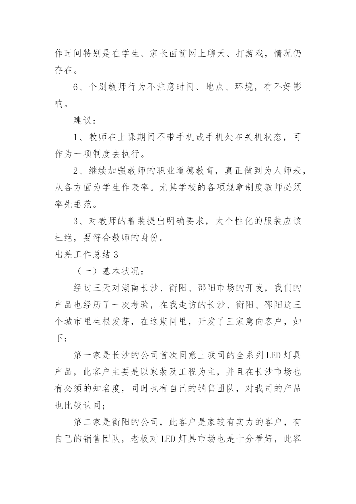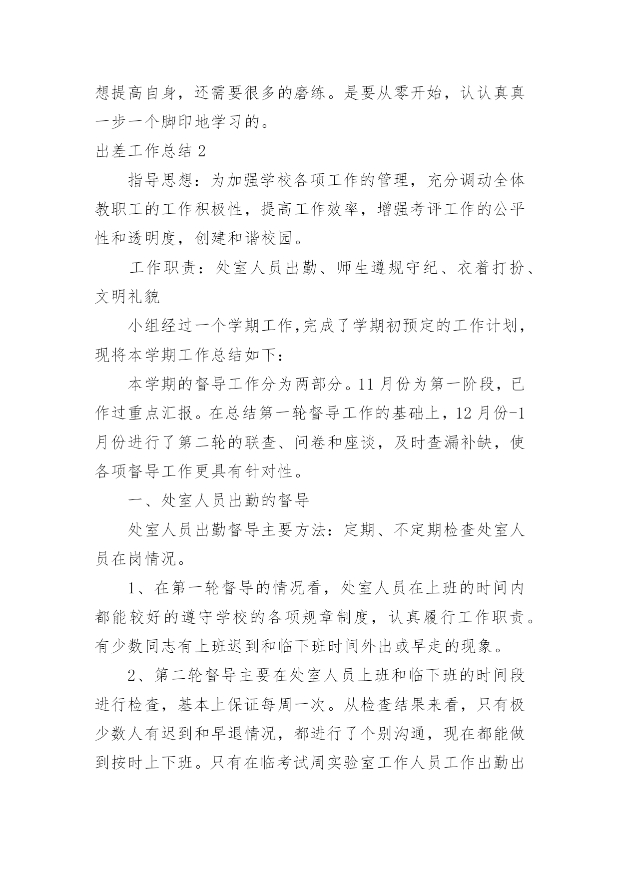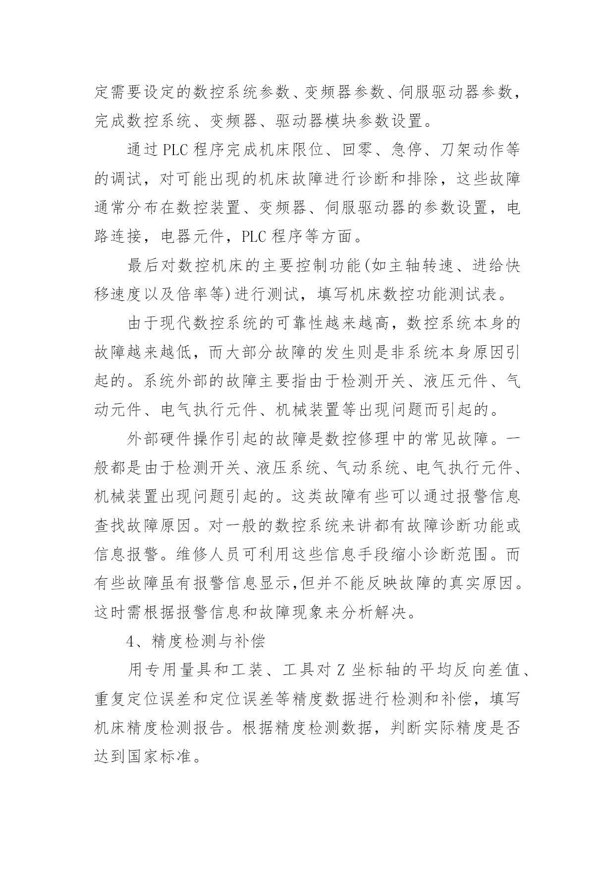 出差工作总结出差工作总结总结是事后对某一阶段的学习、工作或其完成情况加以回顾和分析的一种书面材料,它有助于我们寻找工作和事物发展的规律,从而掌握并运用这些规律,快快来写一份总结吧。总结你想好怎么写了吗?下面是小编为大家整理的出差工作总结,欢迎阅读,希望大家能够喜欢。出差工作总结1现将本人去xx航空职业技术学院观摩“20xx年xx省职业院校春季技能竞赛(高职机电设备)”其中的“数控机床装配、调试与维修”项目的情况汇报如下:一、出差基本情况关于竞赛:本次所观摩的竞赛是20xx年xx省职业院校春季技能竞赛其中的“数控机床装配、调试与维修”项目。竞赛主办单位是xx省教育厅,承办单位为xx省教育科学研究院职成教研究所,而xx航空职业技术学院则作为高职机电组的赛点。出差原由:作为长期合作的友好单位,本次竞赛的协办单位——xx航空职业技术学院向xx厂发出了邀请函,本人有幸得到领导派遣观摩了此次竞赛。出差目的:通过对竞赛的观摩,了解学习数控机床装配、调试与维修的相关知识。事件回放:(1)4月26日上午8:00——8:30,在xx航空职业技术学院学术报告厅召开了隆重的开幕式,开幕式上分别进行了领导致辞、选手宣誓、裁判宣誓等活动。(2)4月26日9:00——16:00,在xx航空职业技术学院数控实训基地开始了竞赛(第一场)。(3)4月26日17:00——24:00,在xx航空职业技术学院数控实训基地展开了竞赛(第二场)。(4)4月27日9:00——11:00,于欢天喜地大酒店吧楼会议室召开了校企交流会,会议上王副院长指出了在目前大学生就业问题日趋严峻的形势下,企业与学校更要多交流多合作。会上,各企业与学校之间进行了交流。会后,召开了闭幕式及颁奖典礼。二、出差收获作为一个数控技术专业的学生,在学校的时候,我就从老师口中及媒体上得知我国目前对于数控机床维修人员的缺乏。而在工厂两个多月的实习期内,我也了解到我厂数控设备的维修技术也不是很成熟,若遇到难题还不得不请国外的专家亲自前来指导。所以,我觉得本次竞赛促进了高职院校紧贴产业需求培养制造企业急需的数控设备机械、电气维修人员,也为今后各学校向企业输送更多这样的人才做了个好的开端。我在学校学习的内容更加偏重于数控设备操作方面,而对数控机床的装配、维修与调试方面了解不多,但是通过对这次竞赛的观摩,我对数控机床的装配,维修与调试有了更直观的了解与认识。本次竞赛是以这样的方式进行的:参赛队在规定的时间里,根据竞赛题目的具体要求,以现场操作的方式,按照正确的操作步骤,在尽量短的时间内利用机床说明书和机械装配图、电气原理图、数控系统连接说明书、伺服驱动装置说明书、变频器说明书等资料和专用量具、专用工装、工具、刀具等,完成CAK3665SJ数控车床(沈阳机床集团生产,配置华中数控生产的HNC—21数控系统)的Z轴机械传动部件的装配和调整,机床电气控制线路连接,机电联调与故障排除,精度检验与补偿,试切件加工等任务,并通过文字形式填写有关表格。在本次观摩中,我学习到了在进行数控机床的装配、维修与调试时的步骤以及一些注意事项,受益匪浅。1、机械装配与调试根据机械装配图纸和技术要求,完成机床Z坐标轴的电机支承座、螺母座、轴承座、滚珠丝杠、轴承、伺服电机等零部件的清洗、定位、安装、调试工作,并且保证机械精度。要想进行好以上工作,必须注意:(1)操作者必须全面掌握机床操作使用说明书的内容,熟悉机床的一般性能和结构,禁止超性能使用。(2)零件装配前和部装完成后,都必须彻底清洗,不允许有油污、脏物和铁屑存在,并应倒去棱边和毛刺。(3)工作时榔头与凿子头部不应有油,手上油污应擦净,防止因滑动而失去控制,发生事故。(4)压入平键及装卸轴承时,不得用铁锤敲打,应用木锤、橡皮锤等专用装配工具进行装配。(5)对轴类组件(如齿轮、轴承、垫圈等)以及箱体装配均应实行预装,达到工艺要求后,再进行装配。(6)组件或部件装好经检查合格后,必须加妥善防护措施,以防止水汽,污物及其他脏东西进入内部。(7)机床装配时,应注意整机和部件以及组件间的调整工作,如摩擦片、皮带、手把、主轴、丝杠等均应仔细调整,转动灵活,松紧一致,符合工艺规定的要求。(8)机床空装前,应检查箱体内和部、组件上有无铁屑及其他污物以及多余物。(9)试机后应检查相关紧固螺钉、螺帽等的松紧情况。2、电气安装与连接根据电气原理图,完成电气控制柜中部分强电、控制信号的安装接线工作。对电气安装与连接线路进行安全检查后才能通电。操作中严格遵守规章制度及电器安全规程,戴好防护用品。第一次上电之前、重新接线后都须进行检查、确认后才可上电,否则可能会造成损坏。最重要的是在操作时要将总电源断开。3、机电联调与故障排除根据数控系统、变频器、驱动器等技术手册,查找并确定需要设定的数控系统参数、变频器参数、伺