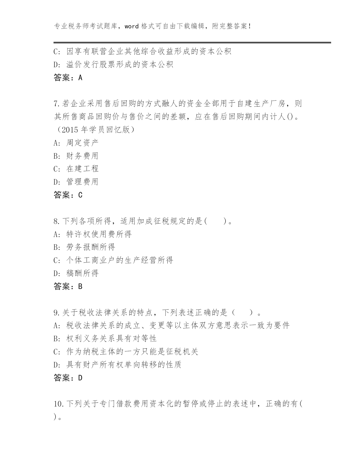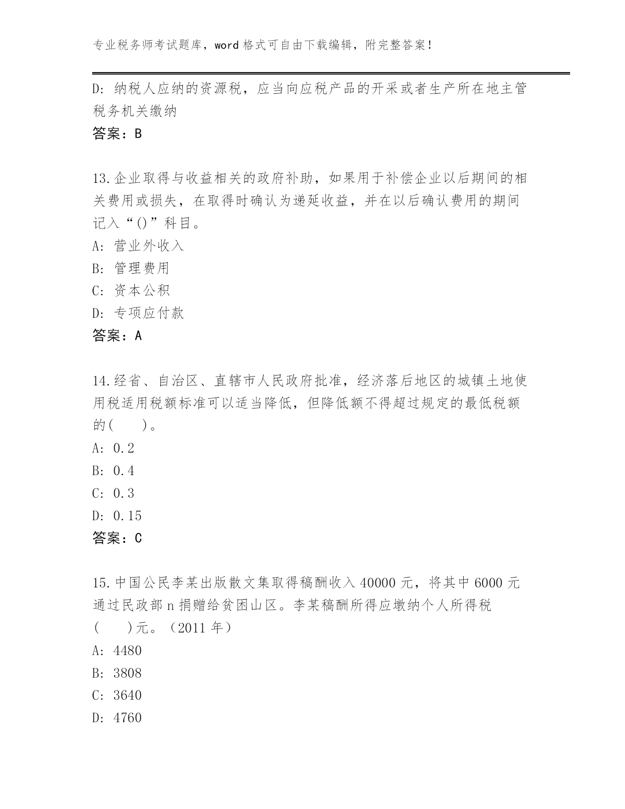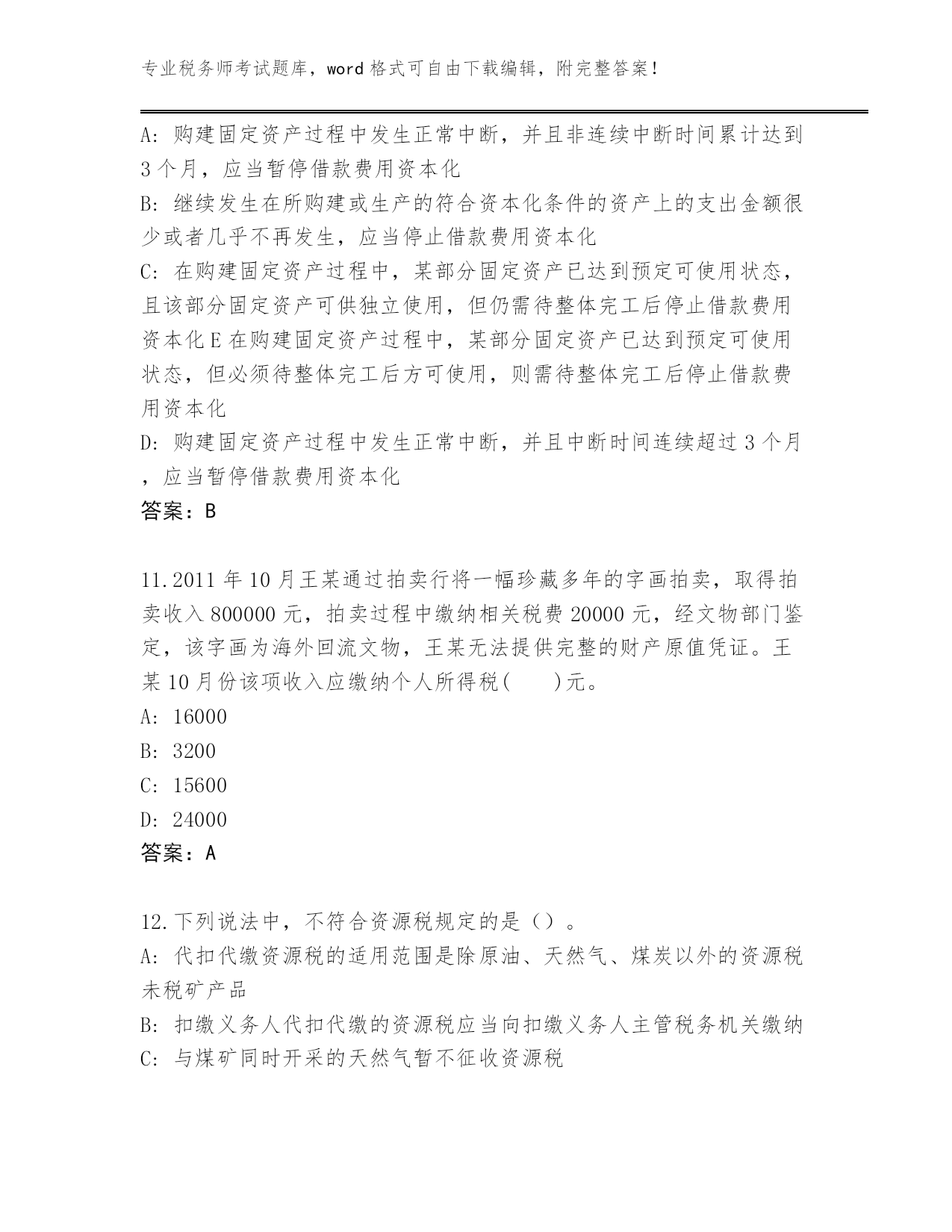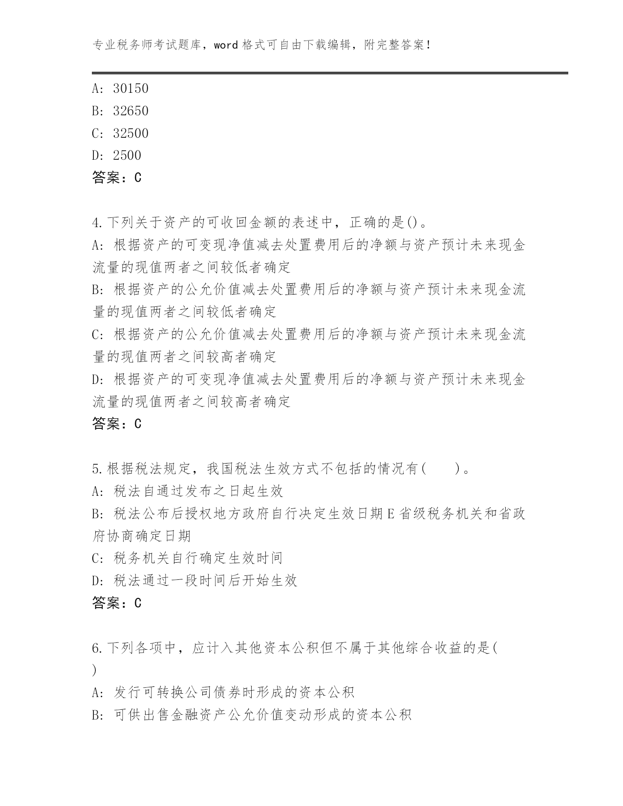 专业税务师考试题库,word格式可自由下载编辑,附完整答案!2023-24年山东省蓬莱市税务师考试真题【历年真题】第I部分单选题(100题)1.甲、乙两单位交换经营性用房,甲单位房屋价值为95万元,乙单位房屋价值为110万元,甲单位支付了差价。当地适用的契税税率为5%,甲单位应缴纳的契税税额为()万元。A:0.57B:55C:475D:75答案:D2.某商业企业2011年5月在市区购置-栋办公楼,支付价款8000万元。2011年6月,该企业将办公楼转让,取得收入10000万元,签订产权转移书据。办公楼经认定的重置成本价为12000万元,成新率70%。该商业企业应纳土地增值税()万元。A:445.5B:455.5C:440.5D:450.5答案:A3.甲公司以一栋6000万元的房产作为抵押,向银行借款5000万元并签订借款合同,应付利息300万元;贷款到期后因甲公司无法按期偿还贷款,与银行签订产权转移书据将房产转让给银行,则甲公司上述业务应缴纳印花税()元。A:30150B:32650C:32500D:2500答案:C4.下列关于资产的可收回金额的表述中,正确的是()。A:根据资产的可变现净值减去处置费用后的净额与资产预计未来现金流量的现值两者之间较低者确定B:根据资产的公允价值减去处置费用后的净额与资产预计未来现金流量的现值两者之间较低者确定C:根据资产的公允价值减去处置费用后的净额与资产预计未来现金流量的现值两者之间较高者确定D:根据资产的可变现净值减去处置费用后的净额与资产预计未来现金流量的现值两者之间较高者确定答案:C5.根据税法规定,我国税法生效方式不包括的情况有()。A:税法自通过发布之日起生效B:税法公布后授权地方政府自行决定生效日期E省级税务机关和省政府协商确定日期C:税务机关自行确定生效时间D:税法通过一段时间后开始生效答案:C6.下列各项中,应计入其他资本公积但不属于其他综合收益的是()A:发行可转换公司债券时形成的资本公积B:可供出售金融资产公允价值变动形成的资本公积C:因享有联营企业其他综合收益形成的资本公积D:溢价发行股票形成的资本公积答案:A7.若企业采用售后回购的方式融人的资金全部用于自建生产厂房,则其所售商品回购价与售价之间的差额,应在售后回购期间内计人()。(2015年学员回忆版)A:周定资产B:财务费用C:在建工程D:管理费用答案:C8.下列各项所得,适用加成征税规定的是()。A:特许权使用费所得B:劳务报酬所得C:个体工商业户的生产经营所得D:稿酬所得答案:B9.关于税收法律关系的特点,下列表述正确的是()。A:税收法律关系的成立、变更等以主体双方意思表示一致为要件B:权利义务关系具有对等性C:作为纳税主体的一方只能是征税机关D:具有财产所有权单向转移的性质答案:D10.下列关于专门借款费用资本化的暂停或停止的表述中,正确的有()。A:购建固定资产过程中发生正常中断,并且非连续中断时间累计达到3个月,应当暂停借款费用资本化B:继续发生在所购建或生产的符合资本化条件的资产上的支出金额很少或者几乎不再发生,应当停止借款费用资本化C:在购建固定资产过程中,某部分固定资产已达到预定可使用状态,且该部分固定资产可供独立使用,但仍需待整体完工后停止借款费用资本化E在购建固定资产过程中,某部分固定资产已达到预定可使用状态,但必须待整体完工后方可使用,则需待整体完工后停止借款费用资本化D:购建固定资产过程中发生正常中断,并且中断时间连续超过3个月,应当暂停借款费用资本化答案:B11.2011年10月王某通过拍卖行将一幅珍藏多年的字画拍卖,取得拍卖收入800000元,拍卖过程中缴纳相关税费20000元,经文物部门鉴定,该字画为海外回流文物,王某无法提供完整的财产原值凭证。王某10月份该项收入应缴纳个人所得税()元。A:16000B:3200C:15600D:24000答案:A12.下列说法中,不符合资源税规定的是()。A:代扣代缴资源税的适用范围是除原油、天然气、煤炭以外的资源税未税矿产品B:扣缴义务人代扣代缴的资源税应当向扣缴义务人主管税务机关缴纳C:与煤矿同时开采的天然气暂不征收资源税D:纳税人应纳的资源税,应当向应税产品的开采或者生产所在地主管税务机关缴纳答案:B13.企业取得与收益相关的政府补助,如果用于补偿企业以后期间的相关费用或损失,在取得时确认为递延收益,并在以后确认费用的期间记入“()”科目。A:营业外收入B:管理费用C:资本公积D:专项应付款答案:A14.经省、自治区、直辖市人民政府批准,经济落