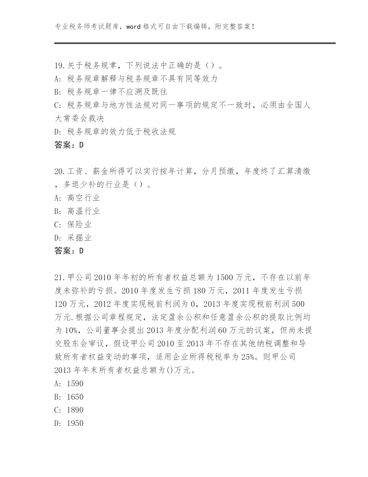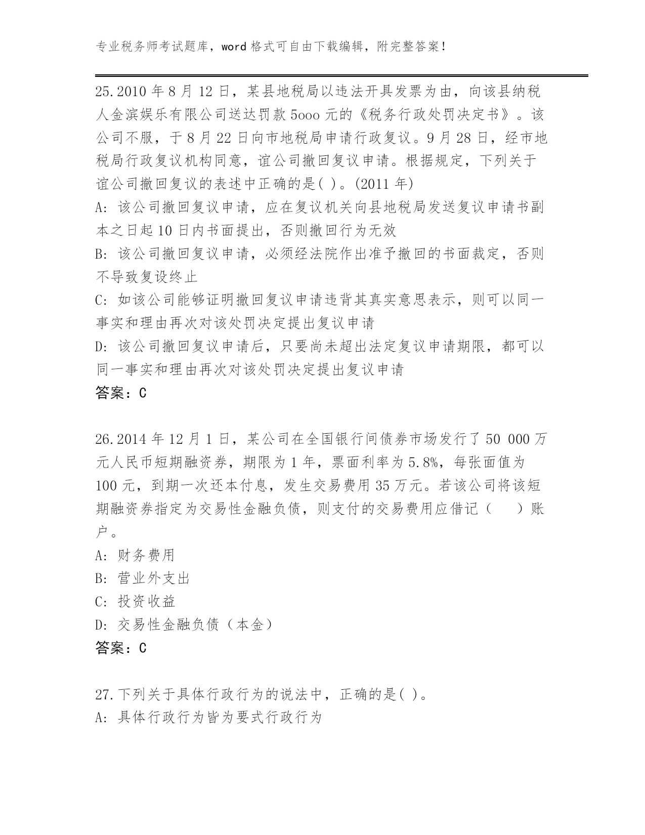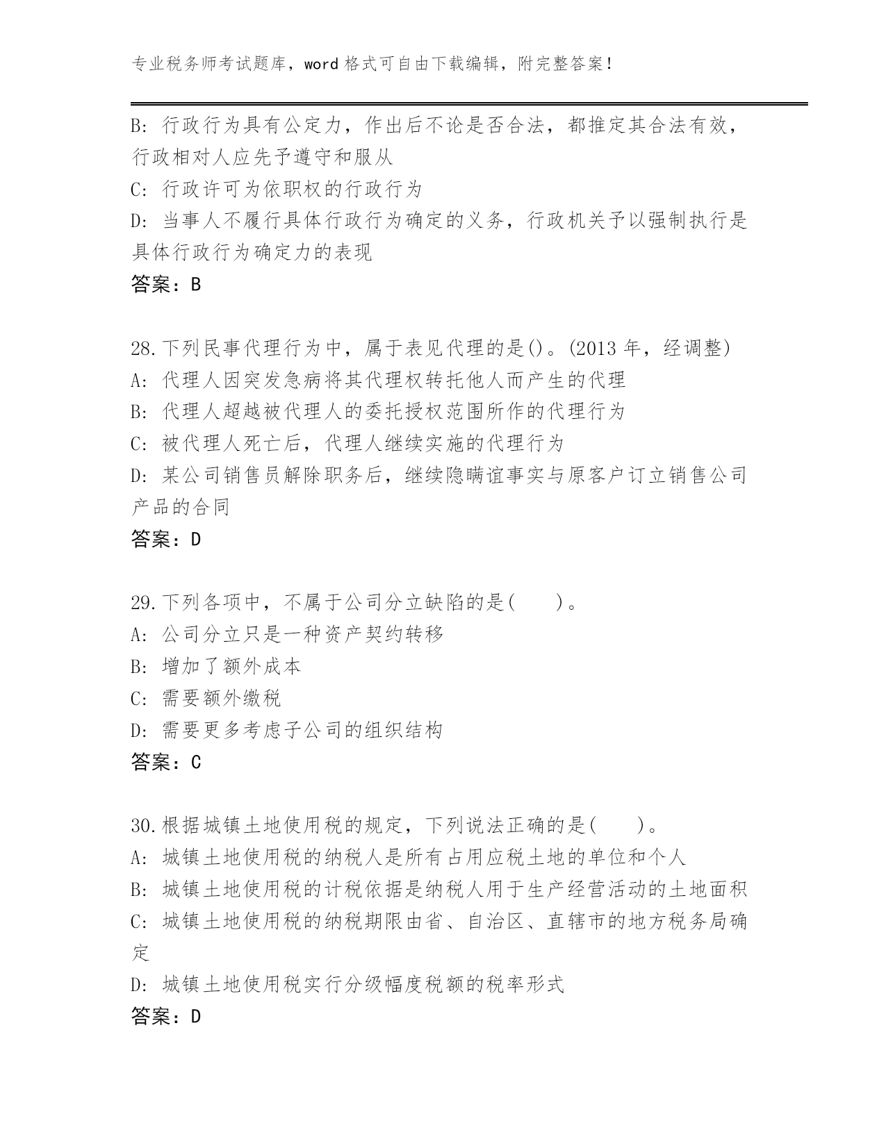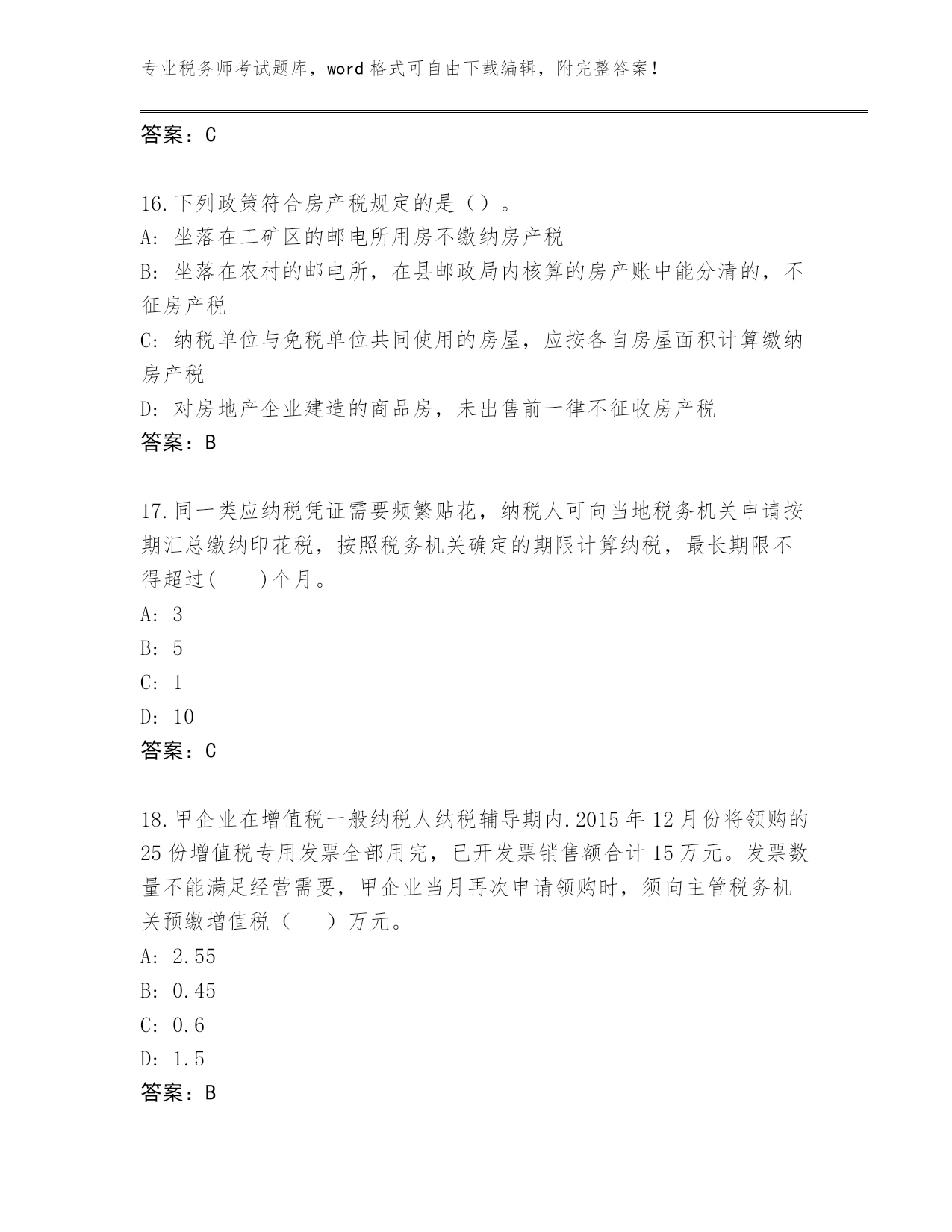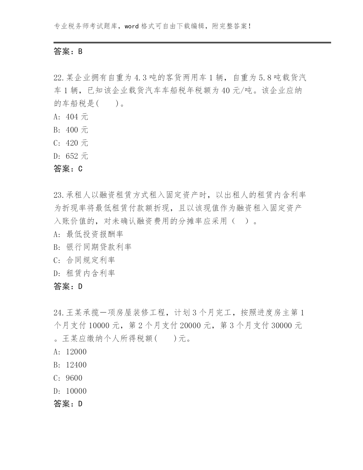 专业税务师考试题库,word格式可自由下载编辑,附完整答案!2023-24年山东省蓬莱市税务师考试真题【历年真题】第I部分单选题(100题)1.甲、乙两单位交换经营性用房,甲单位房屋价值为95万元,乙单位房屋价值为110万元,甲单位支付了差价。当地适用的契税税率为5%,甲单位应缴纳的契税税额为()万元。A:0.57B:55C:475D:75答案:D2.某商业企业2011年5月在市区购置-栋办公楼,支付价款8000万元。2011年6月,该企业将办公楼转让,取得收入10000万元,签订产权转移书据。办公楼经认定的重置成本价为12000万元,成新率70%。该商业企业应纳土地增值税()万元。A:445.5B:455.5C:440.5D:450.5答案:A3.甲公司以一栋6000万元的房产作为抵押,向银行借款5000万元并签订借款合同,应付利息300万元;贷款到期后因甲公司无法按期偿还贷款,与银行签订产权转移书据将房产转让给银行,则甲公司上述业务应缴纳印花税()元。A:30150B:32650C:32500D:2500答案:C4.下列关于资产的可收回金额的表述中,正确的是()。A:根据资产的可变现净值减去处置费用后的净额与资产预计未来现金流量的现值两者之间较低者确定B:根据资产的公允价值减去处置费用后的净额与资产预计未来现金流量的现值两者之间较低者确定C:根据资产的公允价值减去处置费用后的净额与资产预计未来现金流量的现值两者之间较高者确定D:根据资产的可变现净值减去处置费用后的净额与资产预计未来现金流量的现值两者之间较高者确定答案:C5.根据税法规定,我国税法生效方式不包括的情况有()。A:税法自通过发布之日起生效B:税法公布后授权地方政府自行决定生效日期E省级税务机关和省政府协商确定日期C:税务机关自行确定生效时间D:税法通过一段时间后开始生效答案:C6.下列各项中,应计入其他资本公积但不属于其他综合收益的是()A:发行可转换公司债券时形成的资本公积B:可供出售金融资产公允价值变动形成的资本公积C:因享有联营企业其他综合收益形成的资本公积D:溢价发行股票形成的资本公积答案:A7.若企业采用售后回购的方式融人的资金全部用于自建生产厂房,则其所售商品回购价与售价之间的差额,应在售后回购期间内计人()。(2015年学员回忆版)A:周定资产B:财务费用C:在建工程D:管理费用答案:C8.下列各项所得,适用加成征税规定的是()。A:特许权使用费所得B:劳务报酬所得C:个体工商业户的生产经营所得D:稿酬所得答案:B9.关于税收法律关系的特点,下列表述正确的是()。A:税收法律关系的成立、变更等以主体双方意思表示一致为要件B:权利义务关系具有对等性C:作为纳税主体的一方只能是征税机关D:具有财产所有权单向转移的性质答案:D10.下列关于专门借款费用资本化的暂停或停止的表述中,正确的有()。A:购建固定资产过程中发生正常中断,并且非连续中断时间累计达到3个月,应当暂停借款费用资本化B:继续发生在所购建或生产的符合资本化条件的资产上的支出金额很少或者几乎不再发生,应当停止借款费用资本化C:在购建固定资产过程中,某部分固定资产已达到预定可使用状态,且该部分固定资产可供独立使用,但仍需待整体完工后停止借款费用资本化E在购建固定资产过程中,某部分固定资产已达到预定可使用状态,但必须待整体完工后方可使用,则需待整体完工后停止借款费用资本化D:购建固定资产过程中发生正常中断,并且中断时间连续超过3个月,应当暂停借款费用资本化答案:B11.2011年10月王某通过拍卖行将一幅珍藏多年的字画拍卖,取得拍卖收入800000元,拍卖过程中缴纳相关税费20000元,经文物部门鉴定,该字画为海外回流文物,王某无法提供完整的财产原值凭证。王某10月份该项收入应缴纳个人所得税()元。A:16000B:3200C:15600D:24000答案:A12.下列说法中,不符合资源税规定的是()。A:代扣代缴资源税的适用范围是除原油、天然气、煤炭以外的资源税未税矿产品B:扣缴义务人代扣代缴的资源税应当向扣缴义务人主管税务机关缴纳C:与煤矿同时开采的天然气暂不征收资源税D:纳税人应纳的资源税,应当向应税产品的开采或者生产所在地主管税务机关缴纳答案:B13.企业取得与收益相关的政府补助,如果用于补偿企业以后期间的相关费用或损失,在取得时确认为递延收益,并在以后确认费用的期间记入“()”科目。A:营业外收入B:管理费用C:资本公积D:专项应付款答案:A14.经省、自治区、直辖市人民政府批准,经济落