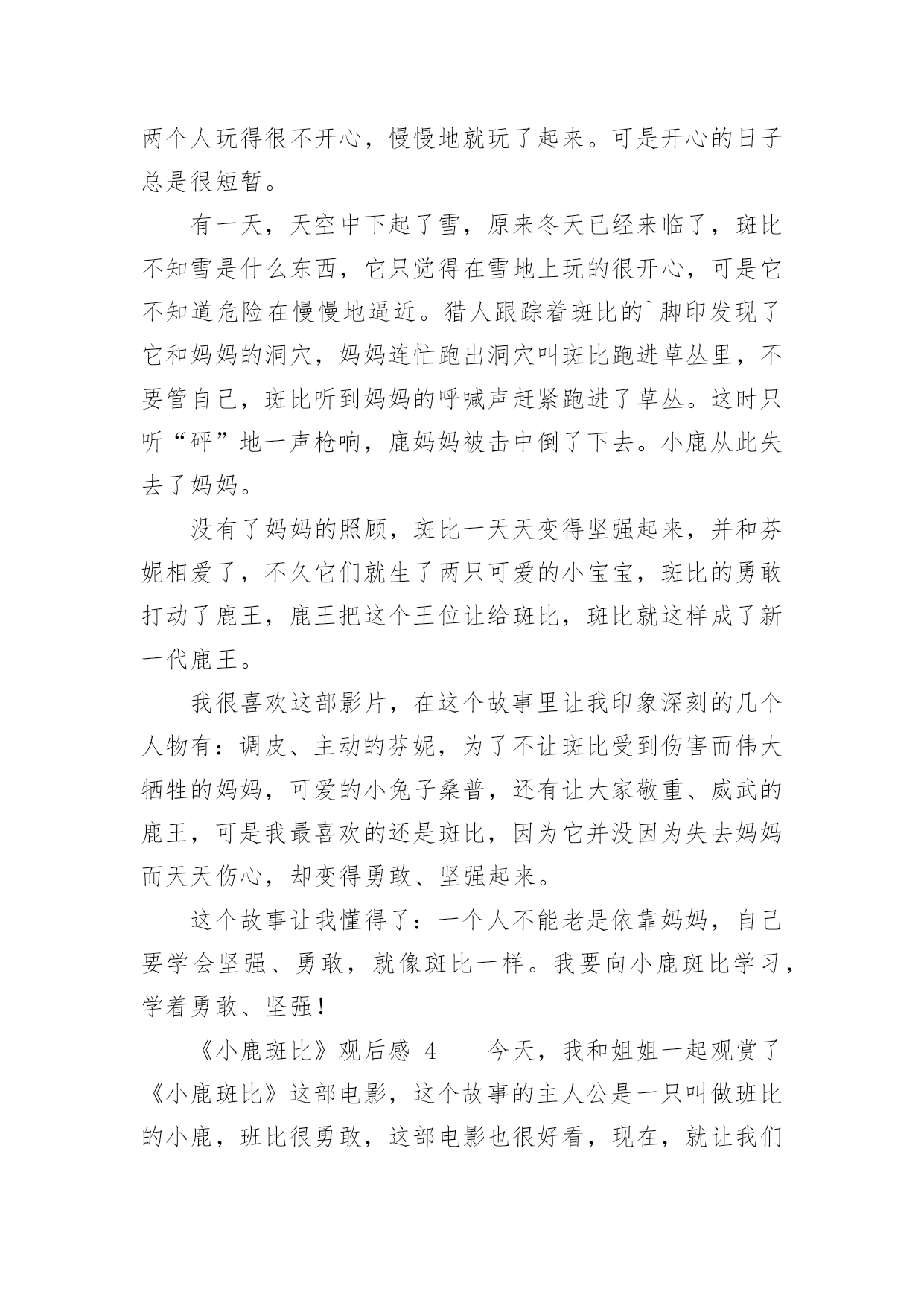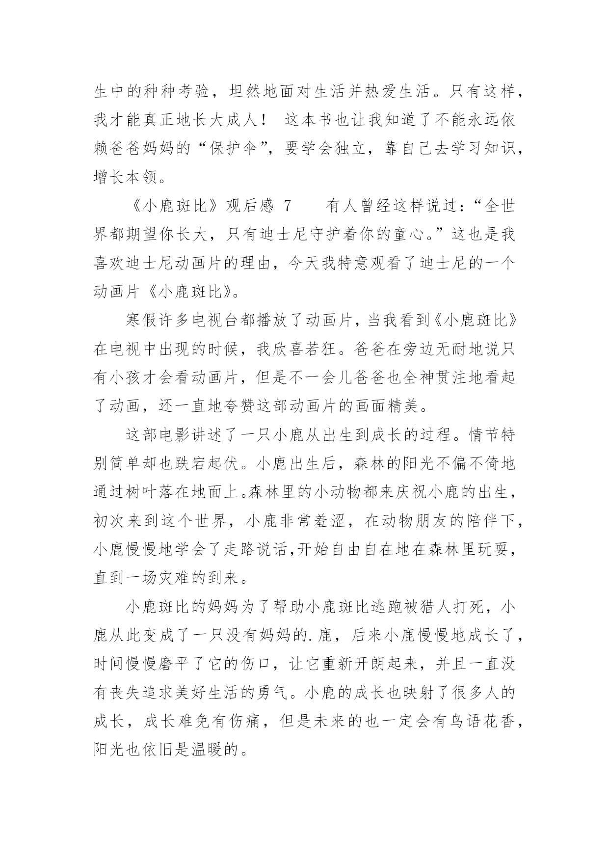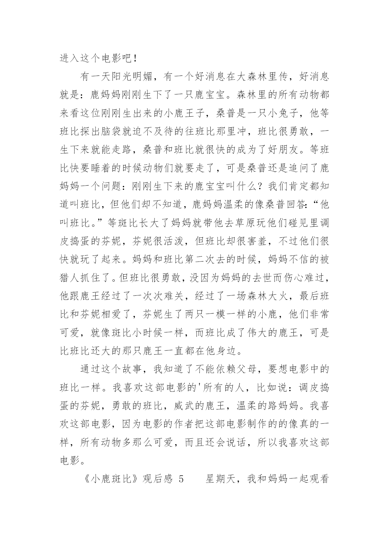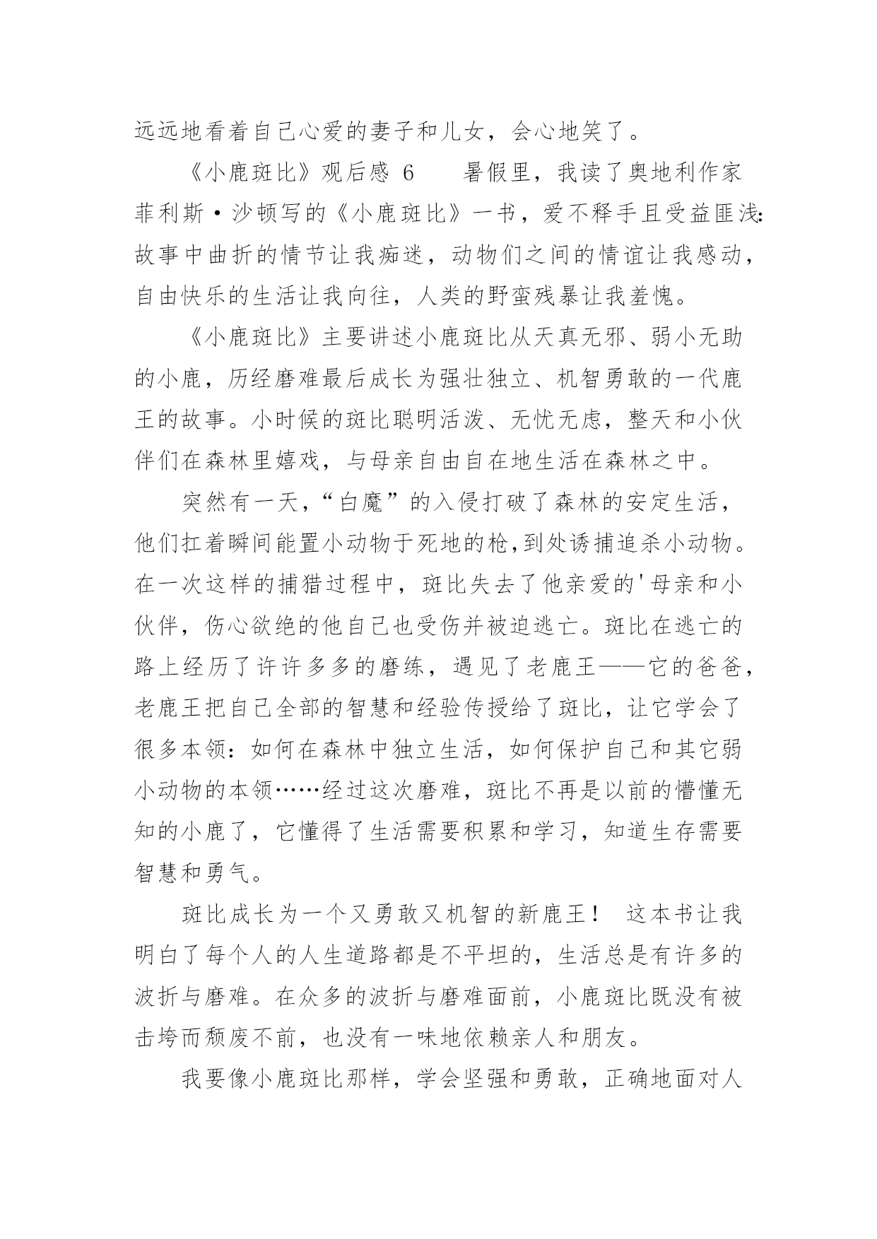 《小鹿斑比》观后感《小鹿斑比》观后感(通用16篇)当看完一部作品后,相信你会有不少感想吧,这时候最关键的观后感不能忘了。那么我们如何去写观后感呢?以下是小编为大家整理的《小鹿斑比》观后感,仅供参考,大家一起来看看吧。《小鹿斑比》观后感1小鹿斑比是一个非常有趣的电影,他呢是奥地利的费利克斯;萨尔腾这位大作家写的这个电影,我看了这个电影我觉得他能打动我们每个孩子的心灵。首先呢!小鹿斑比是在一个森林里出生、长大的,而且,别人称他为小王子,而他的爸爸听说:“是最年老的,并且,他的爸爸还很有智慧。”因为,小鹿斑比的爸爸活得时间最长,所以,别人把他称为“鹿王,”因为,鹿王和小鹿斑比的妈妈不在一起生活,所以,只有小鹿斑比的妈妈来照顾小鹿斑比,因为,小鹿斑比现在还小,所以,森林的好多危险的事情,斑比它都不能自己解决,所以,小鹿斑比的妈妈教了她好多好多的本领。可是,在大雪覆盖的一天早晨,斑比的妈妈被猎人重重的打了一枪,所以,不在了,自从这件事发生后,斑比失去了妈妈,在之后的日子里,斑比的爸爸鹿王在他的鼓励下,斑比学会了自己照顾自己,并且,小鹿斑比还自己交了好多朋友,其中有一个温柔的女朋友—他叫芬妮。时间过得不长,森林里的猎人又来了,芬妮因为,是女人所以没有鹿角,所以,打不过猎人领来的猎狗,而且,芬妮还被那烦人的.猎狗追得无路可逃,斑比因为已经长大了,并且,头上还长有鹿角,所以,他战胜了那群猎狗,虽然,斑比自己也受了伤,可是,猎人心太坏了,所以,给整个森林带来了火灾,眼看着小鹿斑比就要被火烧死,这时,小鹿斑比的爸爸,鹿王又出现在了斑比的眼前,鹿王又严厉的说:“没有人来救你的。”只能依靠自己走出去,斑比克服疼痛,站了起来,在爸爸的带领下,逃了出去,最终,成为了森林里的新鹿王。自从我看了这部电影,我觉得猎人们不要在宰杀动物了,从斑比的成长中,我想到,面对困难,要勇敢,坚持不懈,依靠自己,成就梦想。《小鹿斑比》观后感2今天我和妈妈吃完午饭,在舅舅那休息,我无聊的时候妈妈说:“把手机给我,让我看小鹿斑比动画电影。”我说好,这是一部出自美国的动画电影。这小鹿斑比的动画电影讲的是,从前在一个大森林里住着一个鹿妈妈,它生了一个非常可爱又活泼的小鹿,鹿妈妈决定给小鹿取名字叫斑比,而且让人不敢相信的是斑比刚一生下来就可以站起来走路了,虽然它刚走几步就跌倒了但是其它小动物也没有说刚生下来就能站起来像斑比一样走路,但是斑比却能做到这一点,可是没有过几天可怕的事情就发生了,这是一个春天来到了,斑比和妈妈出去散步斑比都饿的支撑不住了,终于斑比和妈妈在刚下完雪的草地上发现了几根小草,妈妈说:“看斑比,春天刚长出来的小草。”斑比顾不上听妈妈说:“就去把那里的草全部吃光了。”对了还有斑比有个爸爸它是森林中的'鹿王,可是突然‘砰’的一声妈妈说猎人来了,斑比迅速看见妈妈跑它灵机一动,跟着妈妈一块儿跑,最后到达了安全的地方,这说明斑比很机智可是斑比缺不知道妈妈已经被猎人打死了。这时爸爸出现了,它说让斑比跟着它一起走,于是斑比就跟着爸爸去了不知名的地方了。不知不觉,斑比的爸爸老了,而且斑比也长大了它当上了鹿王的官,它和一个名叫法莉的母鹿在一起过日子了。通过我看这个动画电影,我知道了要像斑比一样聪明、机智在遇到危险的时候不要慌张镇定住,动一动脑筋这样才能够挑战危险,所以我们在生活中也要去动一动脑筋去做事情,这样才能帮助你排除掉慌张。《小鹿斑比》观后感3周六作文课上,孙老师带我们欣赏了电影《小鹿斑比》。这部影片的内容是这样的。在一片茂密的森林里,一只可爱的小鹿王子要出生了,它就是小鹿斑比。动物们都来看刚出生的斑比,小鹿斑比第一次见到这么多的动物,它又惊又怕。这时,一只顽皮可爱的小兔子桑普忽然跳到了斑比的身边,跟它玩起了躲猫猫游戏。斑比刚开始很害怕,但是慢慢地,它就和小兔子玩到了一起。过了几天,天空开始下雨,斑比第一次遇到那么大的雨,它很害怕。雨停了,妈妈带着斑比到草坪上玩,在那儿斑比认识了调皮捣蛋的芬妮。开始两个人玩得很不开心,慢慢地就玩了起来。可是开心的日子总是很短暂。有一天,天空中下起了雪,原来冬天已经来临了,斑比不知雪是什么东西,它只觉得在雪地上玩的很开心,可是它不知道危险在慢慢地逼近。猎人跟踪着斑比的`脚印发现了它和妈妈的洞穴,妈妈连忙跑出洞穴叫斑比跑进草丛里,不要管自己,斑比听到妈妈的呼喊声赶紧跑进了草丛。这时只听“砰”地一声枪响,鹿妈妈被击中倒了下去。小鹿从此失去了妈妈。没有了妈妈的照顾,斑比一天天变得坚强起来,并和芬妮相爱了,不久它们就生了两只可爱的小宝宝,斑比的勇敢打动了鹿王,鹿王把这个王位让给斑比,斑比就这样成了新一代鹿王。我很喜欢这部影片,在这个故事里让我印象深刻的几个人物有:调皮、主动的芬妮,为了不让斑比受到伤害而伟大牺牲的妈妈,可爱的小兔子桑普,还有让大家敬重、