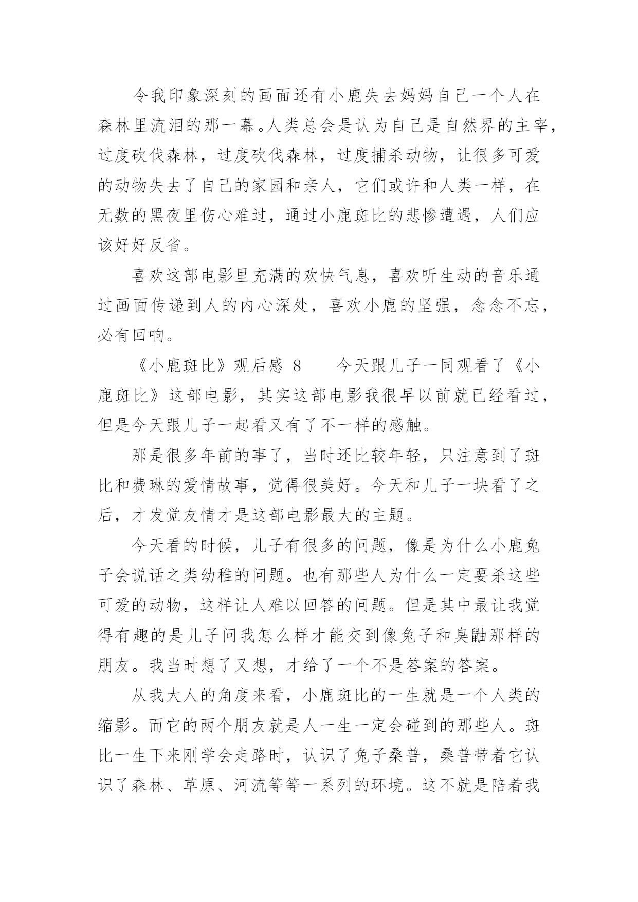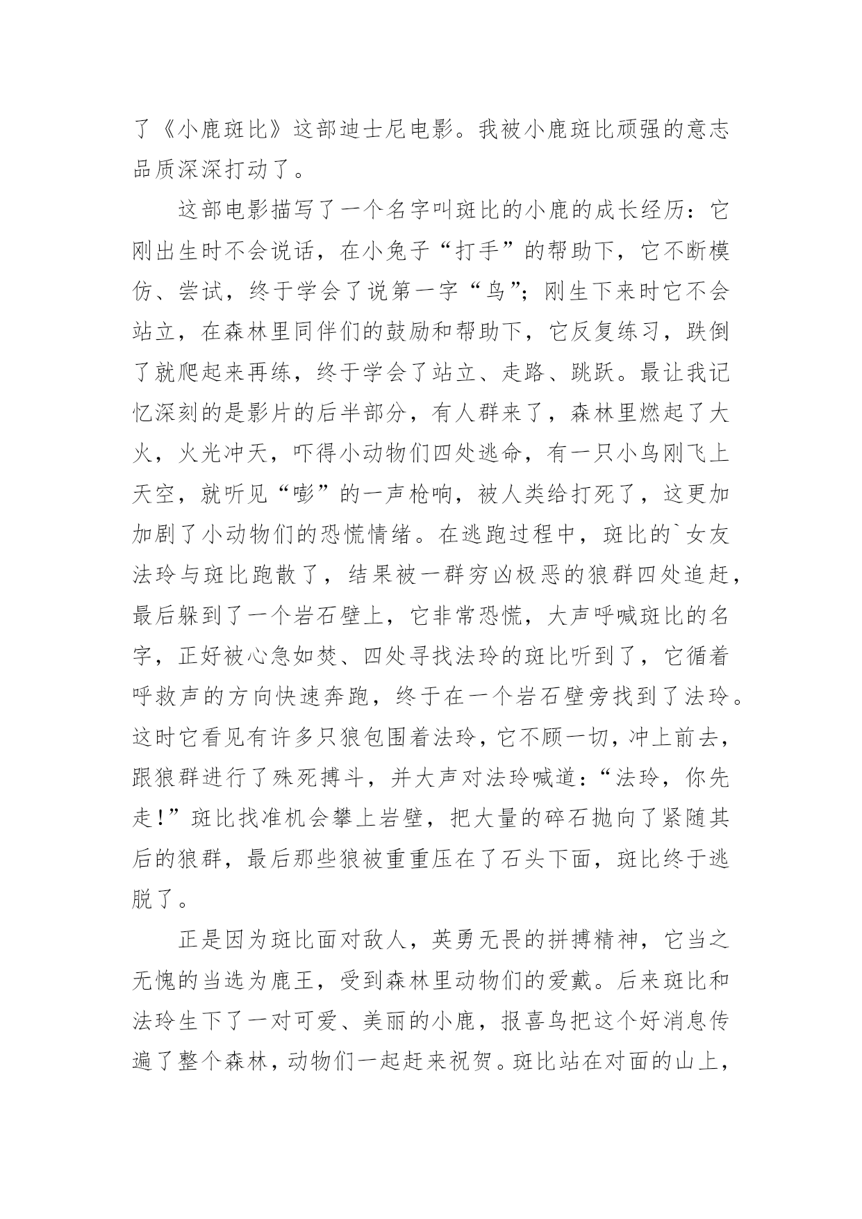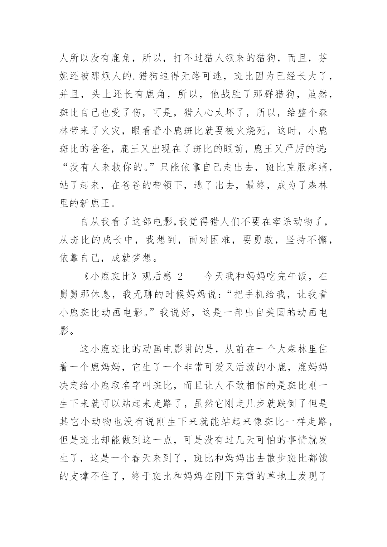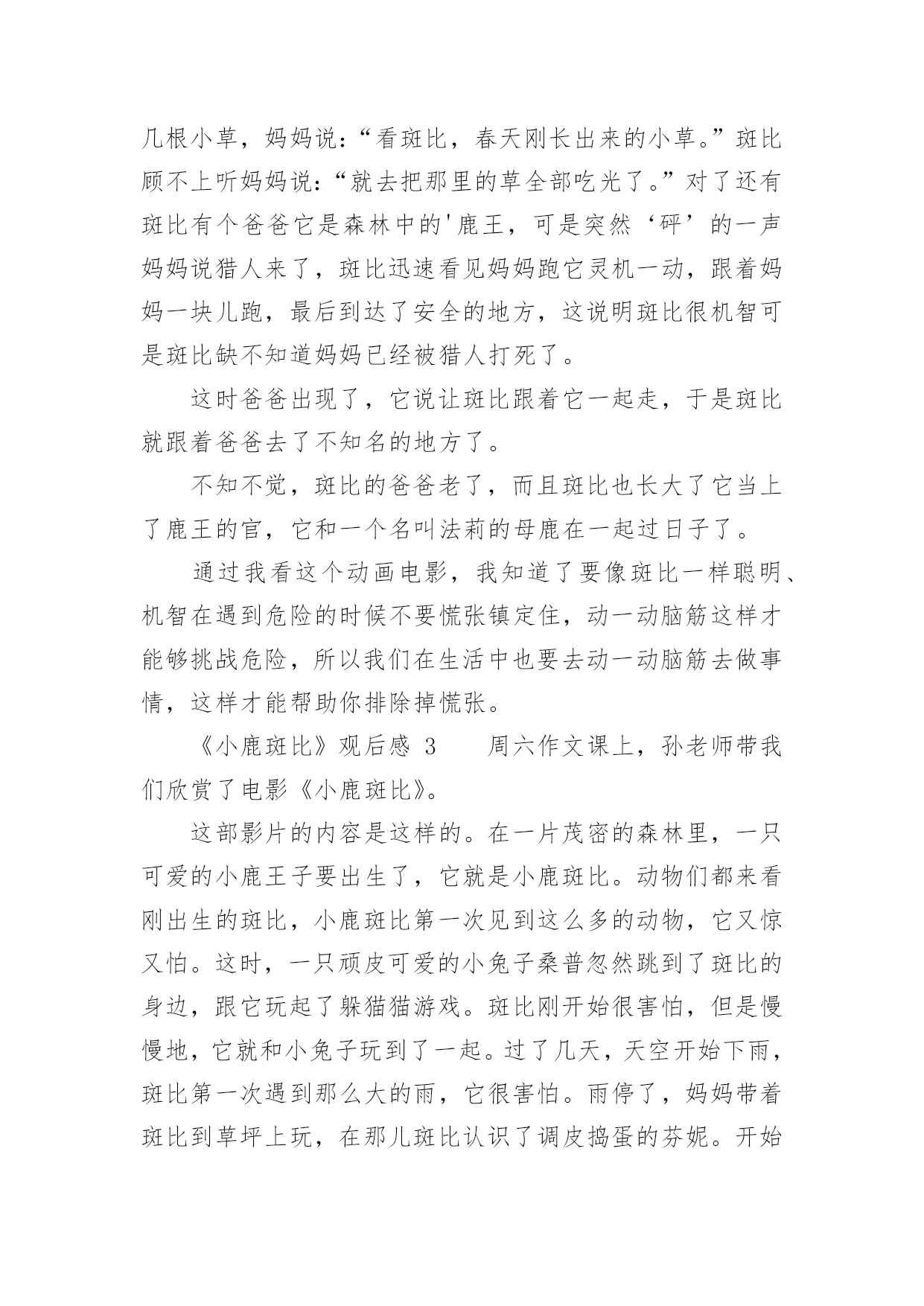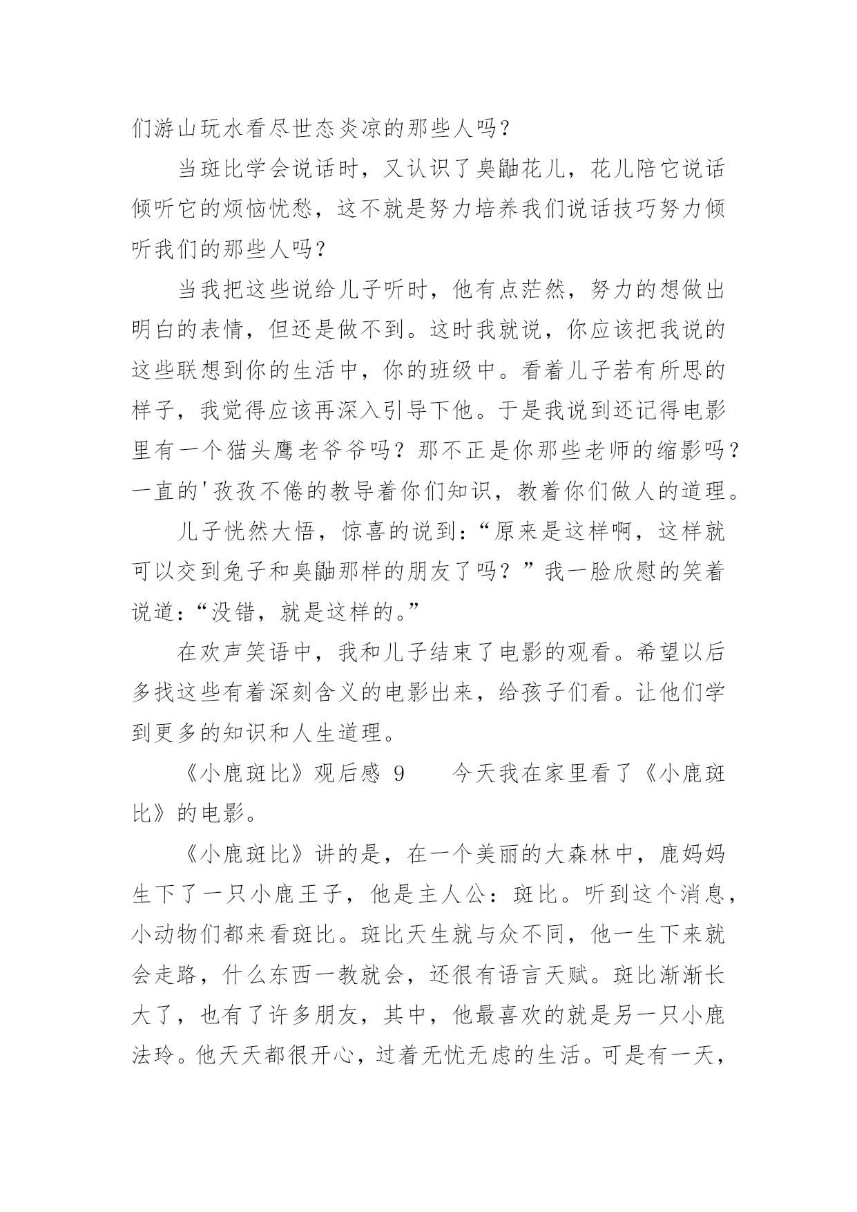 《小鹿斑比》观后感《小鹿斑比》观后感(通用16篇)当看完一部作品后,相信你会有不少感想吧,这时候最关键的观后感不能忘了。那么我们如何去写观后感呢?以下是小编为大家整理的《小鹿斑比》观后感,仅供参考,大家一起来看看吧。《小鹿斑比》观后感1小鹿斑比是一个非常有趣的电影,他呢是奥地利的费利克斯;萨尔腾这位大作家写的这个电影,我看了这个电影我觉得他能打动我们每个孩子的心灵。首先呢!小鹿斑比是在一个森林里出生、长大的,而且,别人称他为小王子,而他的爸爸听说:“是最年老的,并且,他的爸爸还很有智慧。”因为,小鹿斑比的爸爸活得时间最长,所以,别人把他称为“鹿王,”因为,鹿王和小鹿斑比的妈妈不在一起生活,所以,只有小鹿斑比的妈妈来照顾小鹿斑比,因为,小鹿斑比现在还小,所以,森林的好多危险的事情,斑比它都不能自己解决,所以,小鹿斑比的妈妈教了她好多好多的本领。可是,在大雪覆盖的一天早晨,斑比的妈妈被猎人重重的打了一枪,所以,不在了,自从这件事发生后,斑比失去了妈妈,在之后的日子里,斑比的爸爸鹿王在他的鼓励下,斑比学会了自己照顾自己,并且,小鹿斑比还自己交了好多朋友,其中有一个温柔的女朋友—他叫芬妮。时间过得不长,森林里的猎人又来了,芬妮因为,是女人所以没有鹿角,所以,打不过猎人领来的猎狗,而且,芬妮还被那烦人的.猎狗追得无路可逃,斑比因为已经长大了,并且,头上还长有鹿角,所以,他战胜了那群猎狗,虽然,斑比自己也受了伤,可是,猎人心太坏了,所以,给整个森林带来了火灾,眼看着小鹿斑比就要被火烧死,这时,小鹿斑比的爸爸,鹿王又出现在了斑比的眼前,鹿王又严厉的说:“没有人来救你的。”只能依靠自己走出去,斑比克服疼痛,站了起来,在爸爸的带领下,逃了出去,最终,成为了森林里的新鹿王。自从我看了这部电影,我觉得猎人们不要在宰杀动物了,从斑比的成长中,我想到,面对困难,要勇敢,坚持不懈,依靠自己,成就梦想。《小鹿斑比》观后感2今天我和妈妈吃完午饭,在舅舅那休息,我无聊的时候妈妈说:“把手机给我,让我看小鹿斑比动画电影。”我说好,这是一部出自美国的动画电影。这小鹿斑比的动画电影讲的是,从前在一个大森林里住着一个鹿妈妈,它生了一个非常可爱又活泼的小鹿,鹿妈妈决定给小鹿取名字叫斑比,而且让人不敢相信的是斑比刚一生下来就可以站起来走路了,虽然它刚走几步就跌倒了但是其它小动物也没有说刚生下来就能站起来像斑比一样走路,但是斑比却能做到这一点,可是没有过几天可怕的事情就发生了,这是一个春天来到了,斑比和妈妈出去散步斑比都饿的支撑不住了,终于斑比和妈妈在刚下完雪的草地上发现了几根小草,妈妈说:“看斑比,春天刚长出来的小草。”斑比顾不上听妈妈说:“就去把那里的草全部吃光了。”对了还有斑比有个爸爸它是森林中的'鹿王,可是突然‘砰’的一声妈妈说猎人来了,斑比迅速看见妈妈跑它灵机一动,跟着妈妈一块儿跑,最后到达了安全的地方,这说明斑比很机智可是斑比缺不知道妈妈已经被猎人打死了。这时爸爸出现了,它说让斑比跟着它一起走,于是斑比就跟着爸爸去了不知名的地方了。不知不觉,斑比的爸爸老了,而且斑比也长大了它当上了鹿王的官,它和一个名叫法莉的母鹿在一起过日子了。通过我看这个动画电影,我知道了要像斑比一样聪明、机智在遇到危险的时候不要慌张镇定住,动一动脑筋这样才能够挑战危险,所以我们在生活中也要去动一动脑筋去做事情,这样才能帮助你排除掉慌张。《小鹿斑比》观后感3周六作文课上,孙老师带我们欣赏了电影《小鹿斑比》。这部影片的内容是这样的。在一片茂密的森林里,一只可爱的小鹿王子要出生了,它就是小鹿斑比。动物们都来看刚出生的斑比,小鹿斑比第一次见到这么多的动物,它又惊又怕。这时,一只顽皮可爱的小兔子桑普忽然跳到了斑比的身边,跟它玩起了躲猫猫游戏。斑比刚开始很害怕,但是慢慢地,它就和小兔子玩到了一起。过了几天,天空开始下雨,斑比第一次遇到那么大的雨,它很害怕。雨停了,妈妈带着斑比到草坪上玩,在那儿斑比认识了调皮捣蛋的芬妮。开始两个人玩得很不开心,慢慢地就玩了起来。可是开心的日子总是很短暂。有一天,天空中下起了雪,原来冬天已经来临了,斑比不知雪是什么东西,它只觉得在雪地上玩的很开心,可是它不知道危险在慢慢地逼近。猎人跟踪着斑比的`脚印发现了它和妈妈的洞穴,妈妈连忙跑出洞穴叫斑比跑进草丛里,不要管自己,斑比听到妈妈的呼喊声赶紧跑进了草丛。这时只听“砰”地一声枪响,鹿妈妈被击中倒了下去。小鹿从此失去了妈妈。没有了妈妈的照顾,斑比一天天变得坚强起来,并和芬妮相爱了,不久它们就生了两只可爱的小宝宝,斑比的勇敢打动了鹿王,鹿王把这个王位让给斑比,斑比就这样成了新一代鹿王。我很喜欢这部影片,在这个故事里让我印象深刻的几个人物有:调皮、主动的芬妮,为了不让斑比受到伤害而伟大牺牲的妈妈,可爱的小兔子桑普,还有让大家敬重、