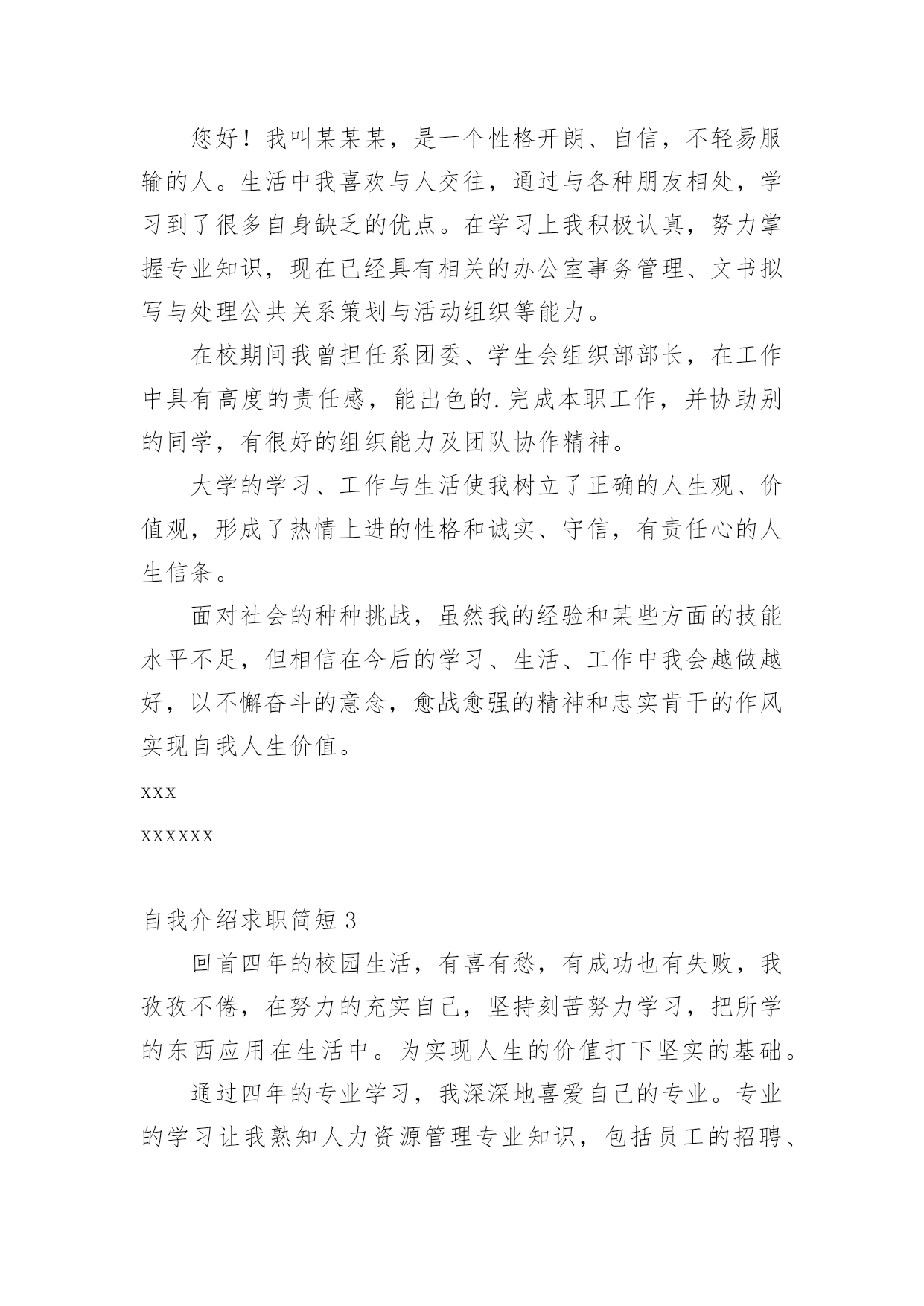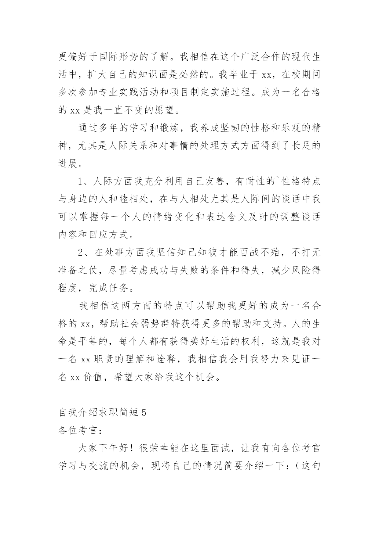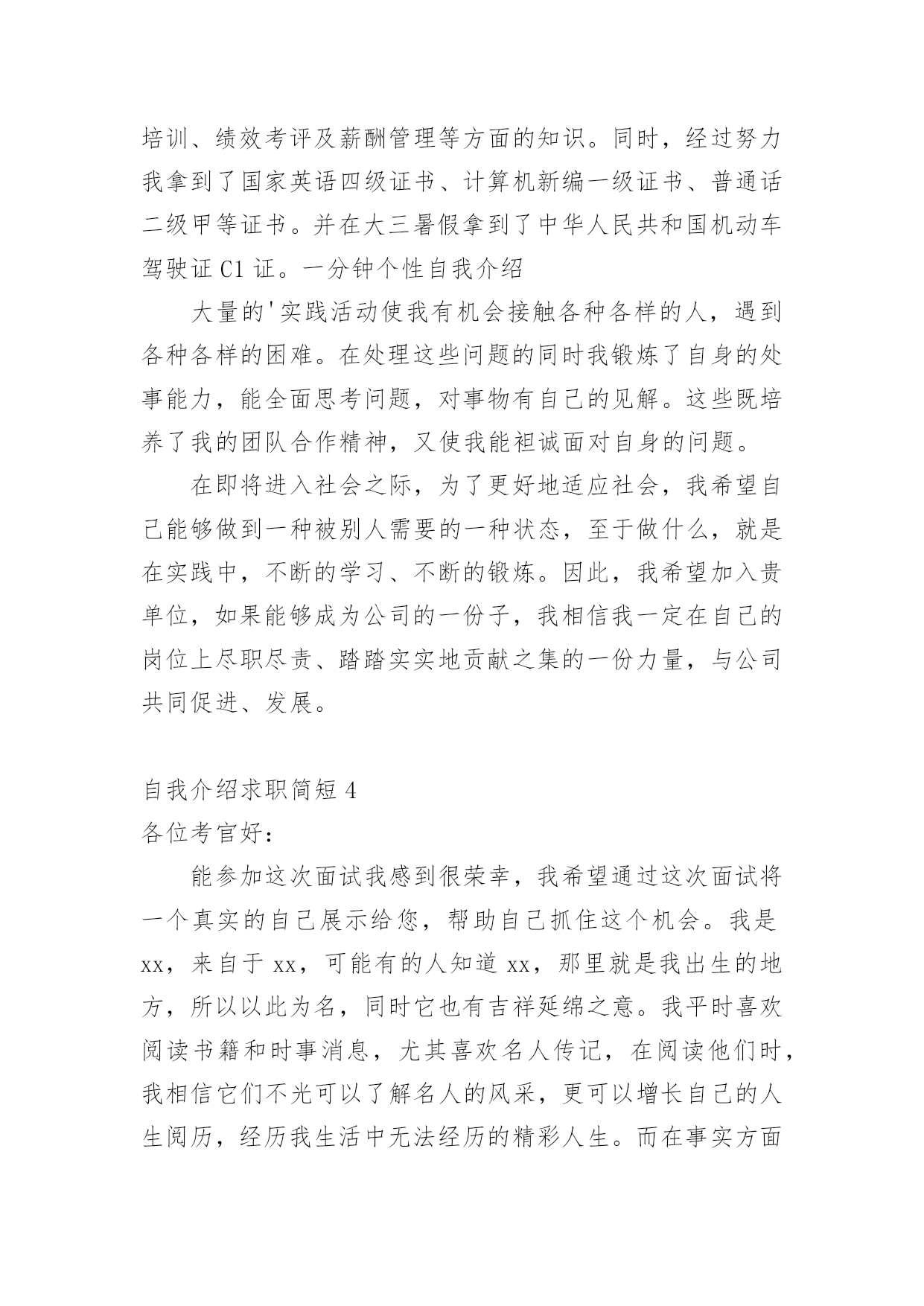 自我介绍求职简短来到一个陌生的地方时,常常要进行自我介绍,自我介绍是一展示自己的手段。千万不能认为自我介绍随便应付就可以,以下是小编整理的自我介绍求职简短,希望对大家有所帮助。自我介绍求职简短1我是一个农村长大的80后,深知只有靠汗水才能换来好的收成。从业至今历经十二个年头,我想我已经具备了作为一名职业经理人的素质和要求。我还是一个真诚的人,我相信无论做什么,诚信应该是第一位的。只有我做到以诚相待,对方才会信任于我,用真诚的微笑拉近我们的距离。责任心强凡事以工作为中心,以做好工作为本。对经营管理和战略战术的建立上,较有不同于他人的.自信心。规则是死的人是活的,销售工作面对的是人,最忌讳的便是在工作中千篇一律的教条主义,应以人为本、灵活应变、抓住重点、提高效率找一个自己喜欢的职业,作为一份事业,并为此奋斗一生。努力争取做个让领导放心,同事舒心,自己安心的好人。自我介绍求职简短2主考官:您好!我叫某某某,是一个性格开朗、自信,不轻易服输的人。生活中我喜欢与人交往,通过与各种朋友相处,学习到了很多自身缺乏的优点。在学习上我积极认真,努力掌握专业知识,现在已经具有相关的办公室事务管理、文书拟写与处理公共关系策划与活动组织等能力。在校期间我曾担任系团委、学生会组织部部长,在工作中具有高度的责任感,能出色的.完成本职工作,并协助别的同学,有很好的组织能力及团队协作精神。大学的学习、工作与生活使我树立了正确的人生观、价值观,形成了热情上进的性格和诚实、守信,有责任心的人生信条。面对社会的种种挑战,虽然我的经验和某些方面的技能水平不足,但相信在今后的学习、生活、工作中我会越做越好,以不懈奋斗的意念,愈战愈强的精神和忠实肯干的作风实现自我人生价值。xxxxxxxxx自我介绍求职简短3回首四年的校园生活,有喜有愁,有成功也有失败,我孜孜不倦,在努力的充实自己,坚持刻苦努力学习,把所学的东西应用在生活中。为实现人生的价值打下坚实的基础。通过四年的专业学习,我深深地喜爱自己的专业。专业的学习让我熟知人力资源管理专业知识,包括员工的招聘、培训、绩效考评及薪酬管理等方面的知识。同时,经过努力我拿到了国家英语四级证书、计算机新编一级证书、普通话二级甲等证书。并在大三暑假拿到了中华人民共和国机动车驾驶证C1证。一分钟个性自我介绍大量的'实践活动使我有机会接触各种各样的人,遇到各种各样的困难。在处理这些问题的同时我锻炼了自身的处事能力,能全面思考问题,对事物有自己的见解。这些既培养了我的团队合作精神,又使我能袒诚面对自身的问题。在即将进入社会之际,为了更好地适应社会,我希望自己能够做到一种被别人需要的一种状态,至于做什么,就是在实践中,不断的学习、不断的锻炼。因此,我希望加入贵单位,如果能够成为公司的一份子,我相信我一定在自己的岗位上尽职尽责、踏踏实实地贡献之集的一份力量,与公司共同促进、发展。自我介绍求职简短4各位考官好:能参加这次面试我感到很荣幸,我希望通过这次面试将一个真实的自己展示给您,帮助自己抓住这个机会。我是xx,来自于xx,可能有的人知道xx,那里就是我出生的地方,所以以此为名,同时它也有吉祥延绵之意。我平时喜欢阅读书籍和时事消息,尤其喜欢名人传记,在阅读他们时,我相信它们不光可以了解名人的风采,更可以增长自己的人生阅历,经历我生活中无法经历的精彩人生。而在事实方面更偏好于国际形势的了解。我相信在这个广泛合作的现代生活中,扩大自己的知识面是必然的。我毕业于xx,在校期间多次参加专业实践活动和项目制定实施过程。成为一名合格的xx是我一直不变的愿望。通过多年的学习和锻炼,我养成坚韧的性格和乐观的精神,尤其是人际关系和对事情的处理方式方面得到了长足的进展。1、人际方面我充分利用自己友善,有耐性的`性格特点与身边的人和睦相处,在与人相处尤其是人际间的谈话中我可以掌握每一个人的情绪变化和表达含义及时的调整谈话内容和回应方式。2、在处事方面我坚信知己知彼才能百战不殆,不打无准备之仗,尽量考虑成功与失败的条件和得失,减少风险得程度,完成任务。我相信这两方面的特点可以帮助我更好的成为一名合格的xx,帮助社会弱势群特获得更多的帮助和支持。人的生命是平等的,每个人都有获得美好生活的权利,这就是我对一名xx职责的理解和诠释,我相信我会用我努力来见证一名xx价值,希望大家给我这个机会。自我介绍求职简短5各位考官:大家下午好!很荣幸能在这里面试,让我有向各位考官学习与交流的机会,现将自己的情况简要介绍一下:(这句话其实是可有可无的,不过一般在群面的时候还是很有必要用到的)我叫xx,来自于中国最美的乡村—婺源(有必要用几个词修饰下自己的家乡)。性格比较温和、谦虚、认真细致、踏实、吃苦耐劳、有较强的责任心和社会适应能力(这里可以用一些修饰性的词语对自己的性格做一个简单的介