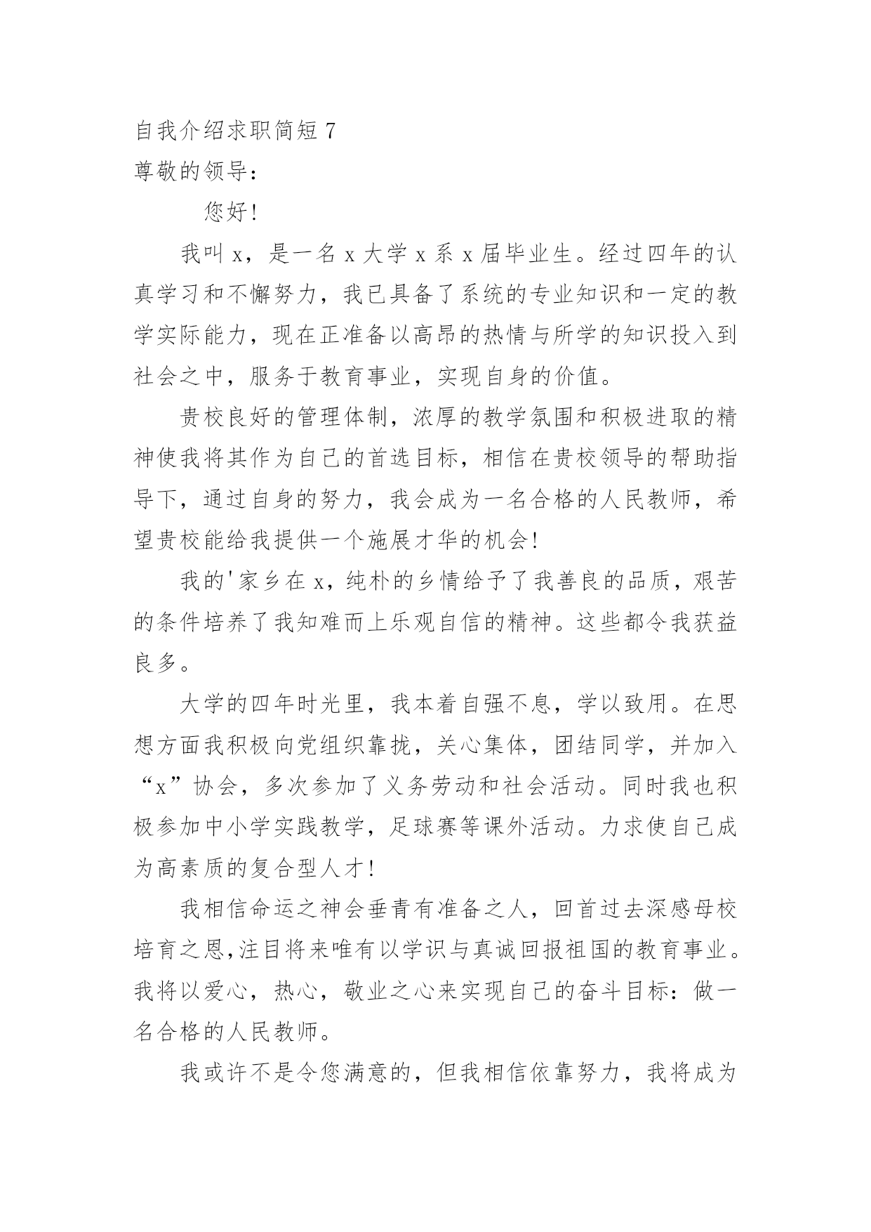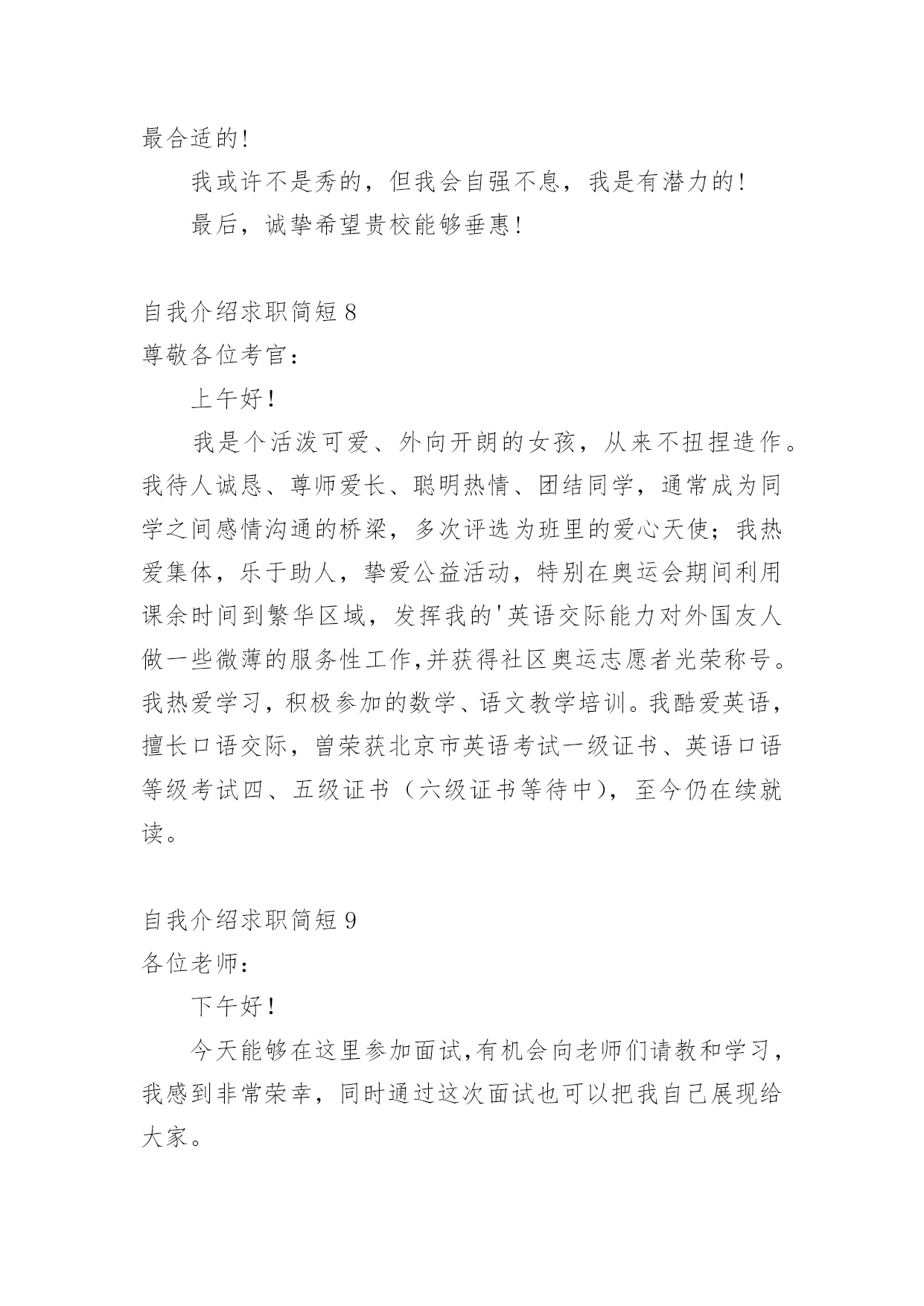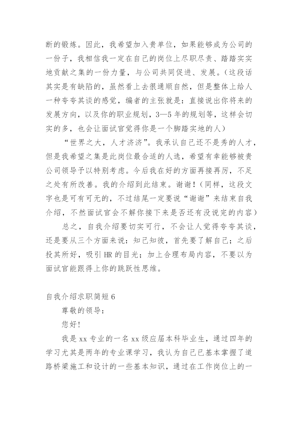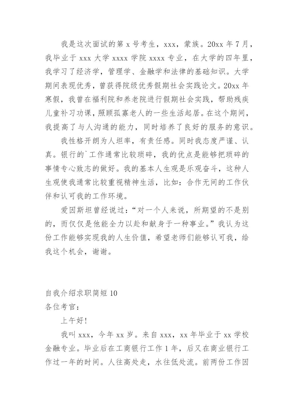自我介绍求职简短来到一个陌生的地方时,常常要进行自我介绍,自我介绍是一展示自己的手段。千万不能认为自我介绍随便应付就可以,以下是小编整理的自我介绍求职简短,希望对大家有所帮助。自我介绍求职简短1我是一个农村长大的80后,深知只有靠汗水才能换来好的收成。从业至今历经十二个年头,我想我已经具备了作为一名职业经理人的素质和要求。我还是一个真诚的人,我相信无论做什么,诚信应该是第一位的。只有我做到以诚相待,对方才会信任于我,用真诚的微笑拉近我们的距离。责任心强凡事以工作为中心,以做好工作为本。对经营管理和战略战术的建立上,较有不同于他人的.自信心。规则是死的人是活的,销售工作面对的是人,最忌讳的便是在工作中千篇一律的教条主义,应以人为本、灵活应变、抓住重点、提高效率找一个自己喜欢的职业,作为一份事业,并为此奋斗一生。努力争取做个让领导放心,同事舒心,自己安心的好人。自我介绍求职简短2主考官:您好!我叫某某某,是一个性格开朗、自信,不轻易服输的人。生活中我喜欢与人交往,通过与各种朋友相处,学习到了很多自身缺乏的优点。在学习上我积极认真,努力掌握专业知识,现在已经具有相关的办公室事务管理、文书拟写与处理公共关系策划与活动组织等能力。在校期间我曾担任系团委、学生会组织部部长,在工作中具有高度的责任感,能出色的.完成本职工作,并协助别的同学,有很好的组织能力及团队协作精神。大学的学习、工作与生活使我树立了正确的人生观、价值观,形成了热情上进的性格和诚实、守信,有责任心的人生信条。面对社会的种种挑战,虽然我的经验和某些方面的技能水平不足,但相信在今后的学习、生活、工作中我会越做越好,以不懈奋斗的意念,愈战愈强的精神和忠实肯干的作风实现自我人生价值。xxxxxxxxx自我介绍求职简短3回首四年的校园生活,有喜有愁,有成功也有失败,我孜孜不倦,在努力的充实自己,坚持刻苦努力学习,把所学的东西应用在生活中。为实现人生的价值打下坚实的基础。通过四年的专业学习,我深深地喜爱自己的专业。专业的学习让我熟知人力资源管理专业知识,包括员工的招聘、培训、绩效考评及薪酬管理等方面的知识。同时,经过努力我拿到了国家英语四级证书、计算机新编一级证书、普通话二级甲等证书。并在大三暑假拿到了中华人民共和国机动车驾驶证C1证。一分钟个性自我介绍大量的'实践活动使我有机会接触各种各样的人,遇到各种各样的困难。在处理这些问题的同时我锻炼了自身的处事能力,能全面思考问题,对事物有自己的见解。这些既培养了我的团队合作精神,又使我能袒诚面对自身的问题。在即将进入社会之际,为了更好地适应社会,我希望自己能够做到一种被别人需要的一种状态,至于做什么,就是在实践中,不断的学习、不断的锻炼。因此,我希望加入贵单位,如果能够成为公司的一份子,我相信我一定在自己的岗位上尽职尽责、踏踏实实地贡献之集的一份力量,与公司共同促进、发展。自我介绍求职简短4各位考官好:能参加这次面试我感到很荣幸,我希望通过这次面试将一个真实的自己展示给您,帮助自己抓住这个机会。我是xx,来自于xx,可能有的人知道xx,那里就是我出生的地方,所以以此为名,同时它也有吉祥延绵之意。我平时喜欢阅读书籍和时事消息,尤其喜欢名人传记,在阅读他们时,我相信它们不光可以了解名人的风采,更可以增长自己的人生阅历,经历我生活中无法经历的精彩人生。而在事实方面更偏好于国际形势的了解。我相信在这个广泛合作的现代生活中,扩大自己的知识面是必然的。我毕业于xx,在校期间多次参加专业实践活动和项目制定实施过程。成为一名合格的xx是我一直不变的愿望。通过多年的学习和锻炼,我养成坚韧的性格和乐观的精神,尤其是人际关系和对事情的处理方式方面得到了长足的进展。1、人际方面我充分利用自己友善,有耐性的`性格特点与身边的人和睦相处,在与人相处尤其是人际间的谈话中我可以掌握每一个人的情绪变化和表达含义及时的调整谈话内容和回应方式。2、在处事方面我坚信知己知彼才能百战不殆,不打无准备之仗,尽量考虑成功与失败的条件和得失,减少风险得程度,完成任务。我相信这两方面的特点可以帮助我更好的成为一名合格的xx,帮助社会弱势群特获得更多的帮助和支持。人的生命是平等的,每个人都有获得美好生活的权利,这就是我对一名xx职责的理解和诠释,我相信我会用我努力来见证一名xx价值,希望大家给我这个机会。自我介绍求职简短5各位考官:大家下午好!很荣幸能在这里面试,让我有向各位考官学习与交流的机会,现将自己的情况简要介绍一下:(这句话其实是可有可无的,不过一般在群面的时候还是很有必要用到的)我叫xx,来自于中国最美的乡村—婺源(有必要用几个词修饰下自己的家乡)。性格比较温和、谦虚、认真细致、踏实、吃苦耐劳、有较强的责任心和社会适应能力(这里可以用一些修饰性的词语对自己的性格做一个简单的介