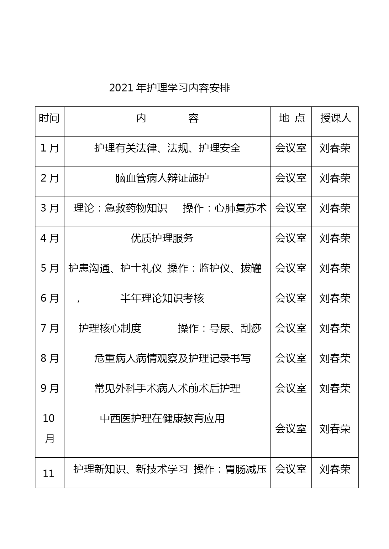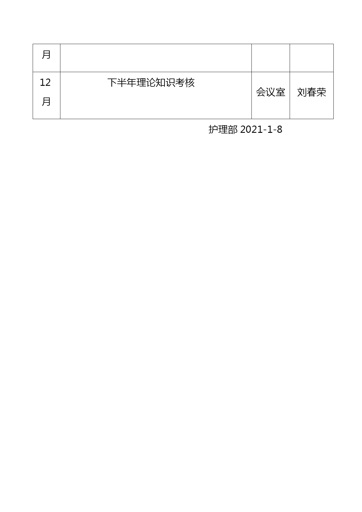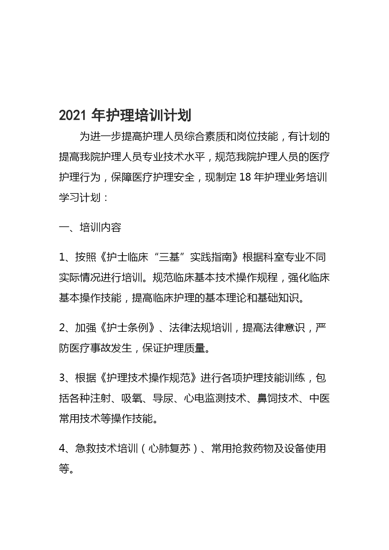 年护理培训计划(完整版)资料(可以直接使用,可编辑优秀版资料,欢迎下载)2021年护理培训计划为进一步提高护理人员综合素质和岗位技能,有计划的提高我院护理人员专业技术水平,规范我院护理人员的医疗护理行为,保障医疗护理安全,现制定18年护理业务培训学习计划:一、培训内容1、按照《护士临床“三基”实践指南》根据科室专业不同实际情况进行培训。规范临床基本技术操作规程,强化临床基本操作技能,提高临床护理的基本理论和基础知识。2、加强《护士条例》、法律法规培训,提高法律意识,严防医疗事故发生,保证护理质量。3、根据《护理技术操作规范》进行各项护理技能训练,包括各种注射、吸氧、导尿、心电监测技术、鼻饲技术、中医常用技术等操作技能。4、急救技术培训(心肺复苏)、常用抢救药物及设备使用等。5、学习各种报刊、杂志上的护理最新知识。二、培训时间:护理部每月第三周周五,遇特殊情况按通知时间。科室每月组织一次,时间自行安排。三、培训方式:1、全体护士参加,采用多种形式由护士轮流讲课2、安排课题,分别准备,互相交流。四、考核:1、技能操作考核:护理部每季度1-2项护理技术操作。科室每月一次。2、理论知识考试:护理部半年一次,科室每季度一次。五、培训学习要求1.各科室依据医院三基三严培训要求及计划制订本科室培训计划并实施,护理部监督检查,切实起到培训作用,保障学习效果。2.各科室要求有学习计划、笔记、影像资料、考核试卷。2021年护理学习内容安排时间内容地点授课人1月护理有关法律、法规、护理安全会议室刘春荣2月脑血管病人辩证施护会议室刘春荣3月理论:急救药物知识操作:心肺复苏术会议室刘春荣4月优质护理服务会议室刘春荣5月护患沟通、护士礼仪操作:监护仪、拔罐会议室刘春荣6月,半年理论知识考核会议室刘春荣7月护理核心制度操作:导尿、刮痧会议室刘春荣8月危重病人病情观察及护理记录书写会议室刘春荣9月常见外科手术病人术前术后护理会议室刘春荣10月中西医护理在健康教育应用会议室刘春荣11月护理新知识、新技术学习操作:胃肠减压会议室刘春荣12月下半年理论知识考核会议室刘春荣护理部2021-1-8天马行空官方博客:;QQ:1318241189;QQ群:1755696322021年护理工作计划与目标管理在院党委和院领导的领导下,认真贯彻医院管理评价标准,坚持以患者中心,提高服务质量,规范服务行为,强化管理意识、质量意识、服务意识和安全意识。本着“质量为先,教育为重,管理为新,人员为本”的理念,以医院管理年活动为契机,不断提高护理服务的质量,为患者提供“优质、高效、便捷、满意”的服务。一、加强护理管理,提高护士长管理水平。目标:护士长参加培训率达95%,管理知识考试合格率达100%。1.1~3月举办院内护士长管理学习班,主要是更新护理管理理念,提高护理管理技巧,培育护理服务中人文精神,护患沟通的技能培养等。2.加强护士长目标管理考核,月考评与年终考评相结合,科室护理质量与护士长考评挂钩等管理指标。3.促进护士长间及科室间的学习交流,每月组织护理质量交叉大检查,并召开护士长工作经验交流会,借鉴提高护理管理水平。4.启动护士长助理的计划,培养护士长后备队伍,完善护理管理队伍。二、开展人文关怀,满足患者需求,提高患者满意度。目标:住院病人满意率达90%,出院病人满意率达90%,健康教育知晓率达100%。1.组织全员护理人员认真学习兰大一院《服务礼仪规范》,并组织全院护理人员考试,以次规范护士行为。2.开展以“温馨护理站”为主题的优质护理服务竞赛活动。旨在使护理人员更加重视护理服务,让患者感受护士的精湛技术、精心护理;建立和谐、向上、互动、融洽的护患关系,弘扬传统,提升护理价值。在“5.12”护士节到来时对“温馨护理站”进行表彰。3.继续开展护理服务承诺,进一步落实护理服务承诺内容,以继续提高患者对护理工作的满意度。4.进一步加强健康教育工作,采取患者易于接受的施教方式,使健康教育知晓率≥100%。5.每月召开工休座谈会,每月发放住院病人满意度调查表。三、定期与不定期护理质量检查,保持护理质量持续改进。目标:护理管理规范化、制度化、标准化。1.充分发挥护理质量控制小组的作用,每月进行护理质量检查,以便及时发现问题,及时纠正、处理。不足之处进行原因分析并及时整改,强化护理人员的服务意识、质量意识。2.不断修改完善各种护理质量标准,并组织学习,按标准实施各项护理工作。3.每月在护士长例会由质控小组反馈质量检查检查信息并进行综合分析,查找原因,制定切实可行的整改措施,并检查整改落实情况。四、加强“三基”“三严”训练,保证基础护理质量。目标:护理人员三基