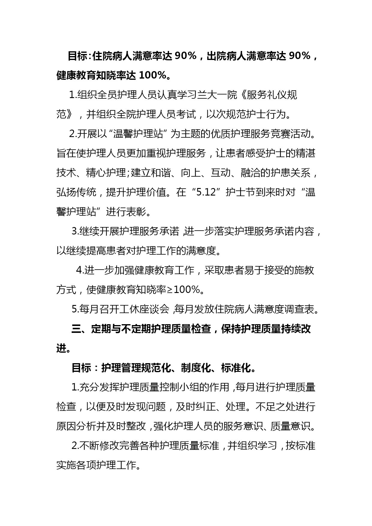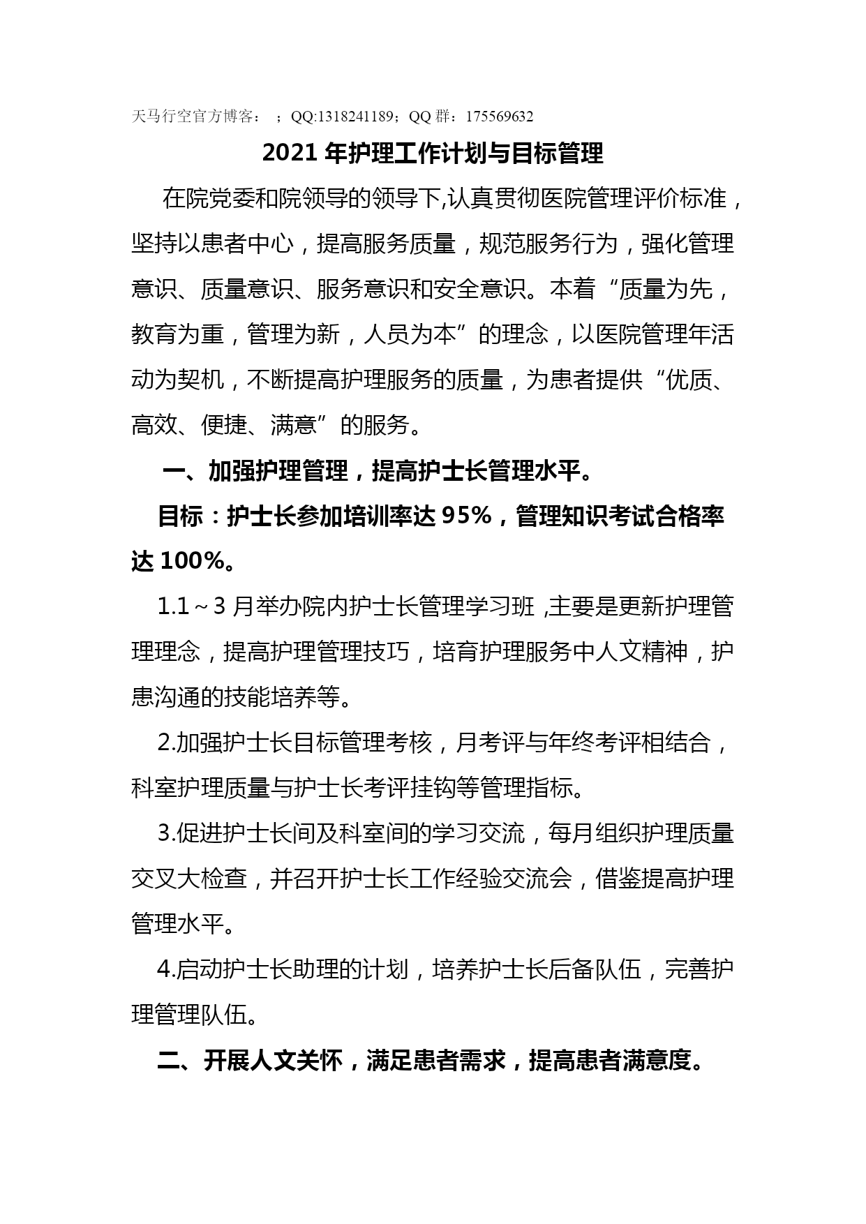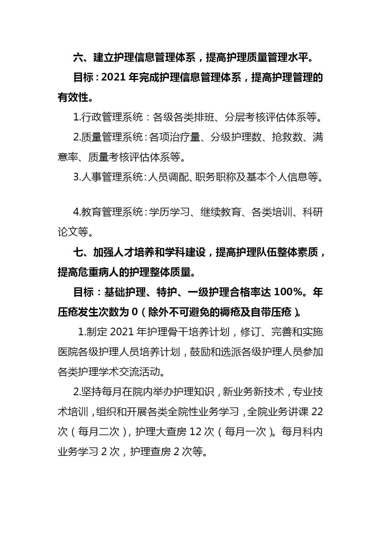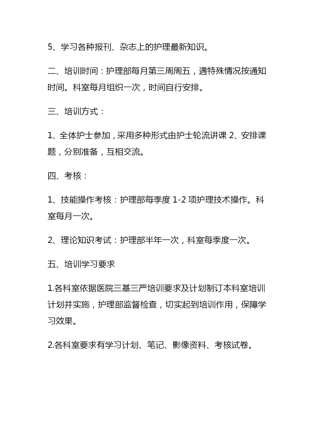 年护理培训计划(完整版)资料(可以直接使用,可编辑优秀版资料,欢迎下载)2021年护理培训计划为进一步提高护理人员综合素质和岗位技能,有计划的提高我院护理人员专业技术水平,规范我院护理人员的医疗护理行为,保障医疗护理安全,现制定18年护理业务培训学习计划:一、培训内容1、按照《护士临床“三基”实践指南》根据科室专业不同实际情况进行培训。规范临床基本技术操作规程,强化临床基本操作技能,提高临床护理的基本理论和基础知识。2、加强《护士条例》、法律法规培训,提高法律意识,严防医疗事故发生,保证护理质量。3、根据《护理技术操作规范》进行各项护理技能训练,包括各种注射、吸氧、导尿、心电监测技术、鼻饲技术、中医常用技术等操作技能。4、急救技术培训(心肺复苏)、常用抢救药物及设备使用等。5、学习各种报刊、杂志上的护理最新知识。二、培训时间:护理部每月第三周周五,遇特殊情况按通知时间。科室每月组织一次,时间自行安排。三、培训方式:1、全体护士参加,采用多种形式由护士轮流讲课2、安排课题,分别准备,互相交流。四、考核:1、技能操作考核:护理部每季度1-2项护理技术操作。科室每月一次。2、理论知识考试:护理部半年一次,科室每季度一次。五、培训学习要求1.各科室依据医院三基三严培训要求及计划制订本科室培训计划并实施,护理部监督检查,切实起到培训作用,保障学习效果。2.各科室要求有学习计划、笔记、影像资料、考核试卷。2021年护理学习内容安排时间内容地点授课人1月护理有关法律、法规、护理安全会议室刘春荣2月脑血管病人辩证施护会议室刘春荣3月理论:急救药物知识操作:心肺复苏术会议室刘春荣4月优质护理服务会议室刘春荣5月护患沟通、护士礼仪操作:监护仪、拔罐会议室刘春荣6月,半年理论知识考核会议室刘春荣7月护理核心制度操作:导尿、刮痧会议室刘春荣8月危重病人病情观察及护理记录书写会议室刘春荣9月常见外科手术病人术前术后护理会议室刘春荣10月中西医护理在健康教育应用会议室刘春荣11月护理新知识、新技术学习操作:胃肠减压会议室刘春荣12月下半年理论知识考核会议室刘春荣护理部2021-1-8天马行空官方博客:;QQ:1318241189;QQ群:1755696322021年护理工作计划与目标管理在院党委和院领导的领导下,认真贯彻医院管理评价标准,坚持以患者中心,提高服务质量,规范服务行为,强化管理意识、质量意识、服务意识和安全意识。本着“质量为先,教育为重,管理为新,人员为本”的理念,以医院管理年活动为契机,不断提高护理服务的质量,为患者提供“优质、高效、便捷、满意”的服务。一、加强护理管理,提高护士长管理水平。目标:护士长参加培训率达95%,管理知识考试合格率达100%。1.1~3月举办院内护士长管理学习班,主要是更新护理管理理念,提高护理管理技巧,培育护理服务中人文精神,护患沟通的技能培养等。2.加强护士长目标管理考核,月考评与年终考评相结合,科室护理质量与护士长考评挂钩等管理指标。3.促进护士长间及科室间的学习交流,每月组织护理质量交叉大检查,并召开护士长工作经验交流会,借鉴提高护理管理水平。4.启动护士长助理的计划,培养护士长后备队伍,完善护理管理队伍。二、开展人文关怀,满足患者需求,提高患者满意度。目标:住院病人满意率达90%,出院病人满意率达90%,健康教育知晓率达100%。1.组织全员护理人员认真学习兰大一院《服务礼仪规范》,并组织全院护理人员考试,以次规范护士行为。2.开展以“温馨护理站”为主题的优质护理服务竞赛活动。旨在使护理人员更加重视护理服务,让患者感受护士的精湛技术、精心护理;建立和谐、向上、互动、融洽的护患关系,弘扬传统,提升护理价值。在“5.12”护士节到来时对“温馨护理站”进行表彰。3.继续开展护理服务承诺,进一步落实护理服务承诺内容,以继续提高患者对护理工作的满意度。4.进一步加强健康教育工作,采取患者易于接受的施教方式,使健康教育知晓率≥100%。5.每月召开工休座谈会,每月发放住院病人满意度调查表。三、定期与不定期护理质量检查,保持护理质量持续改进。目标:护理管理规范化、制度化、标准化。1.充分发挥护理质量控制小组的作用,每月进行护理质量检查,以便及时发现问题,及时纠正、处理。不足之处进行原因分析并及时整改,强化护理人员的服务意识、质量意识。2.不断修改完善各种护理质量标准,并组织学习,按标准实施各项护理工作。3.每月在护士长例会由质控小组反馈质量检查检查信息并进行综合分析,查找原因,制定切实可行的整改措施,并检查整改落实情况。四、加强“三基”“三严”训练,保证基础护理质量。目标:护理人员三基