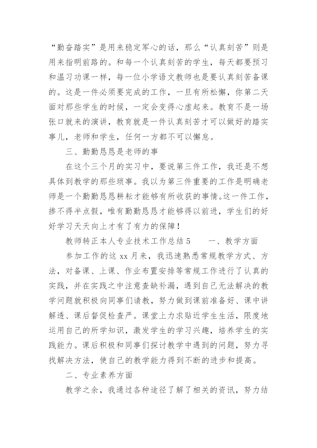 教师转正本人专业技术工作总结教师转正本人专业技术工作总结(精选18篇)时间过得真快,一段时间的工作已经告一段落了,经过过去这段时间的积累和沉淀,我们已然有了很大的提升和改变,需要认真地为此写一份工作总结。你还在为写工作总结而苦恼吗?以下是小编帮大家整理的教师转正本人专业技术工作总结(精选18篇),希望能够帮助到大家。教师转正本人专业技术工作总结1一、师德表现平时积极参加全校教职工大会,认真学习学校下达的上级文件,关心国内外大事,注重政治理论的学习,同时配合组里搞好教研活动。每周按时参加升旗仪式,从不缺勤。服从安排,人际关系融洽。另一方面,教师的言行,学生极易照样接受,很少去鉴别,因而,我本着要对学生的一生负责,认识到必须要正视自己的言行。以身作则,才能为人师表。要求学生做到的,自己必须先做到。如果言行脱节,说做不一,或者是要求学生这样做,自己却那样做,只能引起学生反感,造成恶劣影响。我坚信拥有健康的人格品位,才能在学生中树立威信、得到敬重,起到榜样作用。二、学校班主任工作学校领导出于对我的磨炼与培养,让我一个刚毕业的学生一进校就做五年级的学校班主任。通过向其他优秀学校班主任的学习,我认识到教育上单方面的严和爱都是不行的。学校班主任最主要的是要找到严和爱的切合点。在工作中注意:1、制定切实有效的班规,培养班委自主管理的能力。鼓励干部大胆工作,指点他们工作方法的同时,要更严格要求干部个人在知识、能力上取得更大进步,在纪律上以身作则,力求从各方面给全班起到模范带头作用。2、充分利用课间谈话和班会课。抓住和学生们沟通的时间,了解班级情况和学生们的心理状态,有的放矢的进行教育和解决问题。或讲座、或讨论、或给他们讲充满人生哲理的故事传说的班会课是我对学生进行思想道德建设的有效阵地。3、关怀后进生、行为偏差生。后进生、行为偏差生是有着强大的自卑感难教育的一批。对此,我拿出了极大的耐心,通过家访和谈话等形式逐步使他们有所转变。现在我班已经逐步向着一个既有着严格的制度,又充满团结向上风气的集体靠拢。学校班主任工作精心而又繁琐,是在广阔的心灵世界中播种耕耘的职业,在今后的教育生涯中,我将用我的青春继续耕耘这片园地。三、英语教学工作我所任教的是二年级和六年级共五个班的英语教学工作。面对这两个有一定年龄差距的年段,我根据他们各自不同的特征因材施教,着重注意做到以下几点:1、深入细致的备好每一节课。在备课中,我认真研究教材,力求准确把握重点,难点,并注重参阅各种资料,制定符合学生认知规律的教学方法及教学形式。注意弱化难点强调重点。教案编写认真,并不断归纳总结以提高教学水平。2、认真上好每一节课。我在英语课堂采用多样化活动教学,把音乐、简单的舞蹈动作、游戏、画画、比赛等融入到课堂中,激发学生的求知欲,活跃课堂气氛,限度地让学生在轻松自主的学习氛围中快乐求知,轻松学习,不断地鼓励自己“english,icando”“english,icansay”。3、认真及时批改作业,注意听取学生的意见,及时了解学生的学习情况,并有目的的对学生进行辅导。4、坚持听课,认真记录,积极参与评课,学习各组教师的教学经验,努力探索适合自己的教学模式,并抓住每次外出学习的机会,取长补短,收获不少。5、注重教育理论的学习,把一些先进的理论应用于课堂,做到学有所用、一年来,我在学校开了多次公开课。通过开公开课,使自己的教学水平得到很大的提高,但也使我意识到了自己在教学方面的不足之处,一年教龄公开课受到各位老师的好评。总体上来说,我感觉从大学校园走进小学校园,不仅仅是环境的变化,更多的是角色的变化,从一个被教育者变成了教育工作者。在这样一个变化的过程中有苦有甜,但是我知道所有的付出一定会有回报的。教师转正本人专业技术工作总结2第一、教学在教学工作之初,由于缺乏工作经验,上课过程中仍然存在一些困难。但在领导、师傅、同事的热心帮助下,我每一次都有进步,投身教育近一年。我的教学水平和管理技能有了很大的提高。师徒活动给了我一个很好的师傅,在教育教学和班级管理方面给了我很大的帮助。在师父的指导下,我工作不稳定。在面对工作中的不足和缺点时,师父毫不犹豫地公开指出她给我的教育管理方法,使我在教学中找到了明确的目标,并在第二学期的辅导中得到表扬和肯定。第二、班主任的工作当父母知道我是刚毕业的班主任时,我觉得父母会本能的质疑我,但这些顾虑却成了我努力的动力。开学时,我建立了一个班级微信群,方便与每一位家长及时沟通。这个小微信群极大地促进了班级的凝聚力和孩子们的各种活动,比如背诵古诗、讲故事、晒自己的书、晒自己的打扫学校的小饭盒等等。更有甚者,我和父母对孩子的肯定和鼓励。渐渐地,父母为孩子们准备了各种学习用品来鼓励他们进步。在这样和谐的氛围中,这个小家庭每天都充满着正能量。后来看到十一国庆的家长在朋友