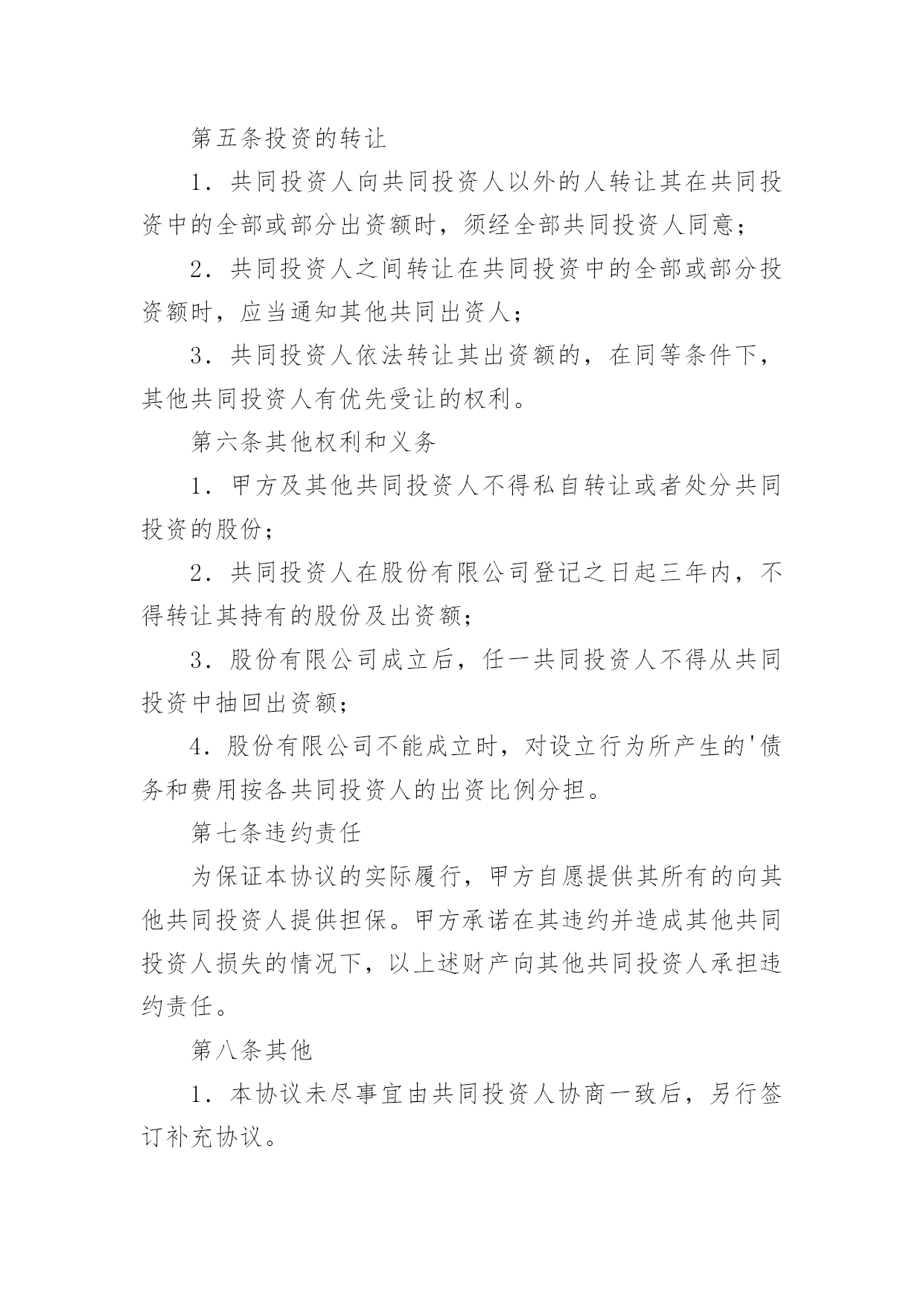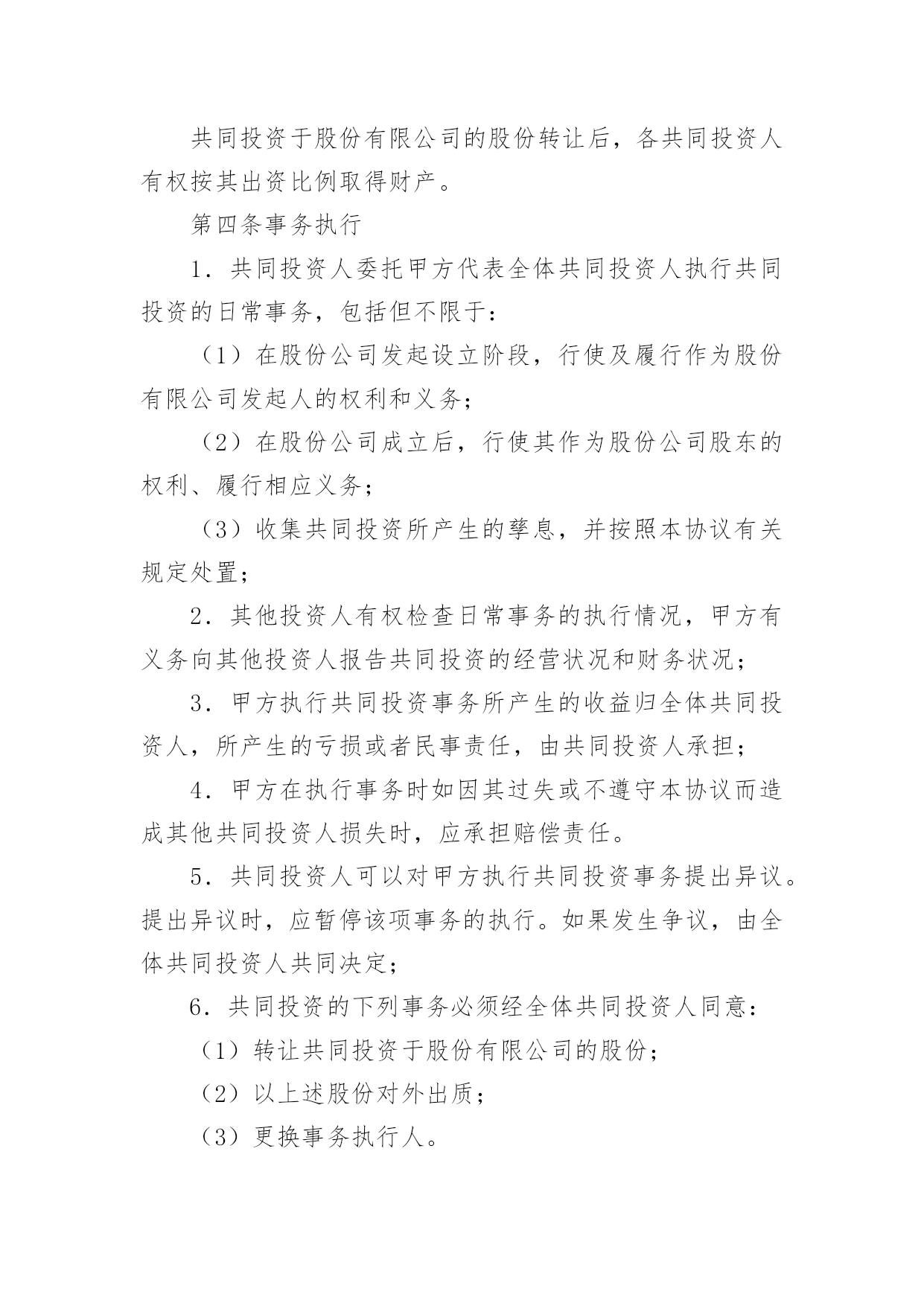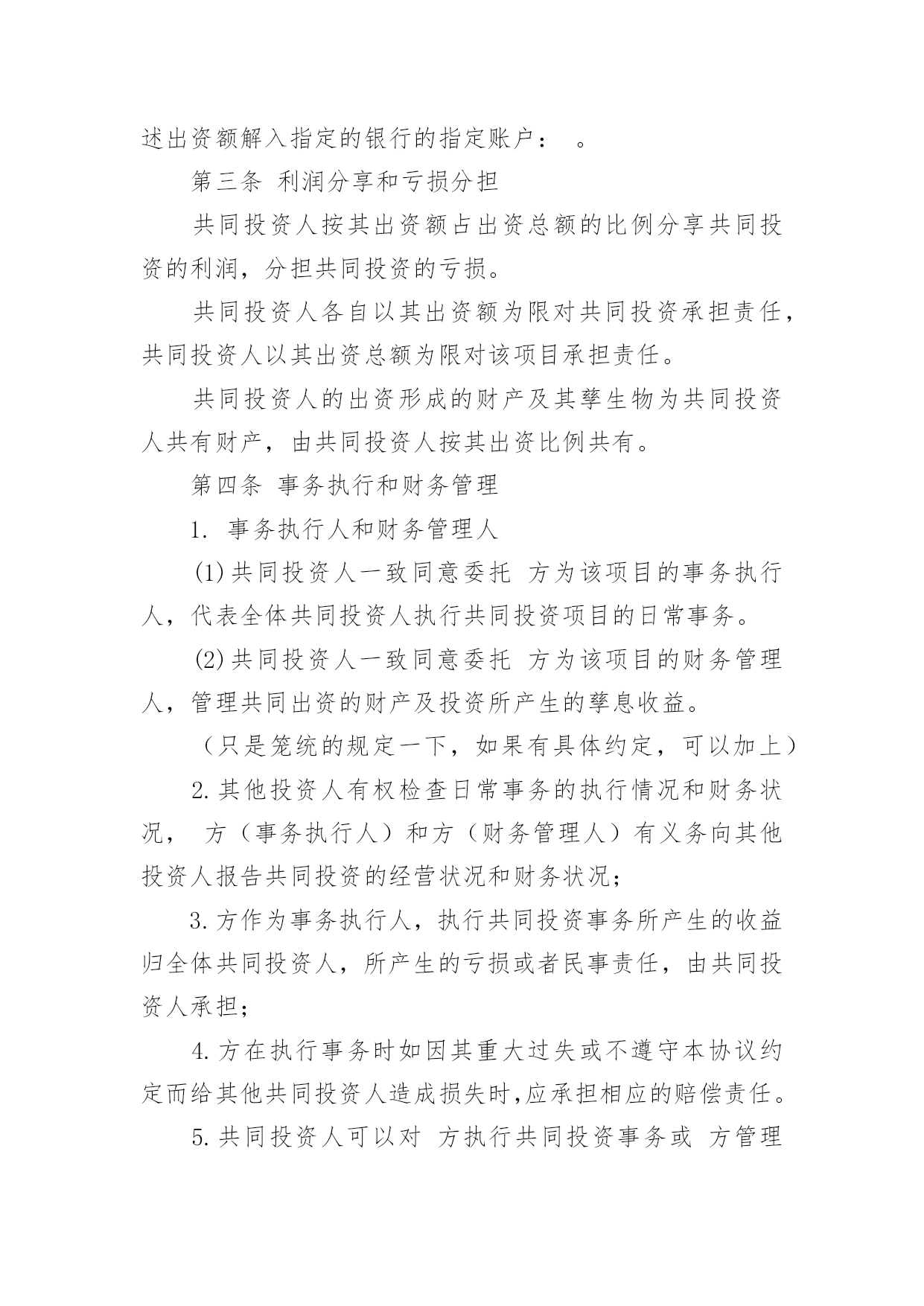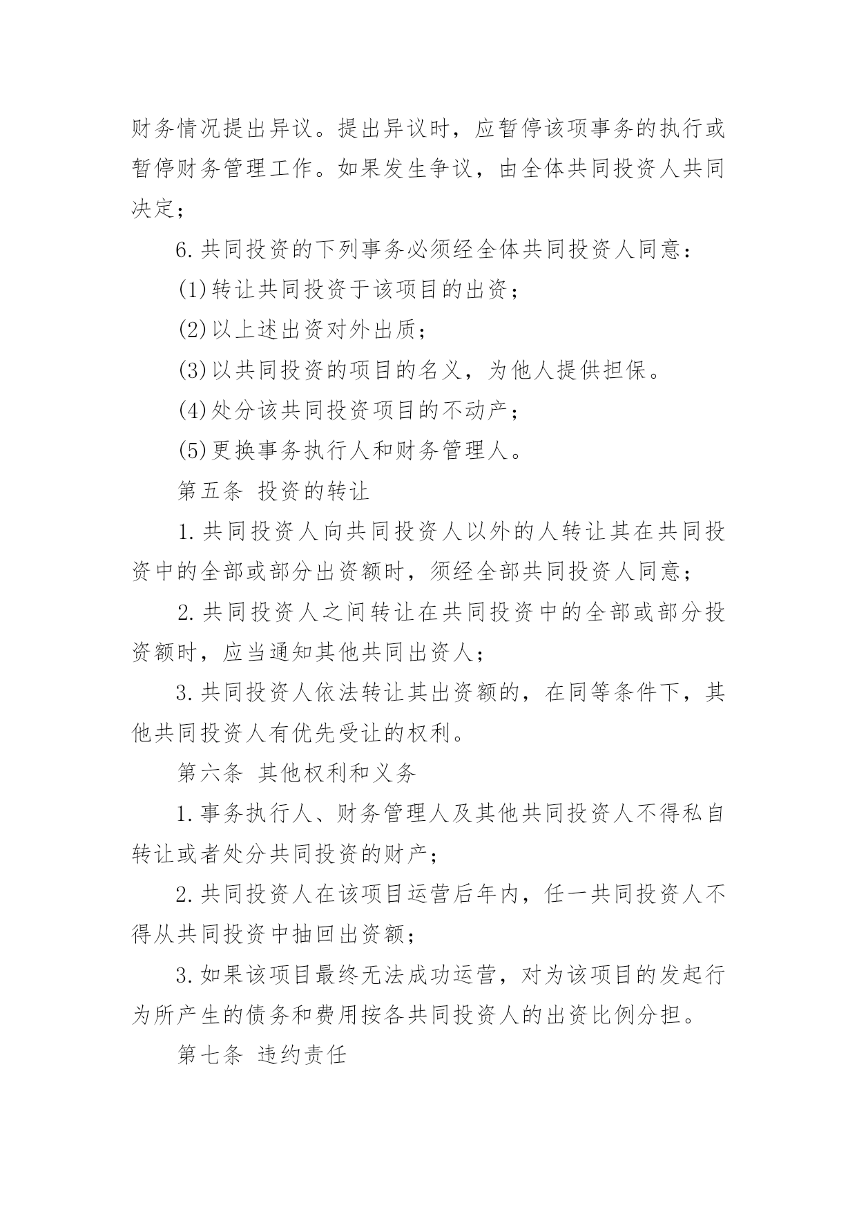 共同投资合作协议书关于共同投资合作协议书4篇在不断进步的时代,协议的使用频率呈上升趋势,签订协议能够较为有效的约束违约行为。到底应如何拟定协议呢?以下是小编帮大家整理的关于共同投资合作协议书4篇,仅供参考,欢迎大家阅读。关于共同投资合作协议书4篇1甲方:住所:身份证号:乙方:住所:身份证号:丙方:住所:身份证号:丁方:住所:身份证号:以上各方共同投资人经友好协商,根据中华人民共和国法律、法规的规定,就各方共同出资进行项目合作事宜,达成如下协议,并共同遵守。第一条投资项目情况简要描述:(项目名称投资地点等)第二条共同投资人的投资额和投资方式共同出资人的出资总额为人民币元,其中,各方出资分别:甲方出资元,占出资总额的%;乙方出资元,占出资总额的%;丙方出资元,占出资总额的%;丁方出资元,占出资总额的%;各共同投资人应于年月日前将上述出资额解入指定的银行的指定账户:。第三条利润分享和亏损分担共同投资人按其出资额占出资总额的比例分享共同投资的利润,分担共同投资的亏损。共同投资人各自以其出资额为限对共同投资承担责任,共同投资人以其出资总额为限对该项目承担责任。共同投资人的出资形成的财产及其孳生物为共同投资人共有财产,由共同投资人按其出资比例共有。第四条事务执行和财务管理1.事务执行人和财务管理人(1)共同投资人一致同意委托方为该项目的事务执行人,代表全体共同投资人执行共同投资项目的日常事务。(2)共同投资人一致同意委托方为该项目的财务管理人,管理共同出资的财产及投资所产生的孳息收益。(只是笼统的规定一下,如果有具体约定,可以加上)2.其他投资人有权检查日常事务的执行情况和财务状况,方(事务执行人)和方(财务管理人)有义务向其他投资人报告共同投资的经营状况和财务状况;3.方作为事务执行人,执行共同投资事务所产生的收益归全体共同投资人,所产生的亏损或者民事责任,由共同投资人承担;4.方在执行事务时如因其重大过失或不遵守本协议约定而给其他共同投资人造成损失时,应承担相应的赔偿责任。5.共同投资人可以对方执行共同投资事务或方管理财务情况提出异议。提出异议时,应暂停该项事务的执行或暂停财务管理工作。如果发生争议,由全体共同投资人共同决定;6.共同投资的下列事务必须经全体共同投资人同意:(1)转让共同投资于该项目的出资;(2)以上述出资对外出质;(3)以共同投资的项目的名义,为他人提供担保。(4)处分该共同投资项目的不动产;(5)更换事务执行人和财务管理人。第五条投资的转让1.共同投资人向共同投资人以外的人转让其在共同投资中的全部或部分出资额时,须经全部共同投资人同意;2.共同投资人之间转让在共同投资中的全部或部分投资额时,应当通知其他共同出资人;3.共同投资人依法转让其出资额的,在同等条件下,其他共同投资人有优先受让的权利。第六条其他权利和义务1.事务执行人、财务管理人及其他共同投资人不得私自转让或者处分共同投资的财产;2.共同投资人在该项目运营后年内,任一共同投资人不得从共同投资中抽回出资额;3.如果该项目最终无法成功运营,对为该项目的发起行为所产生的债务和费用按各共同投资人的出资比例分担。第七条违约责任为保证本协议的实际履行,各出资人应按时缴纳出资,不按期出资的,按照元/天向其他守约方承担违约责任;如因不按期出资给该项目发起或经营造成损失的,应当向其他守约方承担相应的赔偿责任;任何一方出资延期2个月、明确表示不再出资或以自己的行为表明不再出资的,除承担因此造成的经济损失外,还应向其他守约方支付预计出资额%的违约金。第八条其他1.本协议未尽事宜由共同投资人协商一致后,另行签订补充协议。2.本协议经全体共同投资人签字或盖章后生效。本协议一式份,共同投资人各执一份,具有同等的法律效力。甲方(签字):乙方(签字):年____月____日年____月____日丙方(签字):丁方(签字):年____月____日年____月____日签订地点:关于共同投资合作协议书4篇2第一条共同投资人的姓名及住所甲方:_________住所:_________身份证号:_________乙方:_________住所:_________身份证号:_________丙方:_________住所:_________身份证号:_________丁方:_________住所:_________身份证号:_________以上各方共同投资人(以下简称“共同投资人”)经友好协商,根据中华人民共和国法律、法规的规定,就各方共同出资并由甲方以其名义受让_________股权,并作为发起人参与_________(暂定名,以下简称“股份公司”)的发起设立事宜,达成如下协议,以资共同遵守。第二条共同投资人的投资额和投资方式共同出资人的出资总额(以下简称“出资总额”)为人民币________