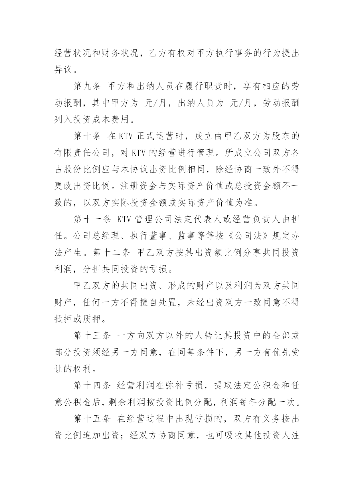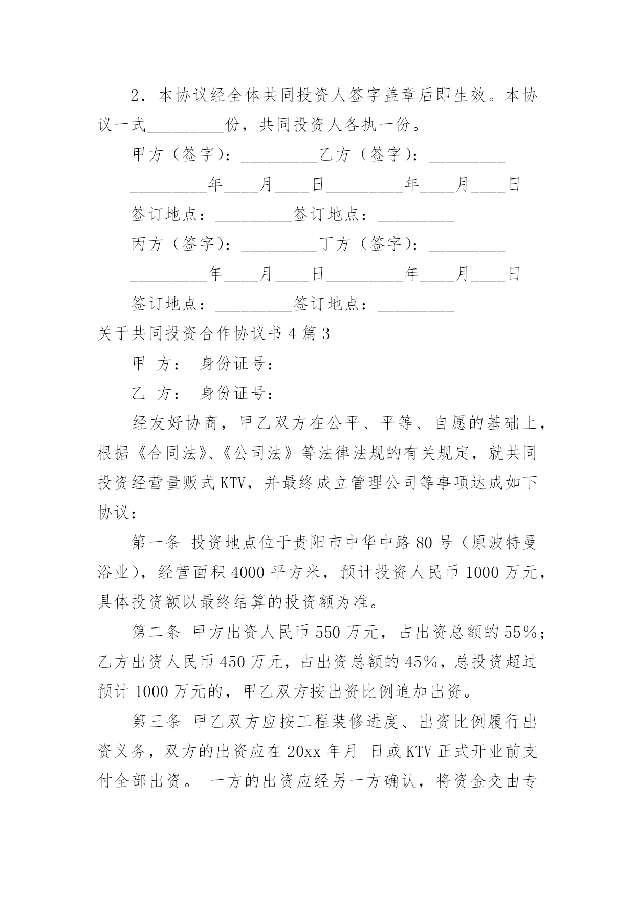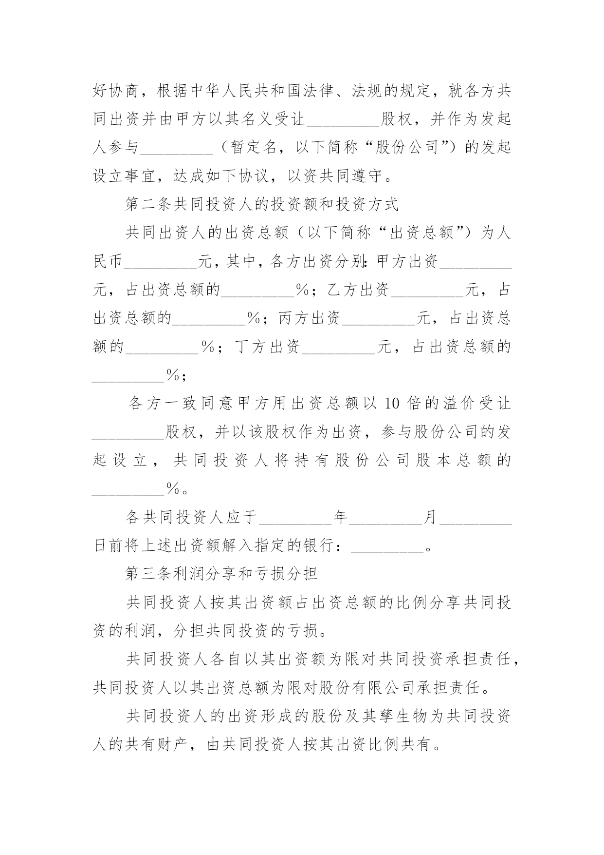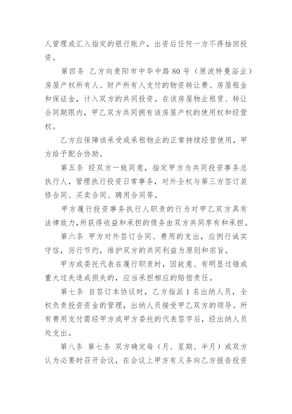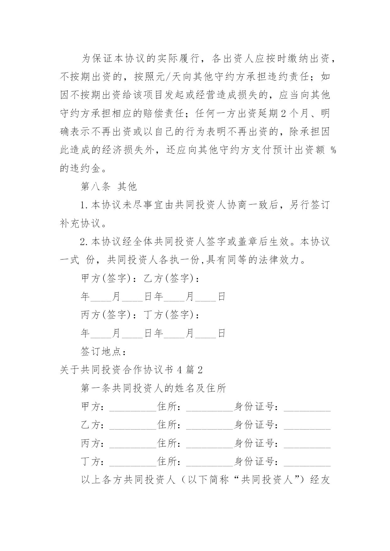 共同投资合作协议书关于共同投资合作协议书4篇在不断进步的时代,协议的使用频率呈上升趋势,签订协议能够较为有效的约束违约行为。到底应如何拟定协议呢?以下是小编帮大家整理的关于共同投资合作协议书4篇,仅供参考,欢迎大家阅读。关于共同投资合作协议书4篇1甲方:住所:身份证号:乙方:住所:身份证号:丙方:住所:身份证号:丁方:住所:身份证号:以上各方共同投资人经友好协商,根据中华人民共和国法律、法规的规定,就各方共同出资进行项目合作事宜,达成如下协议,并共同遵守。第一条投资项目情况简要描述:(项目名称投资地点等)第二条共同投资人的投资额和投资方式共同出资人的出资总额为人民币元,其中,各方出资分别:甲方出资元,占出资总额的%;乙方出资元,占出资总额的%;丙方出资元,占出资总额的%;丁方出资元,占出资总额的%;各共同投资人应于年月日前将上述出资额解入指定的银行的指定账户:。第三条利润分享和亏损分担共同投资人按其出资额占出资总额的比例分享共同投资的利润,分担共同投资的亏损。共同投资人各自以其出资额为限对共同投资承担责任,共同投资人以其出资总额为限对该项目承担责任。共同投资人的出资形成的财产及其孳生物为共同投资人共有财产,由共同投资人按其出资比例共有。第四条事务执行和财务管理1.事务执行人和财务管理人(1)共同投资人一致同意委托方为该项目的事务执行人,代表全体共同投资人执行共同投资项目的日常事务。(2)共同投资人一致同意委托方为该项目的财务管理人,管理共同出资的财产及投资所产生的孳息收益。(只是笼统的规定一下,如果有具体约定,可以加上)2.其他投资人有权检查日常事务的执行情况和财务状况,方(事务执行人)和方(财务管理人)有义务向其他投资人报告共同投资的经营状况和财务状况;3.方作为事务执行人,执行共同投资事务所产生的收益归全体共同投资人,所产生的亏损或者民事责任,由共同投资人承担;4.方在执行事务时如因其重大过失或不遵守本协议约定而给其他共同投资人造成损失时,应承担相应的赔偿责任。5.共同投资人可以对方执行共同投资事务或方管理财务情况提出异议。提出异议时,应暂停该项事务的执行或暂停财务管理工作。如果发生争议,由全体共同投资人共同决定;6.共同投资的下列事务必须经全体共同投资人同意:(1)转让共同投资于该项目的出资;(2)以上述出资对外出质;(3)以共同投资的项目的名义,为他人提供担保。(4)处分该共同投资项目的不动产;(5)更换事务执行人和财务管理人。第五条投资的转让1.共同投资人向共同投资人以外的人转让其在共同投资中的全部或部分出资额时,须经全部共同投资人同意;2.共同投资人之间转让在共同投资中的全部或部分投资额时,应当通知其他共同出资人;3.共同投资人依法转让其出资额的,在同等条件下,其他共同投资人有优先受让的权利。第六条其他权利和义务1.事务执行人、财务管理人及其他共同投资人不得私自转让或者处分共同投资的财产;2.共同投资人在该项目运营后年内,任一共同投资人不得从共同投资中抽回出资额;3.如果该项目最终无法成功运营,对为该项目的发起行为所产生的债务和费用按各共同投资人的出资比例分担。第七条违约责任为保证本协议的实际履行,各出资人应按时缴纳出资,不按期出资的,按照元/天向其他守约方承担违约责任;如因不按期出资给该项目发起或经营造成损失的,应当向其他守约方承担相应的赔偿责任;任何一方出资延期2个月、明确表示不再出资或以自己的行为表明不再出资的,除承担因此造成的经济损失外,还应向其他守约方支付预计出资额%的违约金。第八条其他1.本协议未尽事宜由共同投资人协商一致后,另行签订补充协议。2.本协议经全体共同投资人签字或盖章后生效。本协议一式份,共同投资人各执一份,具有同等的法律效力。甲方(签字):乙方(签字):年____月____日年____月____日丙方(签字):丁方(签字):年____月____日年____月____日签订地点:关于共同投资合作协议书4篇2第一条共同投资人的姓名及住所甲方:_________住所:_________身份证号:_________乙方:_________住所:_________身份证号:_________丙方:_________住所:_________身份证号:_________丁方:_________住所:_________身份证号:_________以上各方共同投资人(以下简称“共同投资人”)经友好协商,根据中华人民共和国法律、法规的规定,就各方共同出资并由甲方以其名义受让_________股权,并作为发起人参与_________(暂定名,以下简称“股份公司”)的发起设立事宜,达成如下协议,以资共同遵守。第二条共同投资人的投资额和投资方式共同出资人的出资总额(以下简称“出资总额”)为人民币________
