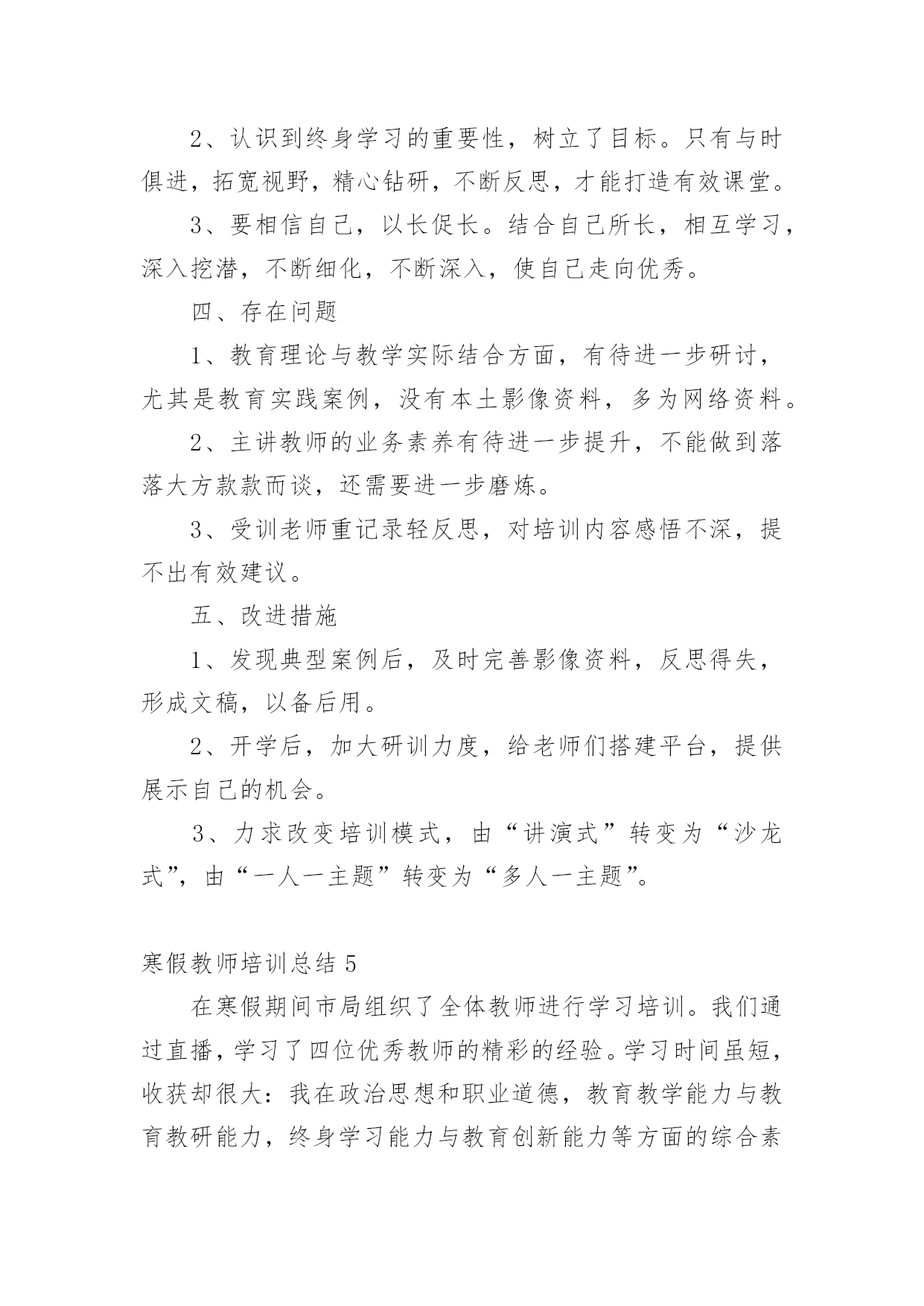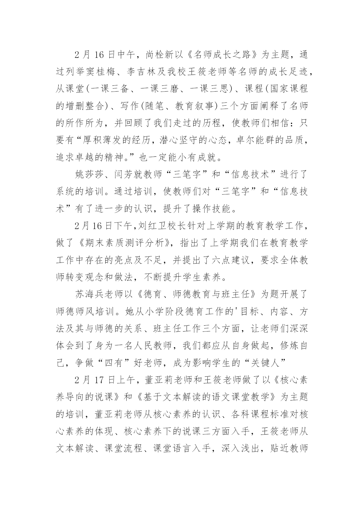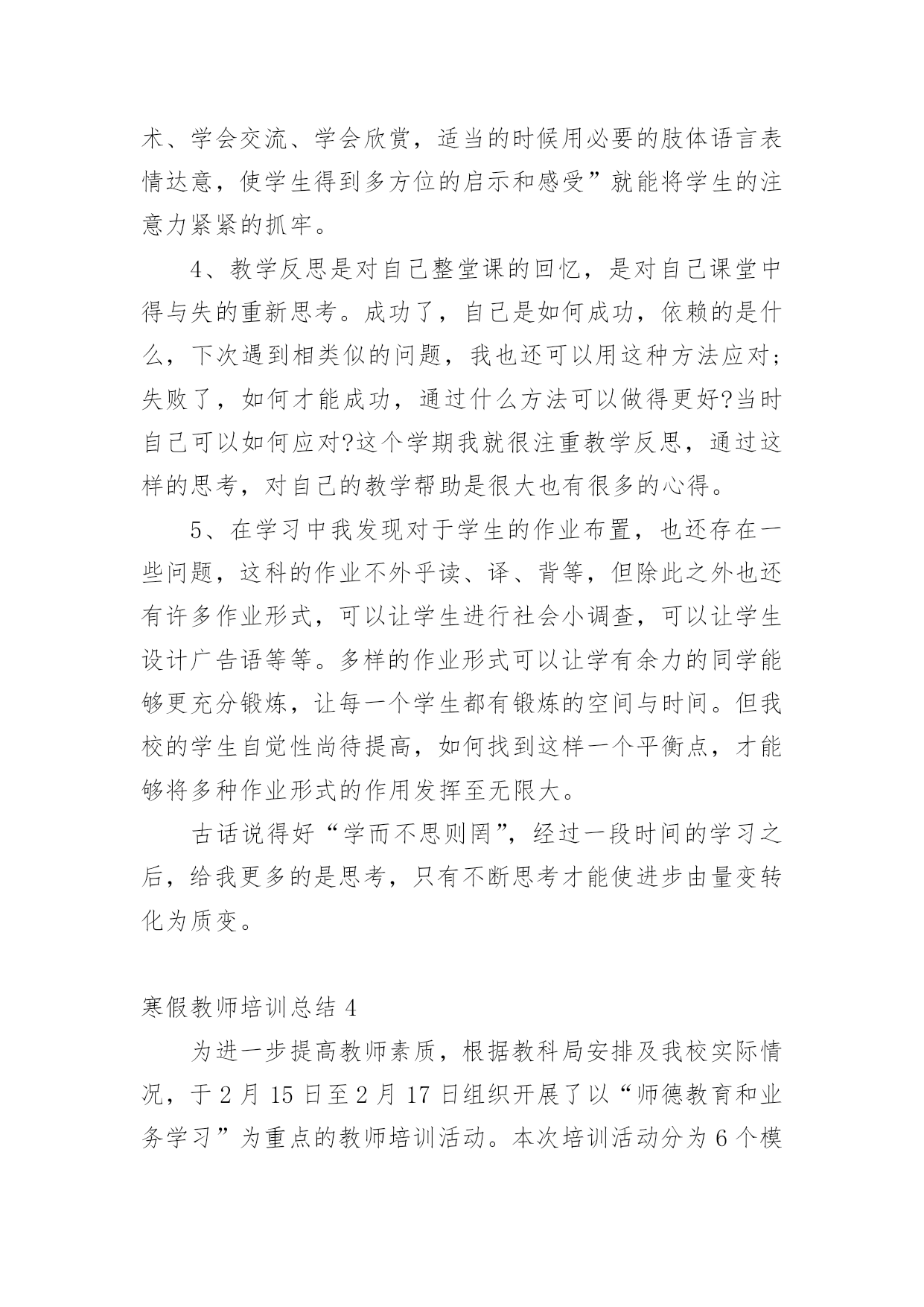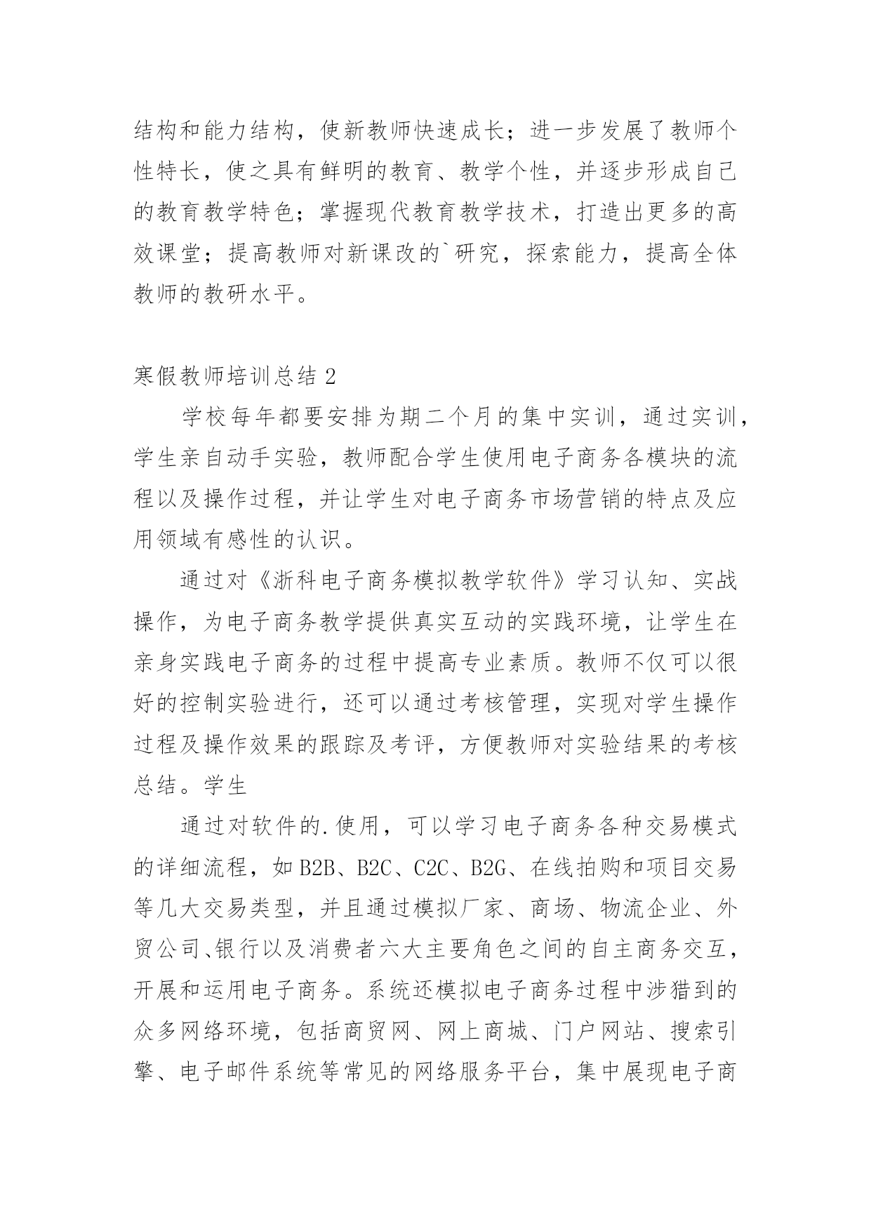 寒假教师培训总结寒假教师培训总结(15篇)总结在一个时期、一个年度、一个阶段对学习和工作生活等情况加以回顾和分析的一种书面材料,它是增长才干的一种好办法,不如我们来制定一份总结吧。那么总结应该包括什么内容呢?以下是小编为大家收集的寒假教师培训总结,欢迎阅读,希望大家能够喜欢。寒假教师培训总结1为深入贯彻落实沁阳市教育局关于做好20xx年寒假中小学幼儿园教师培训工作的通知要求,进一步提高我校教师的业务素质、专业水平和实践能力,加快研究型教师队伍培养步伐,全面提升教育教学质量。我校于2月18日、19日进行校本培训,现将培训情况总结如下:1、全体教师要按时签到,没有重大事情不准请假。2、各讨论组要认真组织,积极讨论,认真做好笔记,写好心得体会。3、组织教师学习十八大精神、沁阳市委六届五次全会精神,沁阳市教育局20xx-20xx学年工作思路》,学校新学年工作思路和奋斗目标;学校管理制度、中小学教师职业道德规范、学习研讨蔡林森教育管理思想、《教学革命》。此次培训更新了全校教师的教育理念,更新教师的知识结构和能力结构,使新教师快速成长;进一步发展了教师个性特长,使之具有鲜明的教育、教学个性,并逐步形成自己的教育教学特色;掌握现代教育教学技术,打造出更多的高效课堂;提高教师对新课改的`研究,探索能力,提高全体教师的教研水平。寒假教师培训总结2学校每年都要安排为期二个月的集中实训,通过实训,学生亲自动手实验,教师配合学生使用电子商务各模块的流程以及操作过程,并让学生对电子商务市场营销的特点及应用领域有感性的认识。通过对《浙科电子商务模拟教学软件》学习认知、实战操作,为电子商务教学提供真实互动的实践环境,让学生在亲身实践电子商务的过程中提高专业素质。教师不仅可以很好的控制实验进行,还可以通过考核管理,实现对学生操作过程及操作效果的跟踪及考评,方便教师对实验结果的考核总结。学生通过对软件的.使用,可以学习电子商务各种交易模式的详细流程,如B2B、B2C、C2C、B2G、在线拍购和项目交易等几大交易类型,并且通过模拟厂家、商场、物流企业、外贸公司、银行以及消费者六大主要角色之间的自主商务交互,开展和运用电子商务。系统还模拟电子商务过程中涉猎到的众多网络环境,包括商贸网、网上商城、门户网站、搜索引擎、电子邮件系统等常见的网络服务平台,集中展现电子商务主要的交易流程与核心理念。另外《浙科电子商务模拟教学软件》学生还可以学到局域网的搭建、网页设计和制作、数据库设计、网站布置、网上创业、电子商务服业应用、Web2。0应用等等内容。《浙科网络营销模拟教学软件》是模拟一个由搜索引擎、邮件服务、门户网、商贸信息网、企业网站等组成的网络营销环境,支持网络搜索、邮件、新闻组、邮箱地址列表、信息发布、网络广告、竞价排名、域名申请等等诸多网络服务项目。在这种虚拟的网络环境下,通过普通消费者和企业用户的分组,让企业用户通过“注册—>营销环境分析—>……—>域名申请—>创建企业网站—>……—>开展各式各样的网络营销活动”的流程,体会不同层次的网络营销给企业带来的机遇。而普通消费者也可以通过进入网络环境,访问上述网站,使用个人邮件服务等感受到企业网络营销的影响力。学生通过亲身操作软件,可以体会到网络营销与传统营销的区别与联系,了解各种网络营销策略以及如何具体实施。模拟现实的网络环境,企业用户可以直接参与营销战略规划,实际操作营销手段,给学生提供更大的发挥空间。企业操作端集成各种网络营销工具,以及知识库、客户关系、网上直销等功能,让学生对直复营销、数据库营销、一对一营销等等都能够有更深的理解。通过使用系统,学生不仅可以深刻体会到网络营销的优势,以及应该如何去利用该优势,更可以发现网络营销的关键成功因素,印证并掌握课堂上学来的网络营销知识。寒假教师培训总结3虽然这个寒假太冷太冷,但是我校教师的学习热情却异常炙热。寒假教导处布置的三项作业完成情况良好。除四位四十岁以上的教师没有建立教师博客外,我们有33位教师建立了自己的个人博客并链接到学校网站上,我们拟以后与家长、学生交流、完成学校政治、业务学习作业等等都可以在博客上完成。让博客成为我校网站建设和家、校联系的一大特色。“修养学堂”发言稿和评课活动也开展得很好,有27人观看市视频赛课并撰写了评课文章。30人根据自己的教学经验撰写了“修养学堂”务虚会发言稿。只是由于上学期扫尾工作因为雪灾做得比较仓促,开学时要继续完成相关工作,故将“修养学堂”务虚会和教师课文朗诵比赛放在开学后的第二周和第四周完成。届时,我们将评选出各个项目的一、二等奖。我想,只要我们是扎扎实实地进行学习和培训,而不是做花架子、走过场,虽然时间推后了一点,但我们青园团队就像树的种子一样开始发芽并真正地成长起来,一定能逐渐长成一颗教育的苍天大树。“教学常规”是就是规章