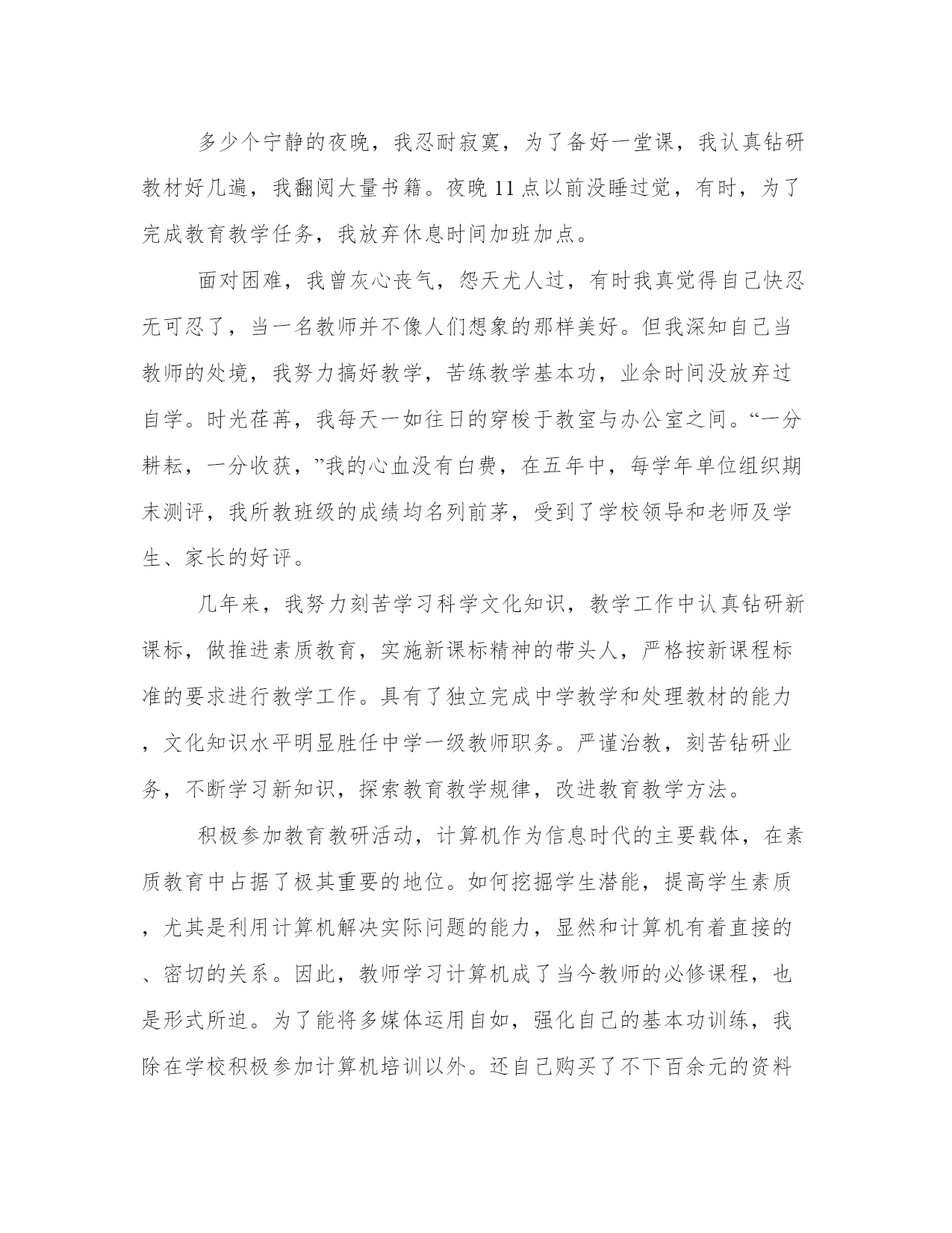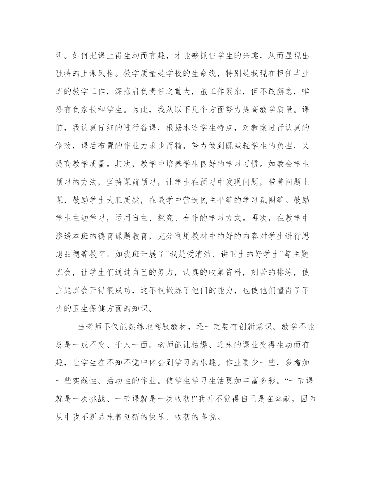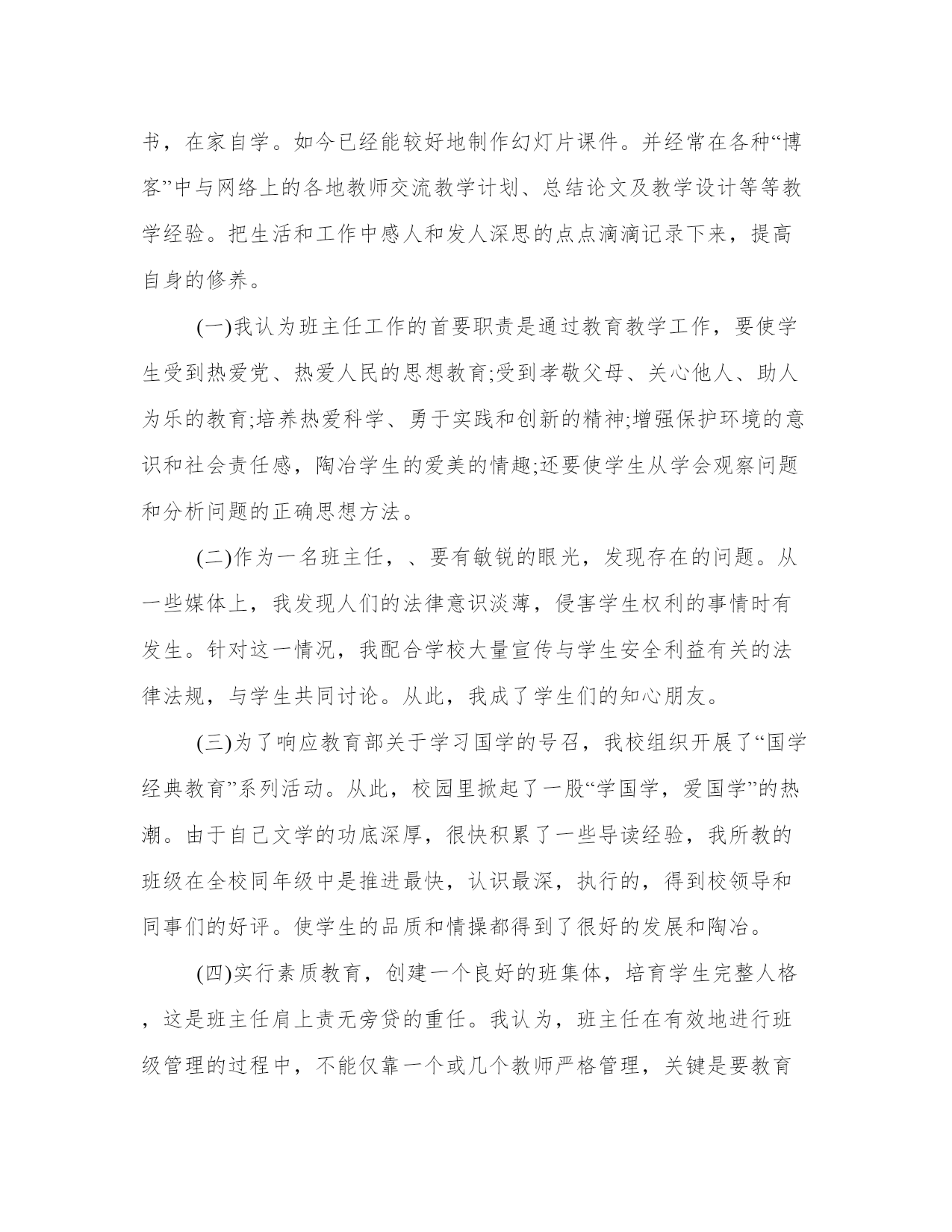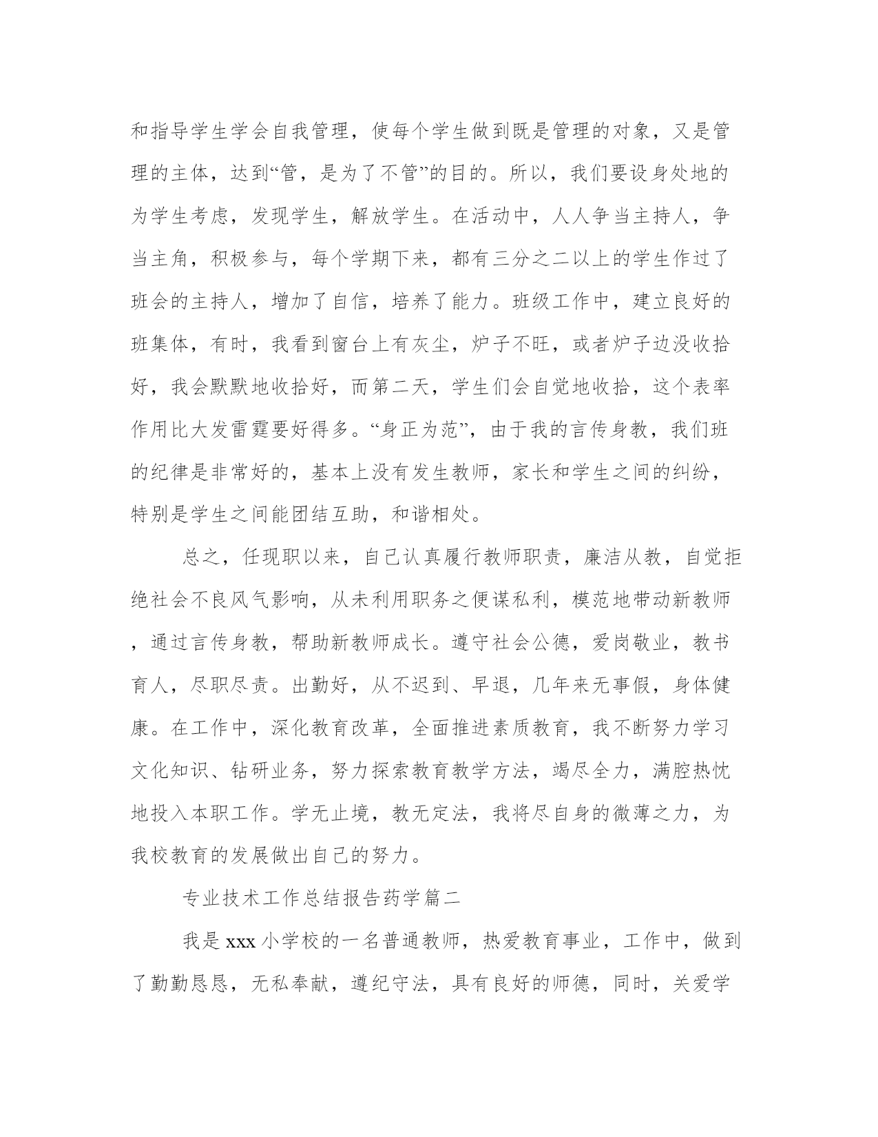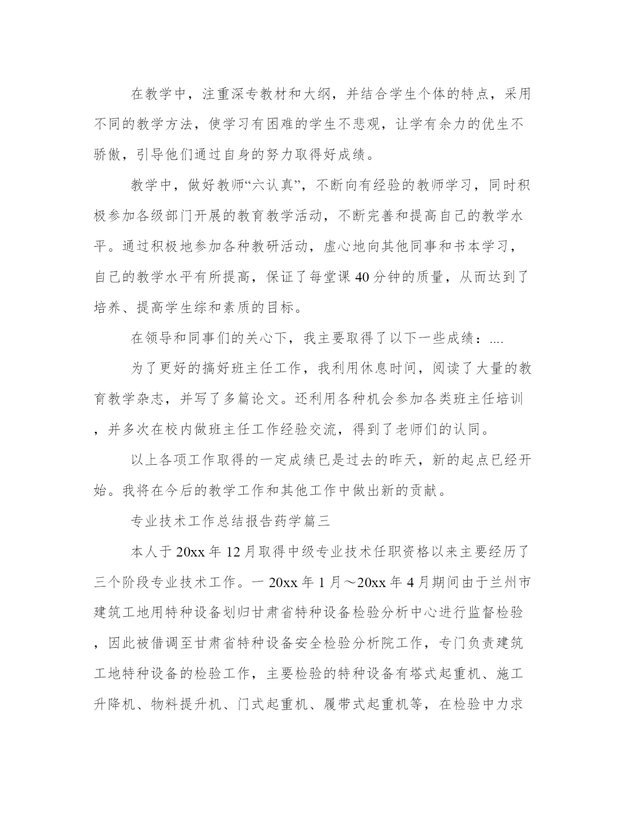 2024年专业技术工作总结报告药学(4篇)“报告”使用范围很广,按照上级部署或工作计划,每完成一项任务,一般都要向上级写报告,反映工作中的基本情况、工作中取得的经验教训、存在的问题以及今后工作设想等,以取得上级领导部门的指导。大家想知道怎么样才能写一篇比较优质的报告吗?下面我就给大家讲一讲优秀的报告文章怎么写,我们一起来了解一下吧。专业技术工作总结报告药学篇一我积极参加各种学习培训,认真参加政治学习,为了提高自己的思想觉悟,每周认真学习教师职业道德。始终坚持不懈地严格要求自己。全面贯彻党的教育方针,遵守法律法规,恪守教师职业道德规范。热爱教育事业、尽职尽则、教书育人、爱岗敬业、热爱学校、关心集体、团结同志、严于律己、宽以待人、为人师表。我认为教师不能把教书育人降低到只传授知识的层面上。我通过学习不断地在思想上、政治上、文化上充实自己,努力提高自己的从教素质。以无私奉献的精神去感染学生,以渊博的知识去培育学生,以科学的方法去引导学生,以真诚的爱心去温暖学生,以高尚的师德去影响学生,用健全的人格塑造一切学生的美好心灵,真正成为一名优秀的人民教师。把学生教好,让学生成功,是每位教师的心愿、的荣誉。作为一名普通的中学政治教师,最紧迫的任务是具有新的教学理念、刻苦钻研。如何把课上得生动而有趣,才能够抓住学生的兴趣,从而显现出独特的上课风格。教学质量是学校的生命线,特别是我现在担任毕业班的教学工作,深感肩负责任之重大,虽工作繁杂,但不敢懈怠,唯恐有负家长和学生。为此,我从以下几个方面努力提高教学质量。课前,我认真仔细的进行备课,根据本班学生特点,对教案进行认真的修改,课后布置的作业力求少而精,努力做到既减轻学生的负担,又提高教学质量。其次,教学中培养学生良好的学习习惯。如教会学生预习的方法,坚持课前预习,让学生在预习中发现问题,带着问题上课,鼓励学生大胆质疑,在教学中营造民主平等的学习氛围等。鼓励学生主动学习,运用自主、探究、合作的学习方式。再次,在教学中渗透本班的德育课题教育,充分利用教材中的好的内容对学生进行思想品德等教育。如我班开展了“我是爱清洁、讲卫生的好学生”等主题班会,让学生们通过自己的努力,认真的收集资料,刻苦的排练,使主题班会开得很成功,这不仅锻炼了他们的能力,也使他们懂得了不少的卫生保健方面的知识。当老师不仅能熟练地驾驭教材,还一定要有创新意识。教学不能总是一成不变、千人一面。老师能让枯燥、乏味的课业变得生动而有趣,让学生在不知不觉中体会到学习的乐趣。作业要少一些,多增加一些实践性、活动性的作业。使学生学习生活更加丰富多彩。“一节课就是一次挑战、一节课就是一次收获!”我并不觉得自己是在奉献,因为从中我不断品味着创新的快乐、收获的喜悦。多少个宁静的夜晚,我忍耐寂寞,为了备好一堂课,我认真钻研教材好几遍,我翻阅大量书籍。夜晚11点以前没睡过觉,有时,为了完成教育教学任务,我放弃休息时间加班加点。面对困难,我曾灰心丧气,怨天尤人过,有时我真觉得自己快忍无可忍了,当一名教师并不像人们想象的那样美好。但我深知自己当教师的处境,我努力搞好教学,苦练教学基本功,业余时间没放弃过自学。时光荏苒,我每天一如往日的穿梭于教室与办公室之间。“一分耕耘,一分收获,”我的心血没有白费,在五年中,每学年单位组织期末测评,我所教班级的成绩均名列前茅,受到了学校领导和老师及学生、家长的好评。几年来,我努力刻苦学习科学文化知识,教学工作中认真钻研新课标,做推进素质教育,实施新课标精神的带头人,严格按新课程标准的要求进行教学工作。具有了独立完成中学教学和处理教材的能力,文化知识水平明显胜任中学一级教师职务。严谨治教,刻苦钻研业务,不断学习新知识,探索教育教学规律,改进教育教学方法。积极参加教育教研活动,计算机作为信息时代的主要载体,在素质教育中占据了极其重要的地位。如何挖掘学生潜能,提高学生素质,尤其是利用计算机解决实际问题的能力,显然和计算机有着直接的、密切的关系。因此,教师学习计算机成了当今教师的必修课程,也是形式所迫。为了能将多媒体运用自如,强化自己的基本功训练,我除在学校积极参加计算机培训以外。还自己购买了不下百余元的资料书,在家自学。如今已经能较好地制作幻灯片课件。并经常在各种“博客”中与网络上的各地教师交流教学计划、总结论文及教学设计等等教学经验。把生活和工作中感人和发人深思的点点滴滴记录下来,提高自身的修养。(一)我认为班主任工作的首要职责是通过教育教学工作,要使学生受到热爱党、热爱人民的思想教育;受到孝敬父母、关心他人、助人为乐的教育;培养热爱科学、勇于实践和创新的精神;增强保护环境的意识和社会责任感,陶冶学生的爱美的情趣;还要使学生从学会观察问题和分析问题的正确思想方法。(二)作为一名班主任,、要有敏锐的眼光,发