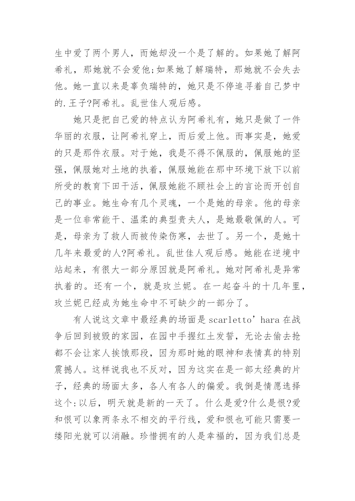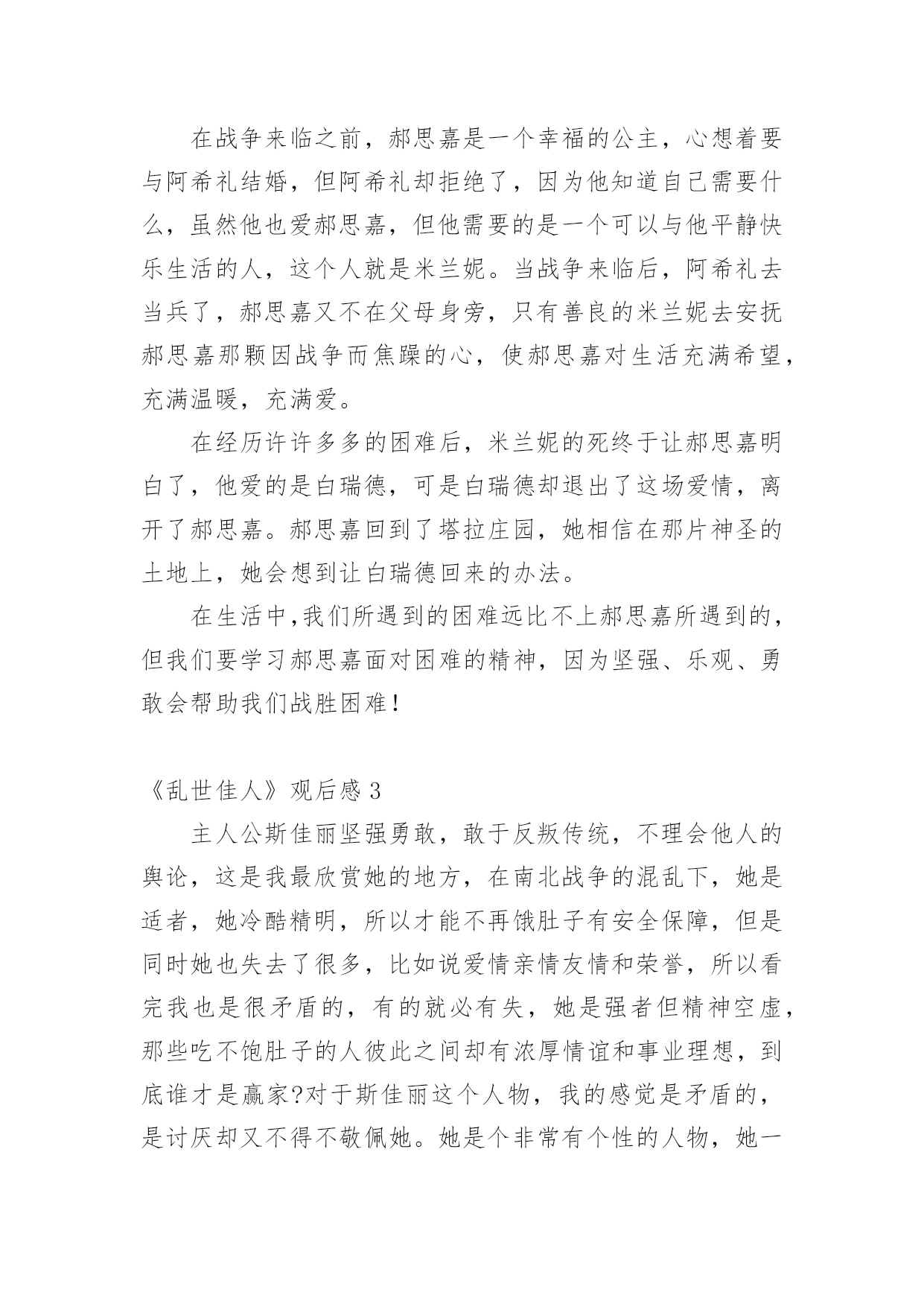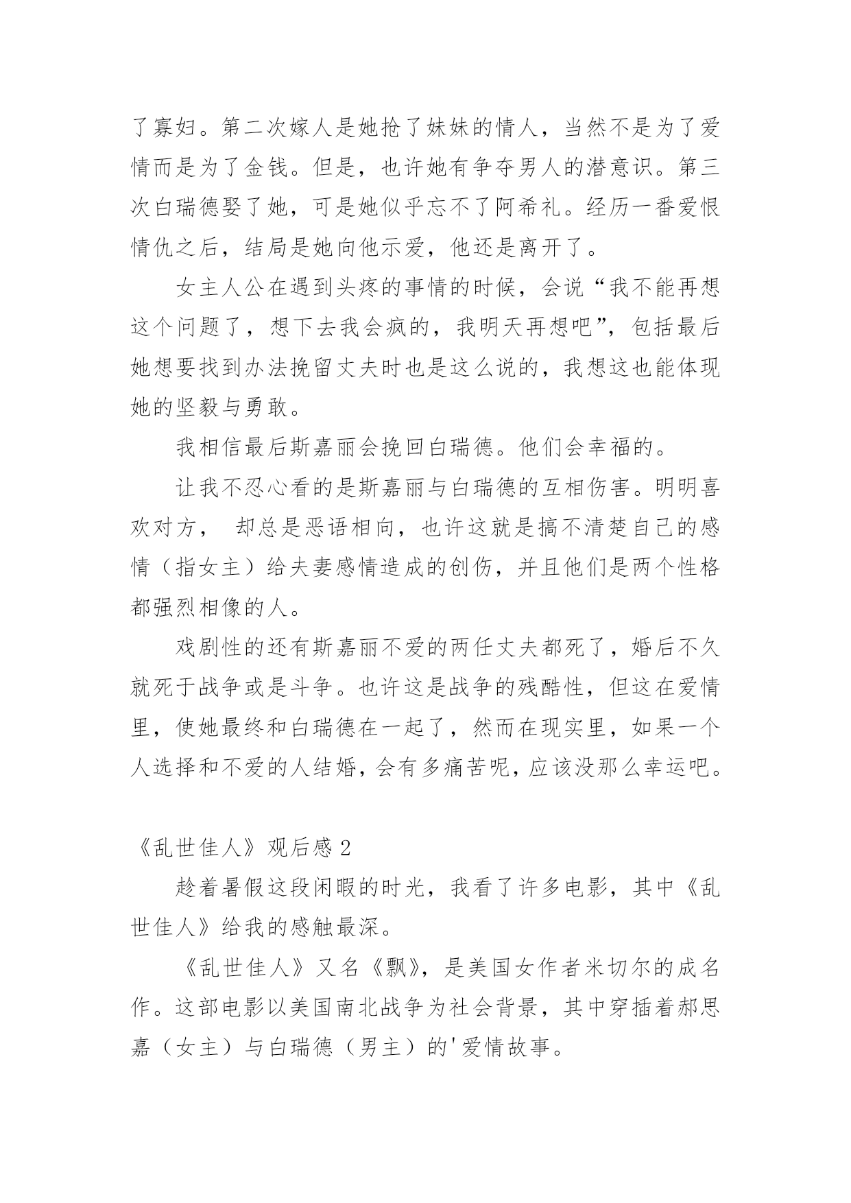 《乱世佳人》观后感《乱世佳人》观后感1大约一年前,我读了美国作家玛格丽特-米切尔的《飘》。现在又把电影看了一遍。电影很长——3小时53分钟,不愧是一部华丽的舞台剧。这部电影情节和原著很符合,而且看着更让人震撼。故事发生的背景是美国南北战争,我也特地去网上搜索了一番。为了更好的看这部电影,我觉得我们需要了解的是以下几点:时间,参战双方以及结果。(美国南北战争时间为1861年4月12日——1865年4月9日;参战双方分别为北方美利坚合众国和南方美利坚联盟国;其结果是北军获胜,废除奴隶制。)电影中女主郝思嘉的情感是一条主线。她美丽高贵又傲慢。想要极力展现她的年轻与美貌。当然她也会因为别人对她的偏见而伤心,最重要的`是她自认为她十分热爱阿希礼,但是表白被拒。我想正如瑞德说的那样,阿希礼和郝思嘉不是同一种人,也许郝思嘉爱着的只是她自己幻想的人,不可否认,阿希礼温文尔雅,有一种忧郁而清新的气质,不同于其他爱慕者,阿希礼暧昧而神秘,但这也反映了在某种程度上,他的空想主义,他害怕面对现实,还总是沉浸在自己的回忆中。郝思嘉第一次嫁人是因为阿希礼结婚,她一气之下嫁给了她的爱慕者之一,可是后来她的丈夫死于南北战争,她成了寡妇。第二次嫁人是她抢了妹妹的情人,当然不是为了爱情而是为了金钱。但是,也许她有争夺男人的潜意识。第三次白瑞德娶了她,可是她似乎忘不了阿希礼。经历一番爱恨情仇之后,结局是她向他示爱,他还是离开了。女主人公在遇到头疼的事情的时候,会说“我不能再想这个问题了,想下去我会疯的,我明天再想吧”,包括最后她想要找到办法挽留丈夫时也是这么说的,我想这也能体现她的坚毅与勇敢。我相信最后斯嘉丽会挽回白瑞德。他们会幸福的。让我不忍心看的是斯嘉丽与白瑞德的互相伤害。明明喜欢对方,却总是恶语相向,也许这就是搞不清楚自己的感情(指女主)给夫妻感情造成的创伤,并且他们是两个性格都强烈相像的人。戏剧性的还有斯嘉丽不爱的两任丈夫都死了,婚后不久就死于战争或是斗争。也许这是战争的残酷性,但这在爱情里,使她最终和白瑞德在一起了,然而在现实里,如果一个人选择和不爱的人结婚,会有多痛苦呢,应该没那么幸运吧。《乱世佳人》观后感2趁着暑假这段闲暇的时光,我看了许多电影,其中《乱世佳人》给我的感触最深。《乱世佳人》又名《飘》,是美国女作者米切尔的成名作。这部电影以美国南北战争为社会背景,其中穿插着郝思嘉(女主)与白瑞德(男主)的'爱情故事。在战争来临之前,郝思嘉是一个幸福的公主,心想着要与阿希礼结婚,但阿希礼却拒绝了,因为他知道自己需要什么,虽然他也爱郝思嘉,但他需要的是一个可以与他平静快乐生活的人,这个人就是米兰妮。当战争来临后,阿希礼去当兵了,郝思嘉又不在父母身旁,只有善良的米兰妮去安抚郝思嘉那颗因战争而焦躁的心,使郝思嘉对生活充满希望,充满温暖,充满爱。在经历许许多多的困难后,米兰妮的死终于让郝思嘉明白了,他爱的是白瑞德,可是白瑞德却退出了这场爱情,离开了郝思嘉。郝思嘉回到了塔拉庄园,她相信在那片神圣的土地上,她会想到让白瑞德回来的办法。在生活中,我们所遇到的困难远比不上郝思嘉所遇到的,但我们要学习郝思嘉面对困难的精神,因为坚强、乐观、勇敢会帮助我们战胜困难!《乱世佳人》观后感3主人公斯佳丽坚强勇敢,敢于反叛传统,不理会他人的舆论,这是我最欣赏她的地方,在南北战争的混乱下,她是适者,她冷酷精明,所以才能不再饿肚子有安全保障,但是同时她也失去了很多,比如说爱情亲情友情和荣誉,所以看完我也是很矛盾的,有的就必有失,她是强者但精神空虚,那些吃不饱肚子的人彼此之间却有浓厚情谊和事业理想,到底谁才是赢家?对于斯佳丽这个人物,我的感觉是矛盾的,是讨厌却又不得不敬佩她。她是个非常有个性的人物,她一生中爱了两个男人,而她却没一个是了解的。如果她了解阿希礼,那她就不会爱他;如果她了解瑞特,那她就不会失去他。她一直以来是辜负瑞特的,她只是不停追寻着自己梦中的.王子?阿希礼。乱世佳人观后感。她只是把自己爱的特点认为阿希礼有,她只是做了一件华丽的衣服,让阿希礼穿上,而后爱上他。而事实是,她爱的只是那件衣服。对于她,我是不得不佩服的,佩服她的坚强,佩服她对土地的执着,佩服她能在那中环境下放下以前所受的教育下田干活,佩服她能不顾社会上的言论而开创自己的事业。她生命有几个灵魂,一个是她的母亲。他的母亲是一位非常能干、温柔的典型贵夫人,是她最敬佩的人。可是,母亲为了救人而被传染伤寒,去世了。另一个,是她十几年来最爱的人?阿希礼。乱世佳人观后感。她能在逆境中站起来,有很大一部分原因就是阿希礼。她对阿希礼是异常执着的。还有一个,就是玫兰妮。在一起奋斗的十几年里,玫兰妮已经成为她生命中不可缺少的一部分了。有人说这文章中最经典的场面是scarletto’hara在战争后回到被毁的家园,在园中手握红土发誓,