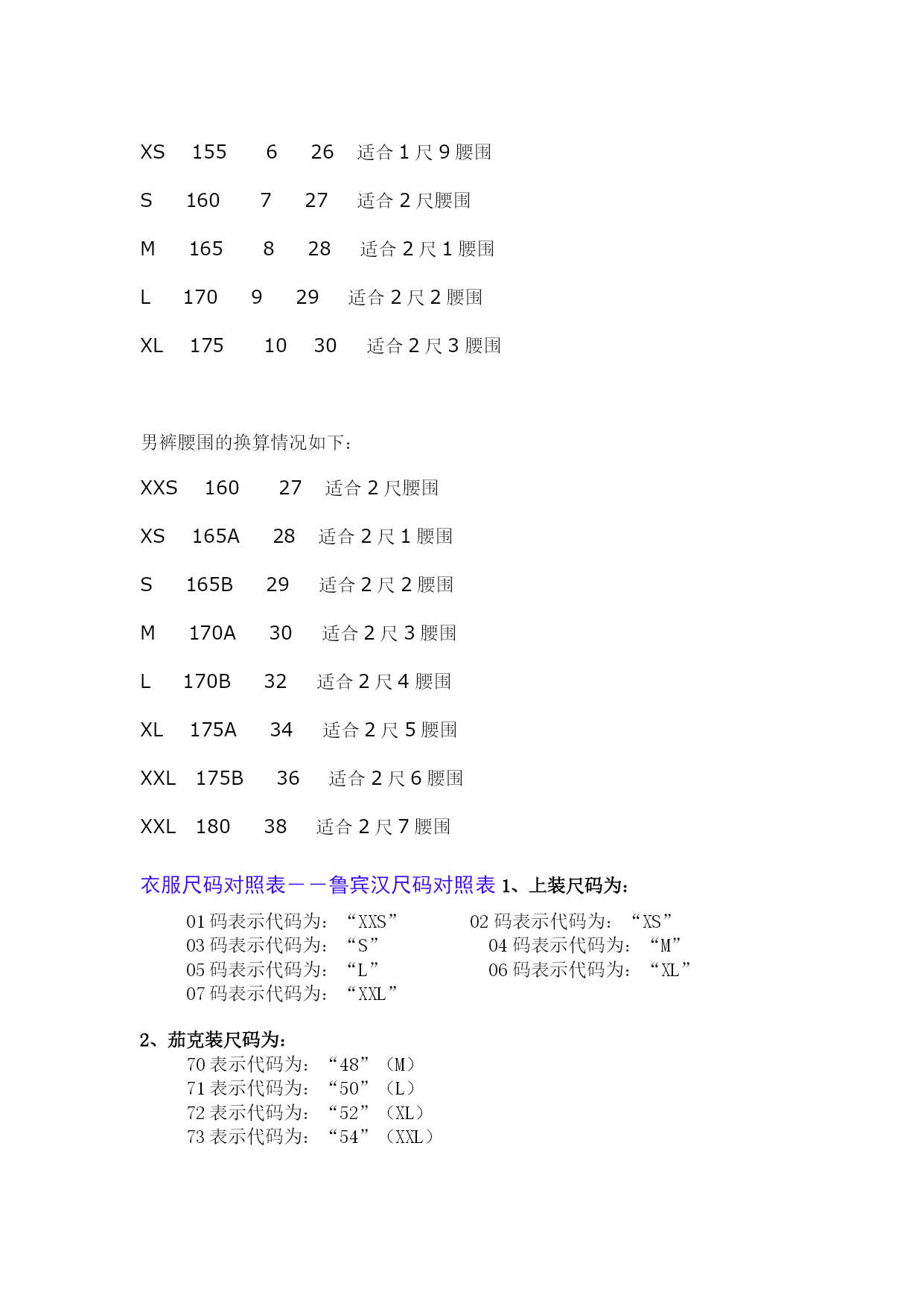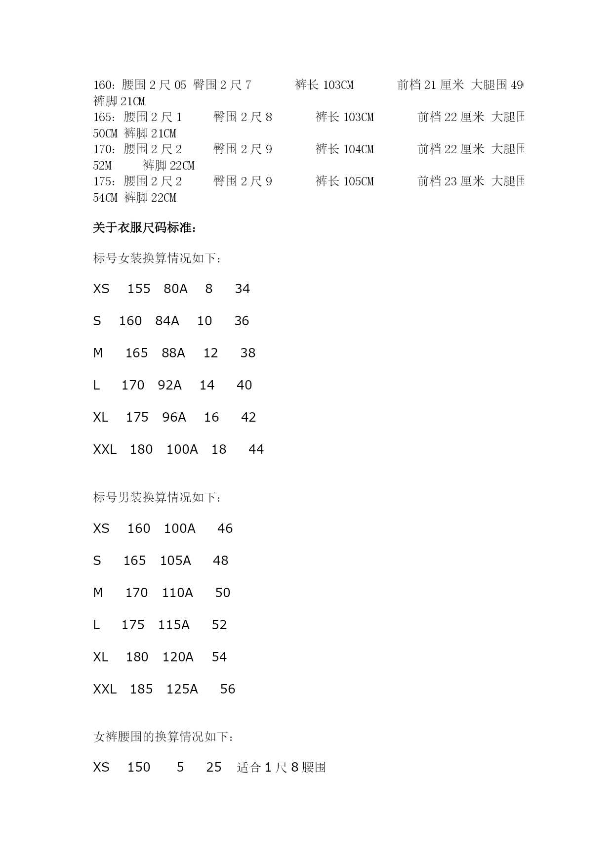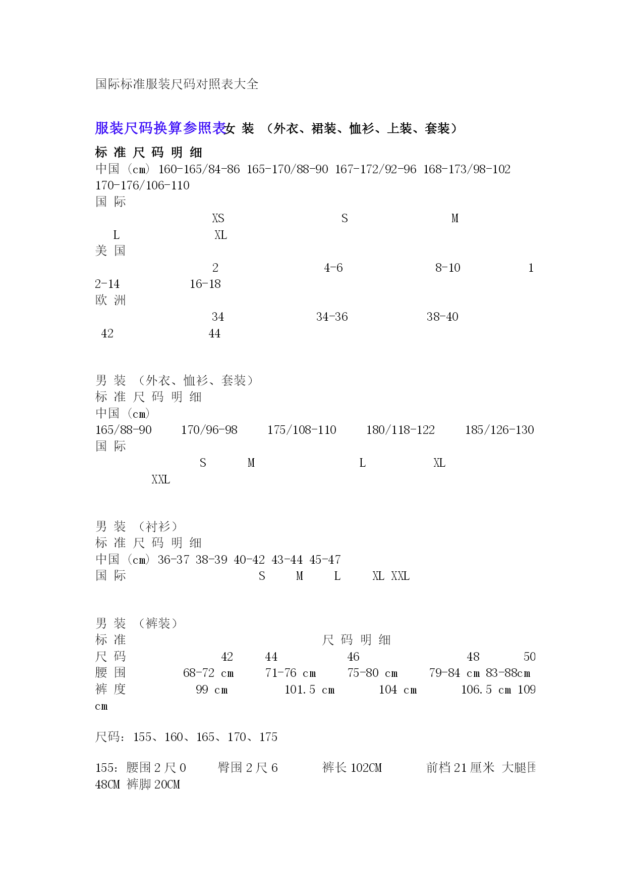国际标准服装尺码对照表大全优质资料(可以直接使用,可编辑优质资料,欢迎下载)国际标准服装尺码对照表大全服装尺码换算参照表女装(外衣、裙装、恤衫、上装、套装)标准尺码明细中国(cm)160-165/84-86165-170/88-90167-172/92-96168-173/98-102170-176/106-110国际XSSMLXL美国24-68-1012-1416-18欧洲3434-3638-404244男装(外衣、恤衫、套装)标准尺码明细中国(cm)165/88-90170/96-98175/108-110180/118-122185/126-130国际SMLXLXXL男装(衬衫)标准尺码明细中国(cm)36-3738-3940-4243-4445-47国际SMLXLXXL男装(裤装)标准尺码明细尺码4244464850腰围68-72cm71-76cm75-80cm79-84cm83-88cm裤度99cm101.5cm104cm106.5cm109cm尺码:155、160、165、170、175155:腰围2尺0臀围2尺6裤长102CM前档21厘米大腿围48CM裤脚20CM160:腰围2尺05臀围2尺7裤长103CM前档21厘米大腿围49CM裤脚21CM165:腰围2尺1臀围2尺8裤长103CM前档22厘米大腿围50CM裤脚21CM170:腰围2尺2臀围2尺9裤长104CM前档22厘米大腿围52M裤脚22CM175:腰围2尺2臀围2尺9裤长105CM前档23厘米大腿围54CM裤脚22CM关于衣服尺码标准:标号女装换算情况如下:XS15580A834S16084A1036M16588A1238L17092A1440XL17596A1642XXL180100A1844标号男装换算情况如下:XS160100A46S165105A48M170110A50L175115A52XL180120A54XXL185125A56女裤腰围的换算情况如下:XS150525适合1尺8腰围XS155626适合1尺9腰围S160727适合2尺腰围M165828适合2尺1腰围L170929适合2尺2腰围XL1751030适合2尺3腰围男裤腰围的换算情况如下:XXS16027适合2尺腰围XS165A28适合2尺1腰围S165B29适合2尺2腰围M170A30适合2尺3腰围L170B32适合2尺4腰围XL175A34适合2尺5腰围XXL175B36适合2尺6腰围XXL18038适合2尺7腰围衣服尺码对照表--鲁宾汉尺码对照表1、上装尺码为:01码表示代码为:“XXS”02码表示代码为:“XS”03码表示代码为:“S”04码表示代码为:“M”05码表示代码为:“L”06码表示代码为:“XL”07码表示代码为:“XXL”2、茄克装尺码为:70表示代码为:“48”(M)71表示代码为:“50”(L)72表示代码为:“52”(XL)73表示代码为:“54”(XXL)3、裤装尺码为:26代表腰围为:“1.9尺”27代表腰围为:“2.0尺”28代表腰围为:“2.1尺”29代表腰围为:“2.2尺”30代表腰围为:“2.3尺”31代表腰围为:“2.4尺”32代表腰围为:“2.5尺”33代表腰围为:“2.6尺”34代表腰围为:“2.7尺”36代表腰围为:“2.8尺”38代表腰围为:“2.9尺”40代表腰围为:“3.0尺”42代表腰围为:“3.1尺”44代表腰围为:“3.2尺”50代表腰围为:“3.4尺”52代表腰围为:“3.5尺”54代表腰围为:“3.6尺”4、西服装尺码为:80表示代码为:“145”81表示代码为:“150”82表示代码为:“155”83表示代码为:“160”84表示代码为:“165”85表示代码为:“170”86表示代码为:“175”87表示代码为:“180”88表示代码为:“185”5、衬衣装尺码为:60表示代码为:“38”61表示代码为:“39”62表示代码为:“40”63表示代码为:“41”64表示代码为:“42”65表示代码为:“43”66表示代码为:“44”67表示代码为:“45”68表示代码为:“46”怎样识别服装的“号”和“型”全国服装的统一号型所说的“号”,是指人身高的厘米数,它影响到的部位是衣长、袖长、裤长;所说的“型”,指的是人的体围厘米数,它影响的部位是腰围、臀围。一个人只能使用同一个“号”,而不能使用同一个“型”,因为上衣和裤子的“型”必须分开使用。例如你身高170厘米,基本胸围为88厘米,基本腰围为73厘米,那么就适合穿170-88号的上衣,170-73型的裤子。怎样识别国家统一服装号型从1992年4月1日起,全国开始实施统一的GB1335-1991《服装号型》国家标准它是由纺织工业部制定、