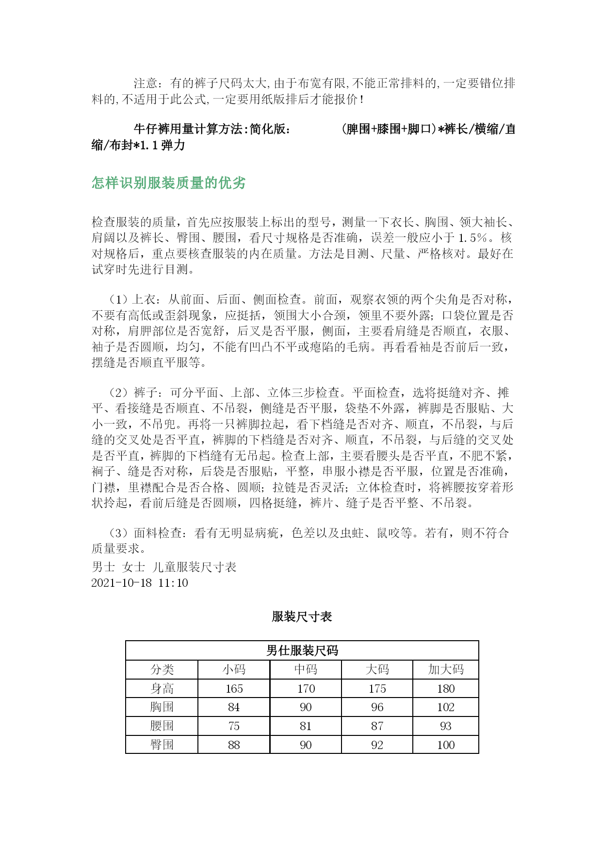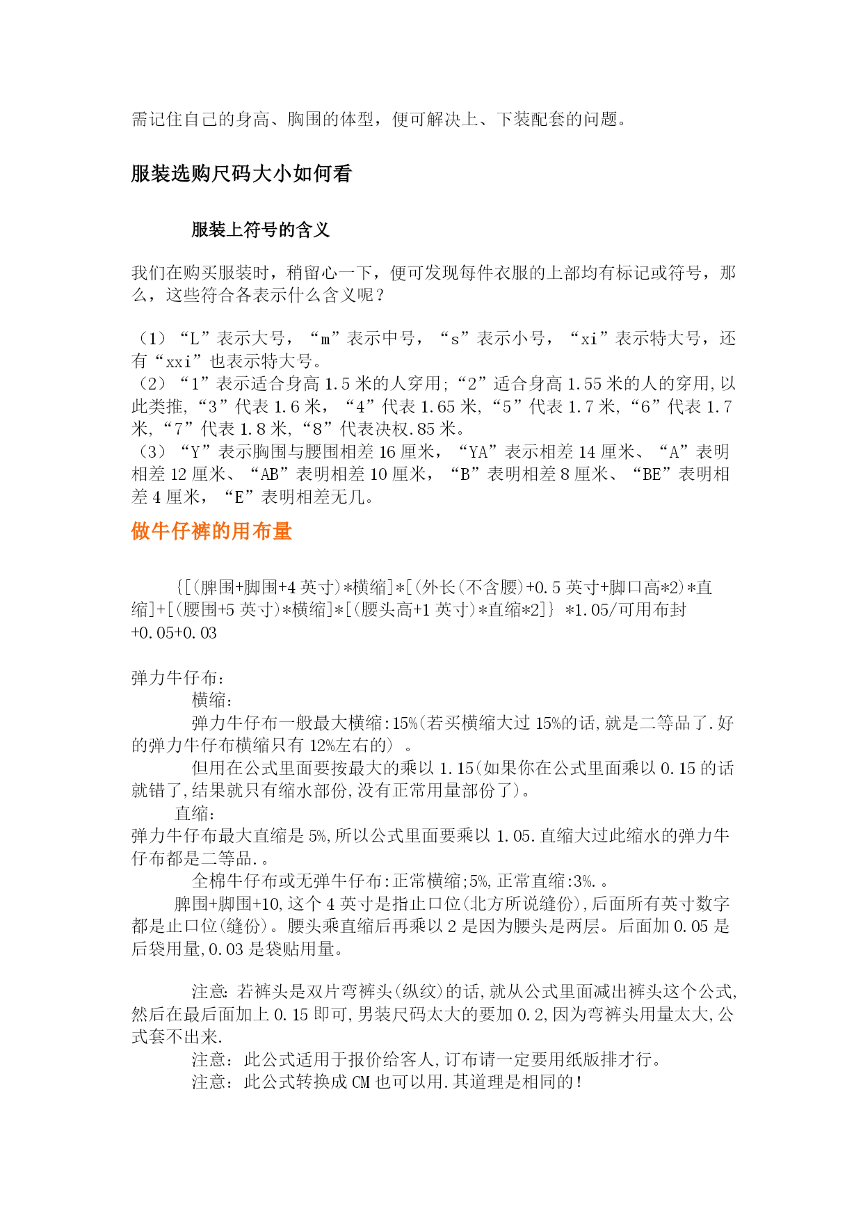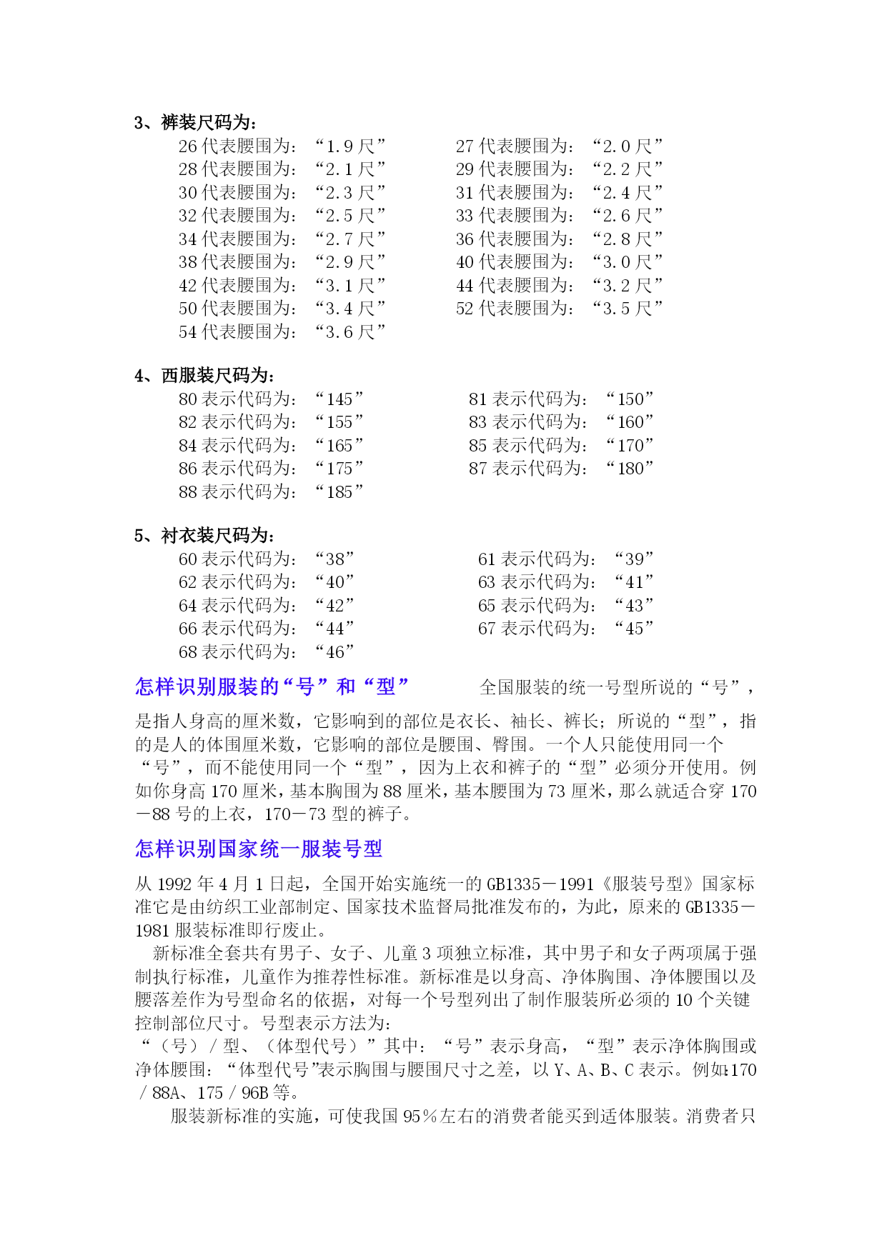 国际标准服装尺码对照表大全优质资料(可以直接使用,可编辑优质资料,欢迎下载)国际标准服装尺码对照表大全服装尺码换算参照表女装(外衣、裙装、恤衫、上装、套装)标准尺码明细中国(cm)160-165/84-86165-170/88-90167-172/92-96168-173/98-102170-176/106-110国际XSSMLXL美国24-68-1012-1416-18欧洲3434-3638-404244男装(外衣、恤衫、套装)标准尺码明细中国(cm)165/88-90170/96-98175/108-110180/118-122185/126-130国际SMLXLXXL男装(衬衫)标准尺码明细中国(cm)36-3738-3940-4243-4445-47国际SMLXLXXL男装(裤装)标准尺码明细尺码4244464850腰围68-72cm71-76cm75-80cm79-84cm83-88cm裤度99cm101.5cm104cm106.5cm109cm尺码:155、160、165、170、175155:腰围2尺0臀围2尺6裤长102CM前档21厘米大腿围48CM裤脚20CM160:腰围2尺05臀围2尺7裤长103CM前档21厘米大腿围49CM裤脚21CM165:腰围2尺1臀围2尺8裤长103CM前档22厘米大腿围50CM裤脚21CM170:腰围2尺2臀围2尺9裤长104CM前档22厘米大腿围52M裤脚22CM175:腰围2尺2臀围2尺9裤长105CM前档23厘米大腿围54CM裤脚22CM关于衣服尺码标准:标号女装换算情况如下:XS15580A834S16084A1036M16588A1238L17092A1440XL17596A1642XXL180100A1844标号男装换算情况如下:XS160100A46S165105A48M170110A50L175115A52XL180120A54XXL185125A56女裤腰围的换算情况如下:XS150525适合1尺8腰围XS155626适合1尺9腰围S160727适合2尺腰围M165828适合2尺1腰围L170929适合2尺2腰围XL1751030适合2尺3腰围男裤腰围的换算情况如下:XXS16027适合2尺腰围XS165A28适合2尺1腰围S165B29适合2尺2腰围M170A30适合2尺3腰围L170B32适合2尺4腰围XL175A34适合2尺5腰围XXL175B36适合2尺6腰围XXL18038适合2尺7腰围衣服尺码对照表--鲁宾汉尺码对照表1、上装尺码为:01码表示代码为:“XXS”02码表示代码为:“XS”03码表示代码为:“S”04码表示代码为:“M”05码表示代码为:“L”06码表示代码为:“XL”07码表示代码为:“XXL”2、茄克装尺码为:70表示代码为:“48”(M)71表示代码为:“50”(L)72表示代码为:“52”(XL)73表示代码为:“54”(XXL)3、裤装尺码为:26代表腰围为:“1.9尺”27代表腰围为:“2.0尺”28代表腰围为:“2.1尺”29代表腰围为:“2.2尺”30代表腰围为:“2.3尺”31代表腰围为:“2.4尺”32代表腰围为:“2.5尺”33代表腰围为:“2.6尺”34代表腰围为:“2.7尺”36代表腰围为:“2.8尺”38代表腰围为:“2.9尺”40代表腰围为:“3.0尺”42代表腰围为:“3.1尺”44代表腰围为:“3.2尺”50代表腰围为:“3.4尺”52代表腰围为:“3.5尺”54代表腰围为:“3.6尺”4、西服装尺码为:80表示代码为:“145”81表示代码为:“150”82表示代码为:“155”83表示代码为:“160”84表示代码为:“165”85表示代码为:“170”86表示代码为:“175”87表示代码为:“180”88表示代码为:“185”5、衬衣装尺码为:60表示代码为:“38”61表示代码为:“39”62表示代码为:“40”63表示代码为:“41”64表示代码为:“42”65表示代码为:“43”66表示代码为:“44”67表示代码为:“45”68表示代码为:“46”怎样识别服装的“号”和“型”全国服装的统一号型所说的“号”,是指人身高的厘米数,它影响到的部位是衣长、袖长、裤长;所说的“型”,指的是人的体围厘米数,它影响的部位是腰围、臀围。一个人只能使用同一个“号”,而不能使用同一个“型”,因为上衣和裤子的“型”必须分开使用。例如你身高170厘米,基本胸围为88厘米,基本腰围为73厘米,那么就适合穿170-88号的上衣,170-73型的裤子。怎样识别国家统一服装号型从1992年4月1日起,全国开始实施统一的GB1335-1991《服装号型》国家标准它是由纺织工业部制定、