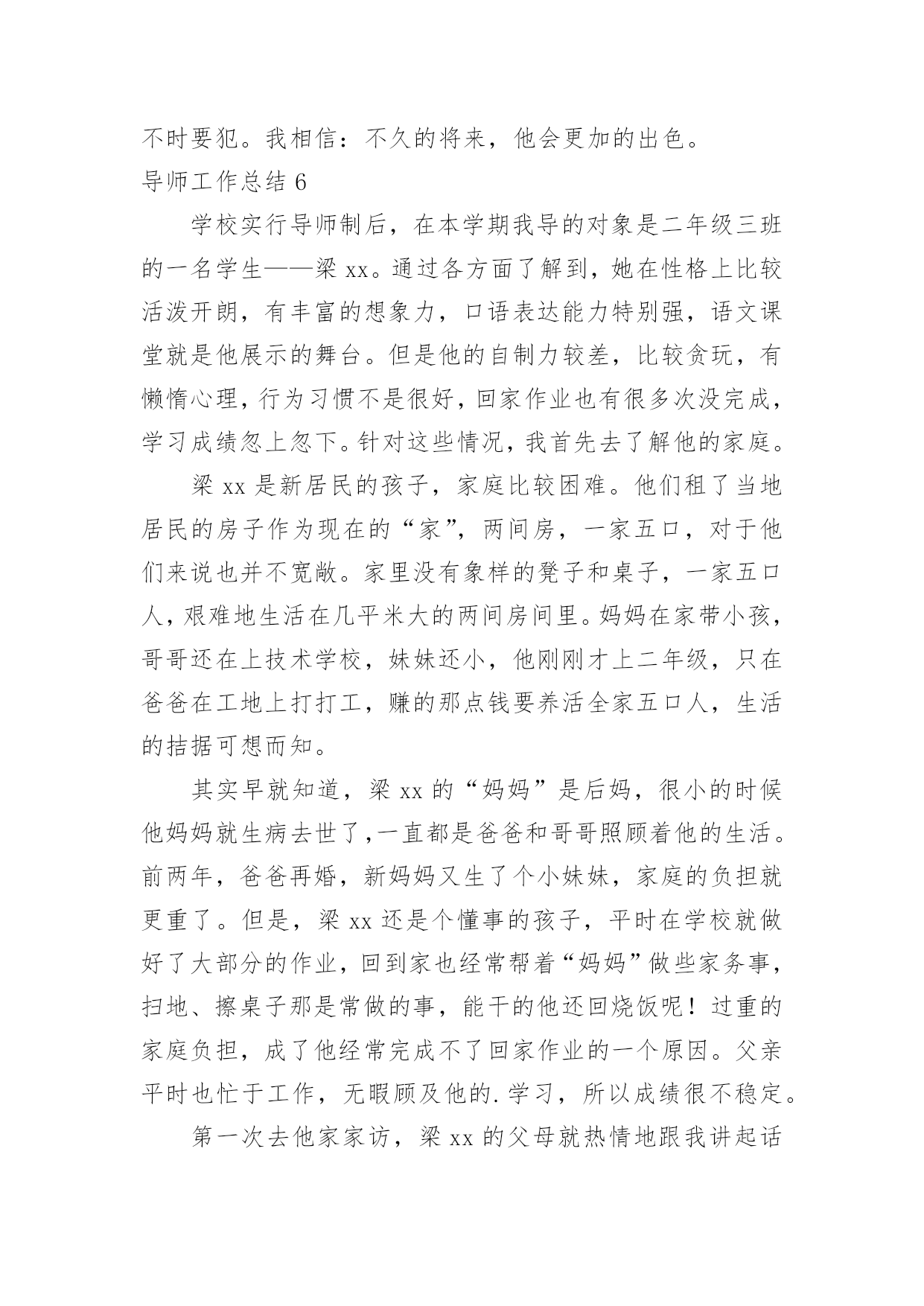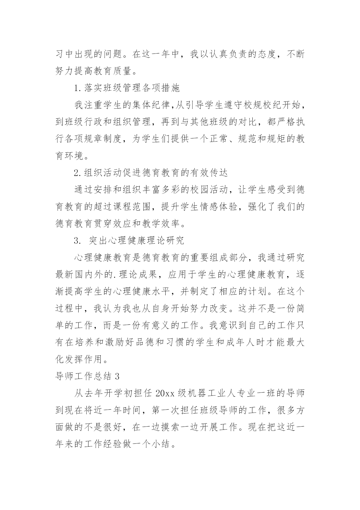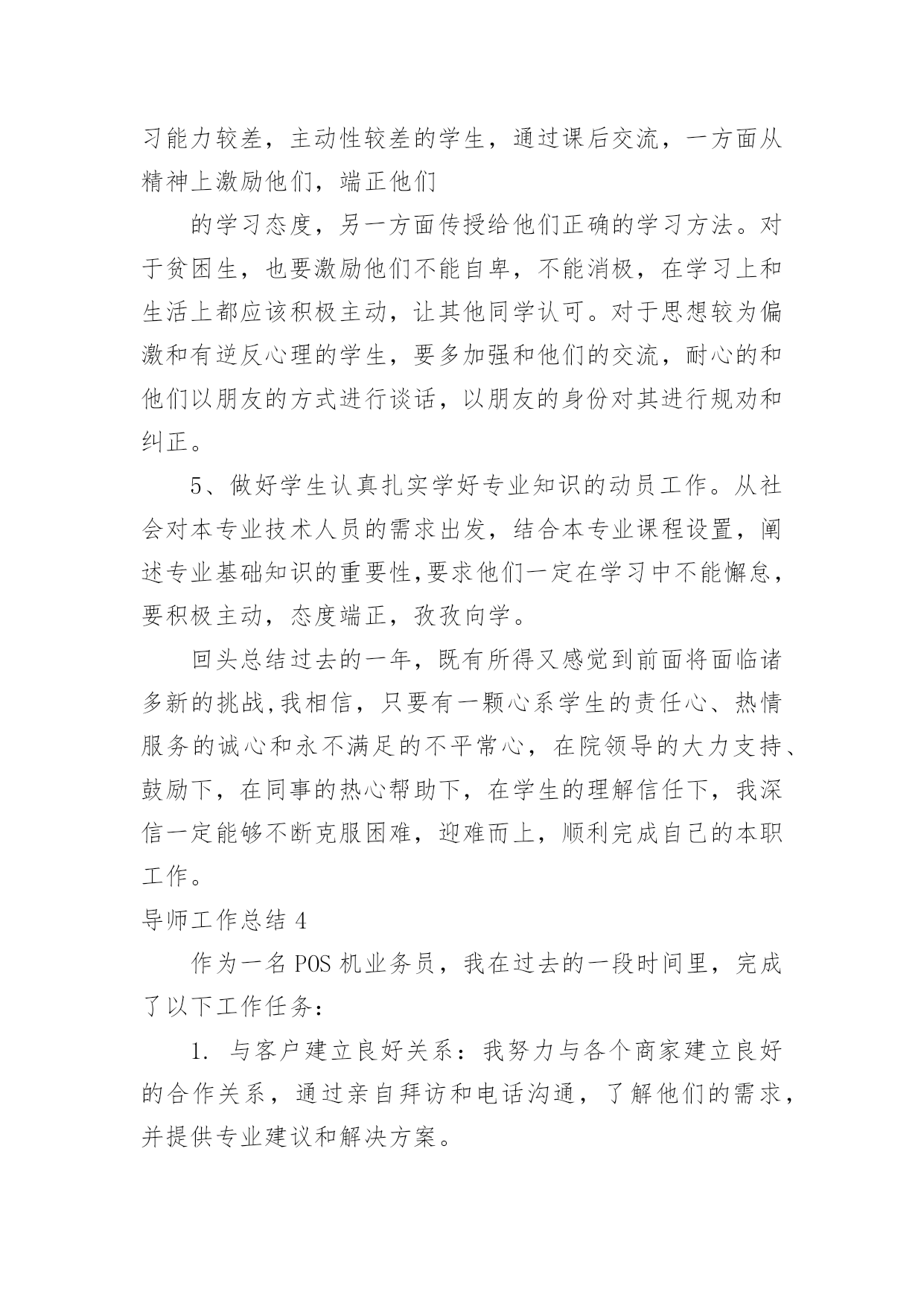 导师工作总结导师工作总结【热】总结是把一定阶段内的有关情况分析研究,做出有指导性的经验方法以及结论的书面材料,通过它可以正确认识以往学习和工作中的优缺点,为此我们要做好回顾,写好总结。那么总结有什么格式呢?以下是小编收集整理的导师工作总结,欢迎大家分享。导师工作总结1我作为导师,致力于为我的学生提供优质的教育和指导。我积极组织学术活动,帮助学生提高研究能力,同时关注他们的个人成长。我鼓励他们独立思考,培养他们的创新精神。我也与他们保持定期的沟通,及时解决他们在学习和生活中遇到的问题。在未来的一年里,我将继续努力,为我的学生提供更深入的.指导和支持。我将关注他们的研究进展,提供必要的帮助和指导。同时,我也将注重培养他们的团队协作能力和领导力,以帮助他们更好地适应未来的学术和职业生涯。总的来说,我认为我在过去的一年里做得很好,但还有很多需要改进和提高的地方。导师工作总结2我的德育导师工作总体上是一项“引路”的工作,即为学生提供道德规范与价值观典范,同时解决学生在生活和学习中出现的问题。在这一年中,我以认真负责的态度,不断努力提高教育质量。1.落实班级管理各项措施我注重学生的集体纪律,从引导学生遵守校规校纪开始,到班级行政和组织管理,再到与其他班级的对比,都严格执行各项规章制度,为学生们提供一个正常、规范和规矩的教育环境。2.组织活动促进德育教育的有效传达通过安排和组织丰富多彩的校园活动,让学生感受到德育教育的超过课程范围,提升学生情感体验,强化了我们的德育教育贯穿效应和教学效率。3.突出心理健康理论研究心理健康教育是德育教育的重要组成部分,我通过研究最新国内外的.理论成果,应用于学生的心理健康教育,逐渐提高学生的心理健康水平,并制定了相应的计划。在这个过程中,我认为我也从自身开始努力改变。这并不是一份简单的工作,而是一份有意义的工作。我意识到自己的工作只有在培养和激励好品德和习惯的学生和成年人时才能最大化发挥作用。导师工作总结3从去年开学初担任20xx级机器工业人专业一班的导师到现在将近一年时间,第一次担任班级导师的工作,很多方面做的不是很好,在一边摸索一边开展工作。现在把这近一年来的工作经验做一个小结。一、坚持学习,善于总结,加强自身内涵修养建设。班导师工作它所面对的对象在心理、学习基础,兴趣爱好、个性等方面大相径庭,因此,不断学习了解学生思政工作新的工作理念和方法技巧对于做好辅导员工作尤其显得重要。同时,对以前工作中出现的一些比较好的工作方法加以梳理总结,另外对工作中出现的一些共性与个性的特殊问题做好台帐,对工作的效果进行跟踪动态观察,不断思考与改进自己的工作方法,形成以后对特殊问题处理的工作思路。二、重视日常管理,坚持做好常规工作,确保学生安全有序。学生的日常管理工作占据了整个学生工作一半的时间和精力,体现了它在学生工作中的`重要。1、进一步加强和完善与学生的信息沟通。及时了解其学生手机号码的变更情况,确保每一条与学生相关的信息都能够及时准确的让每一位学生收到,经常与学生在微信QQ上沟通交流。同时,坚持每月深入到学生当中去了解学生对信息渠道的意见、看法和信息沟通的效果,及时做出调整和改进。2、把学生宿舍作为思想教育的主要阵地。坚持下宿舍和学生进行面对面沟通交流,消除学生对老师的戒心,建立良好的信任关系,便于今后各个方面工作的开展。3、坚持要求学生无论在上哪一门课时都做到不迟到不早退不旷课,同时,严格请假制度,必须出示假条辅导员签字同意才能离校。4、重视特定学生的教育管理和心理辅导工作。对于学习能力较差,主动性较差的学生,通过课后交流,一方面从精神上激励他们,端正他们的学习态度,另一方面传授给他们正确的学习方法。对于贫困生,也要激励他们不能自卑,不能消极,在学习上和生活上都应该积极主动,让其他同学认可。对于思想较为偏激和有逆反心理的学生,要多加强和他们的交流,耐心的和他们以朋友的方式进行谈话,以朋友的身份对其进行规劝和纠正。5、做好学生认真扎实学好专业知识的动员工作。从社会对本专业技术人员的需求出发,结合本专业课程设置,阐述专业基础知识的重要性,要求他们一定在学习中不能懈怠,要积极主动,态度端正,孜孜向学。回头总结过去的一年,既有所得又感觉到前面将面临诸多新的挑战,我相信,只要有一颗心系学生的责任心、热情服务的诚心和永不满足的不平常心,在院领导的大力支持、鼓励下,在同事的热心帮助下,在学生的理解信任下,我深信一定能够不断克服困难,迎难而上,顺利完成自己的本职工作。导师工作总结4作为一名POS机业务员,我在过去的一段时间里,完成了以下工作任务:1.与客户建立良好关系:我努力与各个商家建立良好的合作关系,通过亲自拜访和电话沟通,了解他们的需求,并提供专业建议和解决方案。2.推广POS机服务:我积极参加各种商务活动和展览会,向潜