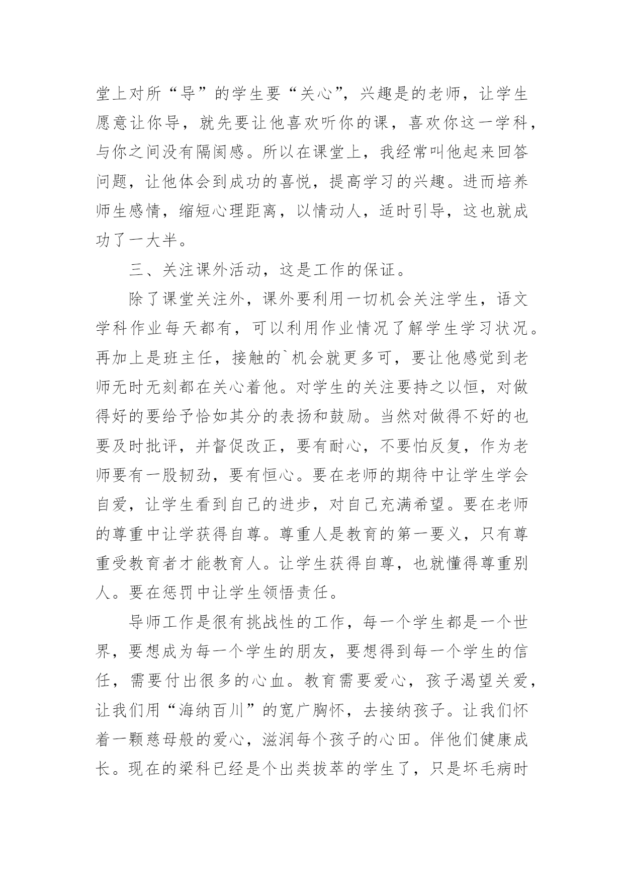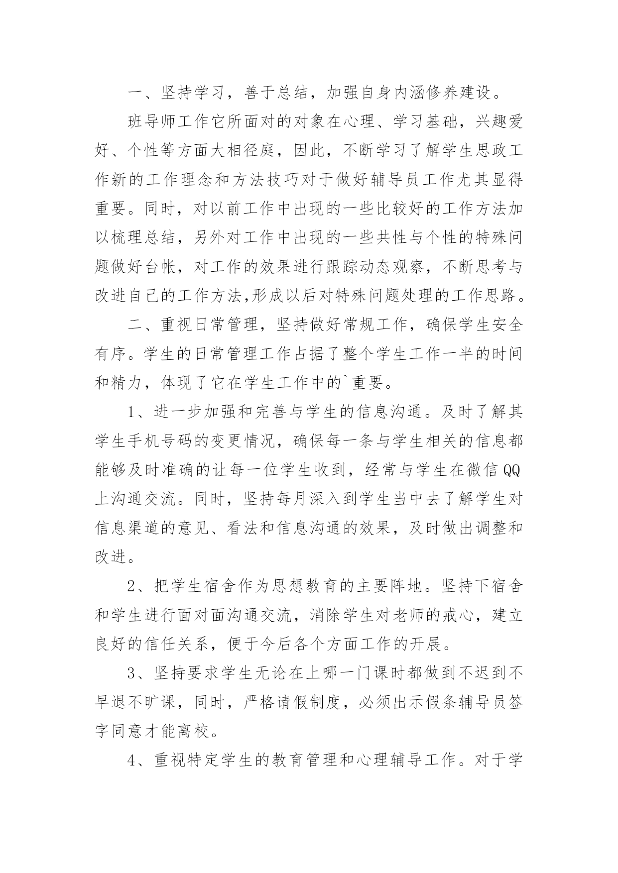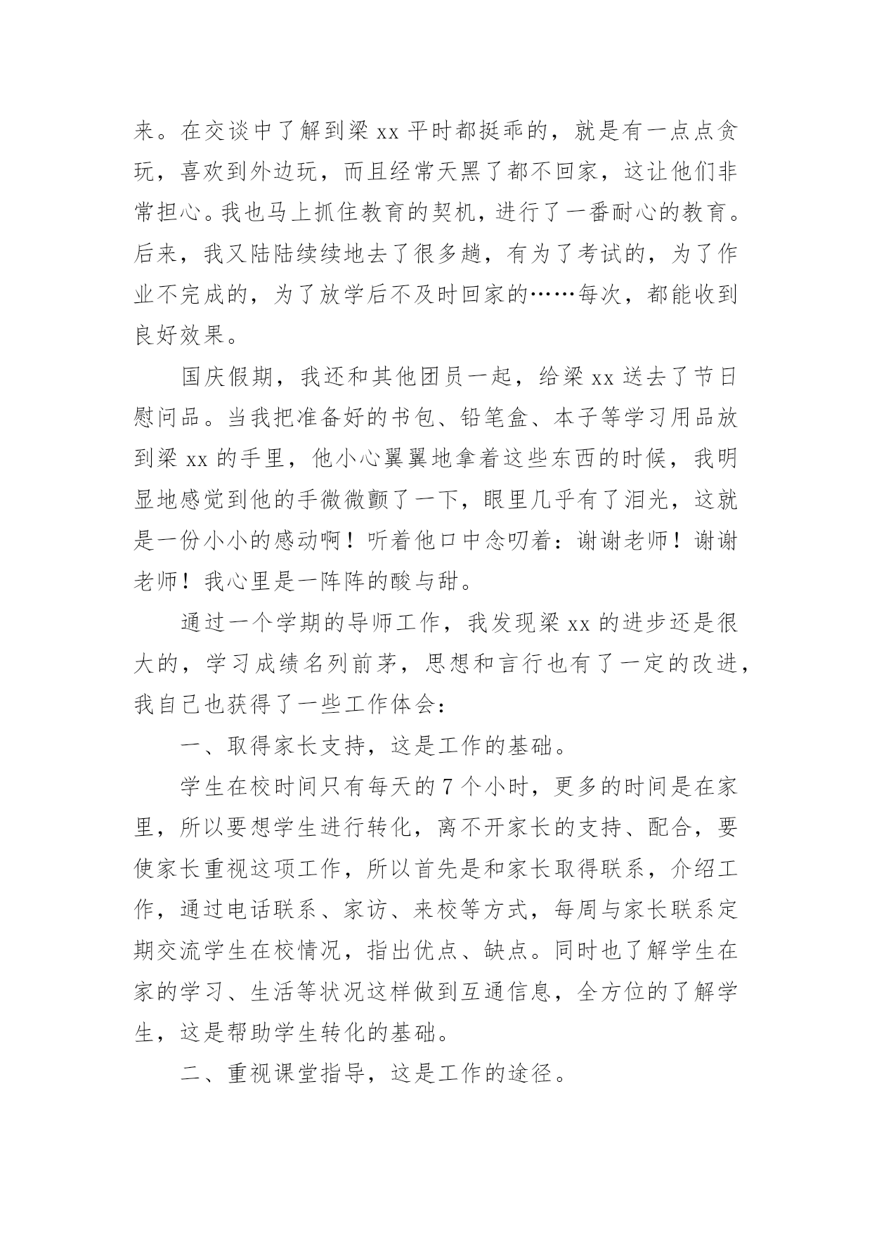 导师工作总结导师工作总结【热】总结是把一定阶段内的有关情况分析研究,做出有指导性的经验方法以及结论的书面材料,通过它可以正确认识以往学习和工作中的优缺点,为此我们要做好回顾,写好总结。那么总结有什么格式呢?以下是小编收集整理的导师工作总结,欢迎大家分享。导师工作总结1我作为导师,致力于为我的学生提供优质的教育和指导。我积极组织学术活动,帮助学生提高研究能力,同时关注他们的个人成长。我鼓励他们独立思考,培养他们的创新精神。我也与他们保持定期的沟通,及时解决他们在学习和生活中遇到的问题。在未来的一年里,我将继续努力,为我的学生提供更深入的.指导和支持。我将关注他们的研究进展,提供必要的帮助和指导。同时,我也将注重培养他们的团队协作能力和领导力,以帮助他们更好地适应未来的学术和职业生涯。总的来说,我认为我在过去的一年里做得很好,但还有很多需要改进和提高的地方。导师工作总结2我的德育导师工作总体上是一项“引路”的工作,即为学生提供道德规范与价值观典范,同时解决学生在生活和学习中出现的问题。在这一年中,我以认真负责的态度,不断努力提高教育质量。1.落实班级管理各项措施我注重学生的集体纪律,从引导学生遵守校规校纪开始,到班级行政和组织管理,再到与其他班级的对比,都严格执行各项规章制度,为学生们提供一个正常、规范和规矩的教育环境。2.组织活动促进德育教育的有效传达通过安排和组织丰富多彩的校园活动,让学生感受到德育教育的超过课程范围,提升学生情感体验,强化了我们的德育教育贯穿效应和教学效率。3.突出心理健康理论研究心理健康教育是德育教育的重要组成部分,我通过研究最新国内外的.理论成果,应用于学生的心理健康教育,逐渐提高学生的心理健康水平,并制定了相应的计划。在这个过程中,我认为我也从自身开始努力改变。这并不是一份简单的工作,而是一份有意义的工作。我意识到自己的工作只有在培养和激励好品德和习惯的学生和成年人时才能最大化发挥作用。导师工作总结3从去年开学初担任20xx级机器工业人专业一班的导师到现在将近一年时间,第一次担任班级导师的工作,很多方面做的不是很好,在一边摸索一边开展工作。现在把这近一年来的工作经验做一个小结。一、坚持学习,善于总结,加强自身内涵修养建设。班导师工作它所面对的对象在心理、学习基础,兴趣爱好、个性等方面大相径庭,因此,不断学习了解学生思政工作新的工作理念和方法技巧对于做好辅导员工作尤其显得重要。同时,对以前工作中出现的一些比较好的工作方法加以梳理总结,另外对工作中出现的一些共性与个性的特殊问题做好台帐,对工作的效果进行跟踪动态观察,不断思考与改进自己的工作方法,形成以后对特殊问题处理的工作思路。二、重视日常管理,坚持做好常规工作,确保学生安全有序。学生的日常管理工作占据了整个学生工作一半的时间和精力,体现了它在学生工作中的`重要。1、进一步加强和完善与学生的信息沟通。及时了解其学生手机号码的变更情况,确保每一条与学生相关的信息都能够及时准确的让每一位学生收到,经常与学生在微信QQ上沟通交流。同时,坚持每月深入到学生当中去了解学生对信息渠道的意见、看法和信息沟通的效果,及时做出调整和改进。2、把学生宿舍作为思想教育的主要阵地。坚持下宿舍和学生进行面对面沟通交流,消除学生对老师的戒心,建立良好的信任关系,便于今后各个方面工作的开展。3、坚持要求学生无论在上哪一门课时都做到不迟到不早退不旷课,同时,严格请假制度,必须出示假条辅导员签字同意才能离校。4、重视特定学生的教育管理和心理辅导工作。对于学习能力较差,主动性较差的学生,通过课后交流,一方面从精神上激励他们,端正他们的学习态度,另一方面传授给他们正确的学习方法。对于贫困生,也要激励他们不能自卑,不能消极,在学习上和生活上都应该积极主动,让其他同学认可。对于思想较为偏激和有逆反心理的学生,要多加强和他们的交流,耐心的和他们以朋友的方式进行谈话,以朋友的身份对其进行规劝和纠正。5、做好学生认真扎实学好专业知识的动员工作。从社会对本专业技术人员的需求出发,结合本专业课程设置,阐述专业基础知识的重要性,要求他们一定在学习中不能懈怠,要积极主动,态度端正,孜孜向学。回头总结过去的一年,既有所得又感觉到前面将面临诸多新的挑战,我相信,只要有一颗心系学生的责任心、热情服务的诚心和永不满足的不平常心,在院领导的大力支持、鼓励下,在同事的热心帮助下,在学生的理解信任下,我深信一定能够不断克服困难,迎难而上,顺利完成自己的本职工作。导师工作总结4作为一名POS机业务员,我在过去的一段时间里,完成了以下工作任务:1.与客户建立良好关系:我努力与各个商家建立良好的合作关系,通过亲自拜访和电话沟通,了解他们的需求,并提供专业建议和解决方案。2.推广POS机服务:我积极参加各种商务活动和展览会,向潜