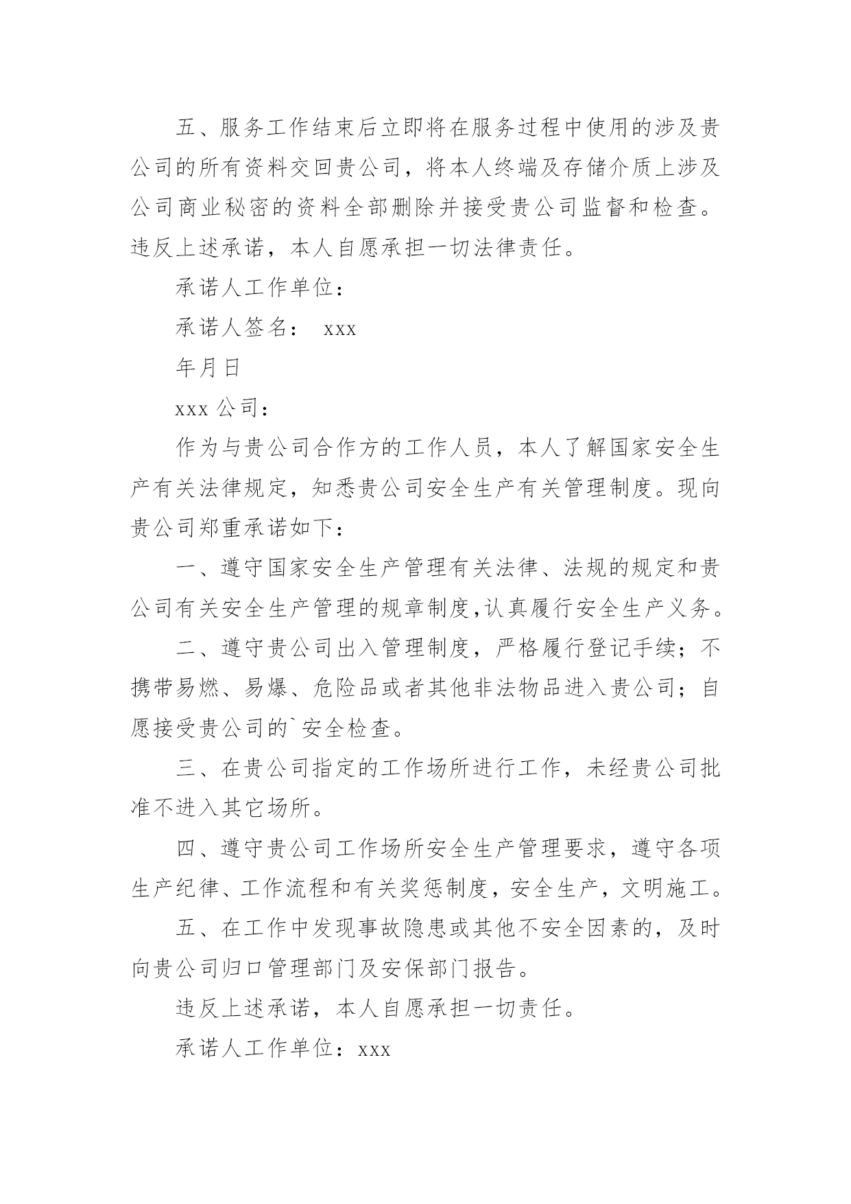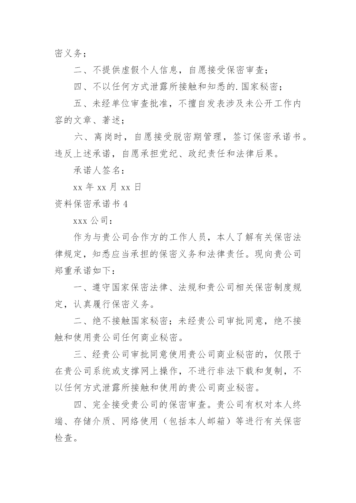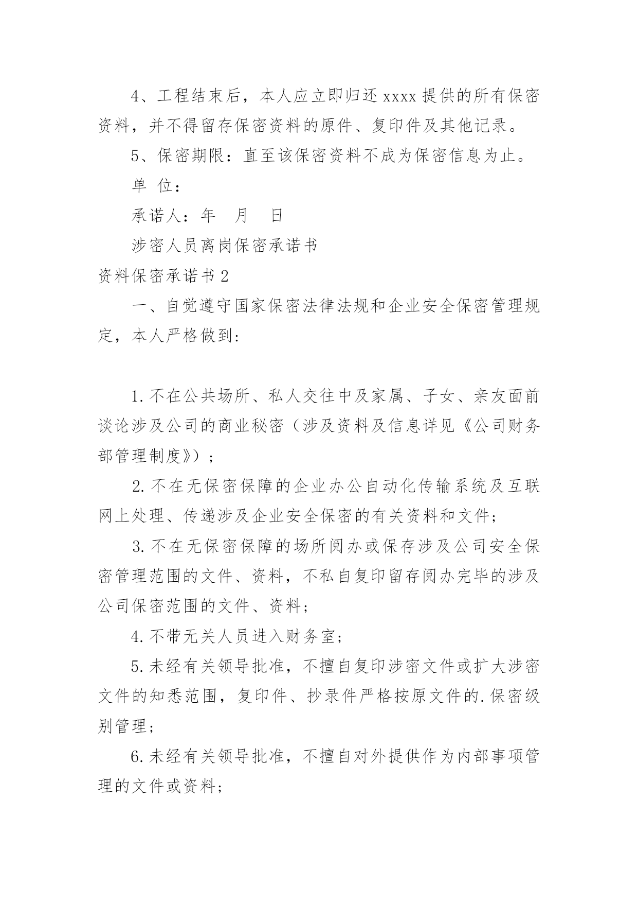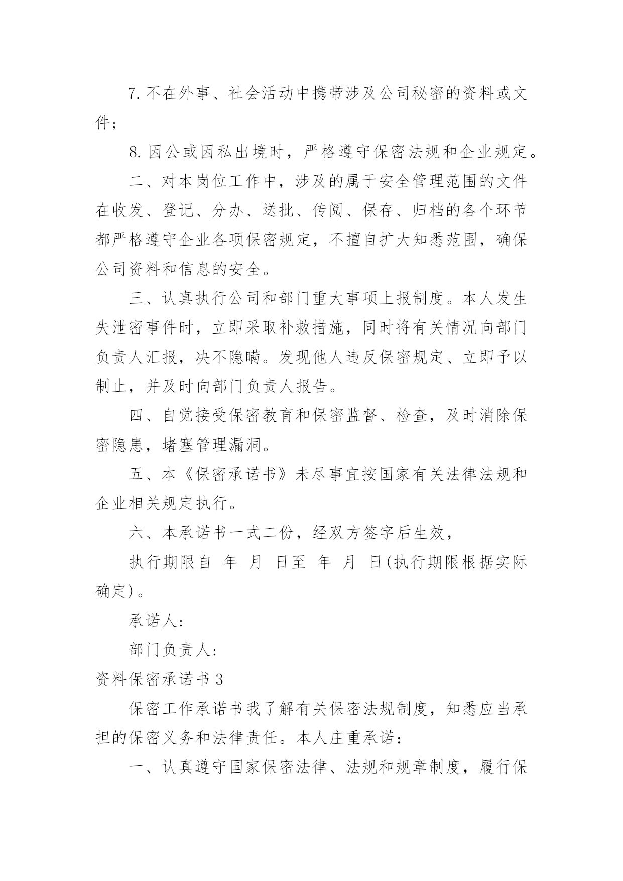 资料保密承诺书资料保密承诺书在充满活力,日益开放的今天,越来越多人会去使用承诺书,承诺书是否产生法律约束力,要具体问题具体分析。那么你有了解过承诺书吗?下面是小编收集整理的资料保密承诺书,欢迎大家分享。资料保密承诺书1本人加入xxxxxx,本人做出如下安全保密承诺:1、自本承诺签定之日起本人不得将上述保密资料用于本项目之外的目的,不得将任何从xxx处直接或间接获得的保密资料披露给任何第三方,不得告知任何第三方保密资料的来源。除非可能需要将保密资料披露给公安局批准的分包人和(或)批准的材料、设备厂家,并且书面通知相关部门该资料系保密资料,否则不应披露给任何第三方。“第三方”指除xxxx、本人以外的'任何个人、单位或公司。“第三方”还应包括本人的分公司或子公司,以及与本项目相关的其他公司和个人。2、本人应自觉遵守xxxx的有关保密规定,不得随意打听或传播xxx内部信息;未经xxx允许,不得从公安网下载或拷贝任何业务信息,不得以任何形式向外界泄露。3、本人应保证接触保密资料的各项要求。4、工程结束后,本人应立即归还xxxx提供的所有保密资料,并不得留存保密资料的原件、复印件及其他记录。5、保密期限:直至该保密资料不成为保密信息为止。单位:承诺人:年月日涉密人员离岗保密承诺书资料保密承诺书2一、自觉遵守国家保密法律法规和企业安全保密管理规定,本人严格做到:1.不在公共场所、私人交往中及家属、子女、亲友面前谈论涉及公司的商业秘密(涉及资料及信息详见《公司财务部管理制度》);2.不在无保密保障的企业办公自动化传输系统及互联网上处理、传递涉及企业安全保密的有关资料和文件;3.不在无保密保障的场所阅办或保存涉及公司安全保密管理范围的文件、资料,不私自复印留存阅办完毕的涉及公司保密范围的文件、资料;4.不带无关人员进入财务室;5.未经有关领导批准,不擅自复印涉密文件或扩大涉密文件的知悉范围,复印件、抄录件严格按原文件的.保密级别管理;6.未经有关领导批准,不擅自对外提供作为内部事项管理的文件或资料;7.不在外事、社会活动中携带涉及公司秘密的资料或文件;8.因公或因私出境时,严格遵守保密法规和企业规定。二、对本岗位工作中,涉及的属于安全管理范围的文件在收发、登记、分办、送批、传阅、保存、归档的各个环节都严格遵守企业各项保密规定,不擅自扩大知悉范围,确保公司资料和信息的安全。三、认真执行公司和部门重大事项上报制度。本人发生失泄密事件时,立即采取补救措施,同时将有关情况向部门负责人汇报,决不隐瞒。发现他人违反保密规定、立即予以制止,并及时向部门负责人报告。四、自觉接受保密教育和保密监督、检查,及时消除保密隐患,堵塞管理漏洞。五、本《保密承诺书》未尽事宜按国家有关法律法规和企业相关规定执行。六、本承诺书一式二份,经双方签字后生效,执行期限自年月日至年月日(执行期限根据实际确定)。承诺人:部门负责人:资料保密承诺书3保密工作承诺书我了解有关保密法规制度,知悉应当承担的保密义务和法律责任。本人庄重承诺:一、认真遵守国家保密法律、法规和规章制度,履行保密义务;二、不提供虚假个人信息,自愿接受保密审查;四、不以任何方式泄露所接触和知悉的.国家秘密;五、未经单位审查批准,不擅自发表涉及未公开工作内容的文章、著述;六、离岗时,自愿接受脱密期管理,签订保密承诺书。违反上述承诺,自愿承担党纪、政纪责任和法律后果。承诺人签名:xx年xx月xx日资料保密承诺书4xxx公司:作为与贵公司合作方的工作人员,本人了解有关保密法律规定,知悉应当承担的保密义务和法律责任。现向贵公司郑重承诺如下:一、遵守国家保密法律、法规和贵公司相关保密制度规定,认真履行保密义务。二、绝不接触国家秘密;未经贵公司审批同意,绝不接触和使用贵公司任何商业秘密。三、经贵公司审批同意使用贵公司商业秘密的,仅限于在贵公司系统或支撑网上操作,不进行非法下载和复制,不以任何方式泄露所接触和使用的贵公司商业秘密。四、完全接受贵公司的保密审查。贵公司有权对本人终端、存储介质、网络使用(包括本人邮箱)等进行有关保密检查。五、服务工作结束后立即将在服务过程中使用的涉及贵公司的所有资料交回贵公司,将本人终端及存储介质上涉及公司商业秘密的资料全部删除并接受贵公司监督和检查。违反上述承诺,本人自愿承担一切法律责任。承诺人工作单位:承诺人签名:xxx年月日xxx公司:作为与贵公司合作方的工作人员,本人了解国家安全生产有关法律规定,知悉贵公司安全生产有关管理制度。现向贵公司郑重承诺如下:一、遵守国家安全生产管理有关法律、法规的规定和贵公司有关安全生产管理的规章制度,认真履行安全生产义务。二、遵守贵公司出入管理制度,严格履行登记手续;不携带易燃、易爆、危险品或者其他非法物品进入贵公司;自愿接受贵公司的`安全检查。三、在贵公司指定