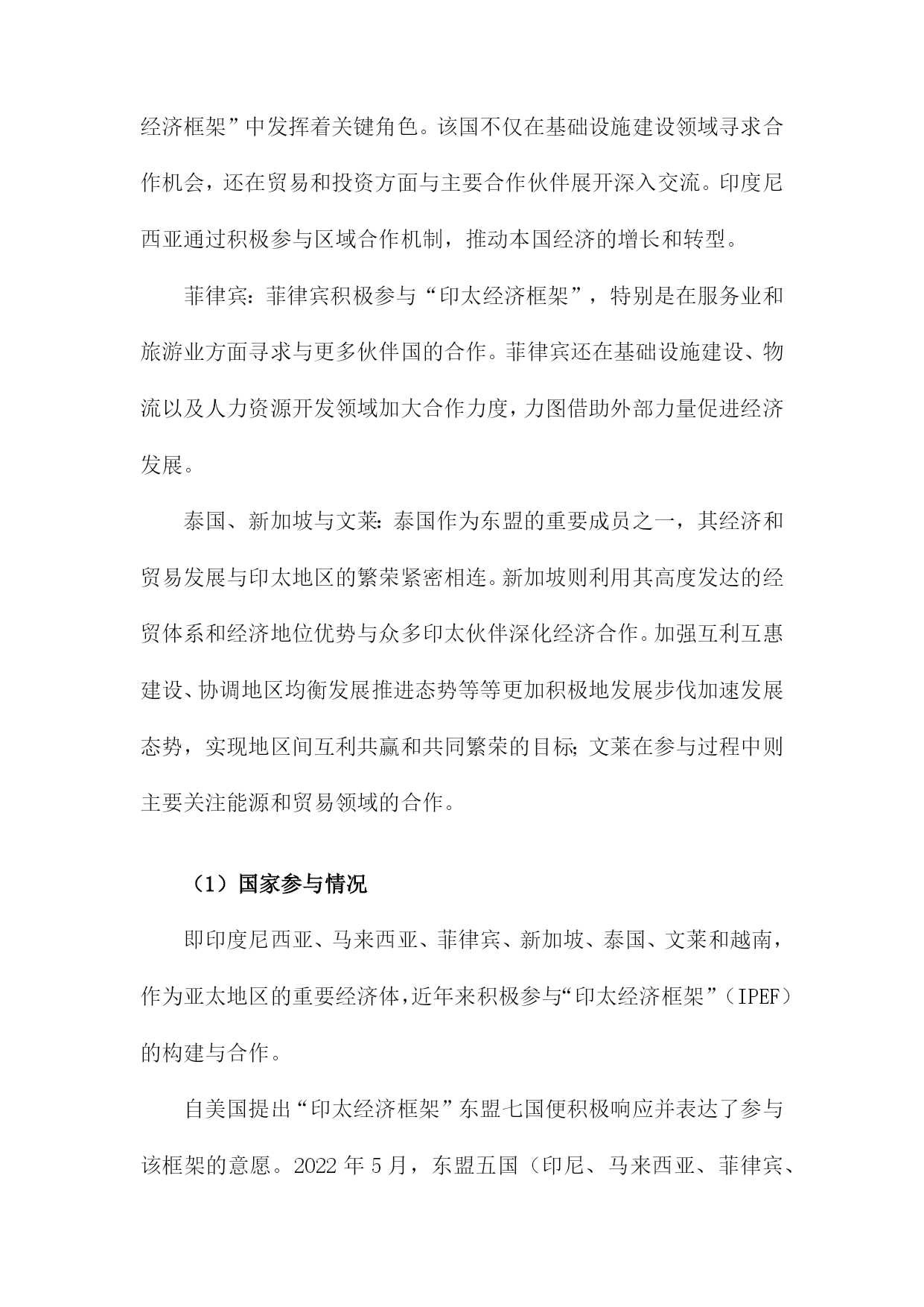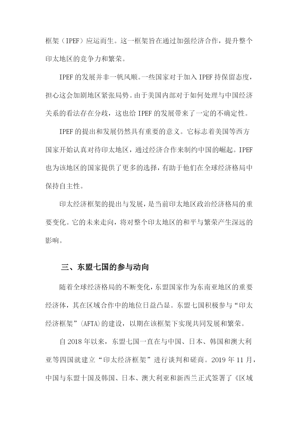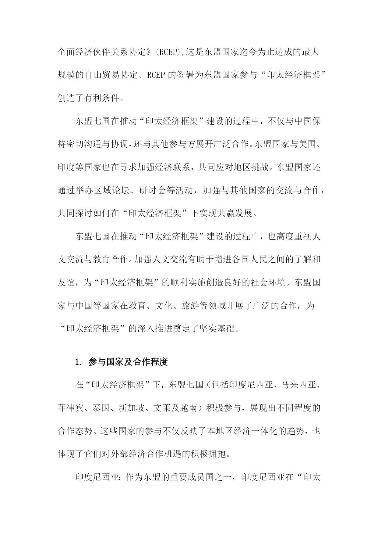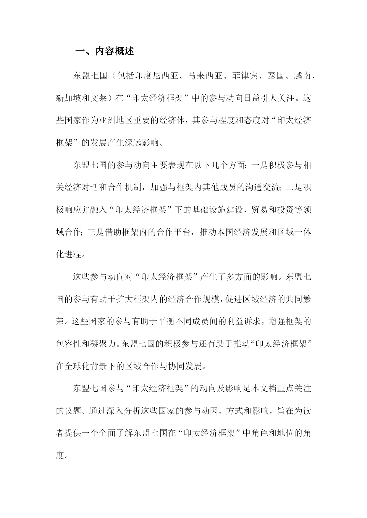 东盟七国参与“印太经济框架”的动向与影响目录一、内容概述................................................1二、东盟七国参与“印太经济框架”的背景........................21.全球政治经济格局的变化................................22.东盟七国的经济发展需求................................43.“印太经济框架”的提出与发展............................5三、东盟七国的参与动向......................................51.参与国家及合作程度....................................7(1)国家参与情况........................................8(2)合作程度分析........................................92.参与领域与重点项目...................................10(1)基础设施建设领域...................................11(2)数字经济领域.......................................12(3)能源与环保领域.....................................13四、“印太经济框架”对东盟七国的影响.........................141.经济发展影响.........................................15(1)促进经济增长与转型升级.............................17(2)加强区域经济一体化进程.............................182.政治与安全影响分析...................................19一、内容概述东盟七国(包括印度尼西亚、马来西亚、菲律宾、泰国、越南、新加坡和文莱)在“印太经济框架”中的参与动向日益引人关注。这些国家作为亚洲地区重要的经济体,其参与程度和态度对“印太经济框架”的发展产生深远影响。东盟七国的参与动向主要表现在以下几个方面:一是积极参与相关经济对话和合作机制,加强与框架内其他成员的沟通交流;二是积极响应并融入“印太经济框架”下的基础设施建设、贸易和投资等领域合作;三是借助框架内的合作平台,推动本国经济发展和区域一体化进程。这些参与动向对“印太经济框架”产生了多方面的影响。东盟七国的参与有助于扩大框架内的经济合作规模,促进区域经济的共同繁荣。这些国家的参与有助于平衡不同成员间的利益诉求,增强框架的包容性和凝聚力。东盟七国的积极参与还有助于推动“印太经济框架”在全球化背景下的区域合作与协同发展。东盟七国参与“印太经济框架”的动向及影响是本文档重点关注的议题。通过深入分析这些国家的参与动因、方式和影响,旨在为读者提供一个全面了解东盟七国在“印太经济框架”中角色和地位的角度。二、东盟七国参与“印太经济框架”的背景随着全球政治经济格局的快速演变,亚太地区的合作与发展日益受到关注。在这样的背景下,东盟七国(印度尼西亚、马来西亚、菲律宾、新加坡、泰国、文莱和越南)积极参与“印太经济框架”(IPEF),旨在深化区域经济合作,提升整体竞争力,并推动地区经济的发展。东盟七国一直致力于推动区域经济一体化进程。“印太经济框架”可以为区域内的国家提供更加开放、包容的合作平台,有助于推动贸易和投资自由化便利化,加强供应链的韧性,促进区域经济的可持续发展。东盟七国参与“印太经济框架”的背景是多方面的,既包括应对区域内外部挑战的需要,也包括推动区域经济一体化进程和提升国际影响力的目标。这一动向不仅对东盟七国自身具有重要意义,也将对整个亚太地区的经济发展和合作格局产生深远影响。1.全球政治经济格局的变化随着全球政治经济格局的变化,东盟七国在区域合作中的地位日益凸显。为了应对全球经济一体化的挑战,东盟国家积极参与各种国际和地区经济合作机制,以促进地区的经济发展和繁荣。在这个背景下,“印太经济框架”成为东盟国家与美国等西方国家在经济领域展开合作的重要平台。自20世纪末以来,全球政治经济格局发生了深刻变化。全球化进程加速,国际贸易和投资自由化、便利化趋势明显,各国之间的经济联系日益紧密。新兴市场国家和发展中国家的崛起,使得国际力量对比发生重大调整,传统的西方霸权地位受到挑战。在这种背景下,东盟国家意识到加强区域合作的重要性,以维护自身利益
