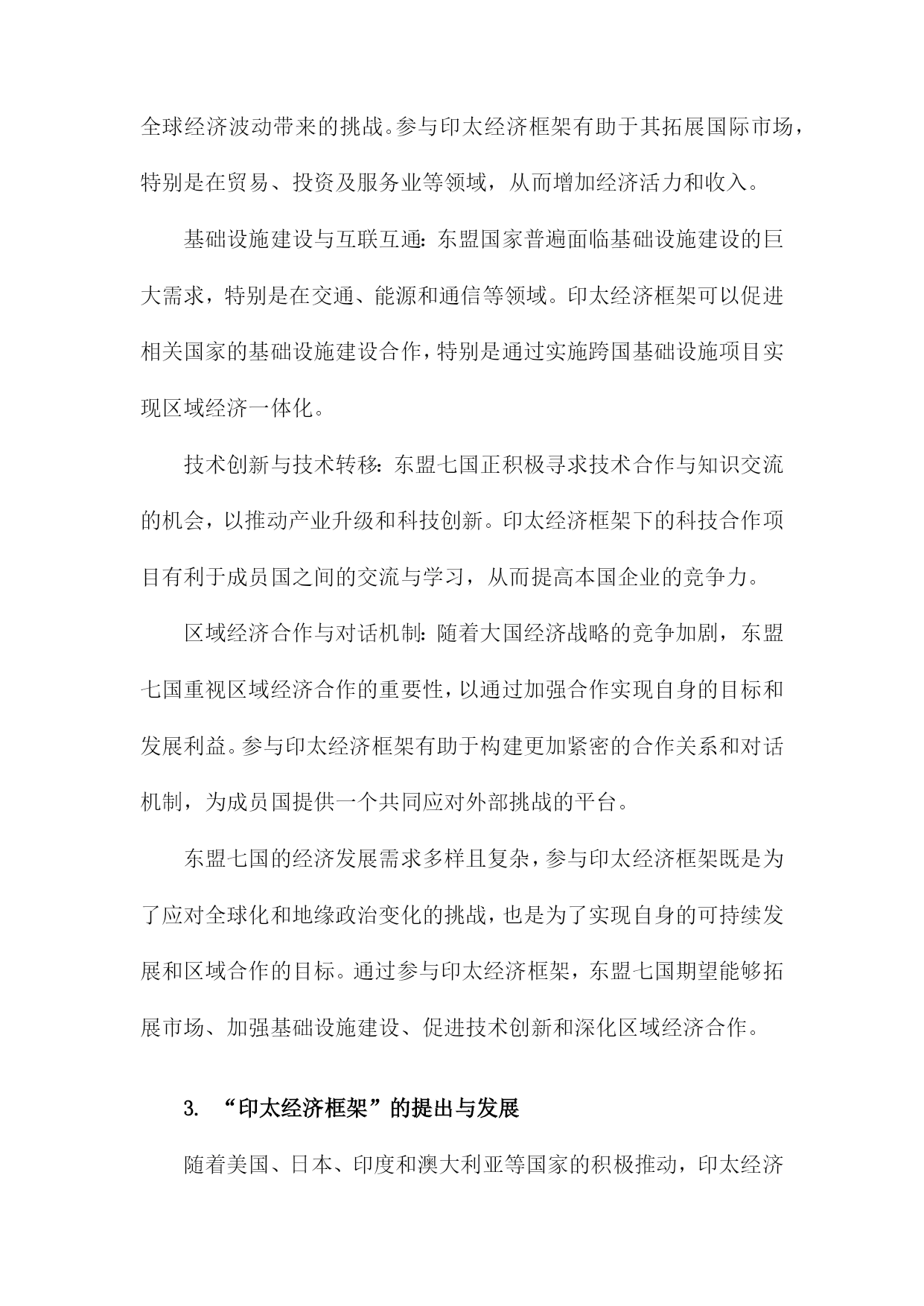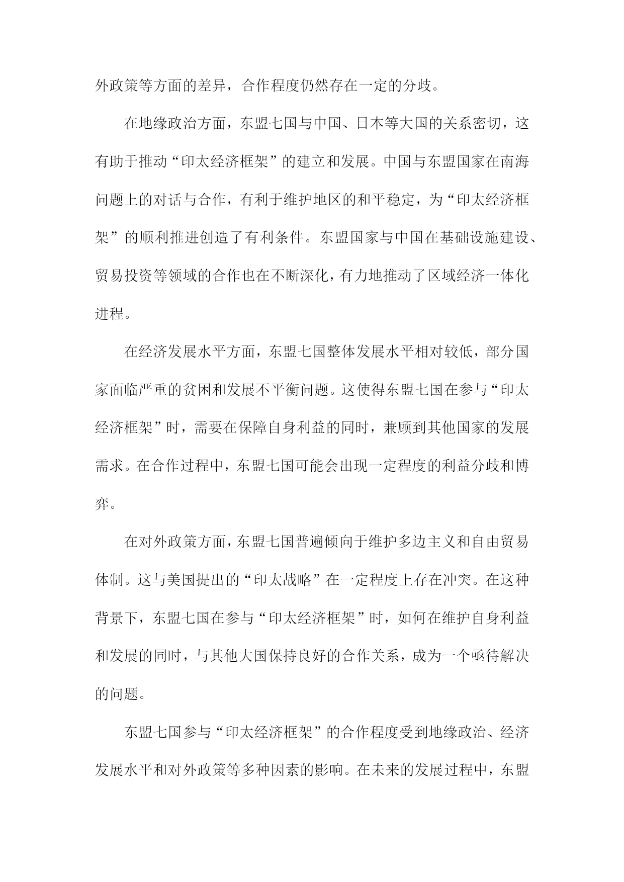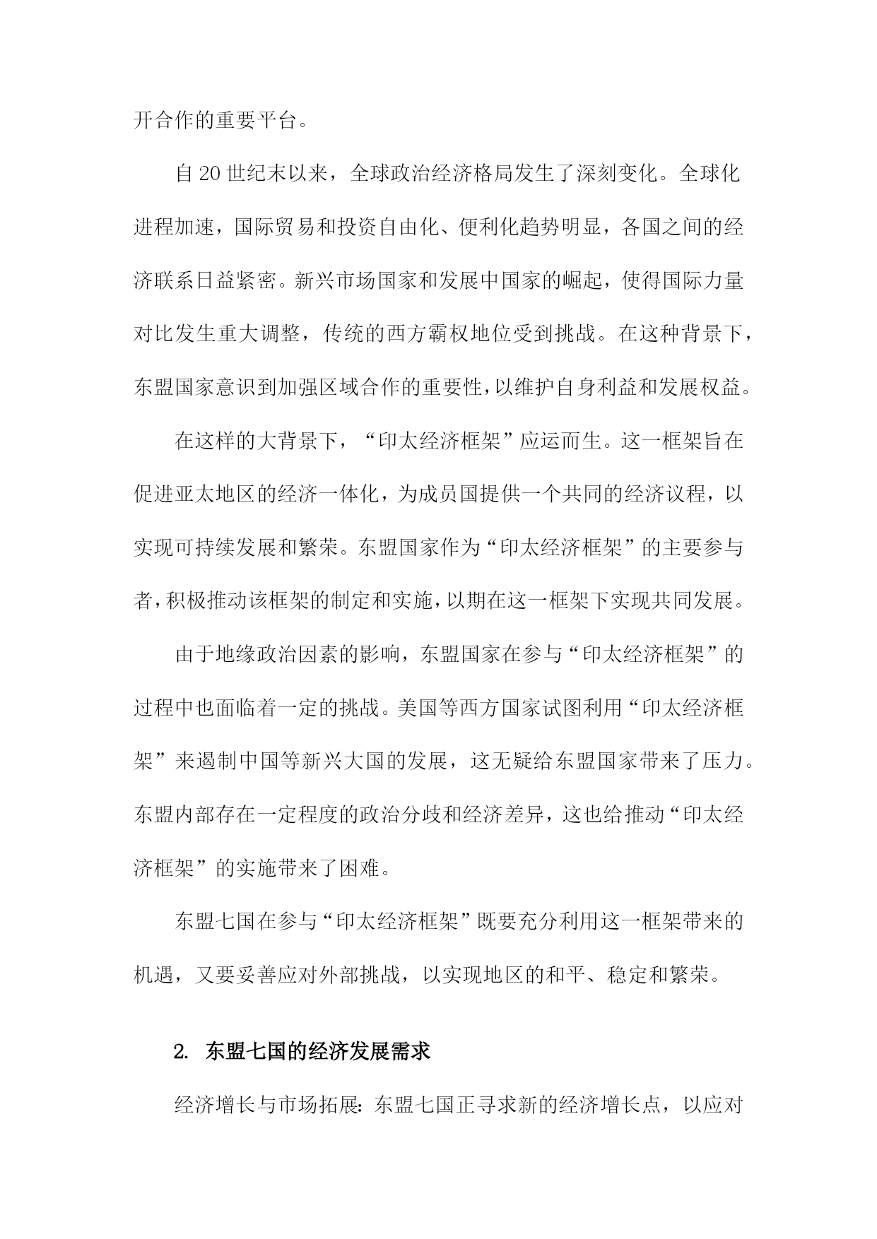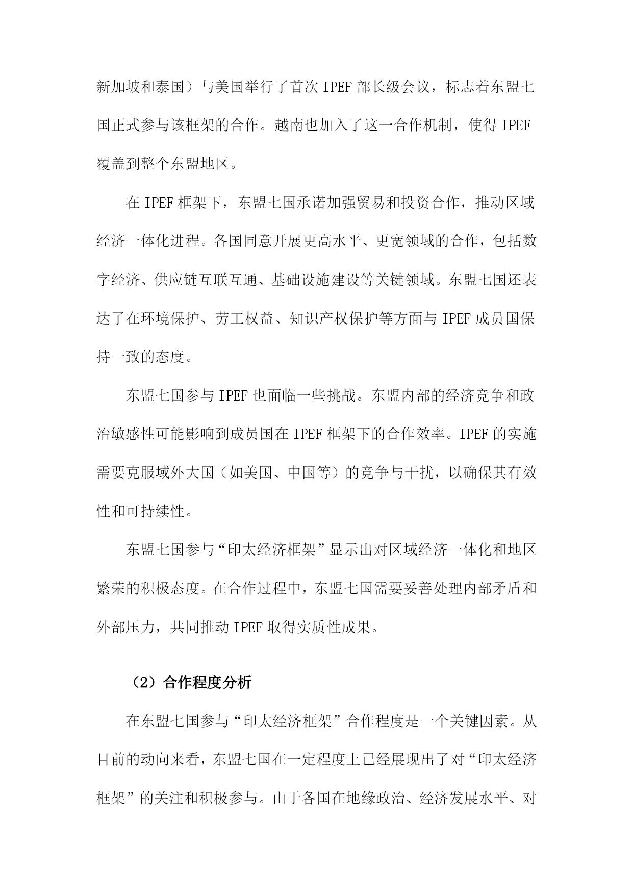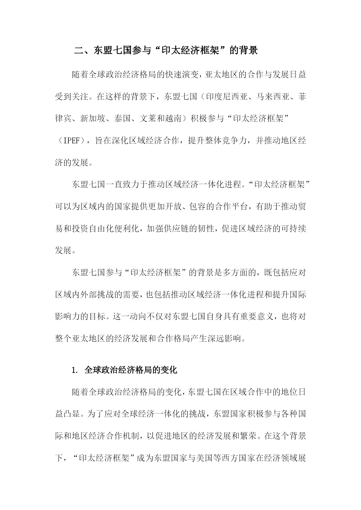 东盟七国参与“印太经济框架”的动向与影响目录一、内容概述................................................1二、东盟七国参与“印太经济框架”的背景........................21.全球政治经济格局的变化................................22.东盟七国的经济发展需求................................43.“印太经济框架”的提出与发展............................5三、东盟七国的参与动向......................................51.参与国家及合作程度....................................7(1)国家参与情况........................................8(2)合作程度分析........................................92.参与领域与重点项目...................................10(1)基础设施建设领域...................................11(2)数字经济领域.......................................12(3)能源与环保领域.....................................13四、“印太经济框架”对东盟七国的影响.........................141.经济发展影响.........................................15(1)促进经济增长与转型升级.............................17(2)加强区域经济一体化进程.............................182.政治与安全影响分析...................................19一、内容概述东盟七国(包括印度尼西亚、马来西亚、菲律宾、泰国、越南、新加坡和文莱)在“印太经济框架”中的参与动向日益引人关注。这些国家作为亚洲地区重要的经济体,其参与程度和态度对“印太经济框架”的发展产生深远影响。东盟七国的参与动向主要表现在以下几个方面:一是积极参与相关经济对话和合作机制,加强与框架内其他成员的沟通交流;二是积极响应并融入“印太经济框架”下的基础设施建设、贸易和投资等领域合作;三是借助框架内的合作平台,推动本国经济发展和区域一体化进程。这些参与动向对“印太经济框架”产生了多方面的影响。东盟七国的参与有助于扩大框架内的经济合作规模,促进区域经济的共同繁荣。这些国家的参与有助于平衡不同成员间的利益诉求,增强框架的包容性和凝聚力。东盟七国的积极参与还有助于推动“印太经济框架”在全球化背景下的区域合作与协同发展。东盟七国参与“印太经济框架”的动向及影响是本文档重点关注的议题。通过深入分析这些国家的参与动因、方式和影响,旨在为读者提供一个全面了解东盟七国在“印太经济框架”中角色和地位的角度。二、东盟七国参与“印太经济框架”的背景随着全球政治经济格局的快速演变,亚太地区的合作与发展日益受到关注。在这样的背景下,东盟七国(印度尼西亚、马来西亚、菲律宾、新加坡、泰国、文莱和越南)积极参与“印太经济框架”(IPEF),旨在深化区域经济合作,提升整体竞争力,并推动地区经济的发展。东盟七国一直致力于推动区域经济一体化进程。“印太经济框架”可以为区域内的国家提供更加开放、包容的合作平台,有助于推动贸易和投资自由化便利化,加强供应链的韧性,促进区域经济的可持续发展。东盟七国参与“印太经济框架”的背景是多方面的,既包括应对区域内外部挑战的需要,也包括推动区域经济一体化进程和提升国际影响力的目标。这一动向不仅对东盟七国自身具有重要意义,也将对整个亚太地区的经济发展和合作格局产生深远影响。1.全球政治经济格局的变化随着全球政治经济格局的变化,东盟七国在区域合作中的地位日益凸显。为了应对全球经济一体化的挑战,东盟国家积极参与各种国际和地区经济合作机制,以促进地区的经济发展和繁荣。在这个背景下,“印太经济框架”成为东盟国家与美国等西方国家在经济领域展开合作的重要平台。自20世纪末以来,全球政治经济格局发生了深刻变化。全球化进程加速,国际贸易和投资自由化、便利化趋势明显,各国之间的经济联系日益紧密。新兴市场国家和发展中国家的崛起,使得国际力量对比发生重大调整,传统的西方霸权地位受到挑战。在这种背景下,东盟国家意识到加强区域合作的重要性,以维护自身利益