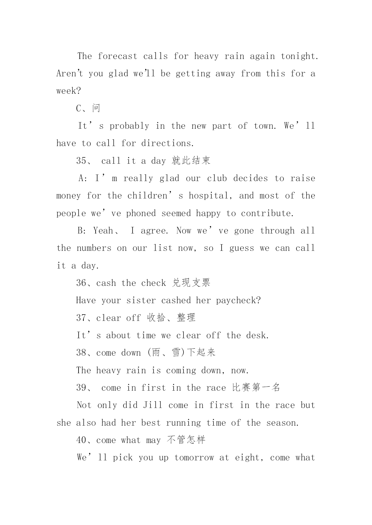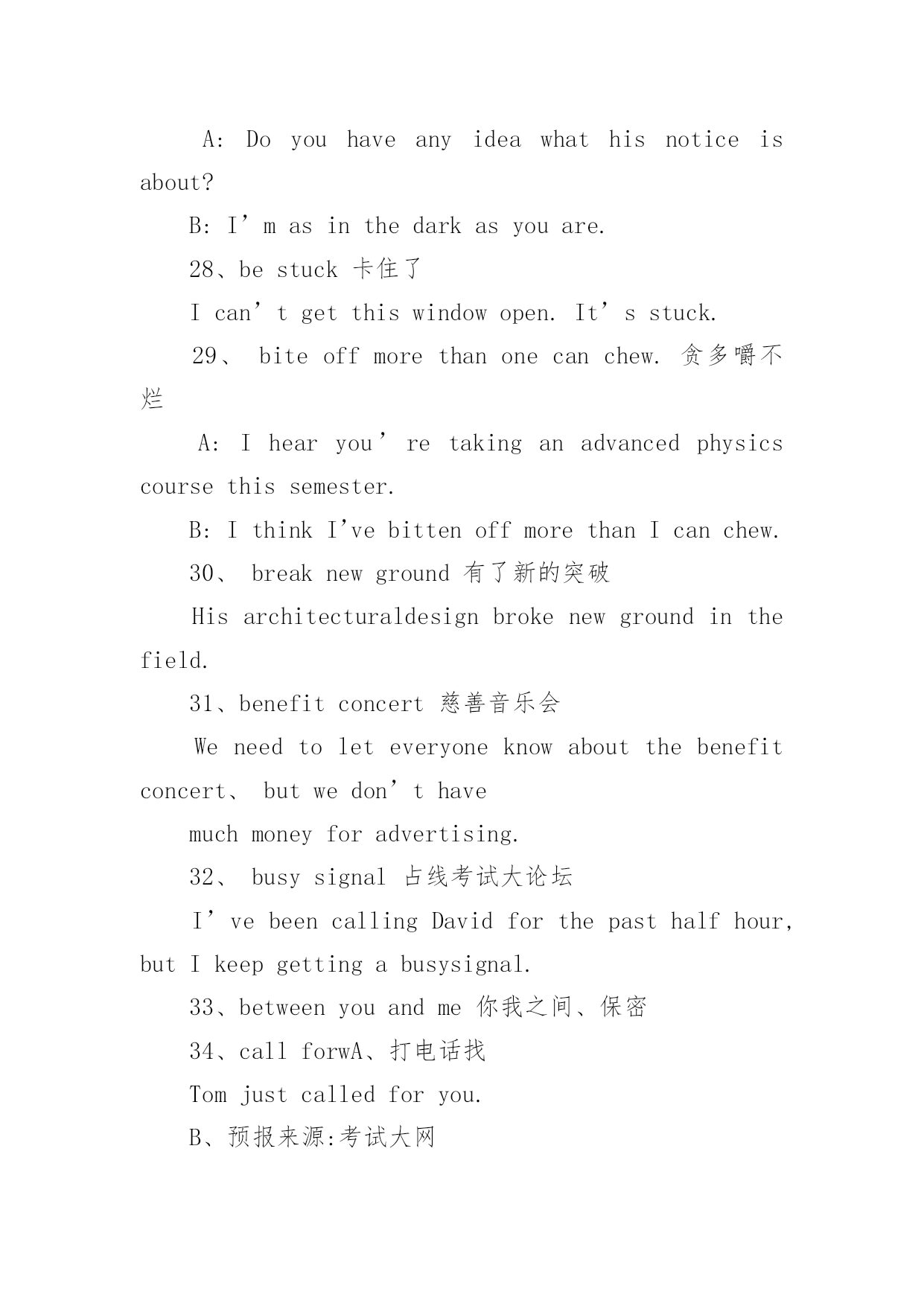 雅思听力考试核心词汇雅思听力考试核心词汇雅思听力考试核心词汇21、backup1)累积Thesubwayisrunningbehindschedule、andtrafficisbackedupforblocks.Idon’tknowifwe’llmakethe6:30show.2)支持I’llbackitup.22、beboundfor到……地方ThebusisboundforNewEngland.23、be(feel)myself找到自我I’mfeelingmyselfagain.24、beburnedup生气Shewasreallyburnedupatthenews.25、behardupforI’mhardupforclothes、butIhavealotofbooks.26、beheadandshouldersabove好许多Incalculus,Joeisheadandshouldersabovehisclassmates.27、beinthedark蒙在鼓里A:Doyouhaveanyideawhathisnoticeisabout?B:I’masinthedarkasyouare.28、bestuck卡住了Ican’tgetthiswindowopen.It’sstuck.29、biteoffmorethanonecanchew.贪多嚼不烂A:Ihearyou’retakinganadvancedphysicscoursethissemester.B:IthinkI’vebittenoffmorethanIcanchew.30、breaknewground有了新的突破Hisarchitecturaldesignbrokenewgroundinthefield.31、benefitconcert慈善音乐会Weneedtoleteveryoneknowaboutthebenefitconcert、butwedon’thavemuchmoneyforadvertising.32、busysignal占线考试大论坛I’vebeencallingDavidforthepasthalfhour,butIkeepgettingabusysignal.33、betweenyouandme你我之间、保密34、callforwA、打电话找Tomjustcalledforyou.B、预报来源:考试大网Theforecastcallsforheavyrainagaintonight.Aren’tyougladwe’llbegettingawayfromthisforaweek?C、问It’sprobablyinthenewpartoftown.We’llhavetocallfordirections.35、callitaday就此结束A:I’mreallygladourclubdecidestoraisemoneyforthechildren’shospital,andmostofthepeoplewe’vephonedseemedhappytocontribute.B:Yeah、Iagree.Nowwe’vegonethroughallthenumbersonourlistnow,soIguesswecancallitaday.36、cashthecheck兑现支票Haveyoursistercashedherpaycheck?37、clearoff收拾、整理It’sabouttimeweclearoffthedesk.38、comedown(雨、雪)下起来Theheavyrainiscomingdown,now.39、comeinfirstintherace比赛第一名NotonlydidJillcomeinfirstintheracebutshealsohadherbestrunningtimeoftheseason.40、comewhatmay不管怎样We’llpickyouuptomorrowateight,comewhatmay.