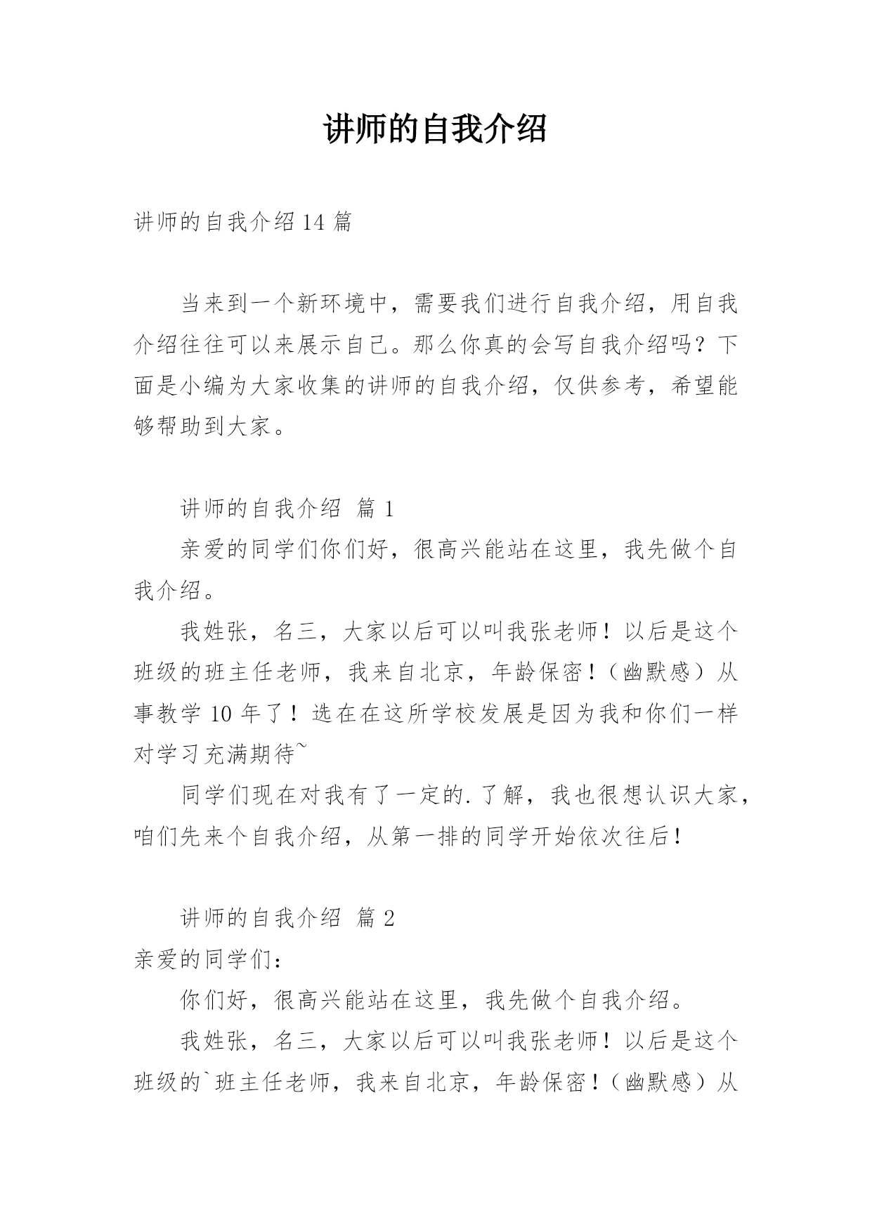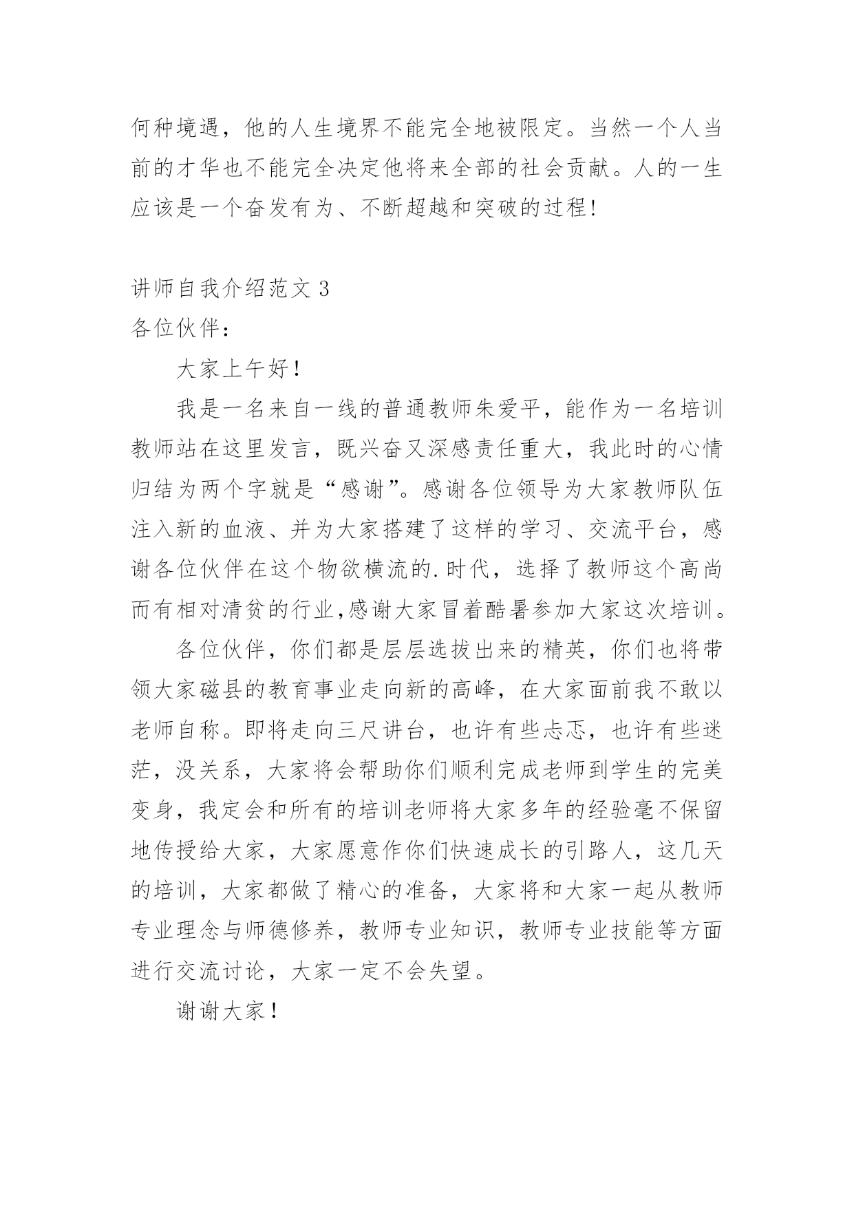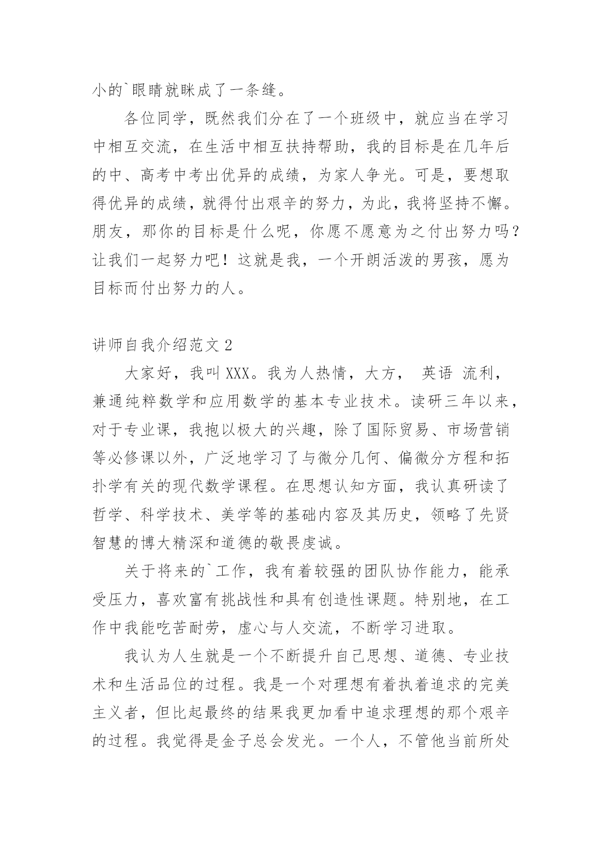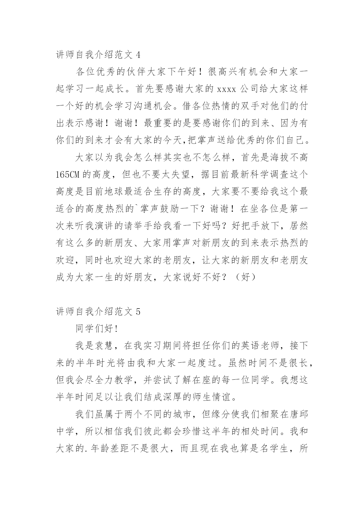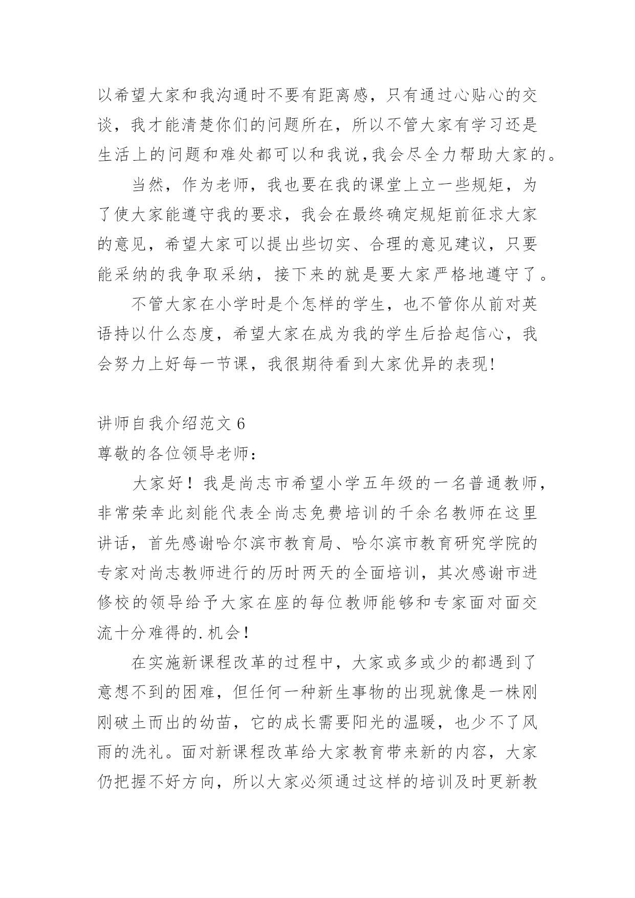 讲师自我介绍讲师自我介绍范文当进入一个陌生环境,时常需要用到自我介绍,用自我介绍往往可以向他人介绍自己。那么自我介绍要注意有什么内容呢?下面是小编为大家整理的讲师自我介绍范文,供大家参考借鉴,希望可以帮助到有需要的朋友。讲师自我介绍范文1各位同学们:大家好,我的名字叫xx。在学校里,这是我与大家的第4次见面,想必大家对我还不是很熟悉。所以,下面我就为大家做一个简单的自我介绍。我今年13岁,圆圆的脸上,镶嵌着一双炯炯有神的小眼睛。我的眉毛又黑又粗,好似两把大扫帚,在圆圆的鼻子下面,长着一张能说会道的嘴巴。我生活在一个甜蜜的四口之家中,我的妈妈是一位老师,在三中工作,也就是我现在所处的学校。我的爸爸同样也是一位老师,在岱岳乡中心校工作,我的姐姐呢,是一个品学兼优的学生今年在中学读高中一年级。我生性好动,是个开朗活泼的孩子。我酷爱体育运动,尤其是球类这一方面的。比如:足球、篮球、羽毛球、乒乓球。也由于开朗活泼的缘故,我很爱笑,一笑起来,那双小小的`眼睛就眯成了一条缝。各位同学,既然我们分在了一个班级中,就应当在学习中相互交流,在生活中相互扶持帮助,我的目标是在几年后的中、高考中考出优异的成绩,为家人争光。可是,要想取得优异的成绩,就得付出艰辛的努力,为此,我将坚持不懈。朋友,那你的目标是什么呢,你愿不愿意为之付出努力吗?让我们一起努力吧!这就是我,一个开朗活泼的男孩,愿为目标而付出努力的人。讲师自我介绍范文2大家好,我叫XXX。我为人热情,大方,英语流利,兼通纯粹数学和应用数学的基本专业技术。读研三年以来,对于专业课,我抱以极大的兴趣,除了国际贸易、市场营销等必修课以外,广泛地学习了与微分几何、偏微分方程和拓扑学有关的现代数学课程。在思想认知方面,我认真研读了哲学、科学技术、美学等的基础内容及其历史,领略了先贤智慧的博大精深和道德的敬畏虔诚。关于将来的`工作,我有着较强的团队协作能力,能承受压力,喜欢富有挑战性和具有创造性课题。特别地,在工作中我能吃苦耐劳,虚心与人交流,不断学习进取。我认为人生就是一个不断提升自己思想、道德、专业技术和生活品位的过程。我是一个对理想有着执着追求的完美主义者,但比起最终的结果我更加看中追求理想的那个艰辛的过程。我觉得是金子总会发光。一个人,不管他当前所处何种境遇,他的人生境界不能完全地被限定。当然一个人当前的才华也不能完全决定他将来全部的社会贡献。人的一生应该是一个奋发有为、不断超越和突破的过程!讲师自我介绍范文3各位伙伴:大家上午好!我是一名来自一线的普通教师朱爱平,能作为一名培训教师站在这里发言,既兴奋又深感责任重大,我此时的心情归结为两个字就是“感谢”。感谢各位领导为大家教师队伍注入新的血液、并为大家搭建了这样的学习、交流平台,感谢各位伙伴在这个物欲横流的.时代,选择了教师这个高尚而有相对清贫的行业,感谢大家冒着酷暑参加大家这次培训。各位伙伴,你们都是层层选拔出来的精英,你们也将带领大家磁县的教育事业走向新的高峰,在大家面前我不敢以老师自称。即将走向三尺讲台,也许有些忐忑,也许有些迷茫,没关系,大家将会帮助你们顺利完成老师到学生的完美变身,我定会和所有的培训老师将大家多年的经验毫不保留地传授给大家,大家愿意作你们快速成长的引路人,这几天的培训,大家都做了精心的准备,大家将和大家一起从教师专业理念与师德修养,教师专业知识,教师专业技能等方面进行交流讨论,大家一定不会失望。谢谢大家!讲师自我介绍范文4各位优秀的伙伴大家下午好!很高兴有机会和大家一起学习一起成长。首先要感谢大家的xxxx公司给大家这样一个好的机会学习沟通机会。借各位热情的双手对他们的付出表示感谢!谢谢!最重要的是要感谢你们的到来、因为有你们的到来才会有大家的今天,把掌声送给优秀的你们自己。大家以为我会怎么样其实也不怎么样,首先是海拔不高165CM的高度,但也不要太失望,据目前最新科学调查这个高度是目前地球最适合生存的高度,大家要不要给我这个最适合的高度热烈的`掌声鼓励一下?谢谢!在坐各位是第一次来听我演讲的请举手给我看一下好吗?好把手放下,居然有这么多的新朋友、大家用掌声对新朋友的到来表示热烈的欢迎,同时也欢迎大家的老朋友,让大家的新朋友和老朋友成为大家一生的好朋友,大家说好不好?(好)讲师自我介绍范文5同学们好!我是袁慧,在我实习期间将担任你们的英语老师,接下来的半年时光将由我和大家一起度过。虽然时间不是很长,但我会尽全力教学,并尝试了解在座的每一位同学。我想这半年时间足以让我们结成深厚的师生情谊。我们虽属于两个不同的城市,但缘分使我们相聚在唐邱中学,所以相信我们彼此都会珍惜这半年的相处时间。我和大家的.年龄差距不是很大,而且现在我也算是名学生,所以希望大家和我沟通时不要有距离感,只有通过心贴心的交谈,我才能清楚你们的问题所在,
