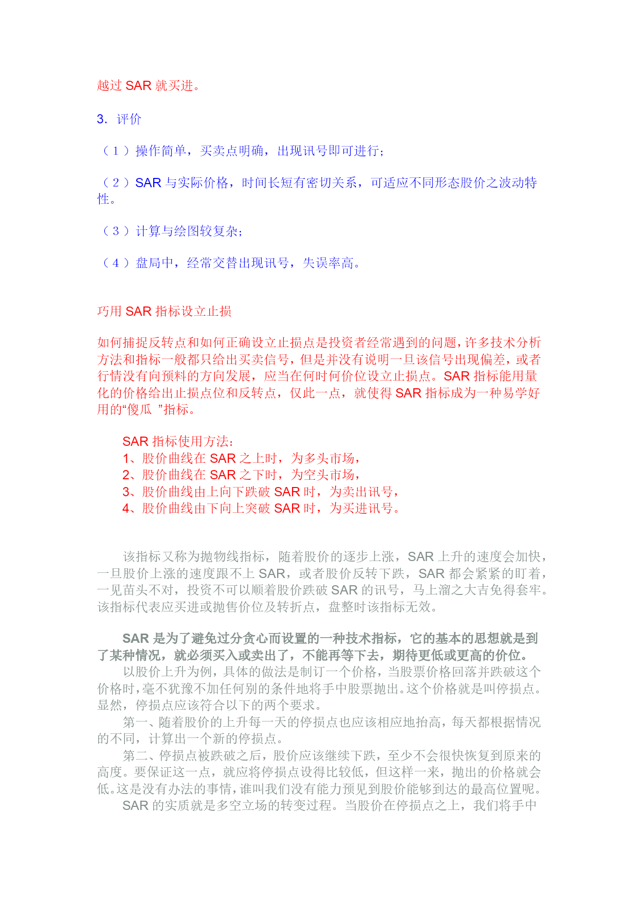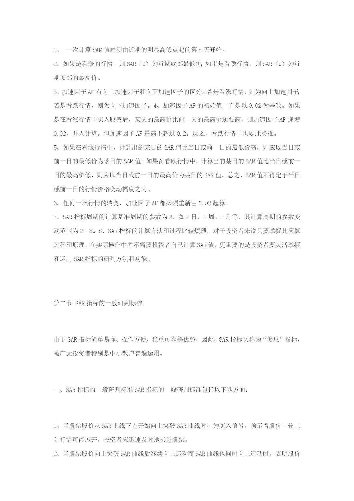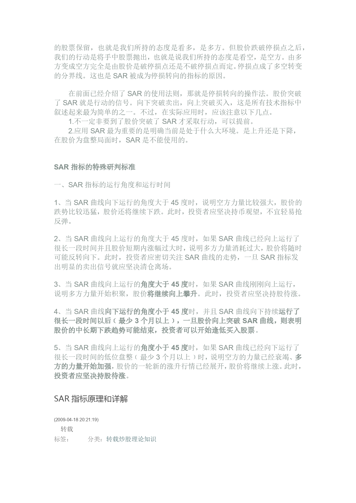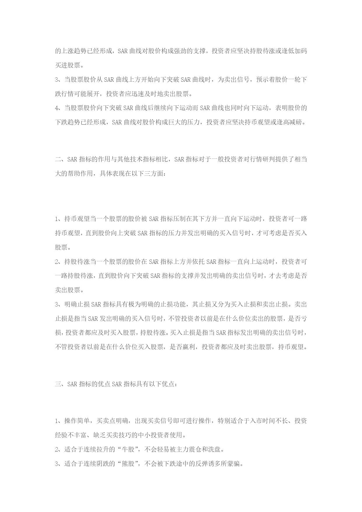 抛物线转向SAR指标使用详解HYPERLINK"http://chinapyjjq.blog.163.com/blog/"\l"m=0&t=1&c=fks_080074087085082064085084074070085082088074081095081"网络知识2009-11-2118:03:32阅读110评论0字号:大中小抛物线转向(SAR)也称停损点转向,是利用抛物线方式,随时调整停损点位置以观察买卖点。由于停损点(又称转向点SAR)以弧形的方式移动,故称之为抛物线转向指标。1.计算方法(1)先选定一段时间判断为上涨或下跌。(2)若是看涨,则第一天的SAR值必须是近期内的最低价;若是看跌,则第一天的SAR须是近期的最高价。(3)第二天的SAR,则为第一天的最高价(看涨时)或是最低价(看跌时)与第一天的SAR的差距乘上加速因子,再加上第一天的SAR就可求得。(4)每日的SAR都可用上述方法类推,归纳公式如下:SAR(n)=SAR(n-1)+AR〖EP(n-1)-SAR(n-1)〗SAR(n)=第n日的SAR值,SAR(n-1)即第(n-1)日之值;AR;加速因子;EP:极点价,若是看涨一段期间,则EP为这段期间的最高价,若是看跌一段时间,则EP为这段期间的最低价;EP(n-1):第(n-1)日的极点价。(5)加速因子第一次取0.02,假若第一天的最高价比前一天的最高价还高,则加速因子增加0.02,若无新高则加速因子沿用前一天的数值,但加速因子最高不能超过0.2。反之,下跌也类推。(6)若是看涨期间,计算出某日的SAR比当日或前一日的最低价高,则应以当日或前一日的最低价为某日之SAR;若是看跌期间,计算某日之SAR比当日或前一日的最高价低,则应以当日或前一日的最高价为某日的SAR。2.运用原则买卖的进出时机是价位穿过SAR时,也就是向下跌破SAR便卖出,向上越过SAR就买进。3.评价(1)操作简单,买卖点明确,出现讯号即可进行;(2)SAR与实际价格,时间长短有密切关系,可适应不同形态股价之波动特性。(3)计算与绘图较复杂;(4)盘局中,经常交替出现讯号,失误率高。巧用SAR指标设立止损如何捕捉反转点和如何正确设立止损点是投资者经常遇到的问题,许多技术分析方法和指标一般都只给出买卖信号,但是并没有说明一旦该信号出现偏差,或者行情没有向预料的方向发展,应当在何时何价位设立止损点。SAR指标能用量化的价格给出止损点位和反转点,仅此一点,就使得SAR指标成为一种易学好用的“傻瓜”指标。SAR指标使用方法:1、股价曲线在SAR之上时,为多头市场,2、股价曲线在SAR之下时,为空头市场,3、股价曲线由上向下跌破SAR时,为卖出讯号,4、股价曲线由下向上突破SAR时,为买进讯号。该指标又称为抛物线指标,随着股价的逐步上涨,SAR上升的速度会加快,一旦股价上涨的速度跟不上SAR,或者股价反转下跌,SAR都会紧紧的盯着,一见苗头不对,投资不可以顺着股价跌破SAR的讯号,马上溜之大吉免得套牢。该指标代表应买进或抛售价位及转折点,盘整时该指标无效。SAR是为了避免过分贪心而设置的一种技术指标,它的基本的思想就是到了某种情况,就必须买入或卖出了,不能再等下去,期待更低或更高的价位。以股价上升为例,具体的做法是制订一个价格,当股票价格回落并跌破这个价格时,毫不犹豫不加任何别的条件地将手中股票抛出。这个价格就是叫停损点。显然,停损点应该符合以下的两个要求。第一、随着股价的上升每一天的停损点也应该相应地抬高,每天都根据情况的不同,计算出一个新的停损点。第二、停损点被跌破之后,股价应该继续下跌,至少不会很快恢复到原来的高度。要保证这一点,就应将停损点设得比较低,但这样一来,抛出的价格就会低。这是没有办法的事情,谁叫我们没有能力预见到股价能够到达的最高位置呢。SAR的实质就是多空立场的转变过程。当股价在停损点之上,我们将手中的股票保留,也就是我们所持的态度是看多,是多方。但股价跌破停损点之后,我们的行动是将手中股票抛出,也就是说我们所持的态度是看空,是空方。由多方变成空方完全是由股价是破停损点还是不破停损点而定。停损点成了多空转变的分界线。这也是SAR被成为停损转向的指标的原因。在前面已经介绍了SAR的使用法则,那就是停损转向的操作法。股价突破了SAR就是行动的信号。向下突破卖出,向上突破买入,这是所有技术指标中叙述起来最为简单的之一。不过,在实际应用时,应该注意以下几点。1.不一定非要到了股价突破了SAR才采取行动,可以提前。2.应用SAR最为重要的是明确当前是处于什么大环境。是上升还是下降,在股价为盘整局面时,SAR是不能使用的。SAR指标的特殊研判标准一、SAR指标的运行角度和运行时间1、当SAR