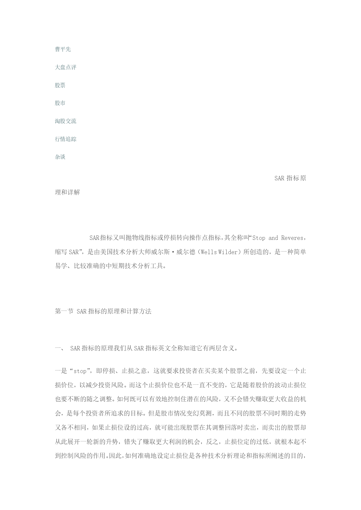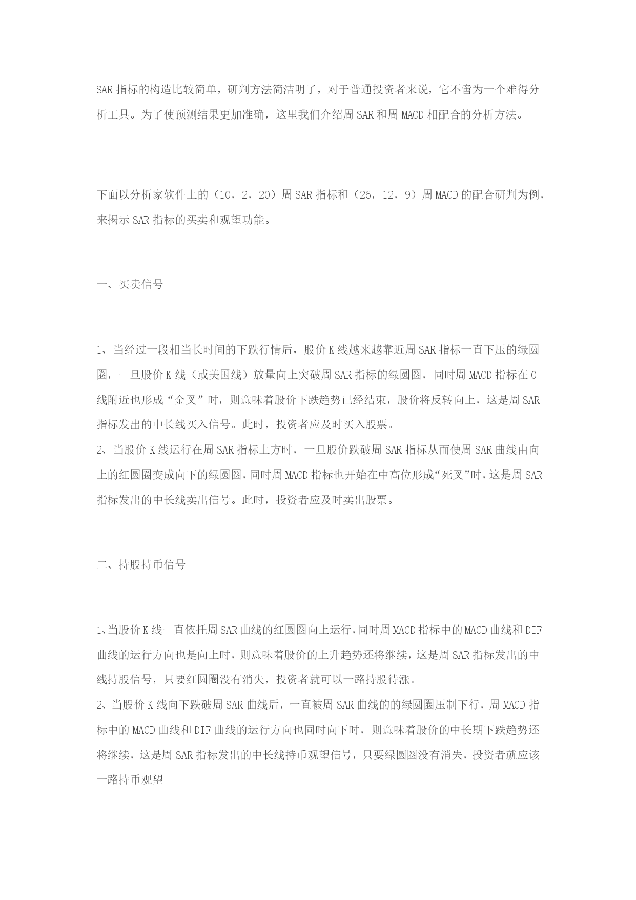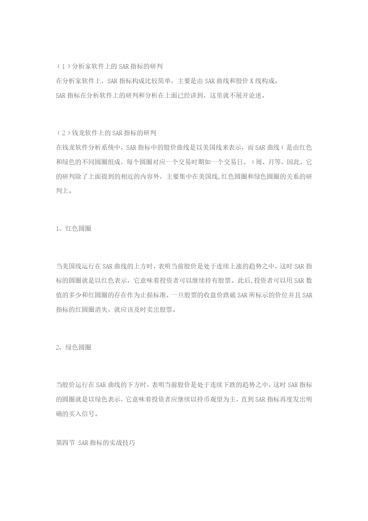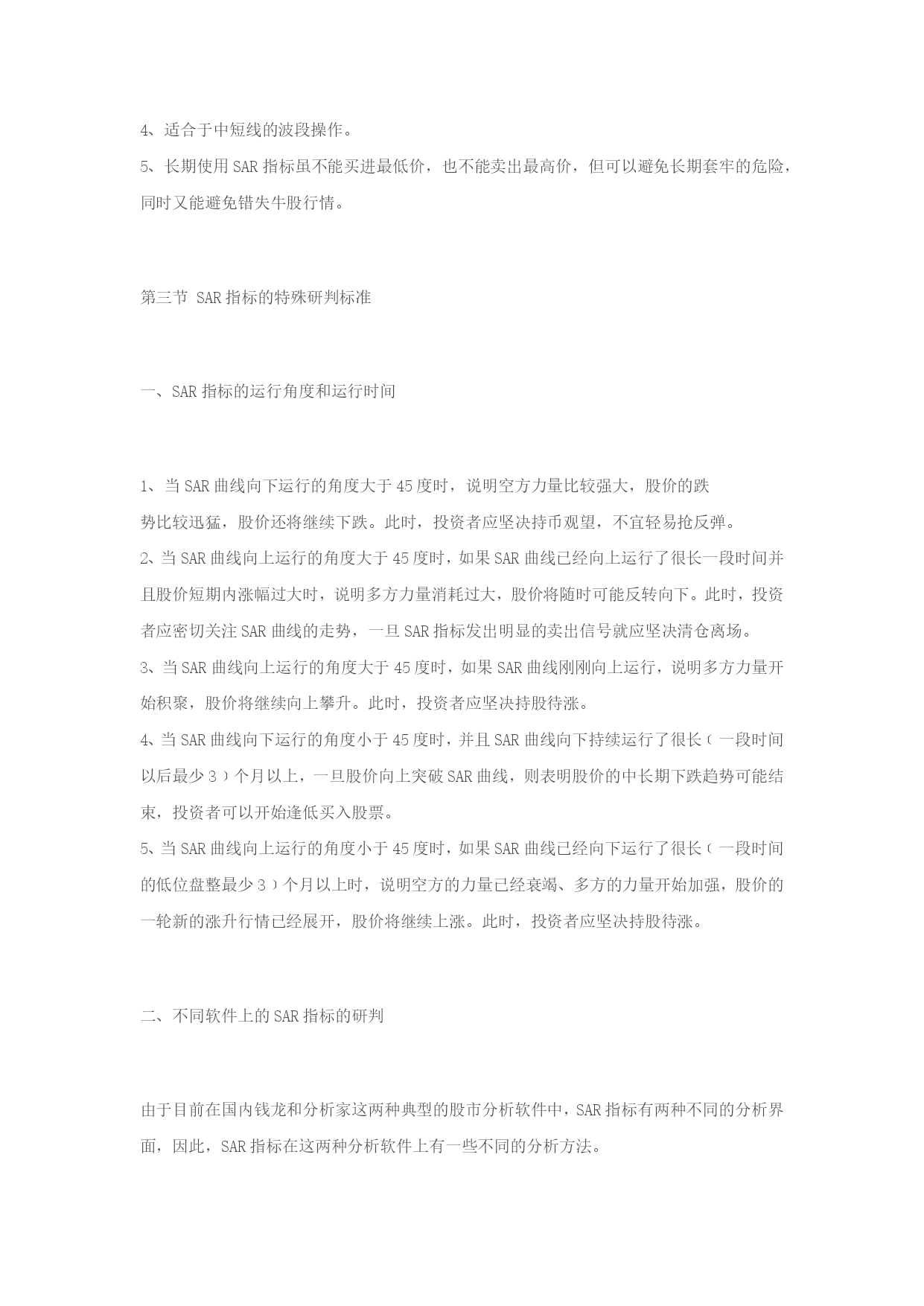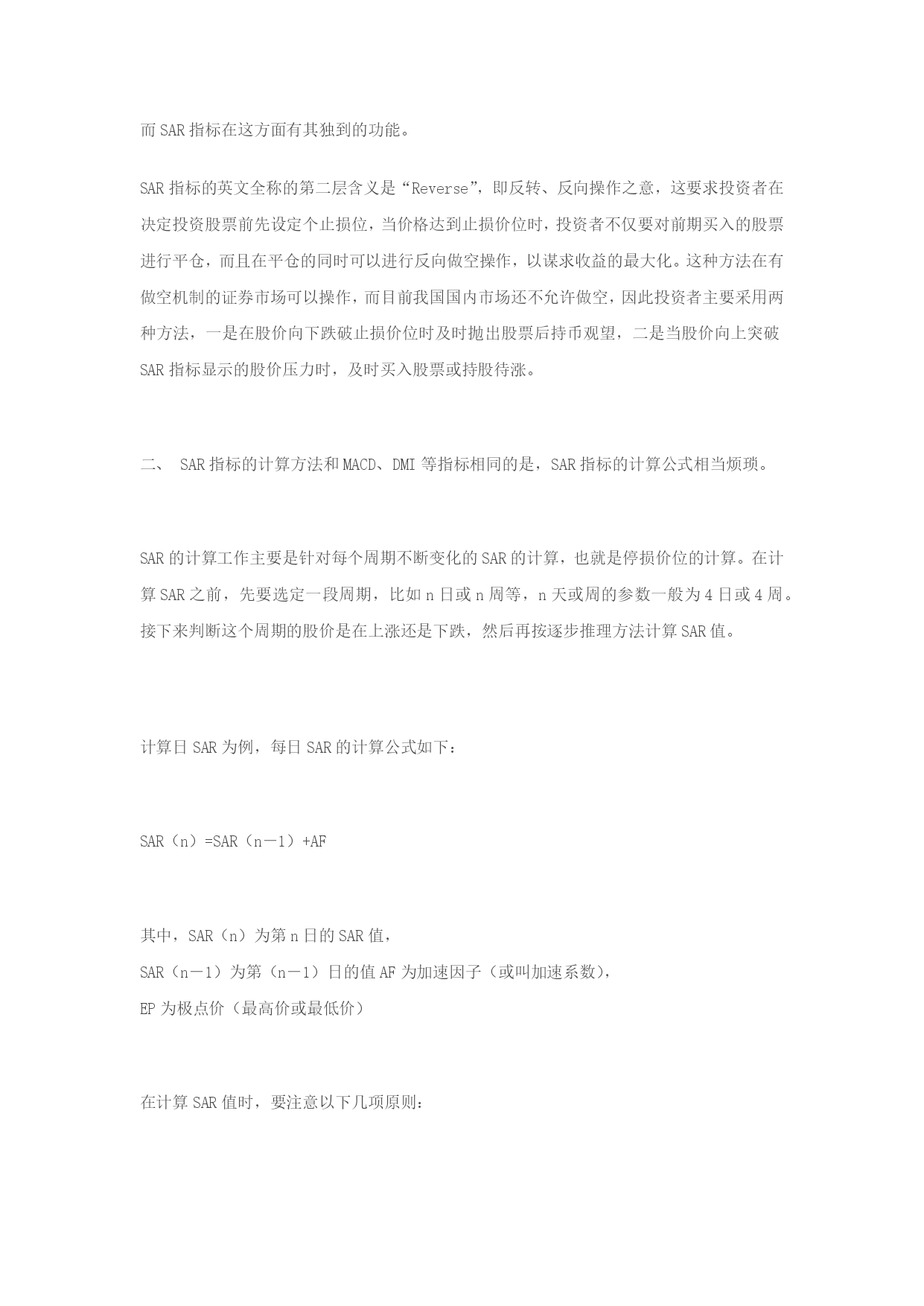 抛物线转向SAR指标使用详解HYPERLINK"http://chinapyjjq.blog.163.com/blog/"\l"m=0&t=1&c=fks_080074087085082064085084074070085082088074081095081"网络知识2009-11-2118:03:32阅读110评论0字号:大中小抛物线转向(SAR)也称停损点转向,是利用抛物线方式,随时调整停损点位置以观察买卖点。由于停损点(又称转向点SAR)以弧形的方式移动,故称之为抛物线转向指标。1.计算方法(1)先选定一段时间判断为上涨或下跌。(2)若是看涨,则第一天的SAR值必须是近期内的最低价;若是看跌,则第一天的SAR须是近期的最高价。(3)第二天的SAR,则为第一天的最高价(看涨时)或是最低价(看跌时)与第一天的SAR的差距乘上加速因子,再加上第一天的SAR就可求得。(4)每日的SAR都可用上述方法类推,归纳公式如下:SAR(n)=SAR(n-1)+AR〖EP(n-1)-SAR(n-1)〗SAR(n)=第n日的SAR值,SAR(n-1)即第(n-1)日之值;AR;加速因子;EP:极点价,若是看涨一段期间,则EP为这段期间的最高价,若是看跌一段时间,则EP为这段期间的最低价;EP(n-1):第(n-1)日的极点价。(5)加速因子第一次取0.02,假若第一天的最高价比前一天的最高价还高,则加速因子增加0.02,若无新高则加速因子沿用前一天的数值,但加速因子最高不能超过0.2。反之,下跌也类推。(6)若是看涨期间,计算出某日的SAR比当日或前一日的最低价高,则应以当日或前一日的最低价为某日之SAR;若是看跌期间,计算某日之SAR比当日或前一日的最高价低,则应以当日或前一日的最高价为某日的SAR。2.运用原则买卖的进出时机是价位穿过SAR时,也就是向下跌破SAR便卖出,向上越过SAR就买进。3.评价(1)操作简单,买卖点明确,出现讯号即可进行;(2)SAR与实际价格,时间长短有密切关系,可适应不同形态股价之波动特性。(3)计算与绘图较复杂;(4)盘局中,经常交替出现讯号,失误率高。巧用SAR指标设立止损如何捕捉反转点和如何正确设立止损点是投资者经常遇到的问题,许多技术分析方法和指标一般都只给出买卖信号,但是并没有说明一旦该信号出现偏差,或者行情没有向预料的方向发展,应当在何时何价位设立止损点。SAR指标能用量化的价格给出止损点位和反转点,仅此一点,就使得SAR指标成为一种易学好用的“傻瓜”指标。SAR指标使用方法:1、股价曲线在SAR之上时,为多头市场,2、股价曲线在SAR之下时,为空头市场,3、股价曲线由上向下跌破SAR时,为卖出讯号,4、股价曲线由下向上突破SAR时,为买进讯号。该指标又称为抛物线指标,随着股价的逐步上涨,SAR上升的速度会加快,一旦股价上涨的速度跟不上SAR,或者股价反转下跌,SAR都会紧紧的盯着,一见苗头不对,投资不可以顺着股价跌破SAR的讯号,马上溜之大吉免得套牢。该指标代表应买进或抛售价位及转折点,盘整时该指标无效。SAR是为了避免过分贪心而设置的一种技术指标,它的基本的思想就是到了某种情况,就必须买入或卖出了,不能再等下去,期待更低或更高的价位。以股价上升为例,具体的做法是制订一个价格,当股票价格回落并跌破这个价格时,毫不犹豫不加任何别的条件地将手中股票抛出。这个价格就是叫停损点。显然,停损点应该符合以下的两个要求。第一、随着股价的上升每一天的停损点也应该相应地抬高,每天都根据情况的不同,计算出一个新的停损点。第二、停损点被跌破之后,股价应该继续下跌,至少不会很快恢复到原来的高度。要保证这一点,就应将停损点设得比较低,但这样一来,抛出的价格就会低。这是没有办法的事情,谁叫我们没有能力预见到股价能够到达的最高位置呢。SAR的实质就是多空立场的转变过程。当股价在停损点之上,我们将手中的股票保留,也就是我们所持的态度是看多,是多方。但股价跌破停损点之后,我们的行动是将手中股票抛出,也就是说我们所持的态度是看空,是空方。由多方变成空方完全是由股价是破停损点还是不破停损点而定。停损点成了多空转变的分界线。这也是SAR被成为停损转向的指标的原因。在前面已经介绍了SAR的使用法则,那就是停损转向的操作法。股价突破了SAR就是行动的信号。向下突破卖出,向上突破买入,这是所有技术指标中叙述起来最为简单的之一。不过,在实际应用时,应该注意以下几点。1.不一定非要到了股价突破了SAR才采取行动,可以提前。2.应用SAR最为重要的是明确当前是处于什么大环境。是上升还是下降,在股价为盘整局面时,SAR是不能使用的。SAR指标的特殊研判标准一、SAR指标的运行角度和运行时间1、当SAR