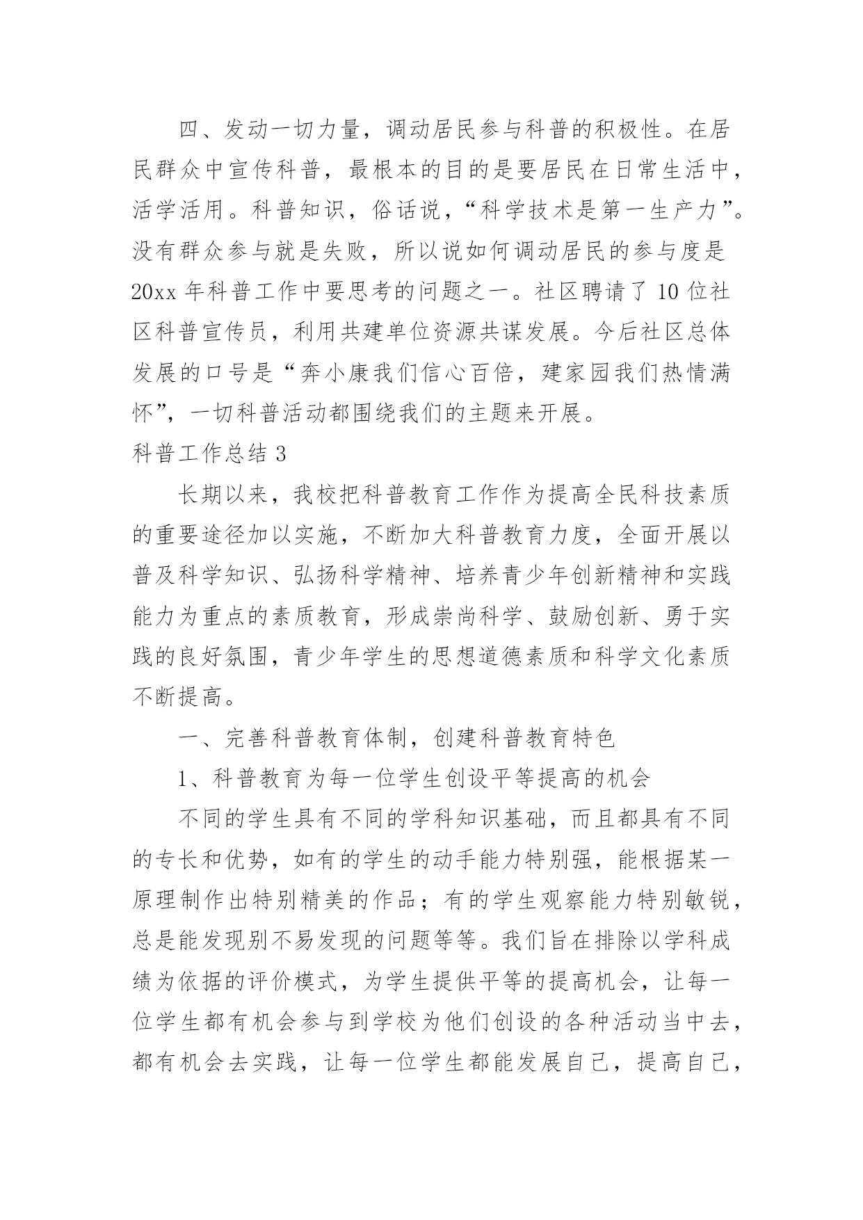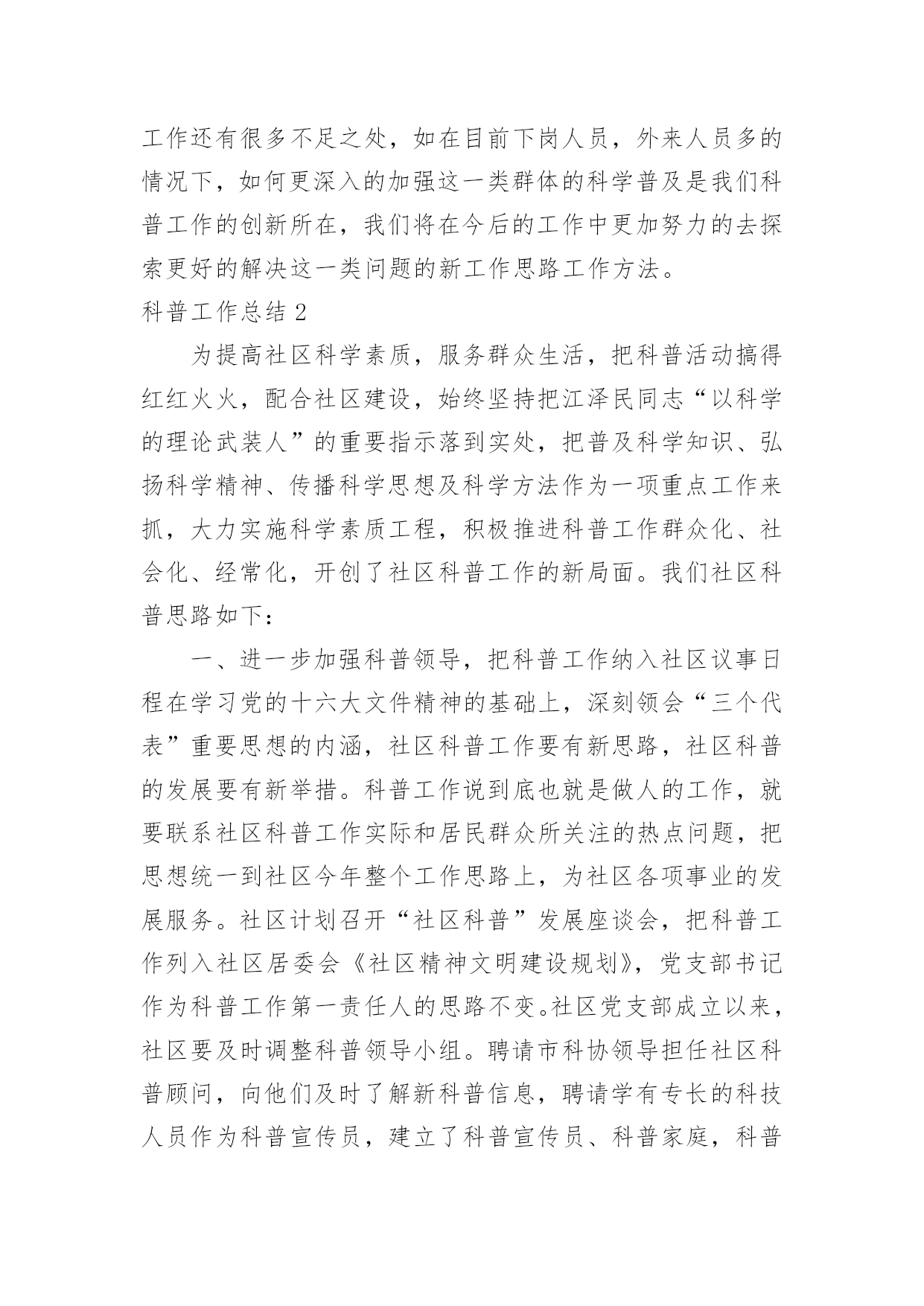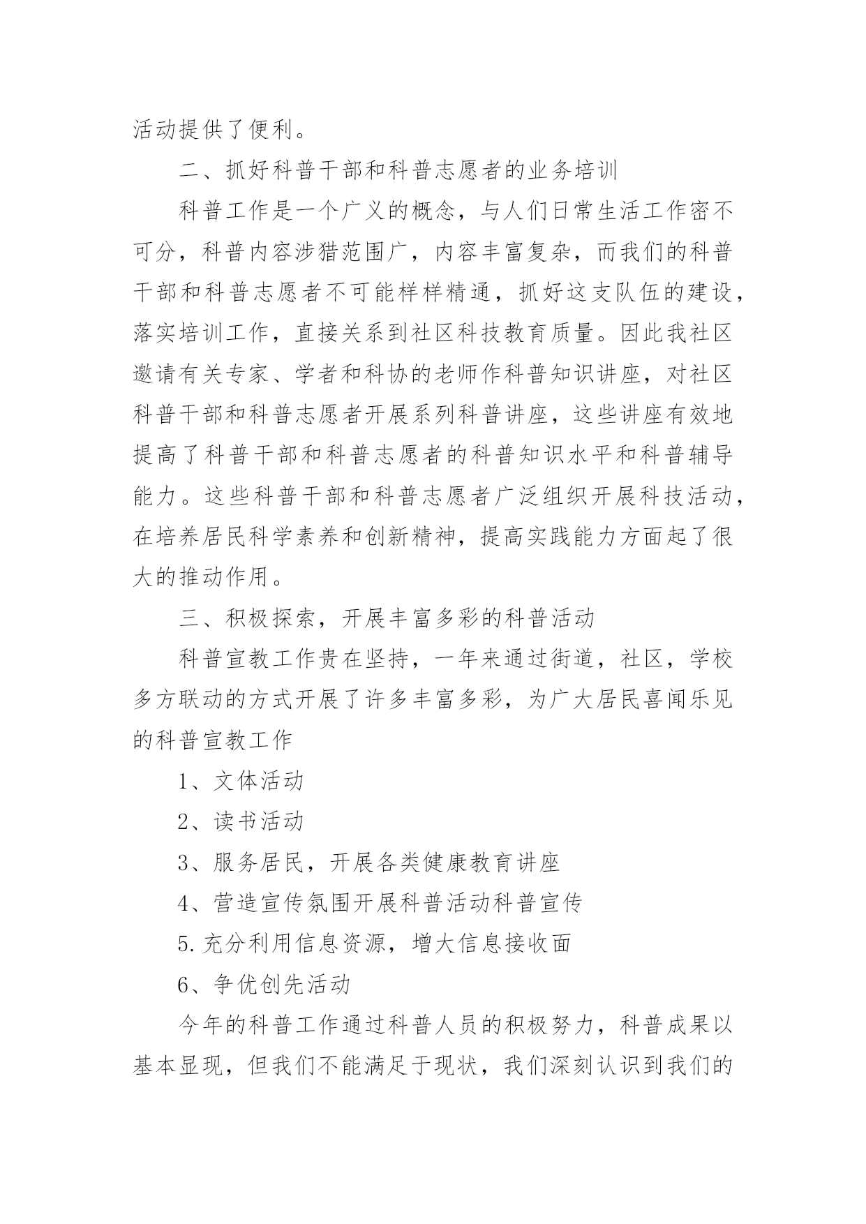 科普工作总结科普工作总结总结是指对某一阶段的工作、学习或思想中的经验或情况加以总结和概括的书面材料,它可以有效锻炼我们的语言组织能力,让我们抽出时间写写总结吧。那么总结要注意有什么内容呢?下面是小编整理的科普工作总结,希望能够帮助到大家。科普工作总结1一、领导重视,加大投入,营造良好的科普宣教氛围。经过一年来的科普宣传教育,尊重知识,尊重人才,尊重科学在社区上下已蔚然成风,成为大家的共识。科普宣教工作是一项投入大,产出小的工作,但其直接影响到社区全面推进素质教育的质量。本着一切从居民出发的思想,一年来,社区在经费十分紧缺的情况下仍挤出有限的财力加强科普宣教工作的设施建设,一是建成高标准、有示范性的“科普居委”,不间断地举行各类科普活动,大大增加了科普普及教育面。年内,我们利用这些优良的硬件设施,举行了形式多样的活动并开办了各类辅导班。二是改造了社区图书馆总馆,扩大了图书馆面积,为社区各图书馆补充更新科普类图书。三是新增一个市民健身点,一个市民运动场,方便居民就近科学健身就近活动,为居民的体育健身活动提供了便利。二、抓好科普干部和科普志愿者的业务培训科普工作是一个广义的概念,与人们日常生活工作密不可分,科普内容涉猎范围广,内容丰富复杂,而我们的科普干部和科普志愿者不可能样样精通,抓好这支队伍的建设,落实培训工作,直接关系到社区科技教育质量。因此我社区邀请有关专家、学者和科协的老师作科普知识讲座,对社区科普干部和科普志愿者开展系列科普讲座,这些讲座有效地提高了科普干部和科普志愿者的科普知识水平和科普辅导能力。这些科普干部和科普志愿者广泛组织开展科技活动,在培养居民科学素养和创新精神,提高实践能力方面起了很大的推动作用。三、积极探索,开展丰富多彩的科普活动科普宣教工作贵在坚持,一年来通过街道,社区,学校多方联动的方式开展了许多丰富多彩,为广大居民喜闻乐见的科普宣教工作1、文体活动2、读书活动3、服务居民,开展各类健康教育讲座4、营造宣传氛围开展科普活动科普宣传5.充分利用信息资源,增大信息接收面6、争优创先活动今年的科普工作通过科普人员的积极努力,科普成果以基本显现,但我们不能满足于现状,我们深刻认识到我们的工作还有很多不足之处,如在目前下岗人员,外来人员多的情况下,如何更深入的加强这一类群体的科学普及是我们科普工作的创新所在,我们将在今后的工作中更加努力的去探索更好的解决这一类问题的新工作思路工作方法。科普工作总结2为提高社区科学素质,服务群众生活,把科普活动搞得红红火火,配合社区建设,始终坚持把江泽民同志“以科学的理论武装人”的重要指示落到实处,把普及科学知识、弘扬科学精神、传播科学思想及科学方法作为一项重点工作来抓,大力实施科学素质工程,积极推进科普工作群众化、社会化、经常化,开创了社区科普工作的新局面。我们社区科普思路如下:一、进一步加强科普领导,把科普工作纳入社区议事日程在学习党的十六大文件精神的基础上,深刻领会“三个代表”重要思想的内涵,社区科普工作要有新思路,社区科普的发展要有新举措。科普工作说到底也就是做人的工作,就要联系社区科普工作实际和居民群众所关注的热点问题,把思想统一到社区今年整个工作思路上,为社区各项事业的发展服务。社区计划召开“社区科普”发展座谈会,把科普工作列入社区居委会《社区精神文明建设规划》,党支部书记作为科普工作第一责任人的思路不变。社区党支部成立以来,社区要及时调整科普领导小组。聘请市科协领导担任社区科普顾问,向他们及时了解新科普信息,聘请学有专长的科技人员作为科普宣传员,建立了科普宣传员、科普家庭,科普志愿者及科普技术辅导员等多位一体的科普宣传队伍。从而保证了科普工作天天有人抓、天天有人做,促进了社区科普工作向纵深发展。二、必要的科普硬件设备,是衡量社区科普工作发展的重要因素20xx年我划社区将逐步规范和提高社区的科普软硬件建设。计划投资1万余元来构建了科普工作的硬件体系,添置电视机、vcd等设备及科普图书等资料图片、科普报栏等科普陈地。同时在社区安置了30块文明标牌。三、丰富的科普活动,是体现社区科普生命力的决定因素如果说上面说的是社区科普工作的硬件,那么丰富多彩的科普活动就是20xx年社区要提升的科普软件。从几年来我们的经验表明,一系列设计合理,富有趣味的科普活动,总是让居民喜闻乐见的活动。配合日常开展的学习型社区、学习型家庭的创建,社区20xx年科普活动基本上为,“一月、一节、一日,一讲、两推进”。一月,就是新春的“科普、环保月”在这个活动中我们要举办四项活动;一节,就是社区科技文化节,居民在节日内,边娱乐边学习,办成居民增进交流,共同促进的盛会;一日,就是社区庆祝的世界第35个地球日;一讲,就是树谈“社区论建”为基础的《我谈科普》节目,社区将请来市科普工作专家,和大家面对面的谈科普