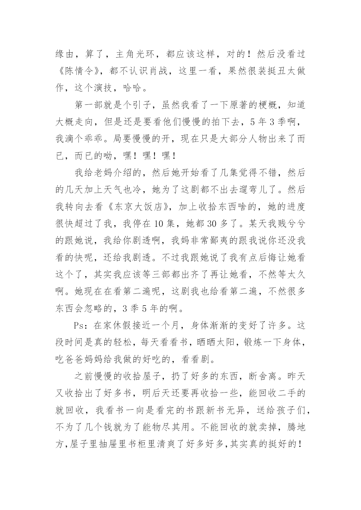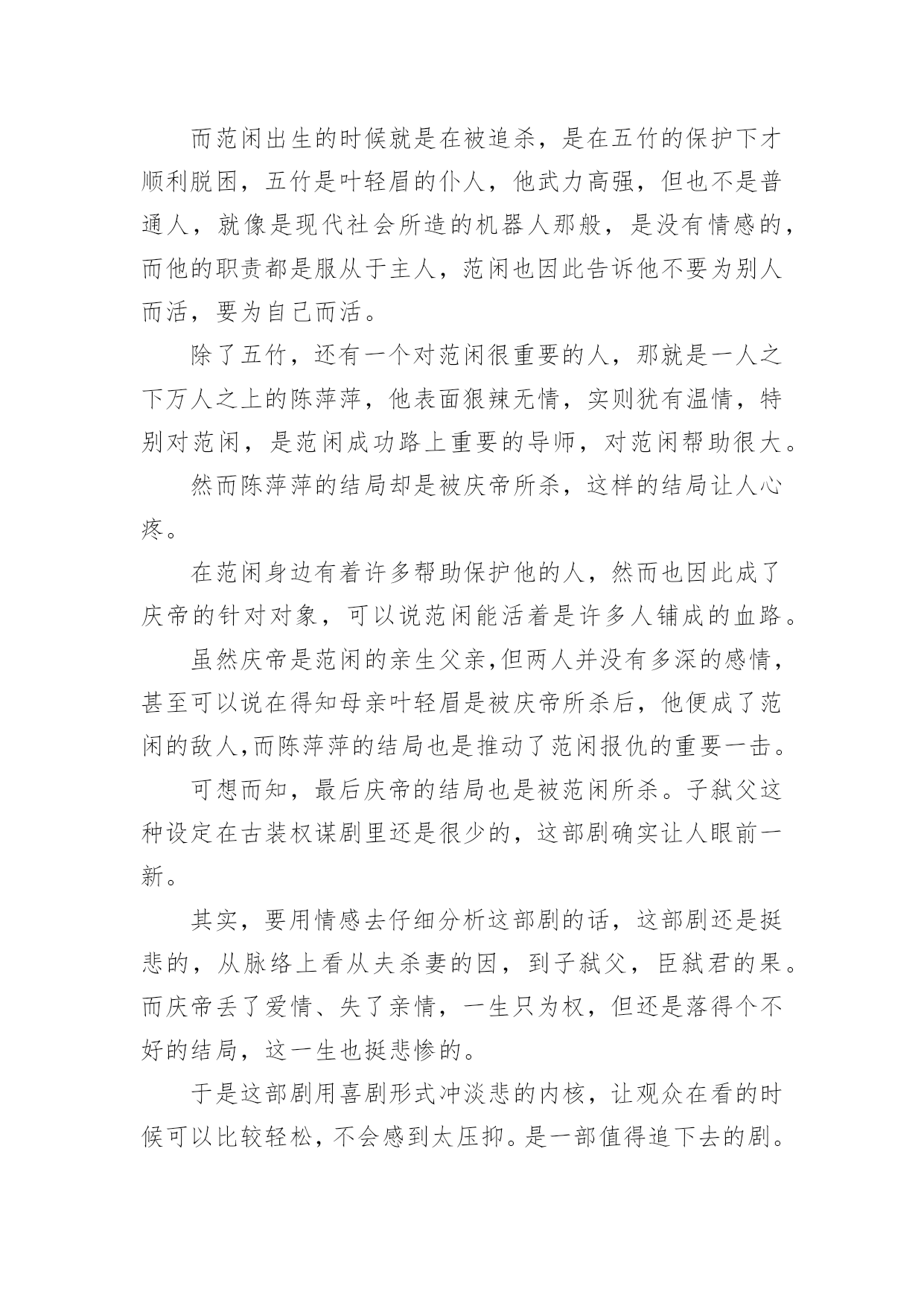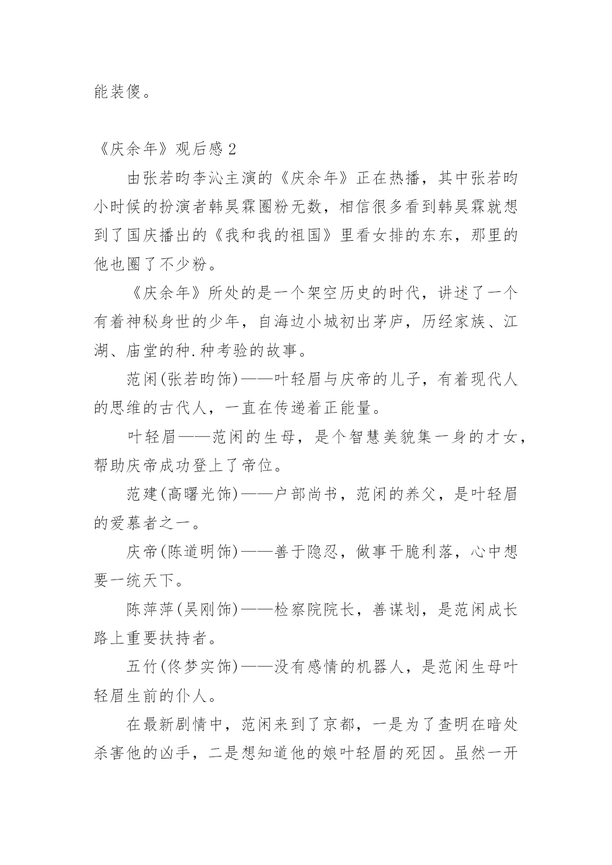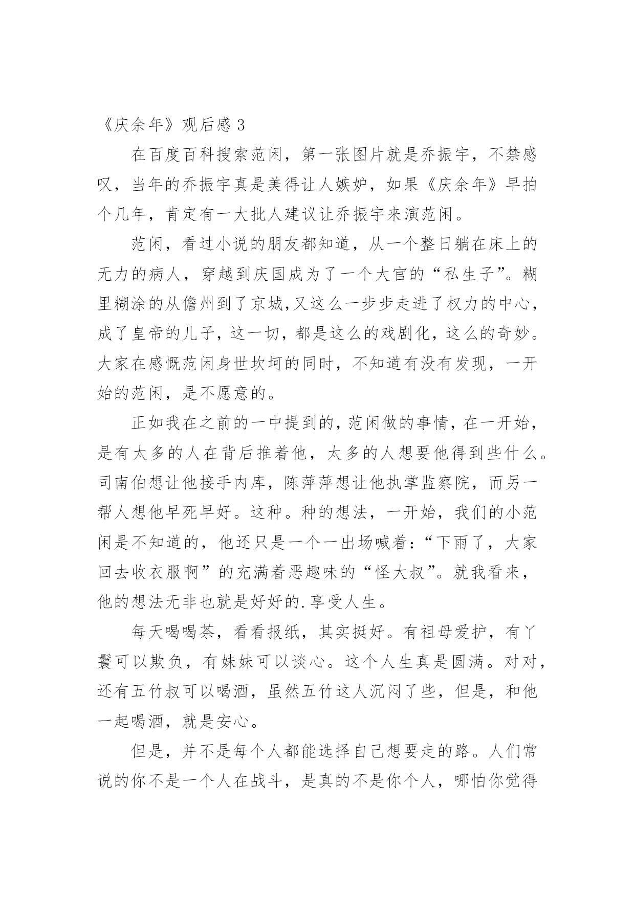 《庆余年》观后感1《庆余年》观后感看完某一作品后,对人生或者事物一定产生了许多感想吧,这时候,最关键的观后感怎么能落下!可能你现在毫无头绪吧,下面是小编为大家整理的《庆余年》观后感,欢迎大家借鉴与参考,希望对大家有所帮助。《庆余年》观后感1人太多,局太大,主角太开挂。这些人都什么脑子啊,怎么那么多阴谋诡计啊,妈妈和我身边的朋友都说我傻了吧唧还时常犯二,比不了比不了,哎。这片子让我最喜欢的其实是它里面时常出现的喜感,还挺逗乐的,不然实话说,太凝重了。虽然有些人不满意它突然出现的搞笑氛围,但是有点儿还是好的,别那么紧张别那么紧张!我其实是为了陈道明看的,然后演员里还有那么多人,我滴个乖乖,哈哈。以前一直觉得张若昀挺丑的,而且演戏有点装,这里面看多了,倒是也觉得还好。不过一个问题,范闲不是个文科生穿越过去的么,还会做肥皂还会做加湿器,么?而且这心思这计谋是无师自通的?遗传么?他老娘给他写的信不是明明说他也是穿越的,还是什么试验品而且是孤品么,所以哪里来的遗传?我对他开挂的能力表示没找到缘由,算了,主角光环,都应该这样,对的!然后没看过《陈情令》,都不认识肖战,这里一看,果然很装挺丑太做作,这个演技,哈哈。第一部就是个引子,虽然我看了一下原著的梗概,知道大概走向,但是还是要看他们慢慢的拍下去,5年3季啊,我滴个乖乖。局要慢慢的开,现在只是大部分人物出来了而已,而已的呦,嘿!嘿!嘿!我给老妈介绍的,然后她开始看了几集觉得不错,然后的几天加上天气也冷,她为了这剧都不出去遛弯儿了。然后我转向去看《东京大饭店》,加上收拾东西啥的,她的进度很快超过了我,我停在10集,她都30多了。某天我贱兮兮的跟她说,我给你剧透啊,我妈非常鄙夷的跟我说你还没我看的快呢,还给我剧透。不过我跟她说了我有点后悔让她看这个了,其实我应该等三部都出齐了再让她看,不然等太久啊。她现在在看第二遍呢,这剧我也给看第二遍,不然很多东西会忽略的,3季5年的啊。Ps:在家休假接近一个月,身体渐渐的变好了许多。这段时间是真的轻松,每天看看书,晒晒太阳,锻炼一下身体,吃爸爸妈妈给我做的好吃的,看看剧。之前慢慢的收拾屋子,扔了好多的东西,断舍离。昨天又收拾出了好多书,明后天还要再收拾一些,能回收二手的就回收,我看书一向是看完的书跟新书无异,送给孩子们,不为了几个钱就为了能物尽其用。不能回收的就卖掉,腾地方,屋子里抽屉里书柜里清爽了好多好多,其实真的挺好的!继续休息,老妈昨天还跟我说今年你别上班了,咱俩出去玩儿吧。一向是觉得我们在互联网上班的人就是每天玩儿玩儿电脑,上下班悠闲的坐地铁,风吹不着雨淋不着,上班不累还挣钱多的老爸,以前一直说我矫情娇气不能吃苦,而且觉得211、985的学生属于满大街都是我的学历一点不值钱没人要,肯定一直混在公司最底层,最近好像也终于了解点了我的疾苦,居然在我回家后的某天,跟我说累了身体不好就休息,一年半载的,三年五年的,十年八年的都成,呆着呗,又不至于吃不上饭。呵呵,突然变得体贴的他,还真是让人不习惯,哈哈。我的假期,不知道到哪一天,但不会是最近的一天,我累了,还没歇够。原来公司的某个我挺讨厌的人,不要再找我了,好烦啊,我离职一个多月了。之前就是有点小屁事就来找我,问我怎么办,没完没了的。不想和某著名互联网公司合作,怎么拒绝,和我有什么关系?缠着我说怎么给领导回复啊,我这么写行不行啊,那样行不行啊,我讲了好几次终于烦了,说这是你的事儿别找我了,我累了不想想事情了,结果我回家还给我发消息说我这么写行不行啊之类的。你能再怂点么,也是一个部门的Leader,掌管挺大一块业务,你能显得再没本事一点儿么,烦死了,我离职一个月了还问我的意见让我给你抉择业务的事情怎么办怎么办怎么办。问题是,我走后你自己做了什么心里没数么,有本事做恶心的事怎么还有脸来找我帮忙,我现在真是不太明白,你到底是真没脑子还是太能装傻。《庆余年》观后感2由张若昀李沁主演的《庆余年》正在热播,其中张若昀小时候的扮演者韩昊霖圈粉无数,相信很多看到韩昊霖就想到了国庆播出的《我和我的祖国》里看女排的东东,那里的他也圈了不少粉。《庆余年》所处的是一个架空历史的时代,讲述了一个有着神秘身世的少年,自海边小城初出茅庐,历经家族、江湖、庙堂的种.种考验的故事。范闲(张若昀饰)——叶轻眉与庆帝的儿子,有着现代人的思维的古代人,一直在传递着正能量。叶轻眉——范闲的生母,是个智慧美貌集一身的才女,帮助庆帝成功登上了帝位。范建(高曙光饰)——户部尚书,范闲的养父,是叶轻眉的爱慕者之一。庆帝(陈道明饰)——善于隐忍,做事干脆利落,心中想要一统天下。陈萍萍(吴刚饰)——检察院院长,善谋划,是范闲成长路上重要扶持者。五竹(佟梦实饰)——没有感情的机器人,是范闲生母叶轻眉生前的仆人。在最新剧情中,范闲来到了京都,一是为了查明在暗处