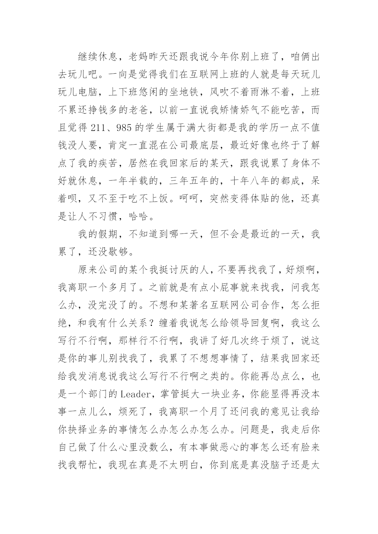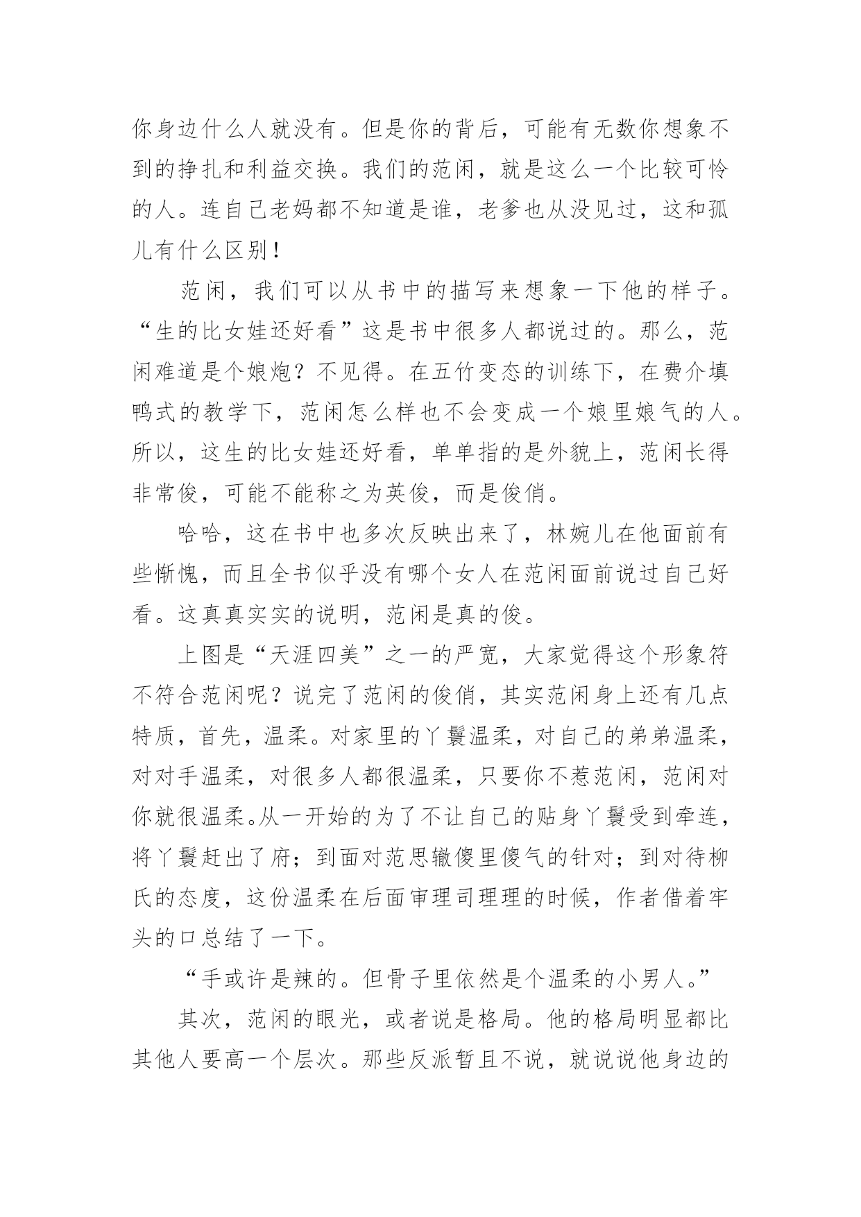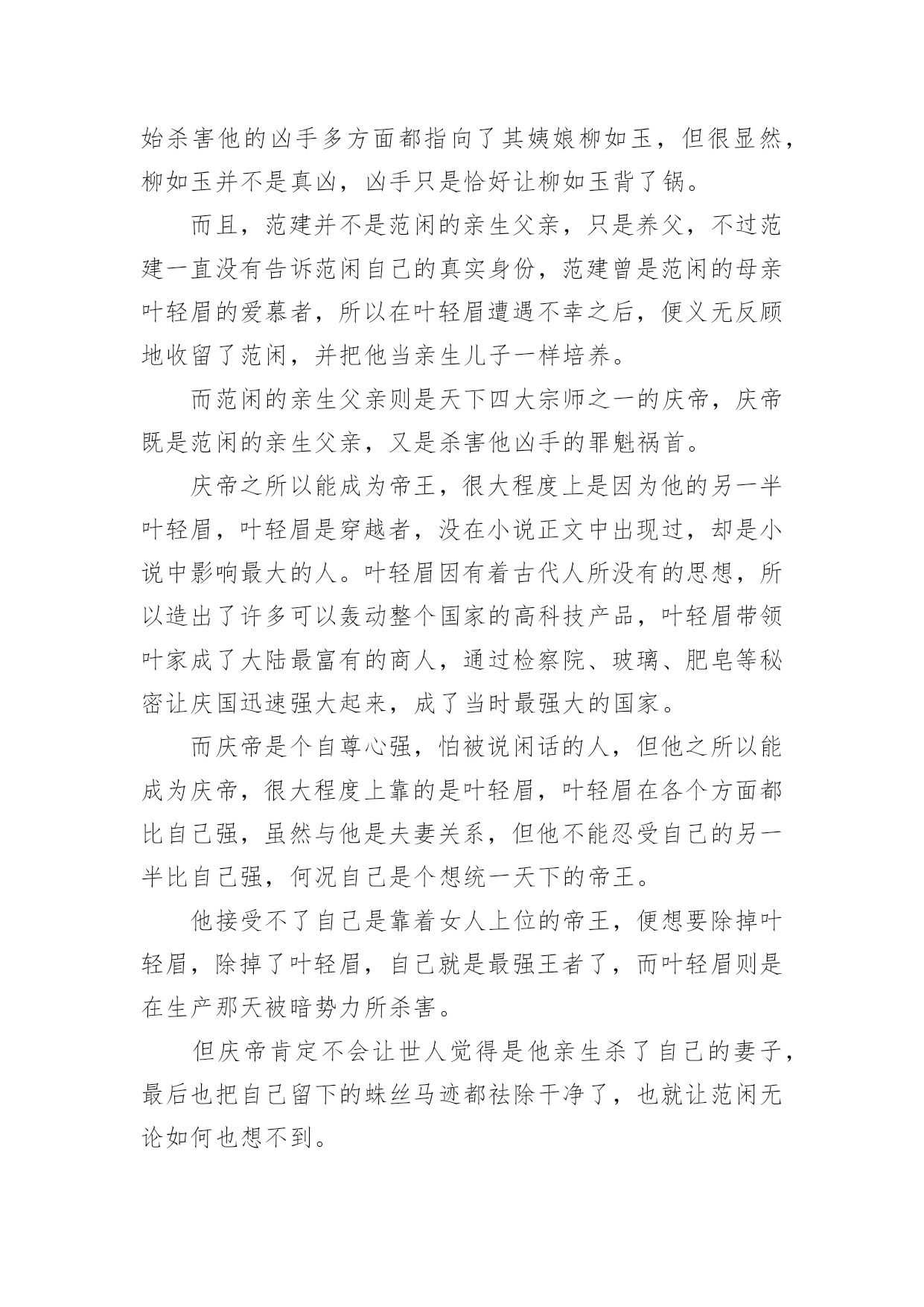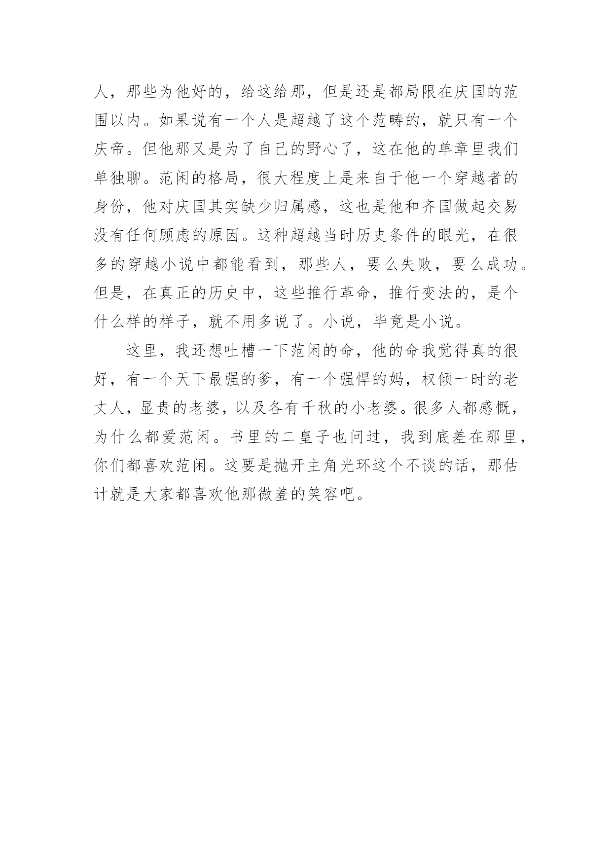《庆余年》观后感1《庆余年》观后感看完某一作品后,对人生或者事物一定产生了许多感想吧,这时候,最关键的观后感怎么能落下!可能你现在毫无头绪吧,下面是小编为大家整理的《庆余年》观后感,欢迎大家借鉴与参考,希望对大家有所帮助。《庆余年》观后感1人太多,局太大,主角太开挂。这些人都什么脑子啊,怎么那么多阴谋诡计啊,妈妈和我身边的朋友都说我傻了吧唧还时常犯二,比不了比不了,哎。这片子让我最喜欢的其实是它里面时常出现的喜感,还挺逗乐的,不然实话说,太凝重了。虽然有些人不满意它突然出现的搞笑氛围,但是有点儿还是好的,别那么紧张别那么紧张!我其实是为了陈道明看的,然后演员里还有那么多人,我滴个乖乖,哈哈。以前一直觉得张若昀挺丑的,而且演戏有点装,这里面看多了,倒是也觉得还好。不过一个问题,范闲不是个文科生穿越过去的么,还会做肥皂还会做加湿器,么?而且这心思这计谋是无师自通的?遗传么?他老娘给他写的信不是明明说他也是穿越的,还是什么试验品而且是孤品么,所以哪里来的遗传?我对他开挂的能力表示没找到缘由,算了,主角光环,都应该这样,对的!然后没看过《陈情令》,都不认识肖战,这里一看,果然很装挺丑太做作,这个演技,哈哈。第一部就是个引子,虽然我看了一下原著的梗概,知道大概走向,但是还是要看他们慢慢的拍下去,5年3季啊,我滴个乖乖。局要慢慢的开,现在只是大部分人物出来了而已,而已的呦,嘿!嘿!嘿!我给老妈介绍的,然后她开始看了几集觉得不错,然后的几天加上天气也冷,她为了这剧都不出去遛弯儿了。然后我转向去看《东京大饭店》,加上收拾东西啥的,她的进度很快超过了我,我停在10集,她都30多了。某天我贱兮兮的跟她说,我给你剧透啊,我妈非常鄙夷的跟我说你还没我看的快呢,还给我剧透。不过我跟她说了我有点后悔让她看这个了,其实我应该等三部都出齐了再让她看,不然等太久啊。她现在在看第二遍呢,这剧我也给看第二遍,不然很多东西会忽略的,3季5年的啊。Ps:在家休假接近一个月,身体渐渐的变好了许多。这段时间是真的轻松,每天看看书,晒晒太阳,锻炼一下身体,吃爸爸妈妈给我做的好吃的,看看剧。之前慢慢的收拾屋子,扔了好多的东西,断舍离。昨天又收拾出了好多书,明后天还要再收拾一些,能回收二手的就回收,我看书一向是看完的书跟新书无异,送给孩子们,不为了几个钱就为了能物尽其用。不能回收的就卖掉,腾地方,屋子里抽屉里书柜里清爽了好多好多,其实真的挺好的!继续休息,老妈昨天还跟我说今年你别上班了,咱俩出去玩儿吧。一向是觉得我们在互联网上班的人就是每天玩儿玩儿电脑,上下班悠闲的坐地铁,风吹不着雨淋不着,上班不累还挣钱多的老爸,以前一直说我矫情娇气不能吃苦,而且觉得211、985的学生属于满大街都是我的学历一点不值钱没人要,肯定一直混在公司最底层,最近好像也终于了解点了我的疾苦,居然在我回家后的某天,跟我说累了身体不好就休息,一年半载的,三年五年的,十年八年的都成,呆着呗,又不至于吃不上饭。呵呵,突然变得体贴的他,还真是让人不习惯,哈哈。我的假期,不知道到哪一天,但不会是最近的一天,我累了,还没歇够。原来公司的某个我挺讨厌的人,不要再找我了,好烦啊,我离职一个多月了。之前就是有点小屁事就来找我,问我怎么办,没完没了的。不想和某著名互联网公司合作,怎么拒绝,和我有什么关系?缠着我说怎么给领导回复啊,我这么写行不行啊,那样行不行啊,我讲了好几次终于烦了,说这是你的事儿别找我了,我累了不想想事情了,结果我回家还给我发消息说我这么写行不行啊之类的。你能再怂点么,也是一个部门的Leader,掌管挺大一块业务,你能显得再没本事一点儿么,烦死了,我离职一个月了还问我的意见让我给你抉择业务的事情怎么办怎么办怎么办。问题是,我走后你自己做了什么心里没数么,有本事做恶心的事怎么还有脸来找我帮忙,我现在真是不太明白,你到底是真没脑子还是太能装傻。《庆余年》观后感2由张若昀李沁主演的《庆余年》正在热播,其中张若昀小时候的扮演者韩昊霖圈粉无数,相信很多看到韩昊霖就想到了国庆播出的《我和我的祖国》里看女排的东东,那里的他也圈了不少粉。《庆余年》所处的是一个架空历史的时代,讲述了一个有着神秘身世的少年,自海边小城初出茅庐,历经家族、江湖、庙堂的种.种考验的故事。范闲(张若昀饰)——叶轻眉与庆帝的儿子,有着现代人的思维的古代人,一直在传递着正能量。叶轻眉——范闲的生母,是个智慧美貌集一身的才女,帮助庆帝成功登上了帝位。范建(高曙光饰)——户部尚书,范闲的养父,是叶轻眉的爱慕者之一。庆帝(陈道明饰)——善于隐忍,做事干脆利落,心中想要一统天下。陈萍萍(吴刚饰)——检察院院长,善谋划,是范闲成长路上重要扶持者。五竹(佟梦实饰)——没有感情的机器人,是范闲生母叶轻眉生前的仆人。在最新剧情中,范闲来到了京都,一是为了查明在暗处