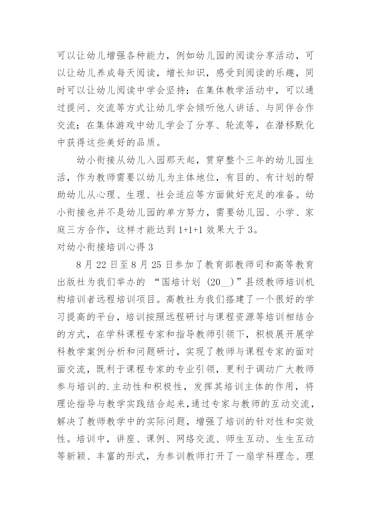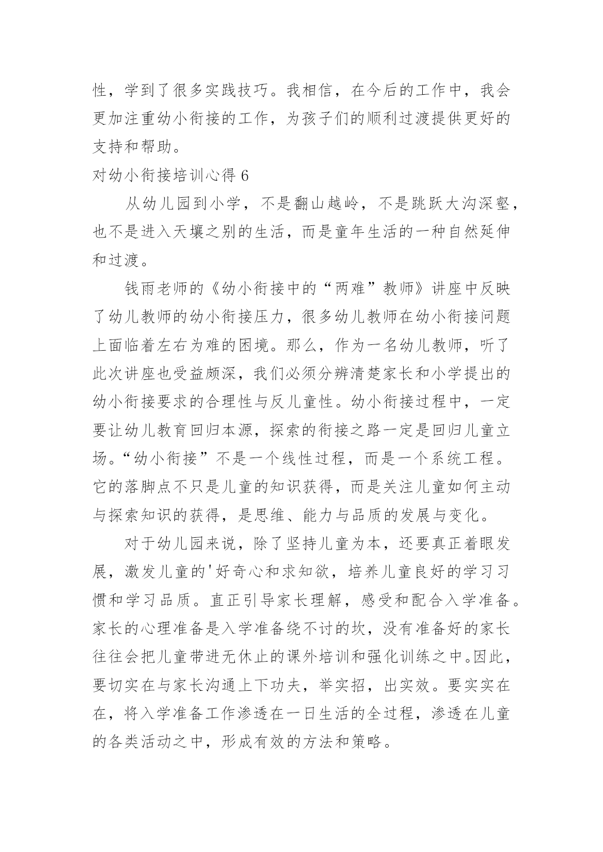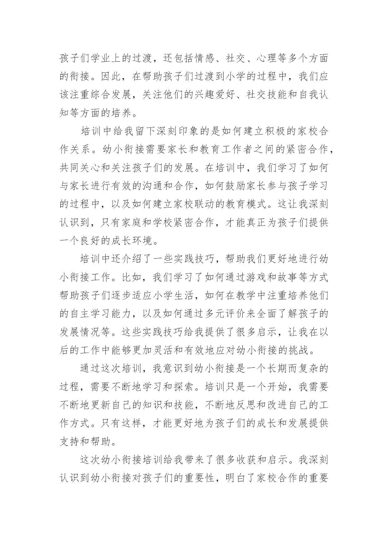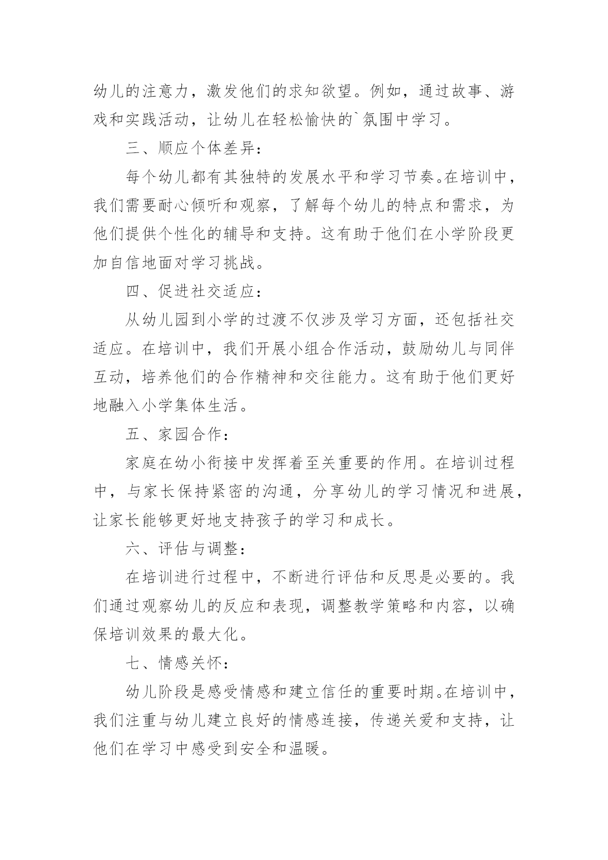 对幼小衔接培训心得对幼小衔接培训心得有了一些收获以后,常常可以将它们写成一篇心得体会,这样就可以通过不断总结,丰富我们的思想。是不是无从下笔、没有头绪?下面是小编为大家收集的对幼小衔接培训心得,仅供参考,希望能够帮助到大家。对幼小衔接培训心得1引言:幼小衔接教育作为教育体制中的重要环节,旨在为孩子顺利过渡到小学阶段提供支持与指导。笔者在参与幼小衔接培训过程中,深刻感受到了其重要性与影响力。在这篇文章中,将详细阐述我在幼小衔接培训中所获得的经验和心得体会。一、了解幼儿成长特点:在幼小衔接培训中,我首先认识到了幼儿与小学生在身体、认知、社交等方面的差异。幼儿时期,孩子的注意力短暂,需要通过游戏和互动学习。因此,我们在培训中注重活动的趣味性和互动性,以保持幼儿的积极参与。二、培养学习兴趣:在培训中,我了解到激发幼儿的学习兴趣至关重要。通过丰富多彩的教学内容和趣味性的教学方法,我们能够吸引幼儿的注意力,激发他们的求知欲望。例如,通过故事、游戏和实践活动,让幼儿在轻松愉快的`氛围中学习。三、顺应个体差异:每个幼儿都有其独特的发展水平和学习节奏。在培训中,我们需要耐心倾听和观察,了解每个幼儿的特点和需求,为他们提供个性化的辅导和支持。这有助于他们在小学阶段更加自信地面对学习挑战。四、促进社交适应:从幼儿园到小学的过渡不仅涉及学习方面,还包括社交适应。在培训中,我们开展小组合作活动,鼓励幼儿与同伴互动,培养他们的合作精神和交往能力。这有助于他们更好地融入小学集体生活。五、家园合作:家庭在幼小衔接中发挥着至关重要的作用。在培训过程中,与家长保持紧密的沟通,分享幼儿的学习情况和进展,让家长能够更好地支持孩子的学习和成长。六、评估与调整:在培训进行过程中,不断进行评估和反思是必要的。我们通过观察幼儿的反应和表现,调整教学策略和内容,以确保培训效果的最大化。七、情感关怀:幼儿阶段是感受情感和建立信任的重要时期。在培训中,我们注重与幼儿建立良好的情感连接,传递关爱和支持,让他们在学习中感受到安全和温暖。八、持续学习与更新:教育领域不断发展变化,我们需要不断学习更新知识和教学方法。通过参加教育研讨会、交流活动,我们能够获取更多的教育资源和经验,不断提升自己的教育专业素养。结语:在幼小衔接培训中,我体会到了教育的美好和挑战。通过了解幼儿的特点,培养学习兴趣,顺应个体差异,促进社交适应,家园合作,评估与调整,情感关怀,持续学习与更新等方面的经验,我更加坚信,为孩子提供一个良好的幼小衔接环境,能够为他们的成长奠定坚实的基础,让他们在未来的学习生涯中更加出色。对幼小衔接培训心得2幼小衔接就是幼儿园教育与小学教育衔接,也是幼儿在其发展过程中所面临的一个重大的转折期,如果处理不好,就会对幼儿今后的发展带来不利的影响,其核心就是这年龄段幼儿的怎样有效的从思维方式、学习习惯、社会技能等方面适应小学生活,顺利实现幼小衔接。近期国家密集出台了一系列有关教育的政策文件,如双减、幼小衔接以及家庭教育促进法等,旨在以高质量发展为基础教育阶段的目标追求,努力重构基础教育的新生态,在全社会营造一种尊重儿童、保卫儿童的良好氛围,从而促进每一个儿童身心健康成长,还儿童一个幸福快乐的童年。提到幼小衔接大部分人理解的是学习文化知识,包括拼音、算数、古诗等,但其实幼小衔接教育从幼儿入园那天起,就已经开始进行。由于幼儿园教育和小学教育的性质不同,幼小衔接不光是知识量的增加,更重要的是激发幼儿对小学的向往,提高幼儿对小学的适应能力。作为幼儿园教育的实践者,通过讲座我想谈一谈我的体会。一、幼儿园教育方式以游戏为基本活动,保育结合让幼儿在直直接感知、实际操作、亲身体验中学习各类经验,虞永平教授说过:让幼儿动用各种感官,去探索、交往和表达让幼儿在活动中经验得到延伸、扩展。而小学教育注重知识的传授,课堂游戏性不够,这就使幼儿容易失去耐心,注意力分散。这就需要幼儿园教师逐渐向小学教育靠拢,根据幼儿的年龄特点,逐渐增加集体活动的时间,由小班的10-15分钟逐渐增加到大班的25-30分钟,同时通过游戏、手工等活动逐渐延长幼儿注意力的时间。二、幼小衔接可以说是无时无刻不再为幼儿进入小学做准备进入小学,幼儿需要生活上、学习上都养成良好的习惯养成、自我服务,人际交往、快速融入集体生活等。这就需要幼儿园教育培养幼儿的自我服务能力,包括根据天气增减衣物、整理自己的学习用品、书包,处理和同学的关系,遵守集体生活规则、建立集体荣誉感,养成合作、分享、谦让等良好社会品质,这些好的'习惯有助于幼儿快速适应小学生活。三、培养孩子的学习能力虽然幼儿园的教育方式以游戏为主,但是通过各种游戏可以让幼儿增强各种能力,例如幼儿园的阅读分享活动,可以让幼儿养成每天阅读,增长知识,感受到阅读的乐趣,同时可以让幼儿阅读中学会坚持;在集体教学
