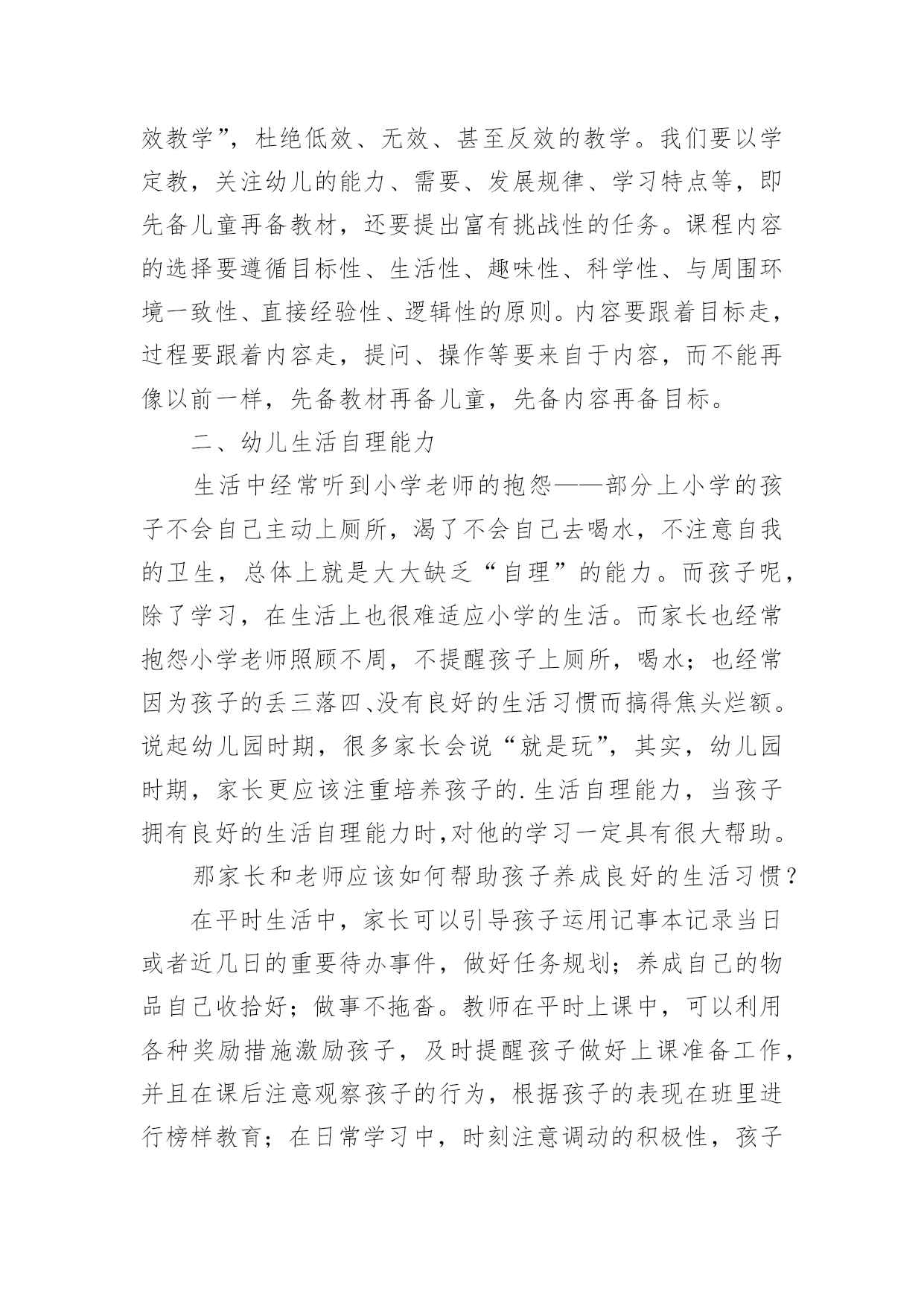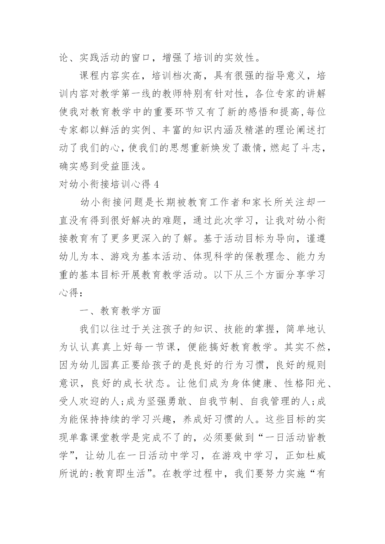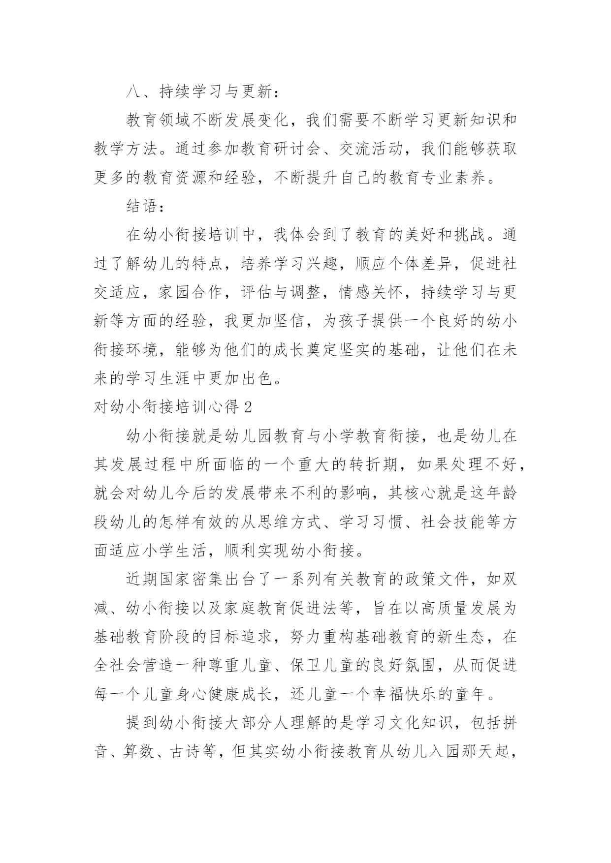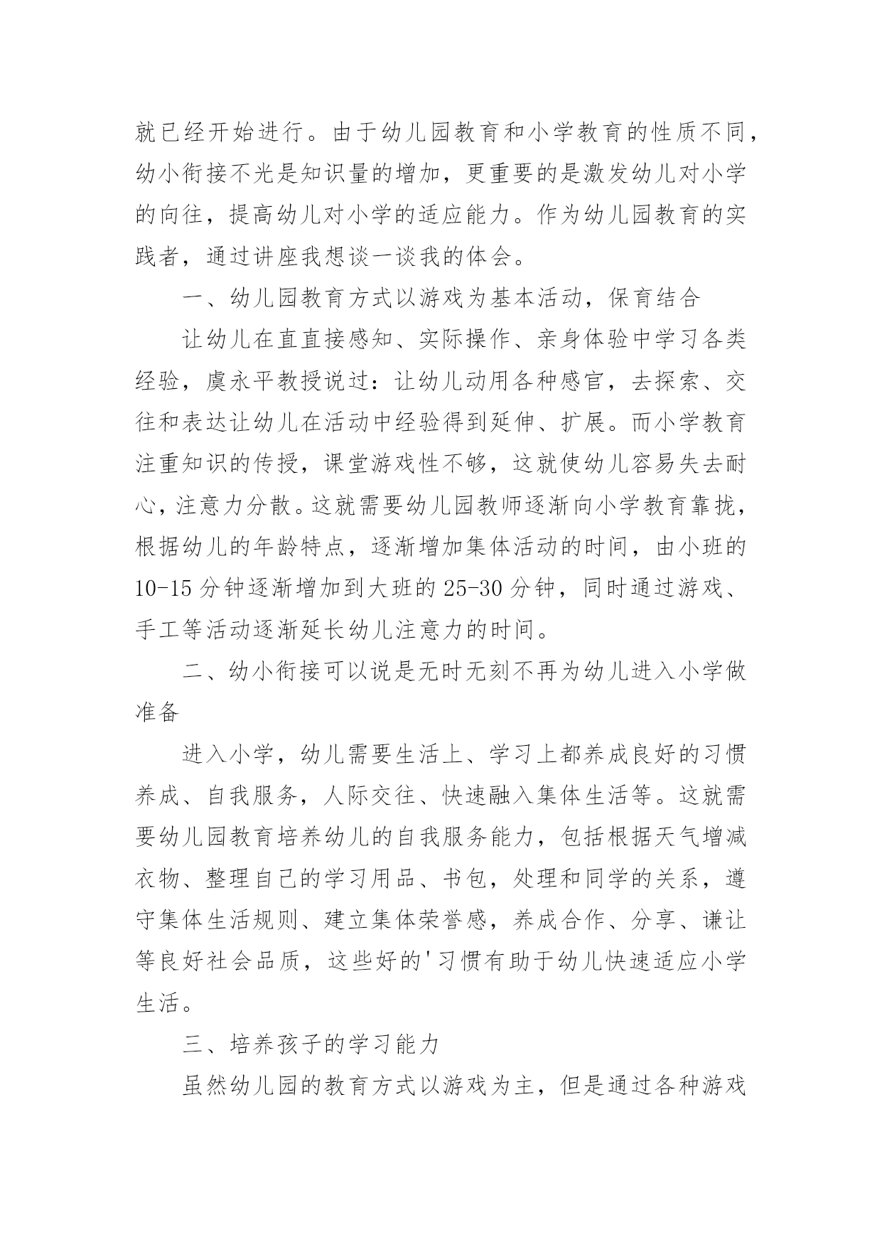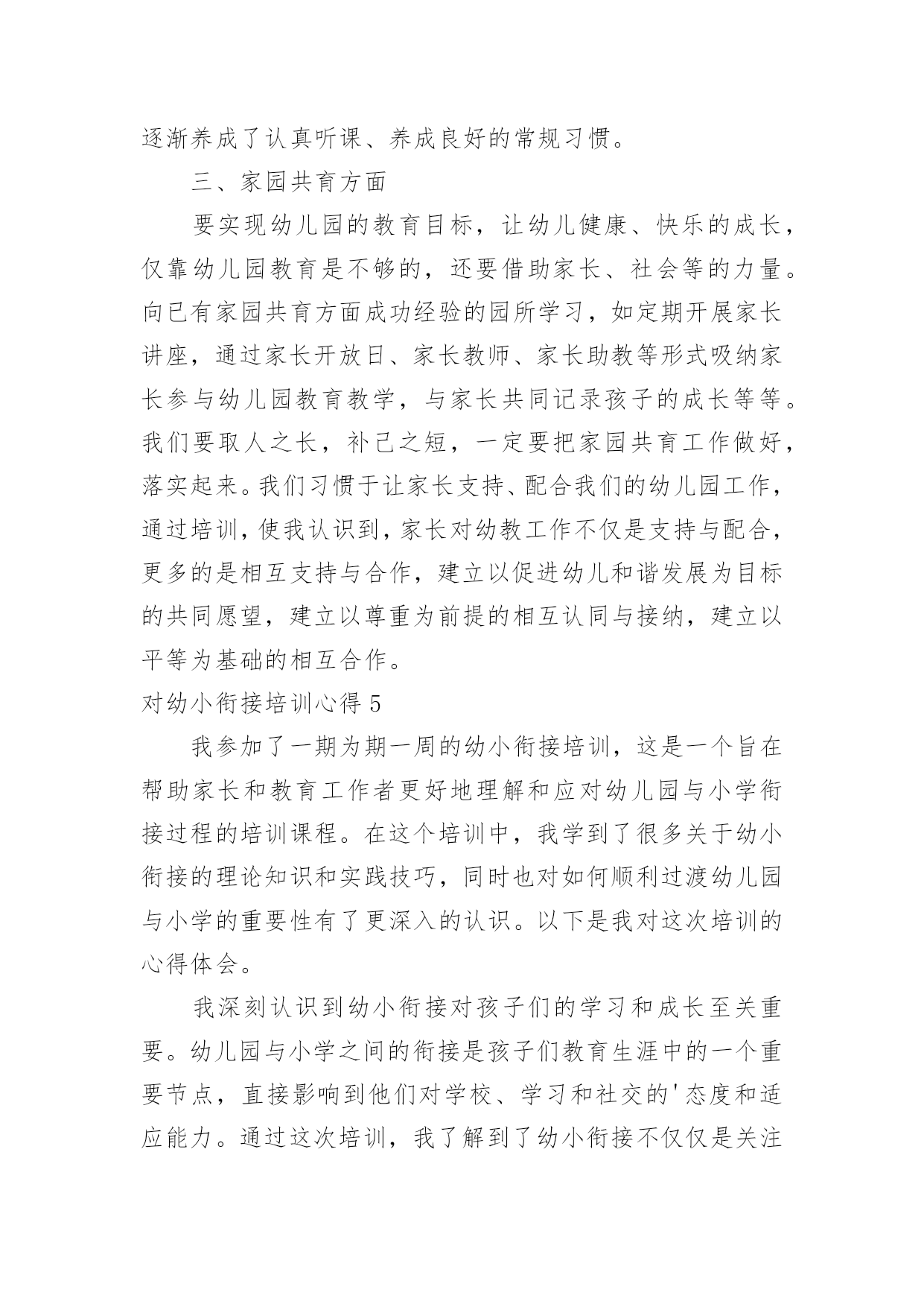 对幼小衔接培训心得对幼小衔接培训心得有了一些收获以后,常常可以将它们写成一篇心得体会,这样就可以通过不断总结,丰富我们的思想。是不是无从下笔、没有头绪?下面是小编为大家收集的对幼小衔接培训心得,仅供参考,希望能够帮助到大家。对幼小衔接培训心得1引言:幼小衔接教育作为教育体制中的重要环节,旨在为孩子顺利过渡到小学阶段提供支持与指导。笔者在参与幼小衔接培训过程中,深刻感受到了其重要性与影响力。在这篇文章中,将详细阐述我在幼小衔接培训中所获得的经验和心得体会。一、了解幼儿成长特点:在幼小衔接培训中,我首先认识到了幼儿与小学生在身体、认知、社交等方面的差异。幼儿时期,孩子的注意力短暂,需要通过游戏和互动学习。因此,我们在培训中注重活动的趣味性和互动性,以保持幼儿的积极参与。二、培养学习兴趣:在培训中,我了解到激发幼儿的学习兴趣至关重要。通过丰富多彩的教学内容和趣味性的教学方法,我们能够吸引幼儿的注意力,激发他们的求知欲望。例如,通过故事、游戏和实践活动,让幼儿在轻松愉快的`氛围中学习。三、顺应个体差异:每个幼儿都有其独特的发展水平和学习节奏。在培训中,我们需要耐心倾听和观察,了解每个幼儿的特点和需求,为他们提供个性化的辅导和支持。这有助于他们在小学阶段更加自信地面对学习挑战。四、促进社交适应:从幼儿园到小学的过渡不仅涉及学习方面,还包括社交适应。在培训中,我们开展小组合作活动,鼓励幼儿与同伴互动,培养他们的合作精神和交往能力。这有助于他们更好地融入小学集体生活。五、家园合作:家庭在幼小衔接中发挥着至关重要的作用。在培训过程中,与家长保持紧密的沟通,分享幼儿的学习情况和进展,让家长能够更好地支持孩子的学习和成长。六、评估与调整:在培训进行过程中,不断进行评估和反思是必要的。我们通过观察幼儿的反应和表现,调整教学策略和内容,以确保培训效果的最大化。七、情感关怀:幼儿阶段是感受情感和建立信任的重要时期。在培训中,我们注重与幼儿建立良好的情感连接,传递关爱和支持,让他们在学习中感受到安全和温暖。八、持续学习与更新:教育领域不断发展变化,我们需要不断学习更新知识和教学方法。通过参加教育研讨会、交流活动,我们能够获取更多的教育资源和经验,不断提升自己的教育专业素养。结语:在幼小衔接培训中,我体会到了教育的美好和挑战。通过了解幼儿的特点,培养学习兴趣,顺应个体差异,促进社交适应,家园合作,评估与调整,情感关怀,持续学习与更新等方面的经验,我更加坚信,为孩子提供一个良好的幼小衔接环境,能够为他们的成长奠定坚实的基础,让他们在未来的学习生涯中更加出色。对幼小衔接培训心得2幼小衔接就是幼儿园教育与小学教育衔接,也是幼儿在其发展过程中所面临的一个重大的转折期,如果处理不好,就会对幼儿今后的发展带来不利的影响,其核心就是这年龄段幼儿的怎样有效的从思维方式、学习习惯、社会技能等方面适应小学生活,顺利实现幼小衔接。近期国家密集出台了一系列有关教育的政策文件,如双减、幼小衔接以及家庭教育促进法等,旨在以高质量发展为基础教育阶段的目标追求,努力重构基础教育的新生态,在全社会营造一种尊重儿童、保卫儿童的良好氛围,从而促进每一个儿童身心健康成长,还儿童一个幸福快乐的童年。提到幼小衔接大部分人理解的是学习文化知识,包括拼音、算数、古诗等,但其实幼小衔接教育从幼儿入园那天起,就已经开始进行。由于幼儿园教育和小学教育的性质不同,幼小衔接不光是知识量的增加,更重要的是激发幼儿对小学的向往,提高幼儿对小学的适应能力。作为幼儿园教育的实践者,通过讲座我想谈一谈我的体会。一、幼儿园教育方式以游戏为基本活动,保育结合让幼儿在直直接感知、实际操作、亲身体验中学习各类经验,虞永平教授说过:让幼儿动用各种感官,去探索、交往和表达让幼儿在活动中经验得到延伸、扩展。而小学教育注重知识的传授,课堂游戏性不够,这就使幼儿容易失去耐心,注意力分散。这就需要幼儿园教师逐渐向小学教育靠拢,根据幼儿的年龄特点,逐渐增加集体活动的时间,由小班的10-15分钟逐渐增加到大班的25-30分钟,同时通过游戏、手工等活动逐渐延长幼儿注意力的时间。二、幼小衔接可以说是无时无刻不再为幼儿进入小学做准备进入小学,幼儿需要生活上、学习上都养成良好的习惯养成、自我服务,人际交往、快速融入集体生活等。这就需要幼儿园教育培养幼儿的自我服务能力,包括根据天气增减衣物、整理自己的学习用品、书包,处理和同学的关系,遵守集体生活规则、建立集体荣誉感,养成合作、分享、谦让等良好社会品质,这些好的'习惯有助于幼儿快速适应小学生活。三、培养孩子的学习能力虽然幼儿园的教育方式以游戏为主,但是通过各种游戏可以让幼儿增强各种能力,例如幼儿园的阅读分享活动,可以让幼儿养成每天阅读,增长知识,感受到阅读的乐趣,同时可以让幼儿阅读中学会坚持;在集体教学