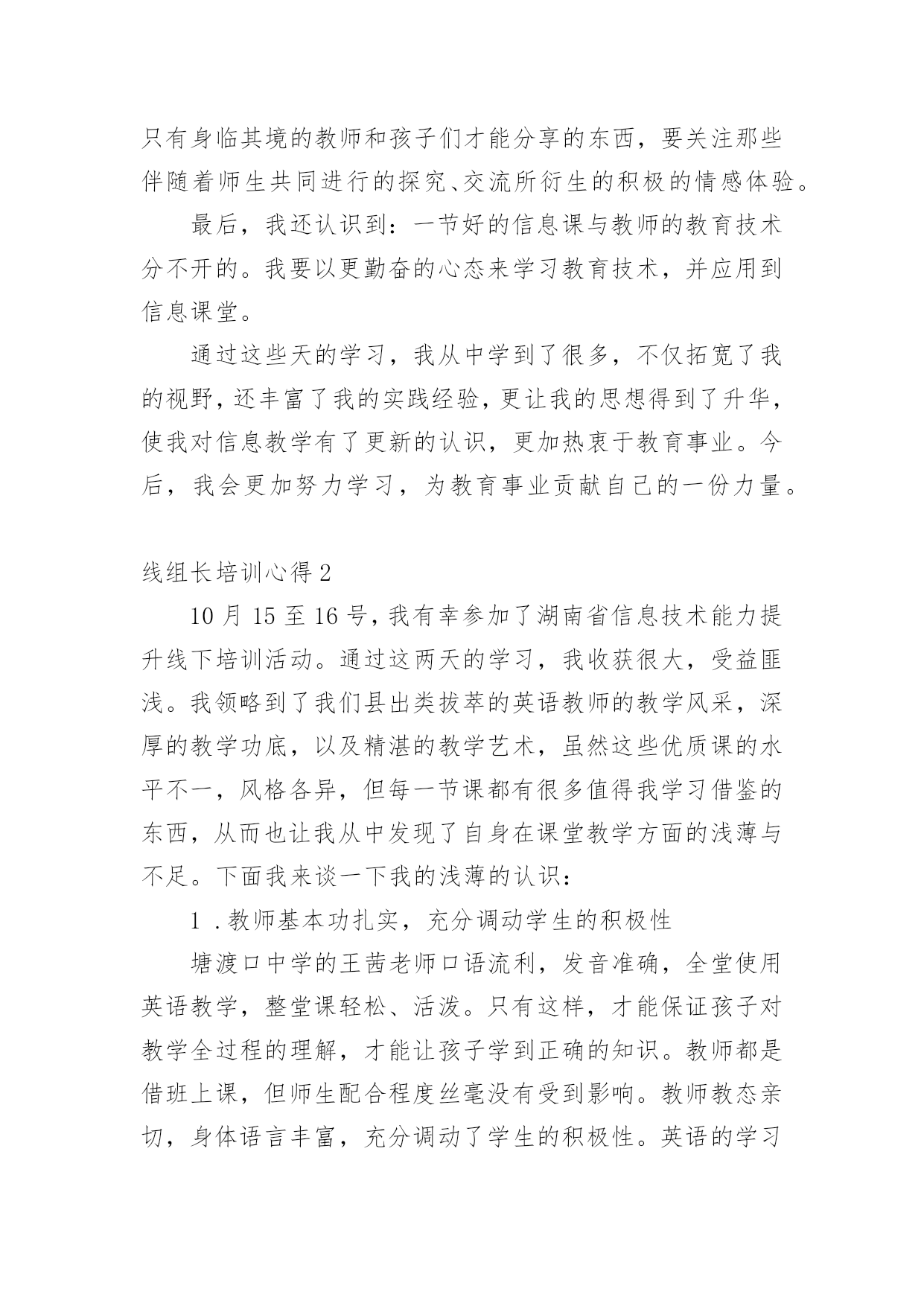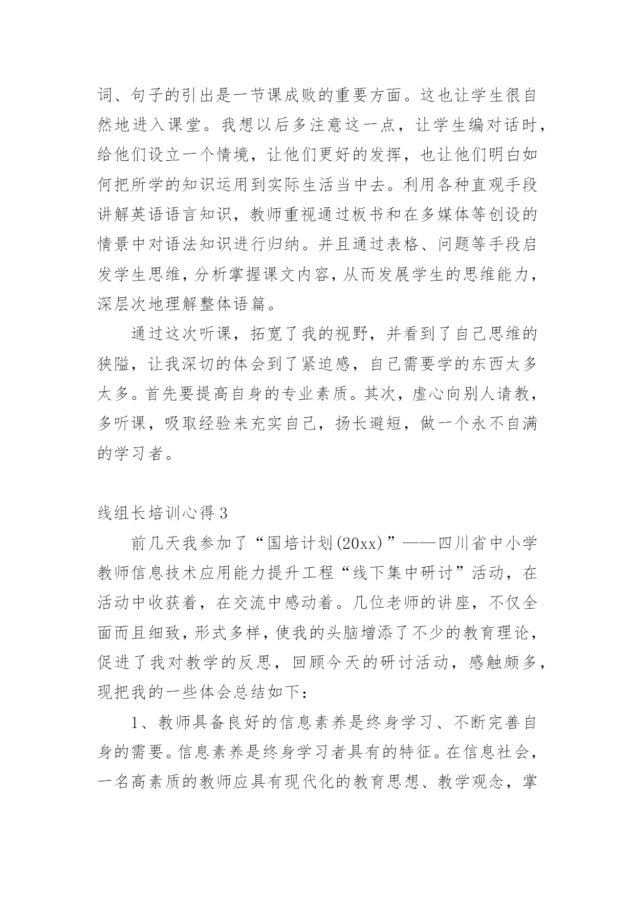 线组长培训心得线组长培训心得(热门)当我们心中积累了不少感想和见解时,马上将其记录下来,从而不断地丰富我们的思想。那么要如何写呢?以下是小编精心整理的线组长培训心得,欢迎大家分享。线组长培训心得1通过这次“国培计划”信息技术工作坊线下集中学习培训,使我提高了认识,理清了思路,学到了新的教育教学理念,找到了自身的差距和不足。我从中学习到了很多知识,而且在国培计划中有幸倾听了众多专家和学者的精彩讲解,使我对信息技术教学有了更多新的认识。经过这次的培训令我感触很大,下面将谈谈我的一些感受:本次培训给我许多思考,深刻的体会到自己有很多东西要去学习。怎样成为一个受欢迎的信息老师呢?怎样才能在教学过程中给学生营造一个良好的氛围,建立平等、民主、信任的新型师生关系?怎样才能?我认为要解决的问题还很多,还需要自己不断的积累,不断的去学习。首先,从爱出发,尊重学生。不论在生活上,还是在学习上,都要给予学生必要的关心和帮助。只要有了问题时及时处理,处理的方法得当,注意和学生沟通,学生就会信任你,喜欢你。其次,如何使我们的'信息课堂愈发显得真实、自然,只有身临其境的教师和孩子们才能分享的东西,要关注那些伴随着师生共同进行的探究、交流所衍生的积极的情感体验。最后,我还认识到:一节好的信息课与教师的教育技术分不开的。我要以更勤奋的心态来学习教育技术,并应用到信息课堂。通过这些天的学习,我从中学到了很多,不仅拓宽了我的视野,还丰富了我的实践经验,更让我的思想得到了升华,使我对信息教学有了更新的认识,更加热衷于教育事业。今后,我会更加努力学习,为教育事业贡献自己的一份力量。线组长培训心得210月15至16号,我有幸参加了湖南省信息技术能力提升线下培训活动。通过这两天的学习,我收获很大,受益匪浅。我领略到了我们县出类拔萃的英语教师的教学风采,深厚的教学功底,以及精湛的教学艺术,虽然这些优质课的水平不一,风格各异,但每一节课都有很多值得我学习借鉴的东西,从而也让我从中发现了自身在课堂教学方面的浅薄与不足。下面我来谈一下我的浅薄的认识:1.教师基本功扎实,充分调动学生的积极性塘渡口中学的王茜老师口语流利,发音准确,全堂使用英语教学,整堂课轻松、活泼。只有这样,才能保证孩子对教学全过程的理解,才能让孩子学到正确的知识。教师都是借班上课,但师生配合程度丝毫没有受到影响。教师教态亲切,身体语言丰富,充分调动了学生的积极性。英语的学习要求在语境中学习句子,在句子中学习单词。这就是说我们在教给学生一句话、一个词时还要给学生创设一定的情境,让学生学会在一定的情境中学会用句子、词语。所创设的情境如何即利于课文的导入,也利于重点单词、句子的引出是一节课成败的重要方面。这也让学生很自然地进入课堂。我想以后多注意这一点,让学生编对话时,给他们设立一个情境,让他们更好的发挥,也让他们明白如何把所学的知识运用到实际生活当中去。2.多媒体ppt课件的运用彰显教学特色。本次参加讲课的三位老师所制作的课件都是用幻灯片制作的,都非常富有创意,既形象又生动善于利用多媒体,使孩子接触到的知识更立体,更直观,更生动。现代化英语教学中,黑板已经不是传统意义上的.黑板了。挂图、投影仪、多媒体等的加入,使得黑板的内容更加丰富。此次活动,老师们都运用了多媒体这现代的教学工具,以鲜艳的色彩、活动的图像和有声的对话,让教学内容更形象化,给人一种赏心悦目的感觉,创造了一个轻松愉快的学习氛围。通过各种直观形象得图片来帮助学生加深对单词句型以及课文的理解,充分激发学生的学习兴趣,更有利于学生对所学知识的牢固掌握。3、高效的阅读课模式。大多数的老师都采用了大声朗读课文的方式,并呈现出阅读的方法及具体指导,培养学生好的阅读习惯。而且每个阅读环节都设有一定的任务,十一中的李晓霞老师的设计很有新意,每个环节都给学生设定一定难度得任务,任务由易到难特别恰当,并指出了难度指数,使阅读步步深入,让不同水平的学生都得到展示,这堂课没有想象中那么花哨,更多的是注重课文,注重基础知识。在精讲精练课文基础知识的前提下,进行相应的拓展延伸。由于前面将基础知识都夯实了,后面的拓展学生进行起来也就得心应手。正是这种“磨刀不误砍柴工”的远见,提高了整节课的课堂效率。也激发了学生的学习积极性,使得学生们读有所获。4、课堂体现了教为主导、学为主体的教学模式,让学生真正成为课堂的主人。这是新课标的重要特点,也是素质教育的要求。通过这次所听的三堂课我发现教师的教学理念都发生了转变,都树立了“以学生为主体”的教学理念。把整个课堂还给了学生,注重学生能力的培养,注重主体参与,并巧用本节课所学内容,激起了学生们对英语学习的兴趣,营造了宽松,民主,和谐的教与学的氛围,让学生真正成为了课堂的主人。5、创设教学情境,重知识的运用。塘渡口中学的刘姣老师非常重视在操