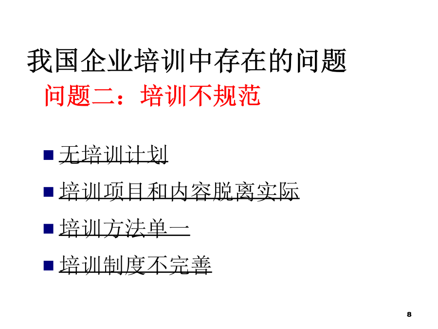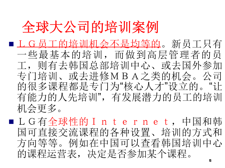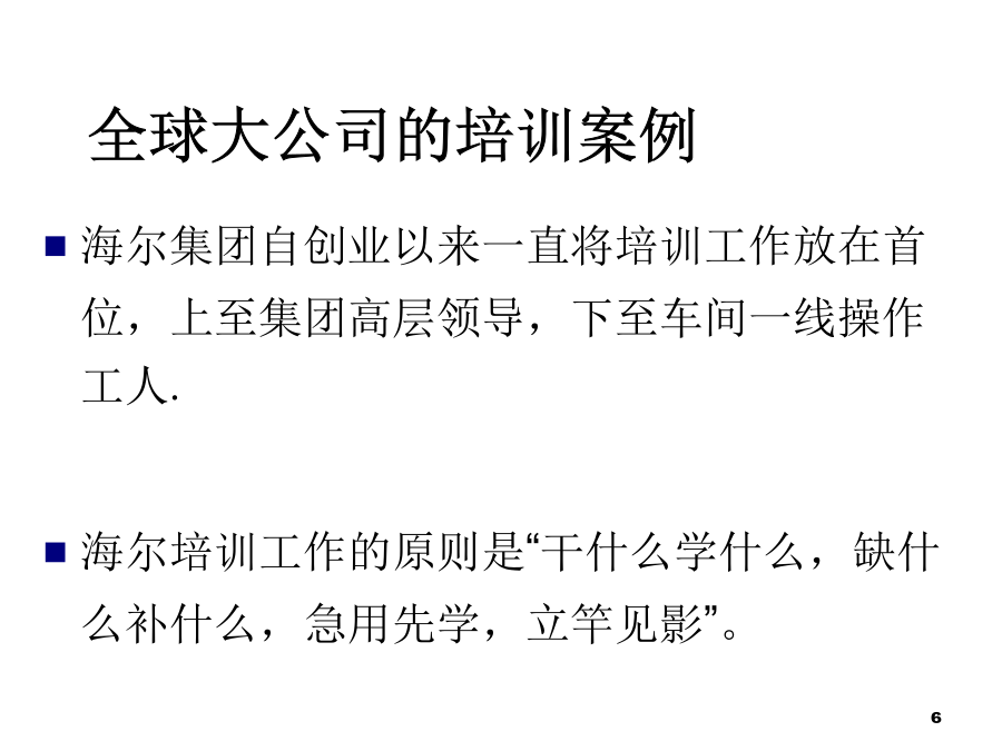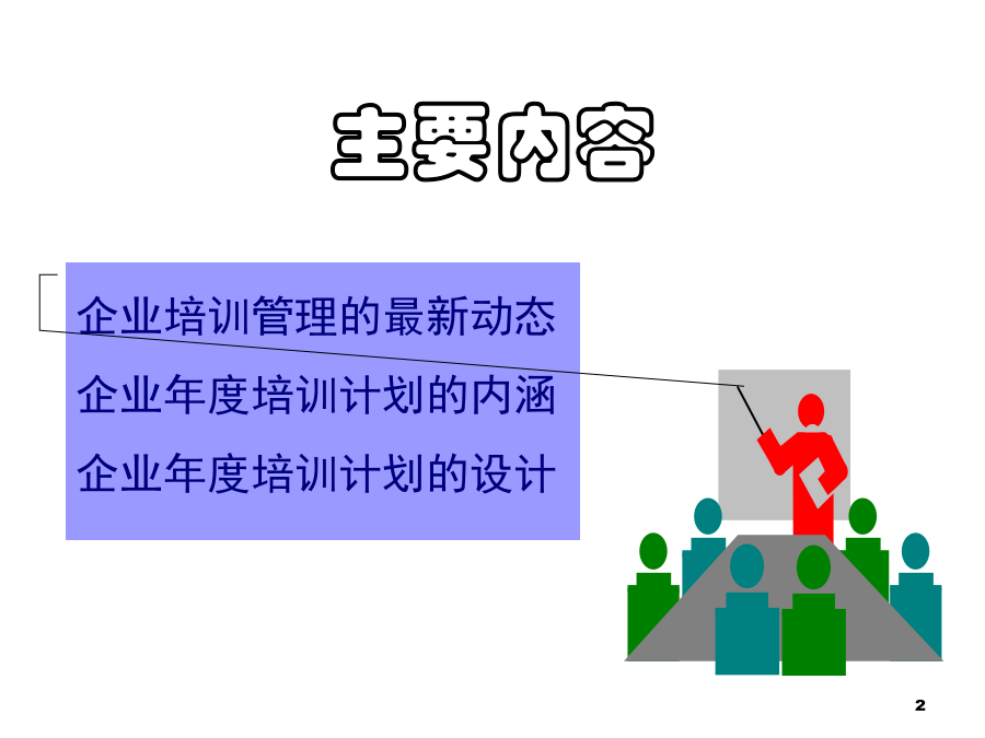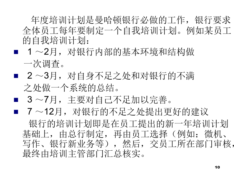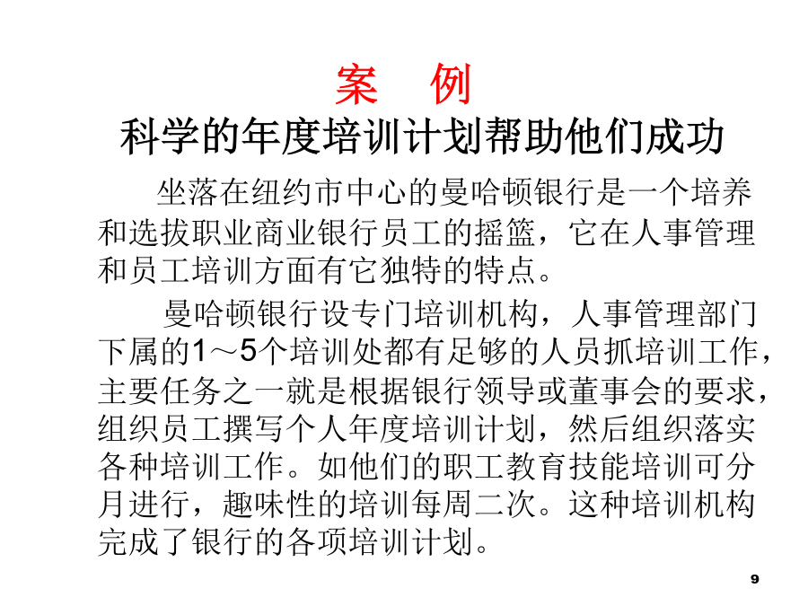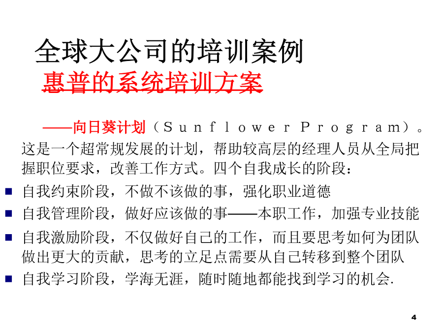 怎样设计企业年度培训计划主要内容企业培训管理的最新动态全球大公司的培训案例惠普的系统培训方案全球大公司的培训案例全球大公司的培训案例我国企业培训中存在的问题我国企业培训中存在的问题案例科学的年度培训计划帮助他们成功年度培训计划是曼哈顿银行必做的工作,银行要求全体员工每年要制定一个自我培训计划。例如某员工的自我培训计划:1~2月,对银行内部的基本环境和结构做一次调查。2~3月,对自身不足之处和对银行的不满之处做一个系统的总结。3~7月,主要对自己不足加以完善。7~12月,对银行的不足之处提出更好的建议银行的培训计划即是在员工提出的新一年培训计划基础上,由总行制定,再由员工选择(例如:微机、写作、银行新业务等),然后,交员工所在部门审核,最终由培训主管部门汇总核实。从以上的例子我们可以得知,培训开发计划的制定是一个复杂的系统工程。制定之前有许多需要考虑的因素,这些因素直接影响培训计划的质量和效果。今天,我们将专门讲述企业年度培训计划的制定。员工培训计划的概述二、年度培训计划的结构二、年度培训计划的结构二、年度培训计划的结构(一)培训目的主要说明员工为什么要进行培训。只有明确了培训目的才能确立员工培训的目标、范围、对象和内容,从根本上决定培训计划所涉及的各种资源投入的规模和程度。(二)培训的目标主要是解决员工应达到什么样的标准。它是根据培训的目的,结合培训资源配置的情况,将培训目的具体化、数量化、指标化和标准化。三、年度培训计划的主要内容(五)培训的规模培训的规模受很多因素影响,如人数、场所、培训的性质、工具以及费用等。(六)培训的时间培训的时间安排受培训的范围、对象、内容、方式和费用,以及其他与培训有关的因素影响。(七)培训的地点培训的地点一般都安排在学员接受培训所在地区和培训场所。如只针对个人的岗位技能培训,一般都安排在工作现场或车间等。(八)培训的费用1、直接培训成本。是指在培训组织实施过程中培训者与受训者的一切费用总和。如培训教师的费用、学员的往来交通、食宿费用、教师设备的租借费用等。2、间接培训费用。是指在培训组织实施过程之外企业所支付的一切费用总和。如培训项目的设计费用、培训项目的管理费用、培训对象受训期间的工资福利、以及培训项目的评估费用等。(九)培训的方法是实现员工培训计划各项目标的重要保障。倒底选择何种培训的方式方法应当由培训的目的、目标、对象、内容、经费以及其他条件来决定。(十)培训的教师企业培训应当以员工为中心,培训的管理工作应当以教师为主导。培训师即是培训活动的主导者,又是专业知识的传输者、专业技能的教练者。在培训过程中,教具、课件、教材、教室等资源配置再先进,如果培训师的水平不高,那么员工的培训也将难以达到和实现理想的境界和目标。(十一)计划的实施为了保证培训计划的顺利实施,培训计划还应提出具体的实施程序、步骤和组织措施。包括选好培训班的负责人及管理者,做好相关部门的协调工作,让受训者明确培训目的、要求、内容和程序,确保培训的时间、参加培训人数以及资金投入,定期进行评估,改进培训工作,保证教学质量的措施等等。四、制定年度培训计划的要求1、系统性四、制定年度培训计划的要求2、普遍性四、制定年度培训计划的要求3、有效性1、培训需求分析目标:明确员工现有技能水平和理想状态之间的差距。方法:测评现有成绩,估计它与理想水平的差距。2、工作岗位说明目标:收集有关新岗位和现有岗位要求的数据。方法:观察查阅有关报告文献。五、制定年度培训计划的程序五、制定年度培训计划的程序7、设计培训方法目标:根据培训的内容选择培训方法方式。方法:采用经验总结、小组讨论、专家咨询等多种形式提出具体对策。8、设计评估标准目标:选择测评的工具,明确评估的指标和标准。方法:采用模拟实验或聘请专家对测评工具、评估指标和标准进行初步评价9、实验验证目标:对培训计划的评析,发现其优缺点,并进行改进。方法:征求多方意见或进行实验试点,进行诊断,找出问题并修改完善。六、制定培训规划应注意的问题2、确定具体项目的子目标实施过程时间跨度实施步骤工作要求评估方法六、制定培训规划应注意的问题4、进行综合平衡(1)在培训投资与人力资源规划之间的平衡(2)在企业正常生产与培训项目之间的平衡(3)在员工培训需求与师资来源之间的平衡(4)在员工培训与职业生涯规划之间的平衡(5)在培训项目与培训完成期限之间的平衡七、年度培训计划书的编制七、年度培训计划书的编写表—4培训项目计划书八、年度培训计划表的制定表-5年度培训计划表(二)年度轮岗培训计划表(二)年度轮岗培训计划表表—6年度轮岗培训计划表(三)年度专题(专业)培训计划表表-7团结精神培训计划表举办