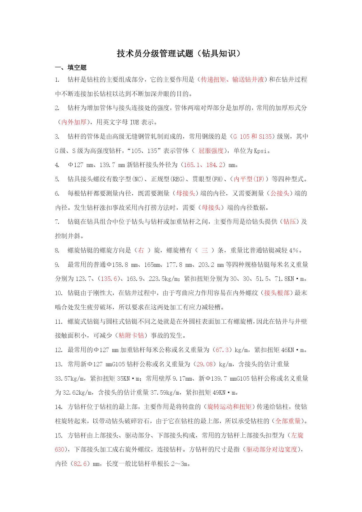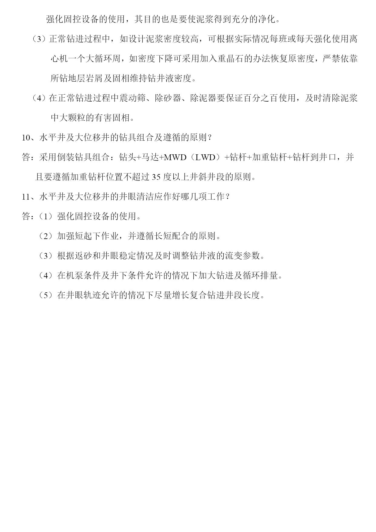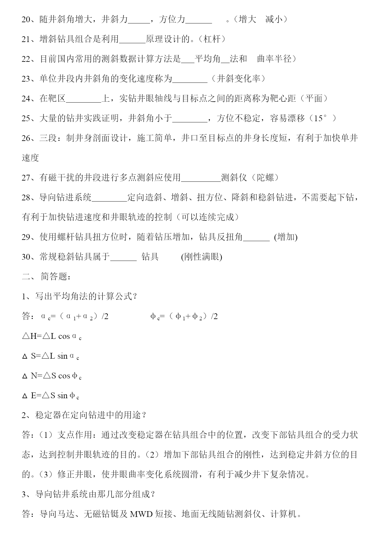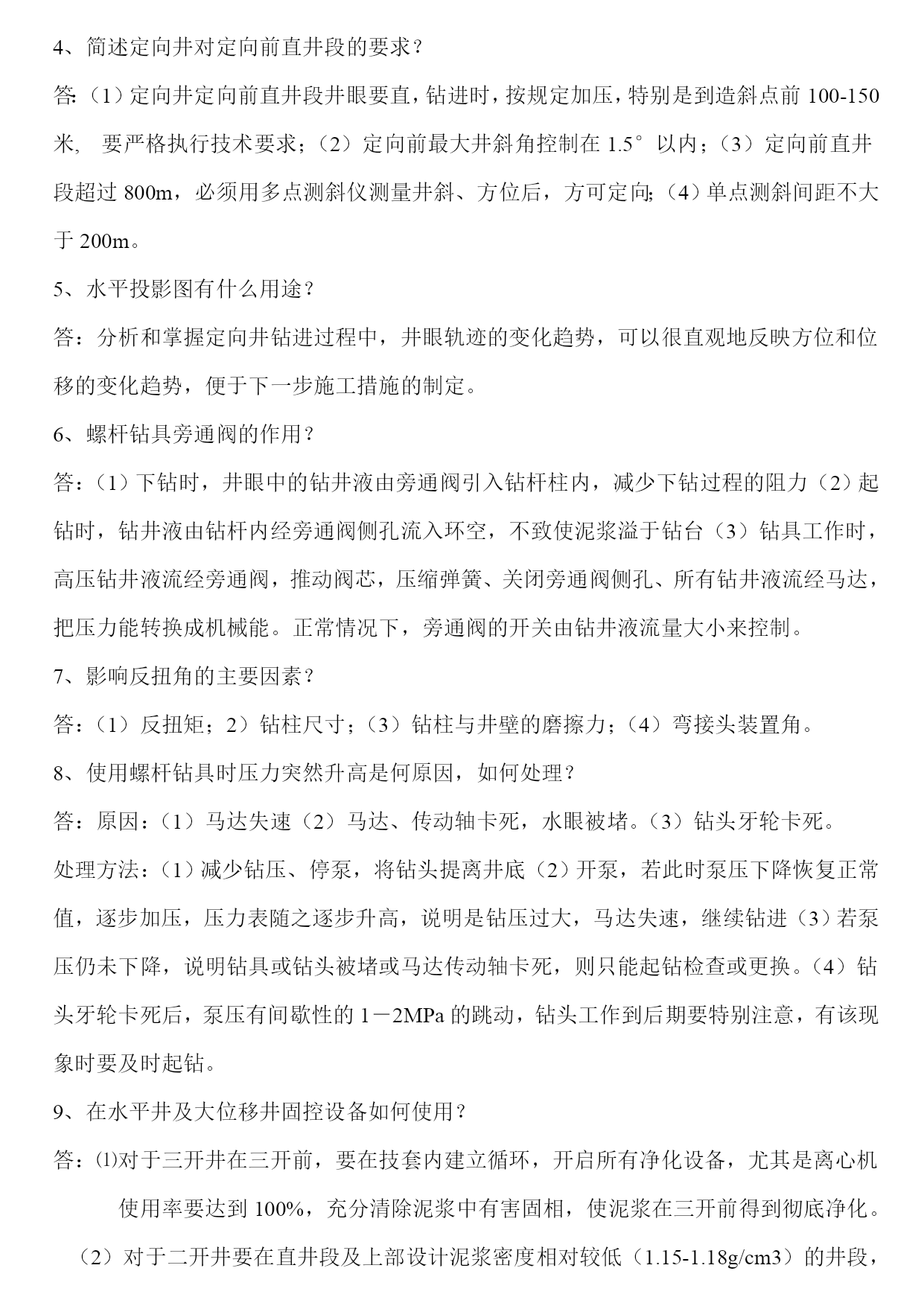 技术员分级管理试题(定向井)填空题:1、最常见的定向井剖面类型有:(三段制剖面、四段制剖面、五段制剖面)等种。2、控制定向井斜井段井眼轨道,常用的钻具组合类型有:(定向钻具、增斜钻具、稳斜钻具、降斜钻具、导向钻具)3、定向井基本参数包括:井深L、井斜角α、井斜方位角φ)4、比较典型的实钻轨道计算方法有:图柱螺线法、校正平均角法、最小曲率法)5、井身质量评审内容包括:井身轨道全角变化率、剖面符合率、完井中靶率)6、一般定向井全角变化率应控制在:4.2°/25m以内7、常见的水平井,根据造斜曲率分为(短半径、中半径、长半径)水平井。8、国内常用的定向井测量仪器有:磁性单点照相测斜仪、磁性多点照相测斜仪、电子多点测斜仪、陀螺测斜仪、有线随钻测斜仪、无线随钻测斜仪)9、磁性单点照相测斜仪主要由(计时器、电池筒、照相机、测量罗盘,组成仪器的心脏部分。10、磁性多点照相测斜仪主要由、、和组成仪器的心脏部分。(电池筒、电子计时器、照相机、测量罗盘)11、陀螺仪是一种的测量仪器。(不受磁干扰)12、MWD是通过将井下信号传送到地面的。(泥浆脉冲)13、磁性单多点照相测斜仪可以测量井眼的井斜角、井斜方位角、工具面角)14、井下动力钻具根据结构特点可分为:直马达、弯壳体马达、导向马达)15、投影图表示法表示定向井井眼轨道需要两张图,即:垂直投影图、水平投影图)16、已知水平面上两点的坐标分别为Ni、Ei和Nj、Ej,则这两点的平均距离的计算公式:。(S=)17、工具面是指造斜钻具的方向。(弯曲)18、反扭角总是使工具面转动。(逆时针)19、多稳定器的增斜钻具组合有利于稳定。(方位)20、随井斜角增大,井斜力,方位力。(增大减小)21、增斜钻具组合是利用原理设计的。(杠杆)22、目前国内常用的测斜数据计算方法是平均角法和曲率半径)23、单位井段内井斜角的变化速度称为(井斜变化率)24、在靶区上,实钻井眼轴线与目标点之间的距离称为靶心距(平面)25、大量的钻井实践证明,井斜角小于,方位不稳定,容易漂移(15°)26、三段:制井身剖面设计,施工简单,井口至目标点的井身长度短,有利于加快单井速度27、有磁干扰的井段进行多点测斜应使用测斜仪(陀螺)28、导向钻进系统定向造斜、增斜、扭方位、降斜和稳斜钻进,不需要起下钻,有利于加快钻进速度和井眼轨迹的控制(可以连续完成)29、使用螺杆钻具扭方位时,随着钻压增加,钻具反扭角(增加)30、常规稳斜钻具属于钻具(刚性满眼)简答题:1、写出平均角法的计算公式?答:αc=(α1+α2)/2φc=(φ1+φ2)/2△H=△LcosαcS=△LsinαcN=△ScosφcE=△Ssinφc2、稳定器在定向钻进中的用途?答:(1)支点作用:通过改变稳定器在钻具组合中的位置,改变下部钻具组合的受力状态,达到控制井眼轨迹的目的。(2)增加下部钻具组合的刚性,达到稳定井斜方位的目的。(3)修正井眼,使井眼曲率变化系统圆滑,有利于减少井下复杂情况。3、导向钻井系统由那几部分组成?答:导向马达、无磁钻铤及MWD短接、地面无线随钻测斜仪、计算机。4、简述定向井对定向前直井段的要求?答:(1)定向井定向前直井段井眼要直,钻进时,按规定加压,特别是到造斜点前100-150米,要严格执行技术要求;(2)定向前最大井斜角控制在1.5°以内;(3)定向前直井段超过800m,必须用多点测斜仪测量井斜、方位后,方可定向;(4)单点测斜间距不大于200m。5、水平投影图有什么用途?答:分析和掌握定向井钻进过程中,井眼轨迹的变化趋势,可以很直观地反映方位和位移的变化趋势,便于下一步施工措施的制定。6、螺杆钻具旁通阀的作用?答:(1)下钻时,井眼中的钻井液由旁通阀引入钻杆柱内,减少下钻过程的阻力(2)起钻时,钻井液由钻杆内经旁通阀侧孔流入环空,不致使泥浆溢于钻台(3)钻具工作时,高压钻井液流经旁通阀,推动阀芯,压缩弹簧、关闭旁通阀侧孔、所有钻井液流经马达,把压力能转换成机械能。正常情况下,旁通阀的开关由钻井液流量大小来控制。7、影响反扭角的主要因素?答:(1)反扭矩;2)钻柱尺寸;(3)钻柱与井壁的磨擦力;(4)弯接头装置角。8、使用螺杆钻具时压力突然升高是何原因,如何处理?答:原因:(1)马达失速(2)马达、传动轴卡死,水眼被堵。(3)钻头牙轮卡死。处理方法:(1)减少钻压、停泵,将钻头提离井底(2)开泵,若此时泵压下降恢复正常值,逐步加压,压力表随之逐步升高,说明是钻压过大,马达失速,继续钻进(3)若泵压仍未下降,说明钻具或钻头被堵或马达传动轴卡死,则只能起钻检查