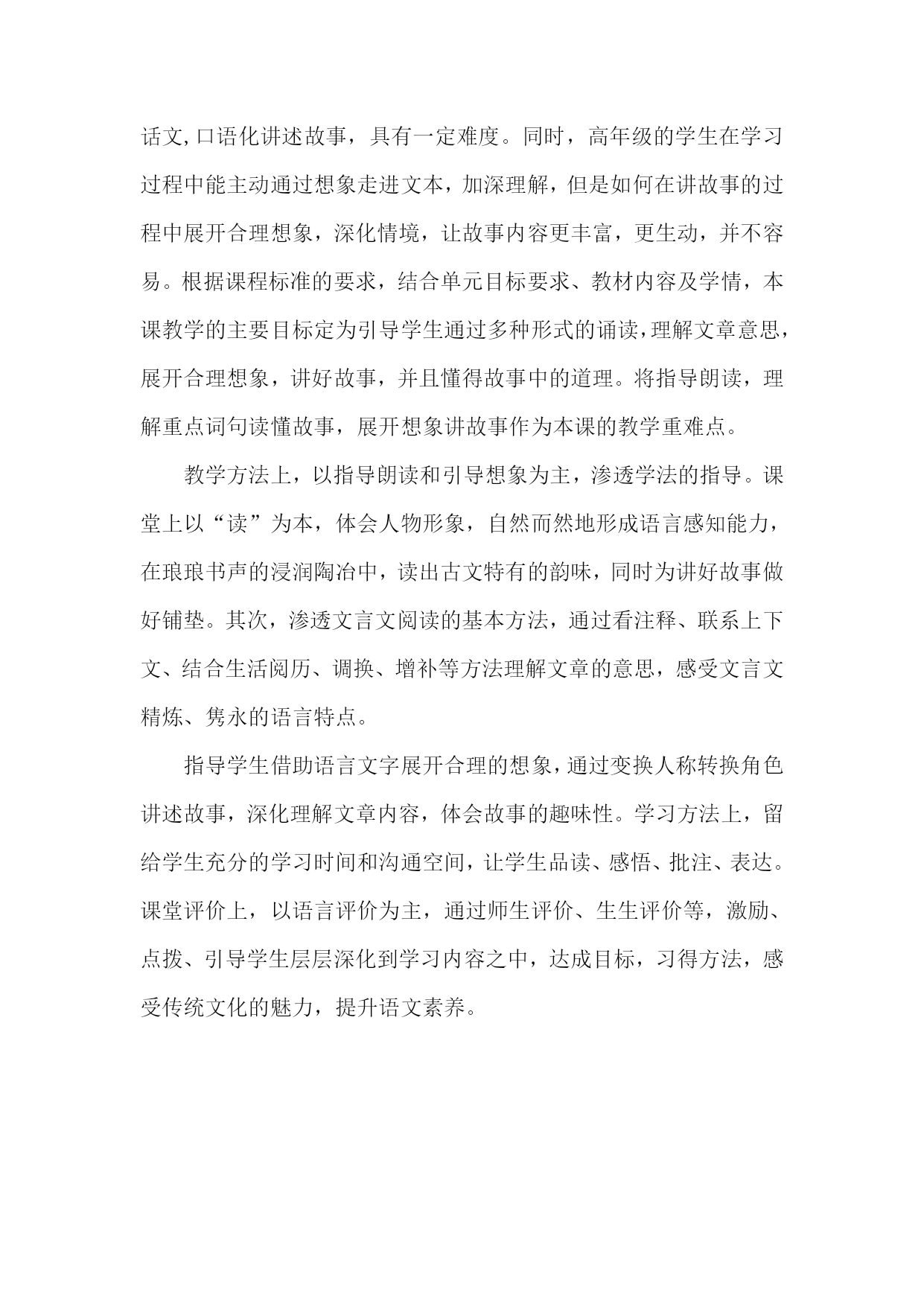 《书戴嵩画牛》课文分析《书戴嵩画牛》是统编小学语文六年级上册第七单元第22课《文言文二则》中的第一篇课文,作者是北宋文学家苏轼。文章用简洁的语言、平实的手法,围绕唐朝画家戴嵩画的《斗牛图》,刻画了杜处士和牧童两个特点鲜明的人物,讲述了一个有趣的故事,揭示了“耕当问奴,织当问婢”的道理。2011版课程标准提出,第三学段要“诵读优秀诗文,注意通过诗文的语调、韵律、节奏等体味作品的内容和情感”。本单元宽泛的人文主题为“艺术之旅”,语文要素为“借助语言文字展开想象,体会艺术之美。”“写自己的拿手好戏,把感受、看法写出来”。本课选取的是两篇记录中国传统艺术的文言文小故事,富有语言凝练、意蕴丰富的语言特点,尤其是本篇文章,全文共有93个字,语言凝练、故事生动、内涵深远,是引导学生学习文言文,感受中华传统文化魅力的佳作。六年级学生对文言文的表达形式已有了初步感知,也了解了一些阅读文言文的基本方法,知道借助注释理解基本内容。由于文言文特有的表达方式与学生日常使用的白话文之间有着较大的差异,因此,学生对于文言文依然有着初学的新鲜感与认知上的陌生感。本文虽篇幅短小,但是语言凝练隽永,寓意深刻。学生在理解文意,读懂文本揭示的道理方面具有一定的困难。高年级学生能讲述故事大概内容,简单描述自己印象最深的场景、人物、细节。但是把文言文转换成白话文,口语化讲述故事,具有一定难度。同时,高年级的学生在学习过程中能主动通过想象走进文本,加深理解,但是如何在讲故事的过程中展开合理想象,深化情境,让故事内容更丰富,更生动,并不容易。根据课程标准的要求,结合单元目标要求、教材内容及学情,本课教学的主要目标定为引导学生通过多种形式的诵读,理解文章意思,展开合理想象,讲好故事,并且懂得故事中的道理。将指导朗读,理解重点词句读懂故事,展开想象讲故事作为本课的教学重难点。教学方法上,以指导朗读和引导想象为主,渗透学法的指导。课堂上以“读”为本,体会人物形象,自然而然地形成语言感知能力,在琅琅书声的浸润陶冶中,读出古文特有的韵味,同时为讲好故事做好铺垫。其次,渗透文言文阅读的基本方法,通过看注释、联系上下文、结合生活阅历、调换、增补等方法理解文章的意思,感受文言文精炼、隽永的语言特点。指导学生借助语言文字展开合理的想象,通过变换人称转换角色讲述故事,深化理解文章内容,体会故事的趣味性。学习方法上,留给学生充分的学习时间和沟通空间,让学生品读、感悟、批注、表达。课堂评价上,以语言评价为主,通过师生评价、生生评价等,激励、点拨、引导学生层层深化到学习内容之中,达成目标,习得方法,感受传统文化的魅力,提升语文素养。
