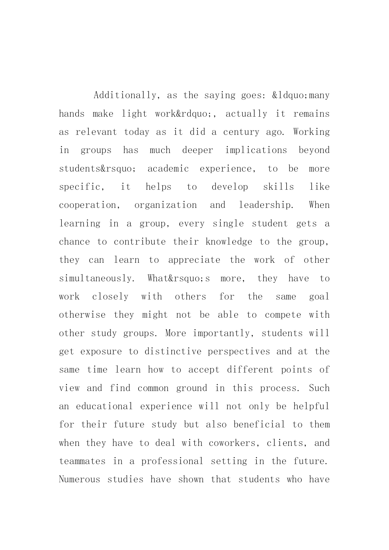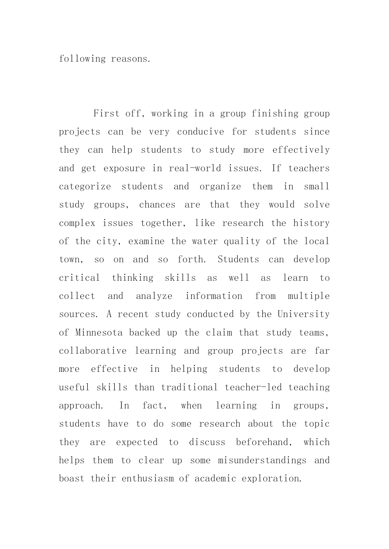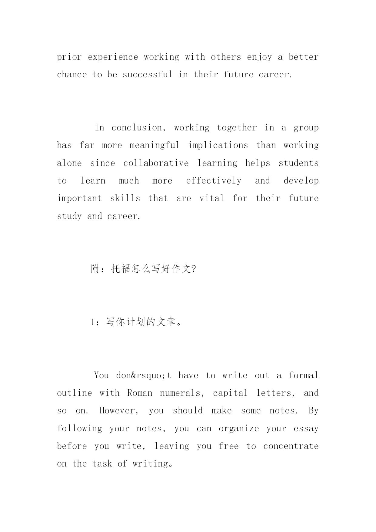 托福真题作文《独立学习与小组学习》托福真题作文范文《独立学习与小组学习》对于备考托福的考生来说,想要获得比较理想的分数还是要从备考雅思写作开始。下面是小编为大家整理的'一篇托福真题作文范文,希望对大家有帮助。Somepeopleliketostudyalonewhileotherprefertostudyinagroup.Whichonedoyouthinkismoreeffective?托福写作范文参考:Educatorsandresearchershaveneverstoppedtheexaminationoftheimportanceandrelevanceofcollaborativelearningthatareencouragedbymiddleschools.Whencomparedwithstudyingalone,Ipersonallybelievethatitisfarmorebeneficialtostudentswhenworkingingroupsforthefollowingreasons.Firstoff,workinginagroupfinishinggroupprojectscanbeveryconduciveforstudentssincetheycanhelpstudentstostudymoreeffectivelyandgetexposureinreal-worldissues.Ifteacherscategorizestudentsandorganizetheminsmallstudygroups,chancesarethattheywouldsolvecomplexissuestogether,likeresearchthehistoryofthecity,examinethewaterqualityofthelocaltown,soonandsoforth.Studentscandevelopcriticalthinkingskillsaswellaslearntocollectandanalyzeinformationfrommultiplesources.ArecentstudyconductedbytheUniversityofMinnesotabackeduptheclaimthatstudyteams,collaborativelearningandgroupprojectsarefarmoreeffectiveinhelpingstudentstodevelopusefulskillsthantraditionalteacher-ledteachingapproach.Infact,whenlearningingroups,studentshavetodosomeresearchaboutthetopictheyareexpectedtodiscussbeforehand,whichhelpsthemtoclearupsomemisunderstandingsandboasttheirenthusiasmofacademicexploration.Additionally,asthesayinggoes:“manyhandsmakelightwork”,actuallyitremainsasrelevanttodayasitdidacenturyago.Workingingroupshasmuchdeeperimplicationsbeyondstudents’academicexperience,tobemorespecific,ithelpstodevelopskillslikecooperation,organizationandleadership.Whenlearninginagroup,everysinglestudentgetsachancetocontributetheirknowledgetothegroup,theycanlearntoappreciatetheworkofothersimultaneously.What’smore,theyhavetoworkcloselywithothersforthesamegoalotherwisetheymightnotbeabletocompetewithotherstudygroups.Moreimportantly,studentswillgetexposuretodistinctiveperspectivesandatthesametimelearnhowtoacceptdifferentpointsofviewandfindcomm