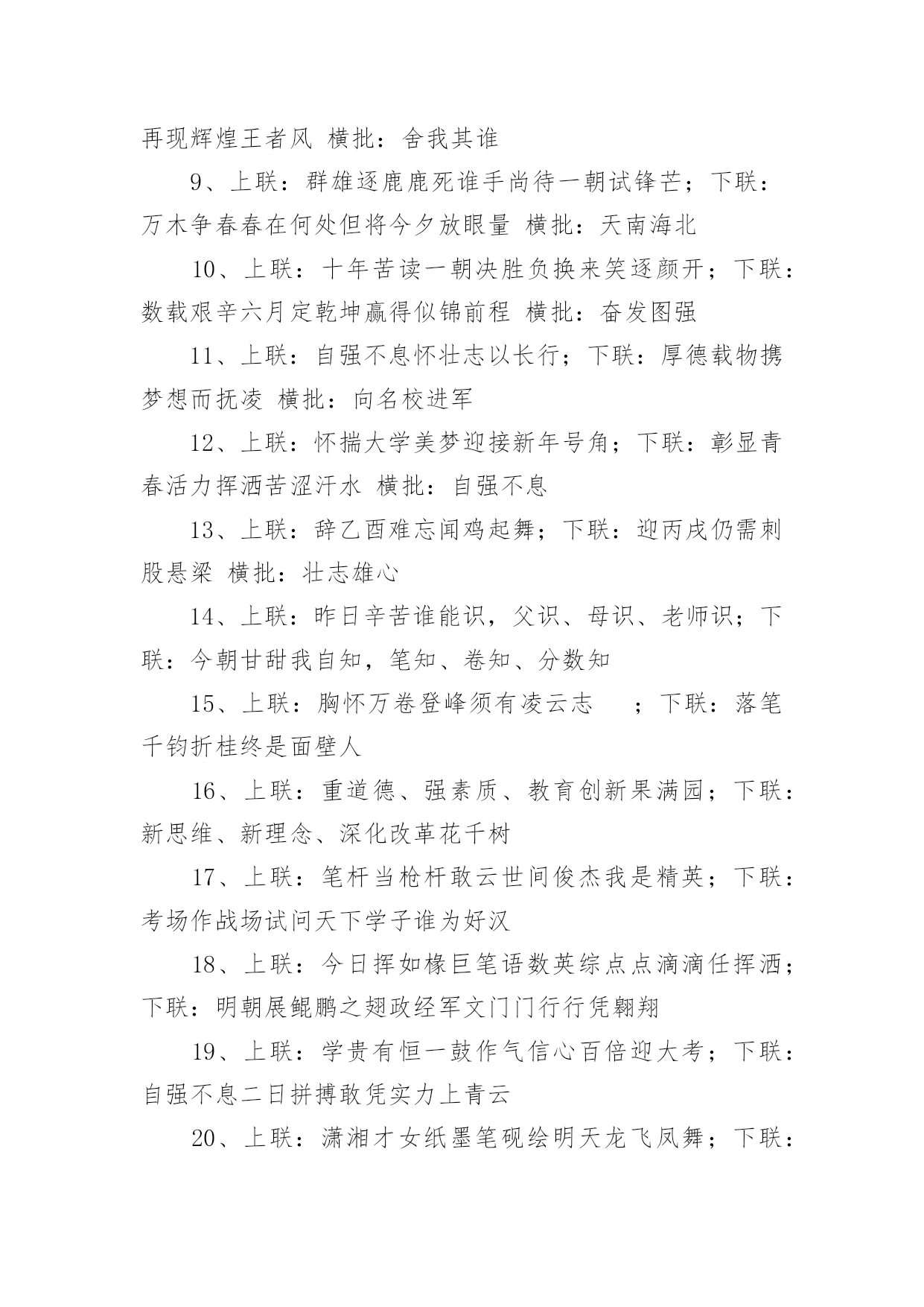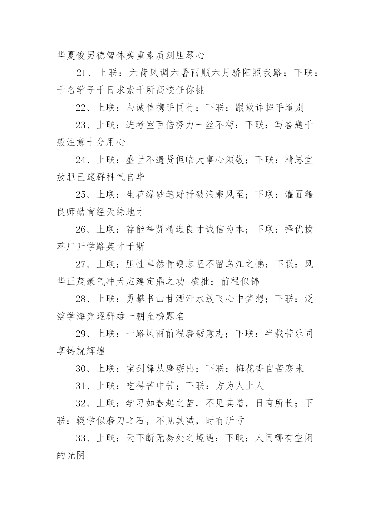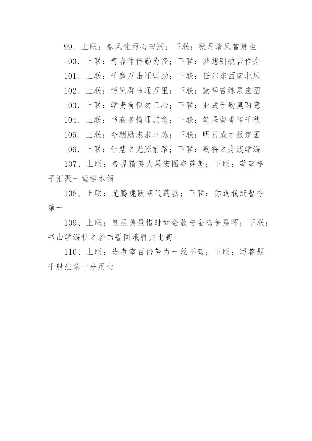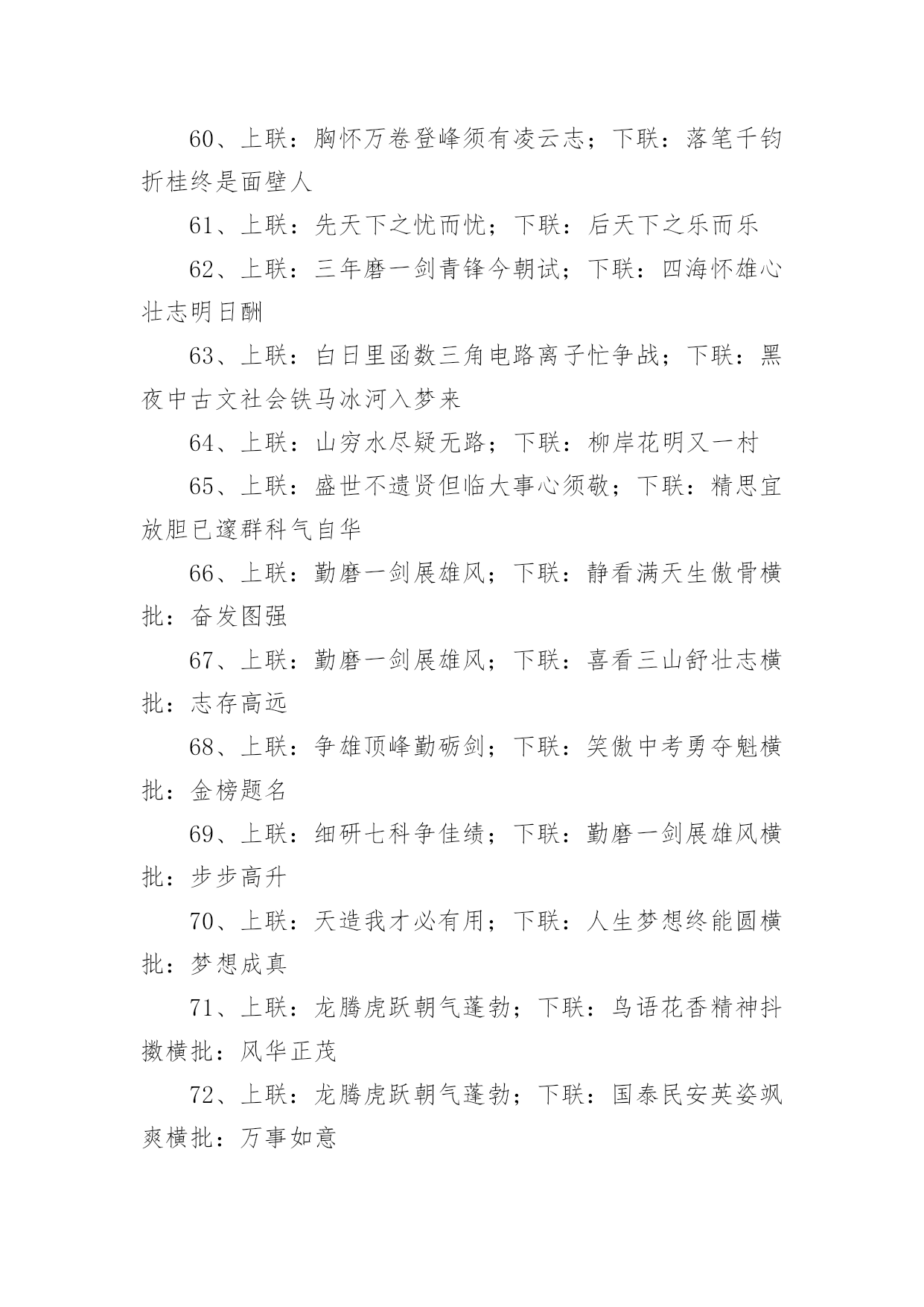 中考考试的对联中考考试的对联(精选110副)在生活、工作和学习中,大家或多或少都接触过一些对联吧,对联源于中国文字语音的对称性,出现应该在周朝以前,造纸术和书法的发展,使对联成为独立文体。那么一般对联是怎么写的呢?以下是小编整理的中考考试的对联(精选110副),欢迎阅读,希望大家能够喜欢。1、上联:各界精英大展宏图夺英魁;下联:莘莘学子汇聚一堂学本领横批:力争上游2、上联:龙腾虎跃朝气蓬勃;下联:你追我赶誓夺第一3、上联:良辰美景惜时如金敢与金鸡争晨晖;下联:书山学海甘之若饴誓同峨眉共比高横批:师生同禧4、上联:感亲恩实高三年滴水穿石永不言弃;下联:报师情火热六月蟾宫折桂志在必得横批:苦尽甘来5、上联:十年寒窗苦读效三皇五帝逐群雄;下联:一朝金榜题名成八斗奇才傲天下横批:师生同喜6、上联:舞风翔鸾旌歌闹处处迎新;下联:披星戴月紫竹宁岁岁登高横批:勇登书山7、上联:点点心血勤育英才厚泽九州;下联:滴滴汗水勇赴学海逐鹿中原横批:我本英雄8、上联:闻鸡起舞成就拼搏劲旅师;下联:天道酬勤再现辉煌王者风横批:舍我其谁9、上联:群雄逐鹿鹿死谁手尚待一朝试锋芒;下联:万木争春春在何处但将今夕放眼量横批:天南海北10、上联:十年苦读一朝决胜负换来笑逐颜开;下联:数载艰辛六月定乾坤赢得似锦前程横批:奋发图强11、上联:自强不息怀壮志以长行;下联:厚德载物携梦想而抚凌横批:向名校进军12、上联:怀揣大学美梦迎接新年号角;下联:彰显青春活力挥洒苦涩汗水横批:自强不息13、上联:辞乙酉难忘闻鸡起舞;下联:迎丙戌仍需刺股悬梁横批:壮志雄心14、上联:昨日辛苦谁能识,父识、母识、老师识;下联:今朝甘甜我自知,笔知、卷知、分数知15、上联:胸怀万卷登峰须有凌云志;下联:落笔千钧折桂终是面壁人16、上联:重道德、强素质、教育创新果满园;下联:新思维、新理念、深化改革花千树17、上联:笔杆当枪杆敢云世间俊杰我是精英;下联:考场作战场试问天下学子谁为好汉18、上联:今日挥如椽巨笔语数英综点点滴滴任挥洒;下联:明朝展鲲鹏之翅政经军文门门行行凭翱翔19、上联:学贵有恒一鼓作气信心百倍迎大考;下联:自强不息二日拼搏敢凭实力上青云20、上联:潇湘才女纸墨笔砚绘明天龙飞凤舞;下联:华夏俊男德智体美重素质剑胆琴心21、上联:六荷风调六暑雨顺六月骄阳照我路;下联:千名学子千日求索千所高校任你挑22、上联:与诚信携手同行;下联:跟欺诈挥手道别23、上联:进考室百倍努力一丝不苟;下联:写答题千般注意十分用心24、上联:盛世不遗贤但临大事心须敬;下联:精思宜放胆已邃群科气自华25、上联:生花缘妙笔好抒破浪乘风至;下联:灌圃籍良师勤育经天纬地才26、上联:荐能举贤精选良才诚信为本;下联:择优拔萃广开学路英才于斯27、上联:胆性卓然骨硬志坚不留乌江之憾;下联:风华正茂豪气冲天应建定鼎之功横批:前程似锦28、上联:勇攀书山甘洒汗水放飞心中梦想;下联:泛游学海竞逐群雄一朝金榜题名29、上联:一路风雨前程磨砺意志;下联:半载苦乐同享铸就辉煌30、上联:宝剑锋从磨砺出;下联:梅花香自苦寒来31、上联:吃得苦中苦;下联:方为人上人32、上联:学习如春起之苗,不见其增,日有所长;下联:辍学似磨刀之石,不见其减,时有所亏33、上联:天下断无易处之境遇;下联:人间哪有空闲的光阴34、上联:天下断无易处之境遇;下联:人间哪有空闲的光阴35、上联:若有恒何必三更眠五更起;下联:最无益莫过一日曝十日寒36、上联:家中父母吃苦受累盼的是捷报频传;下联:灯下学子沤心沥血想的是金板题名37、上联:月考分数高低何足挂齿;下联:平时名次浮动纯属正常38、上联:九年寒窗苦读效三皇五帝逐群雄;下联:一朝金榜题名成八斗奇才傲天下39、上联:九年苦读一朝决胜负换来笑逐颜开;下联:数载艰辛六月定乾坤赢得似锦前程40、上联:送报晓金鸡看今年硕果飘香迎佳绩;下联:迎吉祥犬吠待明朝笑傲中考创辉煌41、上联:勇攀书山甘洒汗水放飞心中梦想;下联:泛游学海竞逐群雄一朝金榜题名42、上联:有志者,事竞成,破斧沉舟,百二秦关终属楚;下联:苦心人,天不负,卧薪尝胆,三千越甲可吞吴43、上联:学海泛舟五千年华夏英才书奇志;下联:蟾宫折桂三十载潇湘学子写华章44、上联:心态良好,千帆竞发,帆帆顺风;下联:意气平和,万树争春,树树参天45、上联:学海无涯,苦海有边,艰辛之后来甜蜜;下联:人生有岸,毅力无穷,风雨过处见彩虹46、上联:春秋勤奋豪情冲天拼得人生飞黄腾达;下联:冬夏苦读壮志凌云迎来中考功成名就47、上联:登高一呼,山鸣谷应;下联:举目四顾,海阔天空48、上联:泛舟学海独占鳌头看我八班众英雄;下联:驰骋疆场问鼎逐鹿敢问何人大丈夫49、上联:好男儿悬梁刺骨凿壁借光闻鸡起舞,你将如愿;下联:俏巾帼囊萤映雪韦编三绝秉烛夜读,我要成功50、上联: