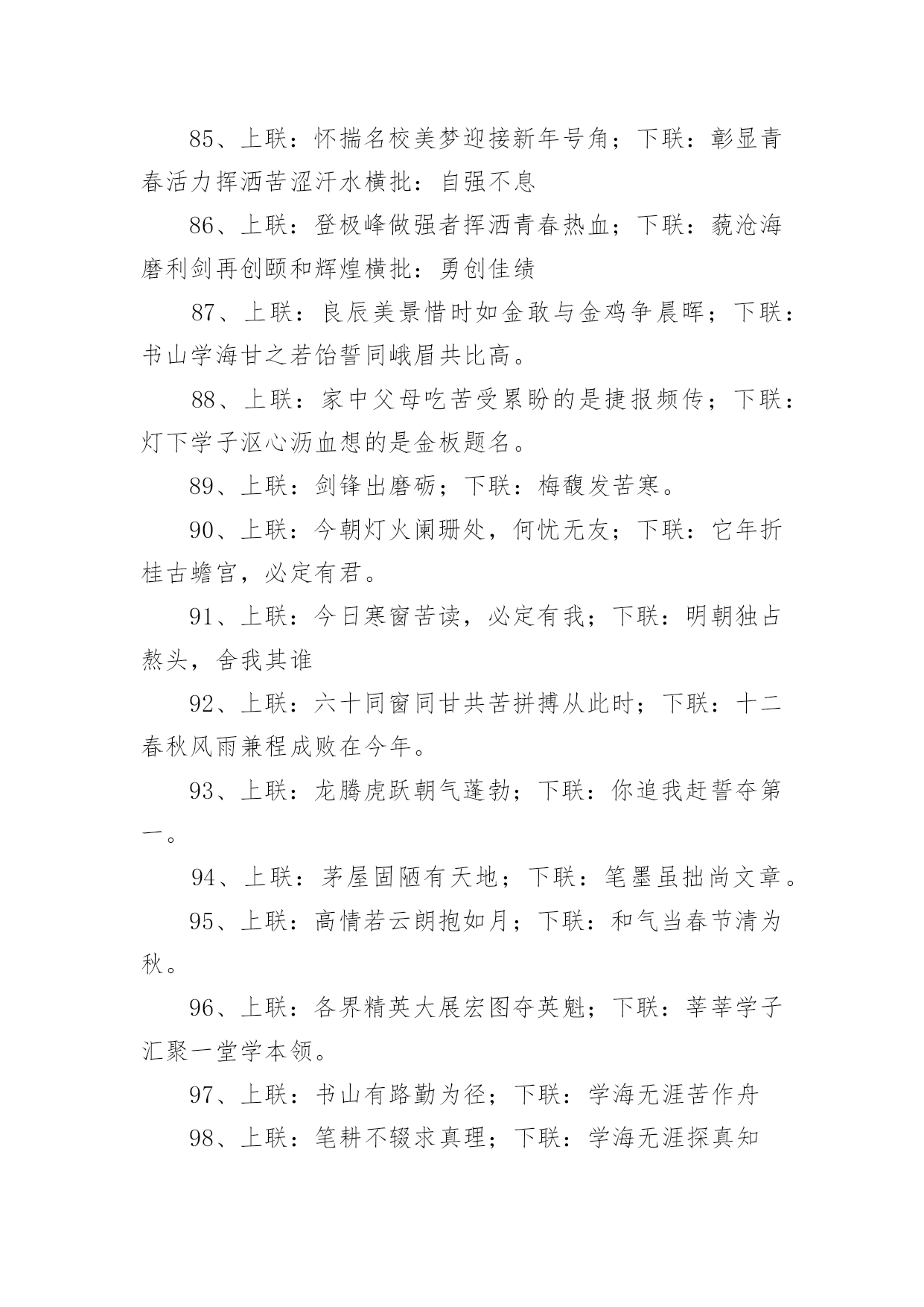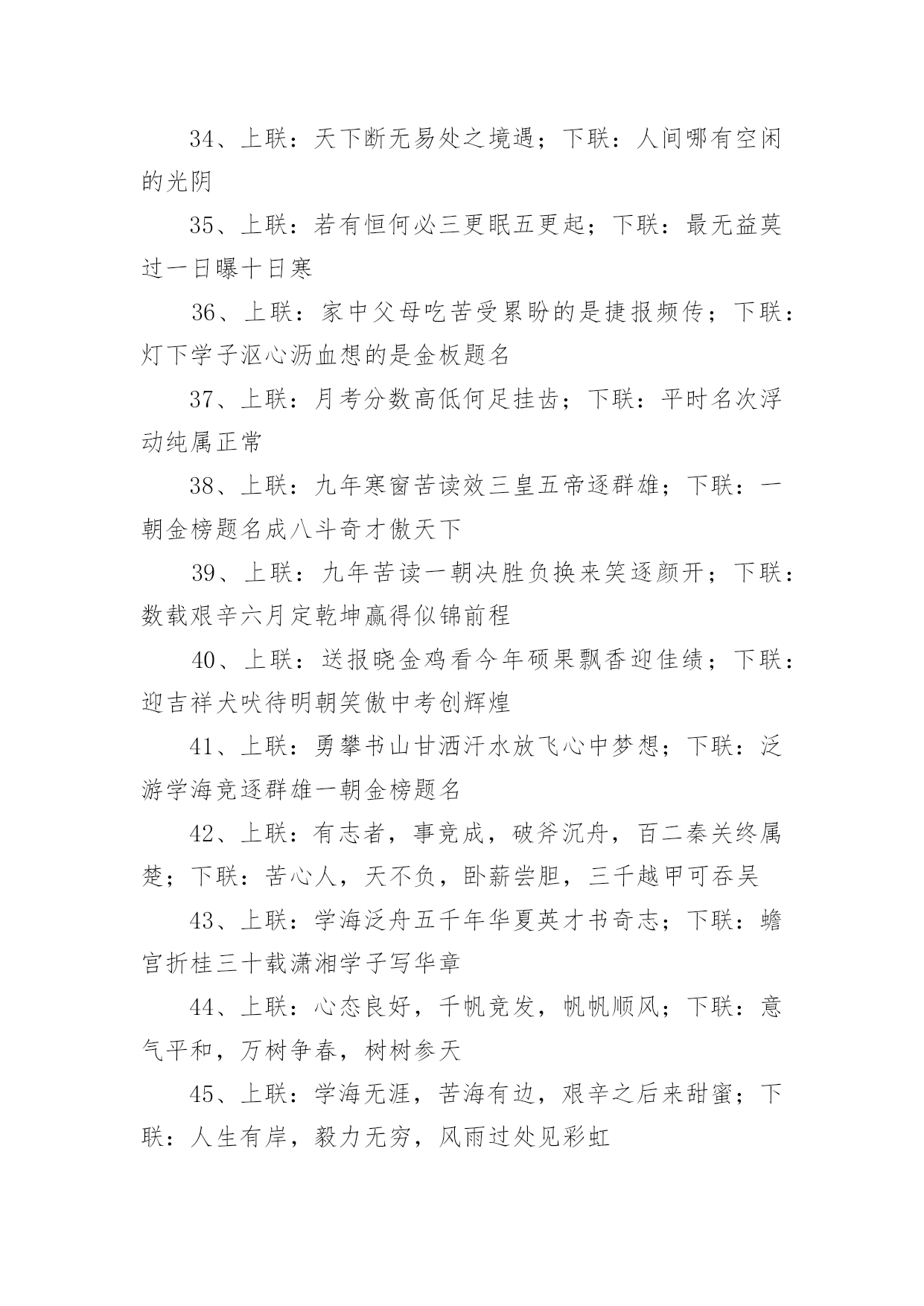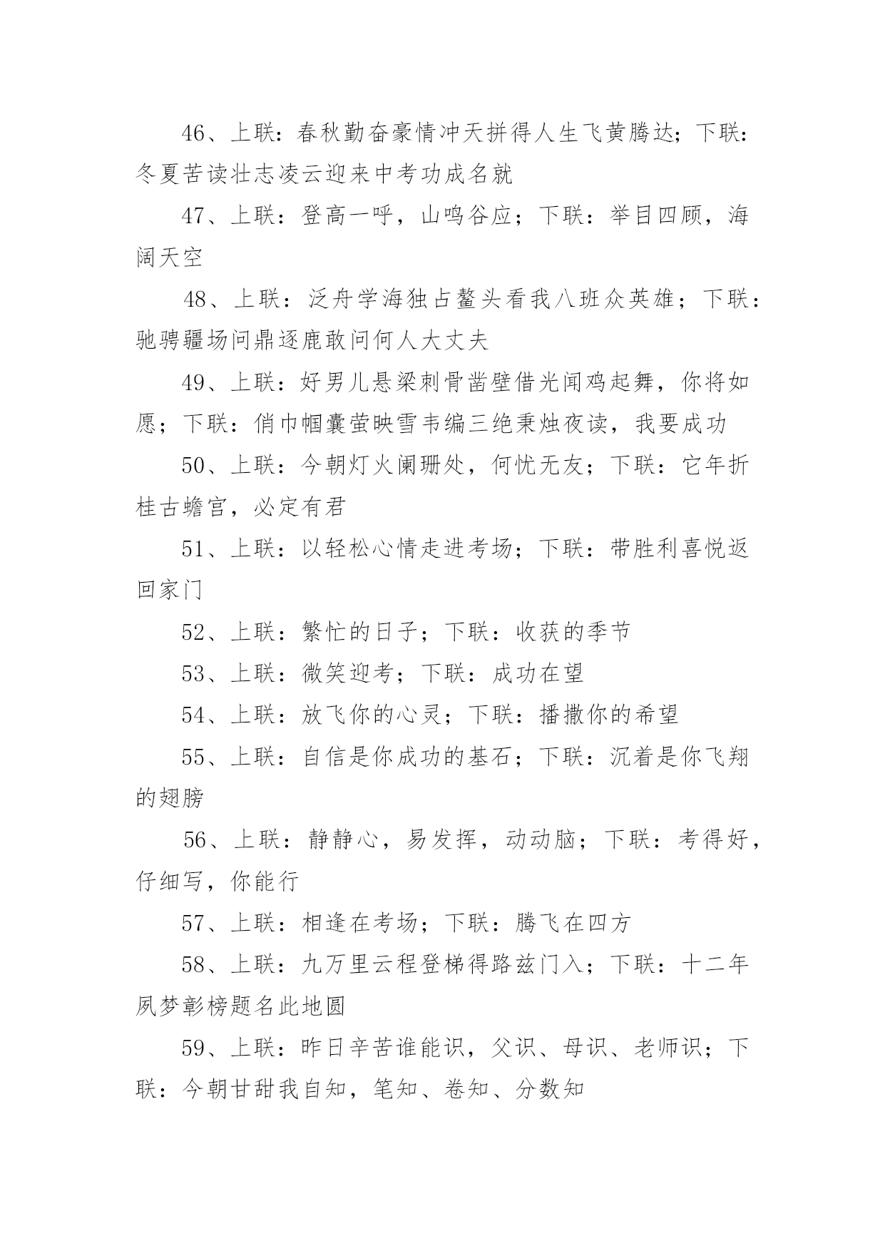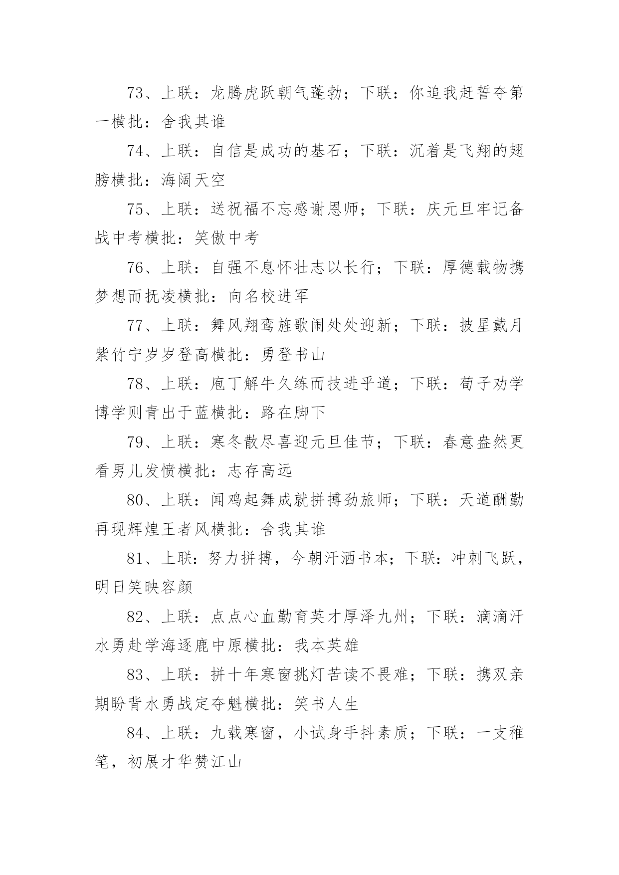 中考考试的对联中考考试的对联(精选110副)在生活、工作和学习中,大家或多或少都接触过一些对联吧,对联源于中国文字语音的对称性,出现应该在周朝以前,造纸术和书法的发展,使对联成为独立文体。那么一般对联是怎么写的呢?以下是小编整理的中考考试的对联(精选110副),欢迎阅读,希望大家能够喜欢。1、上联:各界精英大展宏图夺英魁;下联:莘莘学子汇聚一堂学本领横批:力争上游2、上联:龙腾虎跃朝气蓬勃;下联:你追我赶誓夺第一3、上联:良辰美景惜时如金敢与金鸡争晨晖;下联:书山学海甘之若饴誓同峨眉共比高横批:师生同禧4、上联:感亲恩实高三年滴水穿石永不言弃;下联:报师情火热六月蟾宫折桂志在必得横批:苦尽甘来5、上联:十年寒窗苦读效三皇五帝逐群雄;下联:一朝金榜题名成八斗奇才傲天下横批:师生同喜6、上联:舞风翔鸾旌歌闹处处迎新;下联:披星戴月紫竹宁岁岁登高横批:勇登书山7、上联:点点心血勤育英才厚泽九州;下联:滴滴汗水勇赴学海逐鹿中原横批:我本英雄8、上联:闻鸡起舞成就拼搏劲旅师;下联:天道酬勤再现辉煌王者风横批:舍我其谁9、上联:群雄逐鹿鹿死谁手尚待一朝试锋芒;下联:万木争春春在何处但将今夕放眼量横批:天南海北10、上联:十年苦读一朝决胜负换来笑逐颜开;下联:数载艰辛六月定乾坤赢得似锦前程横批:奋发图强11、上联:自强不息怀壮志以长行;下联:厚德载物携梦想而抚凌横批:向名校进军12、上联:怀揣大学美梦迎接新年号角;下联:彰显青春活力挥洒苦涩汗水横批:自强不息13、上联:辞乙酉难忘闻鸡起舞;下联:迎丙戌仍需刺股悬梁横批:壮志雄心14、上联:昨日辛苦谁能识,父识、母识、老师识;下联:今朝甘甜我自知,笔知、卷知、分数知15、上联:胸怀万卷登峰须有凌云志;下联:落笔千钧折桂终是面壁人16、上联:重道德、强素质、教育创新果满园;下联:新思维、新理念、深化改革花千树17、上联:笔杆当枪杆敢云世间俊杰我是精英;下联:考场作战场试问天下学子谁为好汉18、上联:今日挥如椽巨笔语数英综点点滴滴任挥洒;下联:明朝展鲲鹏之翅政经军文门门行行凭翱翔19、上联:学贵有恒一鼓作气信心百倍迎大考;下联:自强不息二日拼搏敢凭实力上青云20、上联:潇湘才女纸墨笔砚绘明天龙飞凤舞;下联:华夏俊男德智体美重素质剑胆琴心21、上联:六荷风调六暑雨顺六月骄阳照我路;下联:千名学子千日求索千所高校任你挑22、上联:与诚信携手同行;下联:跟欺诈挥手道别23、上联:进考室百倍努力一丝不苟;下联:写答题千般注意十分用心24、上联:盛世不遗贤但临大事心须敬;下联:精思宜放胆已邃群科气自华25、上联:生花缘妙笔好抒破浪乘风至;下联:灌圃籍良师勤育经天纬地才26、上联:荐能举贤精选良才诚信为本;下联:择优拔萃广开学路英才于斯27、上联:胆性卓然骨硬志坚不留乌江之憾;下联:风华正茂豪气冲天应建定鼎之功横批:前程似锦28、上联:勇攀书山甘洒汗水放飞心中梦想;下联:泛游学海竞逐群雄一朝金榜题名29、上联:一路风雨前程磨砺意志;下联:半载苦乐同享铸就辉煌30、上联:宝剑锋从磨砺出;下联:梅花香自苦寒来31、上联:吃得苦中苦;下联:方为人上人32、上联:学习如春起之苗,不见其增,日有所长;下联:辍学似磨刀之石,不见其减,时有所亏33、上联:天下断无易处之境遇;下联:人间哪有空闲的光阴34、上联:天下断无易处之境遇;下联:人间哪有空闲的光阴35、上联:若有恒何必三更眠五更起;下联:最无益莫过一日曝十日寒36、上联:家中父母吃苦受累盼的是捷报频传;下联:灯下学子沤心沥血想的是金板题名37、上联:月考分数高低何足挂齿;下联:平时名次浮动纯属正常38、上联:九年寒窗苦读效三皇五帝逐群雄;下联:一朝金榜题名成八斗奇才傲天下39、上联:九年苦读一朝决胜负换来笑逐颜开;下联:数载艰辛六月定乾坤赢得似锦前程40、上联:送报晓金鸡看今年硕果飘香迎佳绩;下联:迎吉祥犬吠待明朝笑傲中考创辉煌41、上联:勇攀书山甘洒汗水放飞心中梦想;下联:泛游学海竞逐群雄一朝金榜题名42、上联:有志者,事竞成,破斧沉舟,百二秦关终属楚;下联:苦心人,天不负,卧薪尝胆,三千越甲可吞吴43、上联:学海泛舟五千年华夏英才书奇志;下联:蟾宫折桂三十载潇湘学子写华章44、上联:心态良好,千帆竞发,帆帆顺风;下联:意气平和,万树争春,树树参天45、上联:学海无涯,苦海有边,艰辛之后来甜蜜;下联:人生有岸,毅力无穷,风雨过处见彩虹46、上联:春秋勤奋豪情冲天拼得人生飞黄腾达;下联:冬夏苦读壮志凌云迎来中考功成名就47、上联:登高一呼,山鸣谷应;下联:举目四顾,海阔天空48、上联:泛舟学海独占鳌头看我八班众英雄;下联:驰骋疆场问鼎逐鹿敢问何人大丈夫49、上联:好男儿悬梁刺骨凿壁借光闻鸡起舞,你将如愿;下联:俏巾帼囊萤映雪韦编三绝秉烛夜读,我要成功50、上联: