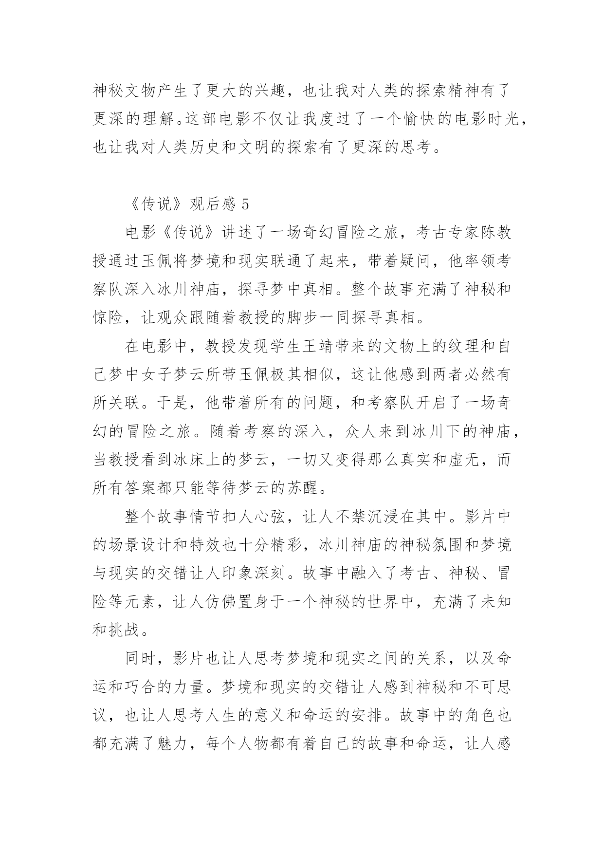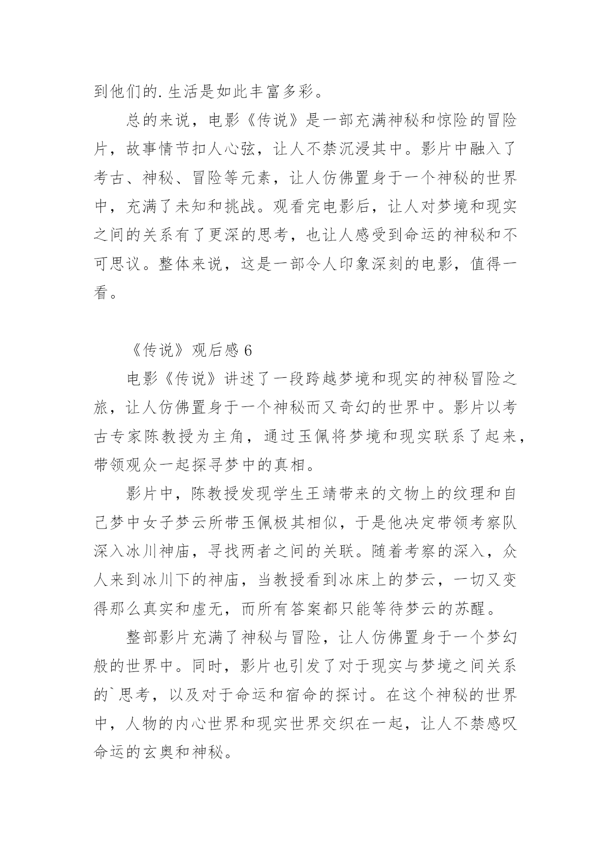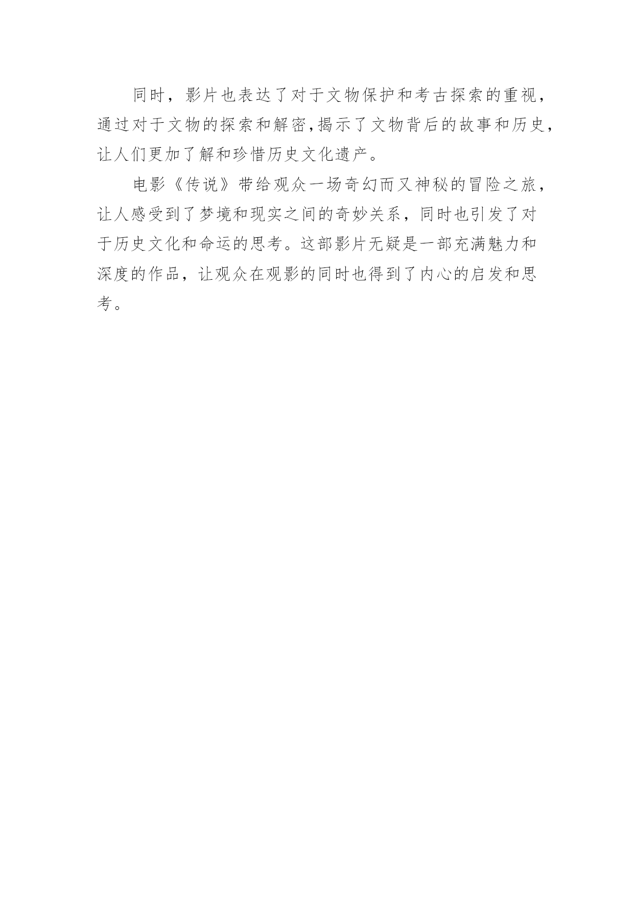 《传说》观后感《传说》观后感(通用6篇)当观看完一部影视作品后,相信大家增长不少见闻吧,撰写观后感可以帮助我们提升自己。那要怎么写好观后感呢?下面是小编为大家收集的《传说》观后感(通用6篇),仅供参考,大家一起来看看吧。《传说》观后感1电影《传说》给我留下了深刻的印象,它不仅仅是一部冒险片,更是一次对梦境和现实的探索和思考。影片中的考古专家陈教授通过玉佩将梦境和现实联系在一起,带领考察队深入冰川神庙,探寻梦中的真相,开启了一场奇幻的冒险之旅。影片中的情节扣人心弦,让我跟随着教授和考察队一起感受到了冒险的刺激和悬疑的紧张。特别是当教授发现学生王靖带来的文物与自己梦中的女子梦云所带玉佩极其相似时,我也跟着他一起感到了疑惑和好奇。随着考察的深入,当教授看到冰床上的`梦云时,一切又变得那么真实和虚无,所有的答案都只能等待梦云的苏醒。影片中的画面和音乐也给人留下了深刻的印象,冰川下的神庙和梦境中的景象都让人感到神秘而壮观。配乐更是恰到好处,让人情不自禁地跟随着教授一起感受冒险和探索的激动。整部影片给人的感觉就像是一场梦境和现实的交错,让人不禁思考梦境和现实之间的关联和边界。影片中的故事情节和人物形象都让我深深地沉浸其中,直到影片的最后一刻,我才慢慢从梦境中醒来。《传说》是一部充满想象力和冒险精神的电影,让人在观影的过程中不仅感受到了刺激和紧张,更让人思考了梦境和现实的奥秘。这部电影让我对梦境和现实有了新的认识,也让我对冒险和探索有了更深的理解。希望以后还能看到更多这样类型的电影,让我在银幕前继续感受冒险和探索的乐趣。《传说》观后感2《传说》这部电影让我感受到了冒险与探索的魅力,也让我对梦境和现实之间的联系产生了更深的思考。在电影中,陈教授通过玉佩将梦境和现实联系了起来,带领考察队深入冰川神庙,探寻梦中的真相。他发现学生王靖带来的文物与自己梦中的女子梦云所带玉佩极其相似,这让他感到两者必然有所关联,于是带着所有的问题,他和考察队开启了一场奇幻的冒险之旅。在这场冒险之旅中,他们经历了种种困难和挑战,最终来到了冰川下的神庙。当教授看到冰床上的梦云时,一切又变得那么真实和虚无,而所有的答案都只能等待梦云的苏醒。电影中的场景和剧情让我感受到了冒险的.刺激和探索的乐趣,也让我思考了梦境和现实之间的联系。我们常常觉得梦境是虚幻的,但也许梦境中的一些事物和现实中的事物是有着某种联系的,只是我们还没有发现而已。同时,电影也让我感受到了对于未知世界的好奇和探索精神的重要性。只有勇敢地去探索未知,我们才能发现更多的奇迹和真相。电影《传说》让我感受到了冒险与探索的乐趣,也让我对梦境和现实之间的联系有了更深的思考。这部电影让我感受到了对未知世界的好奇和探索精神的重要性,也让我对冒险与探索有了更深的理解和体会。《传说》观后感3电影《传说》讲述了一场奇幻冒险之旅,考古专家陈教授率领考察队深入冰川神庙,探寻梦中真相的故事。整部电影充满了悬疑和奇幻色彩,让人在观影过程中不断猜测和期待着故事的发展。影片中,陈教授通过玉佩将梦境和现实联通了起来,这种设定让整个故事更加扣人心弦。当他发现学生王靖带来的文物和自己梦中的女子梦云所带玉佩极其相似时,观众也跟着陈教授一起陷入了疑惑之中。随着考察的深入,众人来到冰川下的神庙,当教授看到冰床上的梦云时,一切又变得那么真实和虚无,而所有答案都只能等待梦云的.苏醒。影片中的情节设置和剧情发展都非常吸引人,让观众不禁沉浸在这个神秘的世界里。同时,影片还通过考古探险的主题,展现了人类对未知世界的好奇和探索精神,让人感受到了冒险的刺激和乐趣。整体来说,电影《传说》是一部充满想象力和神秘色彩的作品,观众在观影过程中能够感受到强烈的视觉冲击和情感共鸣。影片中的奇幻冒险之旅也让人们对未知世界充满了向往和期待,让人不禁想要跟随陈教授一起踏上这段神秘的旅程。《传说》观后感4电影《传说》让我对考古和神秘文物产生了更深的兴趣。影片中,考古专家陈教授通过玉佩将梦境和现实联系了起来,带领考察队深入冰川神庙,探寻梦中的真相,开启了一场奇幻的冒险之旅。影片中的情节扣人心弦,令人屏息凝神。陈教授发现学生王靖所带来的文物与自己梦中的女子梦云所带的玉佩极其相似,这让他产生了强烈的好奇心和疑问。随着考察的深入,他们来到了冰川下的`神庙,当教授看到冰床上的梦云时,一切又变得那么真实和虚无,所有的答案都只能等待梦云的苏醒。影片中的场景和特效让人印象深刻,冰川下的神庙和梦境中的场景都让人感到神秘而又壮观。故事情节紧凑,悬念不断,让人难以释怀。同时,影片也探讨了人类对未知事物的好奇心和探索精神,让人深思。电影《传说》给我留下了深刻的印象。它让我对考古和神秘文物产生了更大的兴趣,也让我对人类的探索精神有了更深的理解。这部电影不仅让我度过了一个愉快的电影时光,也让我对人类历史和文明的